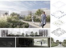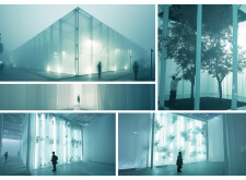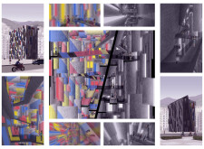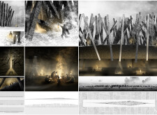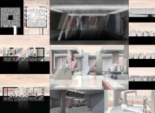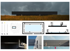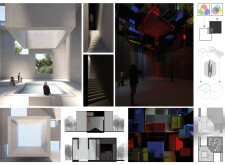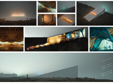 The presentation successfully conveys the project’s scale, materiality, and the transformative role of daylight. The carefully rendered visuals, taken from various perspectives, provide an engaging and informative overview of the design. The use of flowers and plants introduces vibrant color, enhancing the panel’s visual appeal while reinforcing the contrast between the two experiences the project seeks to evoke. Read more However, the layout could benefit from greater hierarchy, as the uniformly sized images limit the narrative flow. Incorporating line drawings or more detailed diagrams that describe materials would add depth, showcasing the project as a well-considered architectural work and providing a more comprehensive understanding of its design intentions.