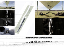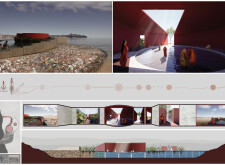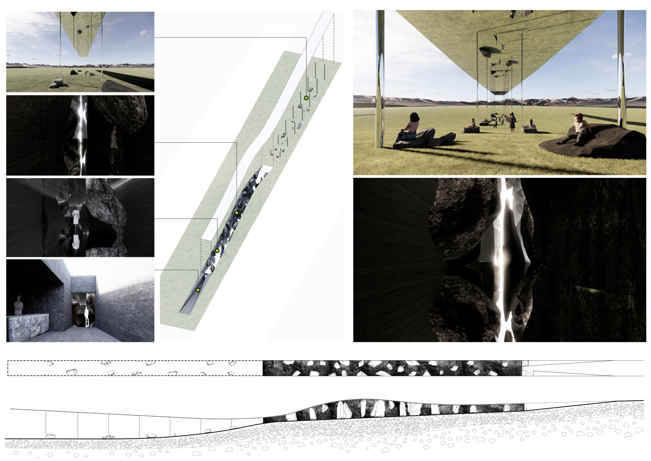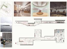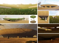 The presentation highlights the project’s relationship to the landscape and its significant scale, with a particularly notable plan that elegantly depicts the form’s integration with the topography and seaside. A clear sense of hierarchy is established through varied image sizes, and the consistent depiction of grass adds visual cohesion and depth through its texture and vibrant color. Read more The combination of refined renderings and sketches creates a balanced portrayal, bridging conceptual development and final design. That said, the presentation could benefit from additional elements, such as visuals capturing the human-scale experience within or along the wall-tunnel, as well as detailed diagrams illustrating materiality and construction methods. Finally, adding annotations like level markers or analytical lines to the renderings would introduce a layer of complexity and make the presentation more informative and varied.