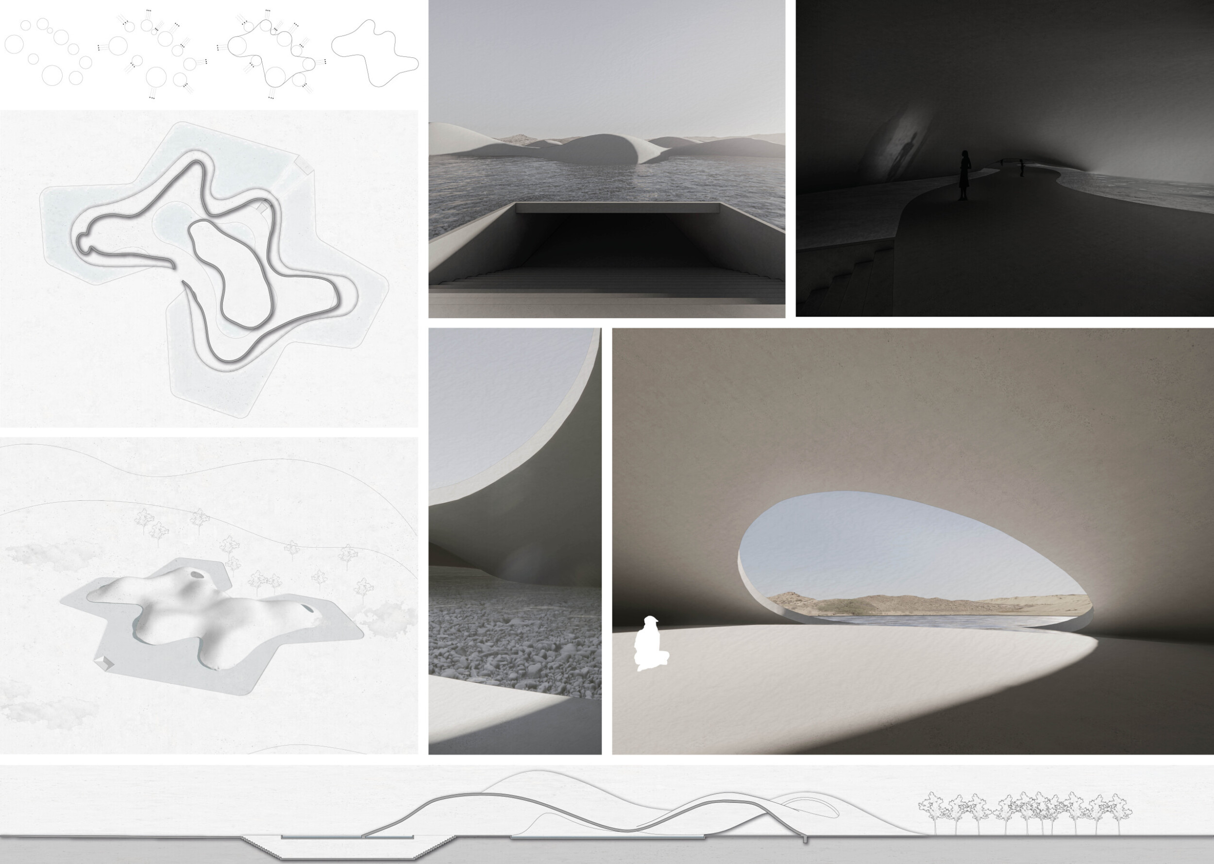 This project explores the interplay between architecture and nature to offer a tranquil, atmospheric space that straddles the boundary between interior and exterior. The design features a cave-like enclosure and a cantilevered platform, creating contrasting yet complementary experiences. These elements harmonize with the natural setting, enhancing a sense of simplicity and elegance. Read more The project’s transitions, such as the pathway and thresholds, are carefully designed to guide visitors through a journey that balances enclosure and openness. While its monochromatic presentation emphasizes universality, the design’s nuanced approach to space and context creates a unique architectural expression rooted in contrasts and continuity.