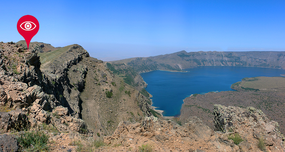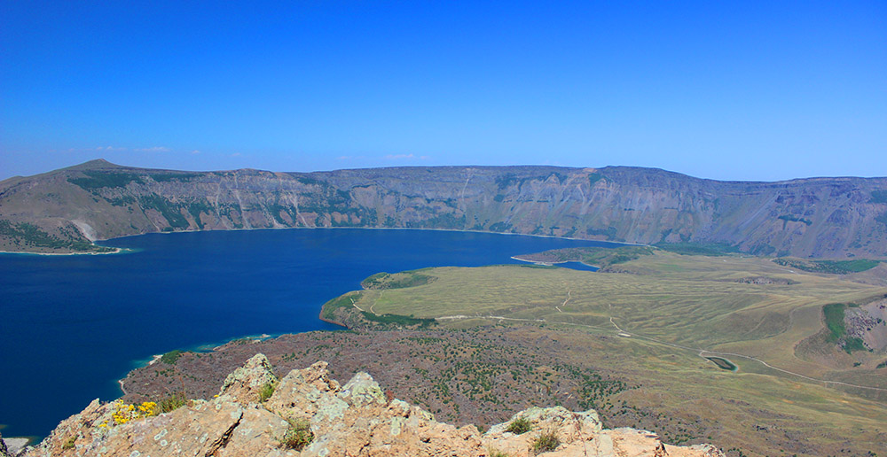 The Nemrut caldera sits cradled within the Nemrut Volcano in Turkey, formed by the collapse of the volcano into itself, creating a large, deep crater. This dramatic formation creates a unique micro-environment, becoming home to plants and animals that thrive in the harsh conditions. Nestled within the caldera is lake Nemrut, a half-moon crater freshwater lake that further adds to the unique biodiversity of the caldera.