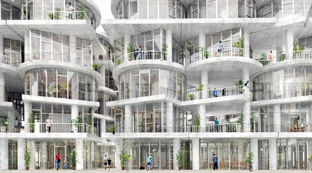 Lap Chi Kwong and Alison Von Glinow from the USA were awarded first prize for their concept of a few simple modular elements in three basic forms - circle, square and rectangle - each made up of a slab and four columns that could be stacked, rotated and combined to create different unit types.