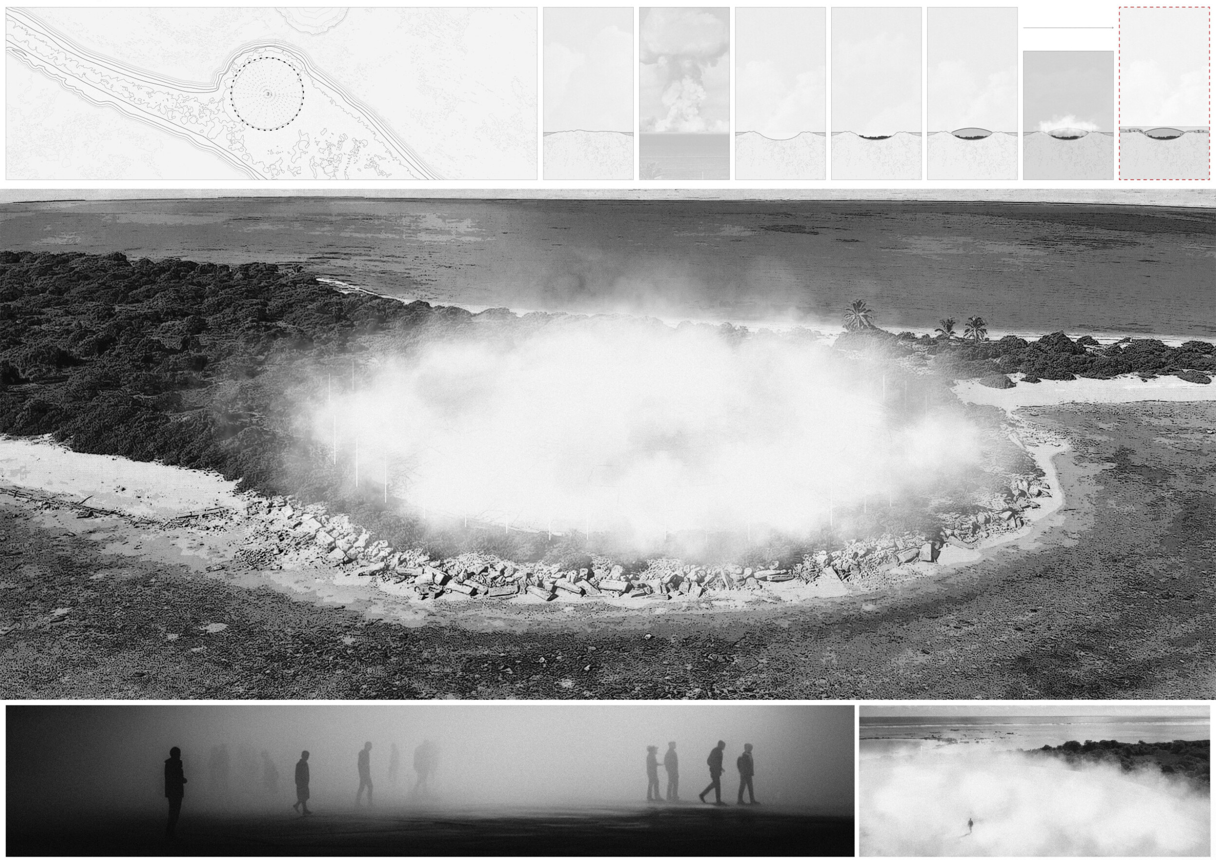 This marine proposal was the most popular entry among the jurors. It depicts a series of rods driven into the seafloor in the form of a circle to symbolize the scale of a nuclear blast, marking its perimeter and its center. The imagery clearly conveys the passage of time, describing a visitor who makes his way by boat across the memorial, effectively communicating its grand scale and the effort required to traverse it. Read more The rods appear to be symbols and physical markers of a nuclear blast, as well as a means for marine life growth to take hold and flourish over time.