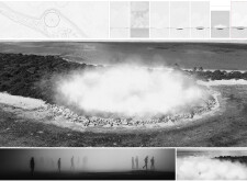 The submission is elegant in its minimalist design and minimalist means of communication. It describes a vast site in a desert location where the plan of a street grid as well as the individual buildings of a theoretical city are imprinted on the land using knee walls made of soil bricks. At its center, the plan disappears to reference the dimensional extents of a nuclear blast within the city. Read more The bricks are marked with graphics of human figures to describe an urban population but it is unclear exactly what these symbolize. A visitor appears free to wander about this site to consider the varying scales of the human, the city and the bomb.