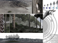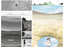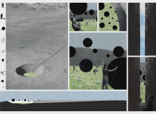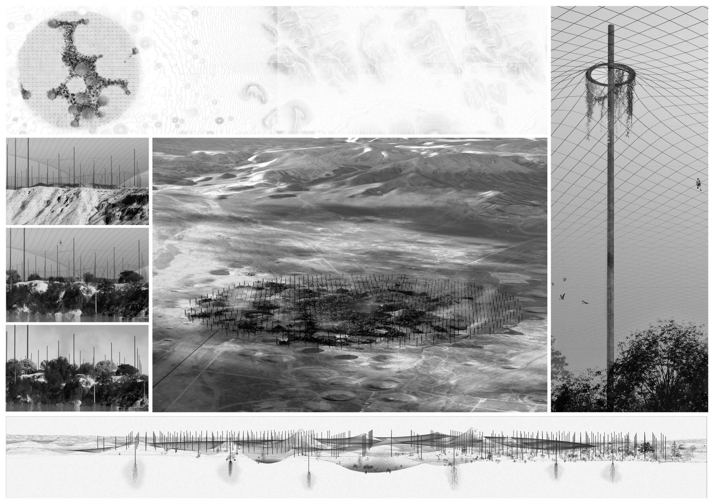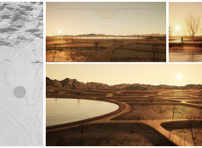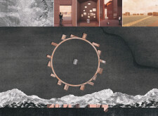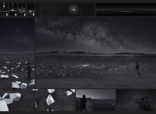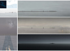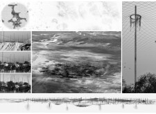 The balance of photorealistic imagery with linework and aerial drawings is compelling and completely successful at describing the large scale as well as the detail. The author has done well by choosing to include a number of drawings with varying sizes and a sensible hierarchy. Read more The use of repeating imagery on single-sheet submissions is often not encouraged, as it requires a significant amount of space on a limited presentation, but by using variation to describe a temporal aspect of the project, this submission is able to achieve sublime effect. The primary layout criticism is that the largest and most important drawing employs dark colors, which seems at odds with the fine line drawings on a white background below. The layout could be improved to find a more balanced visual weight.