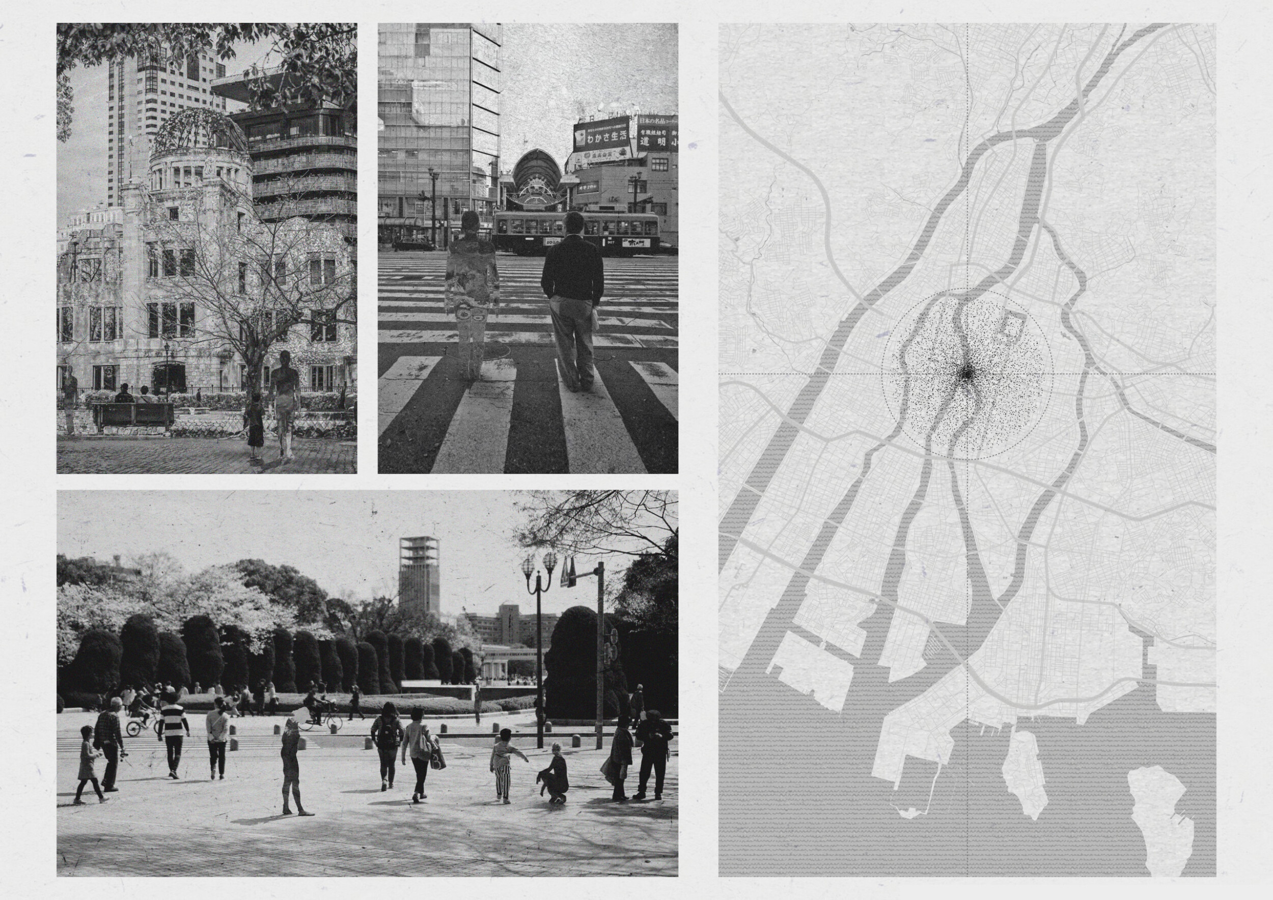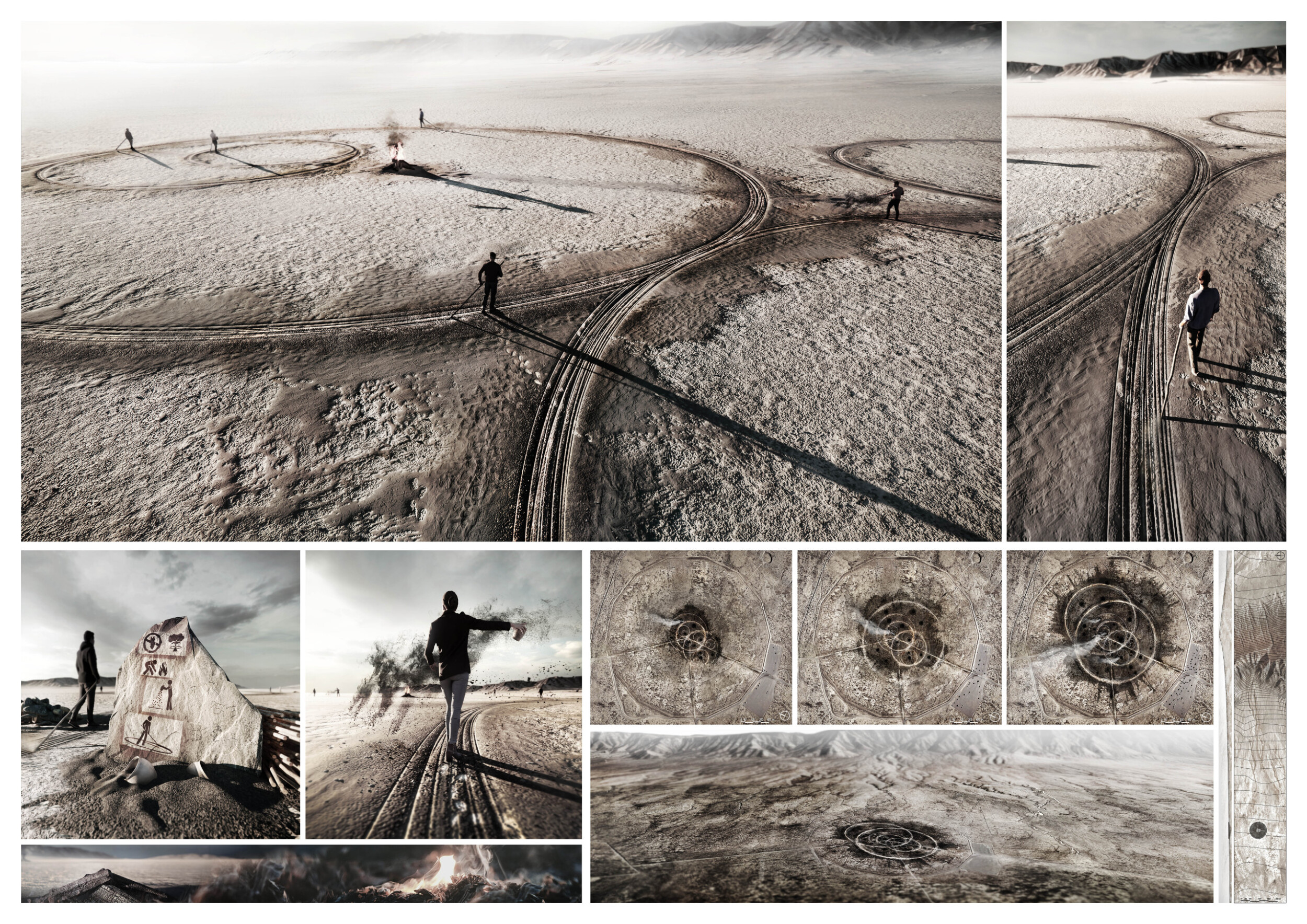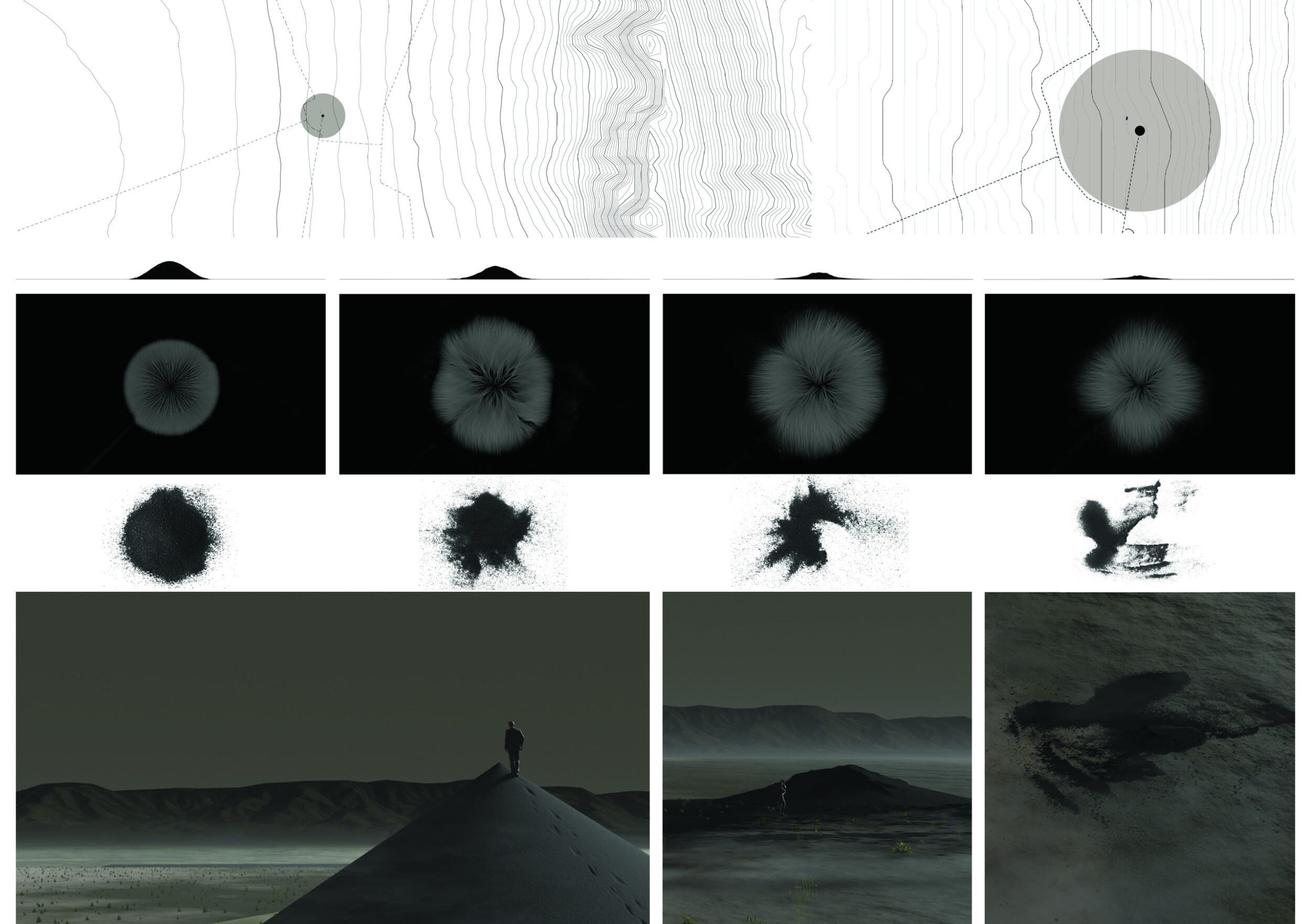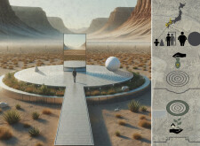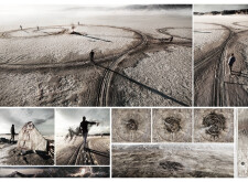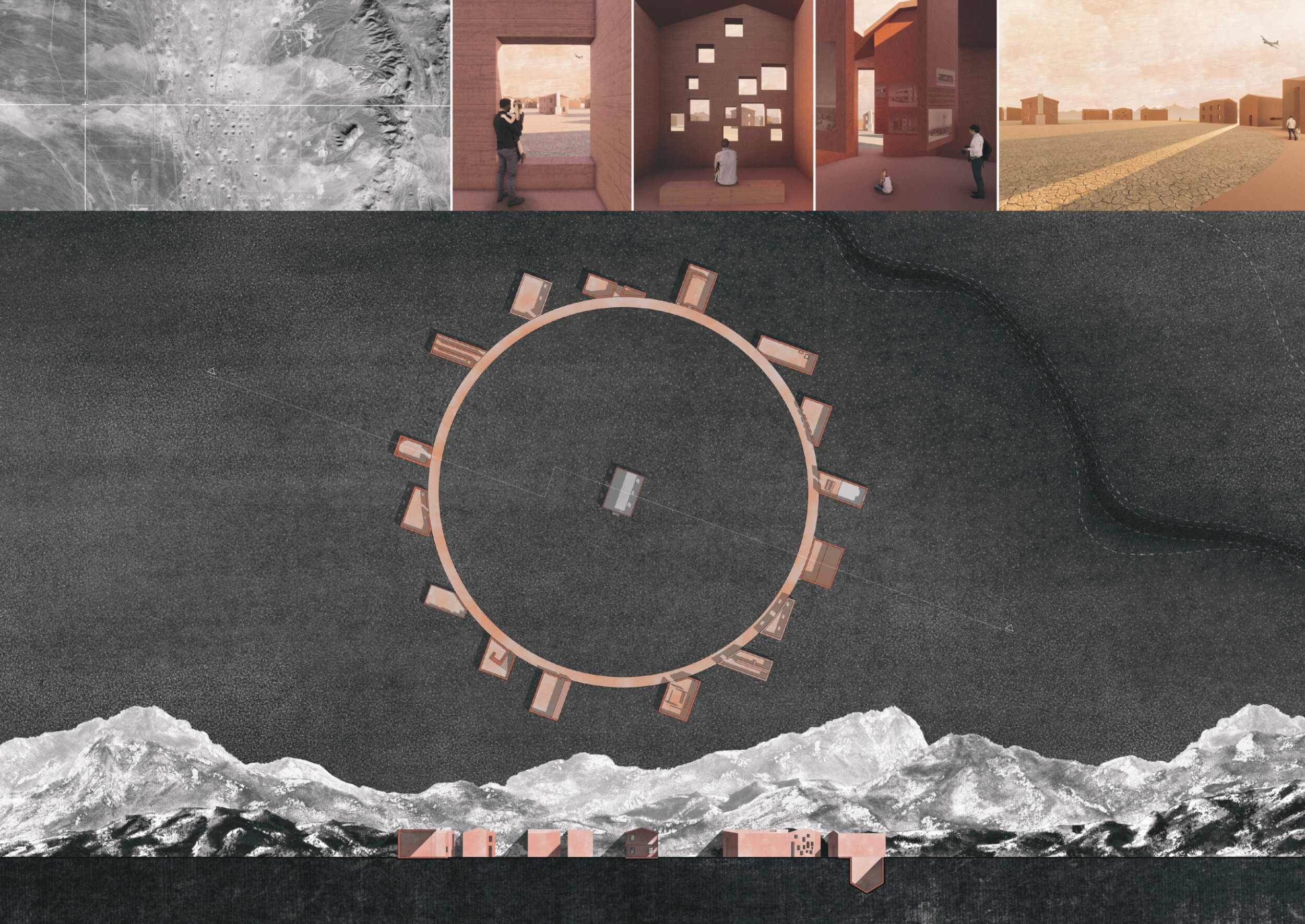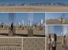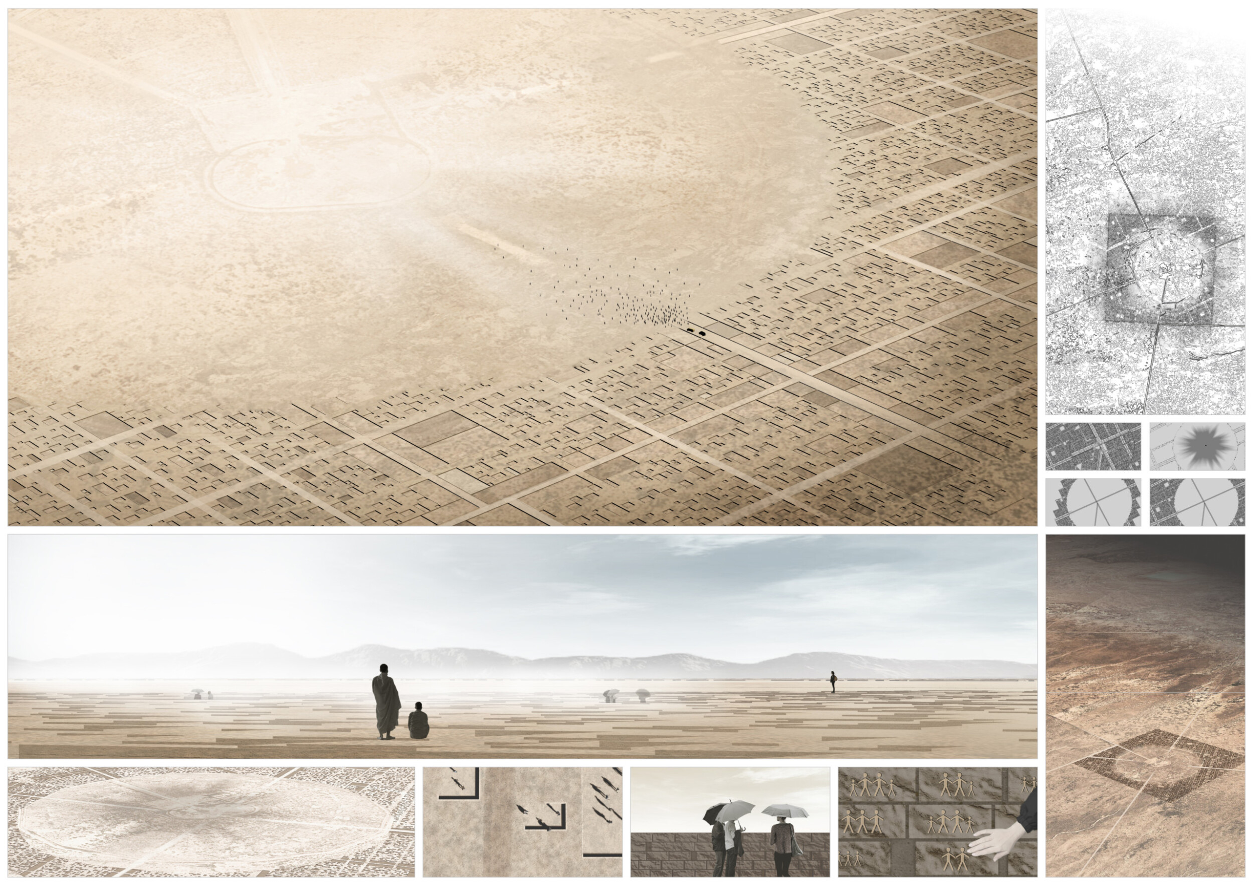 The submission is elegant in its minimalist design and minimalist means of communication. It describes a vast site in a desert location where the plan of a street grid as well as the individual buildings of a theoretical city are imprinted on the land using knee walls made of soil bricks. At its center, the plan disappears to reference the dimensional extents of a nuclear blast within the city. Read more The bricks are marked with graphics of human figures to describe an urban population but it is unclear exactly what these symbolize. A visitor appears free to wander about this site to consider the varying scales of the human, the city and the bomb.