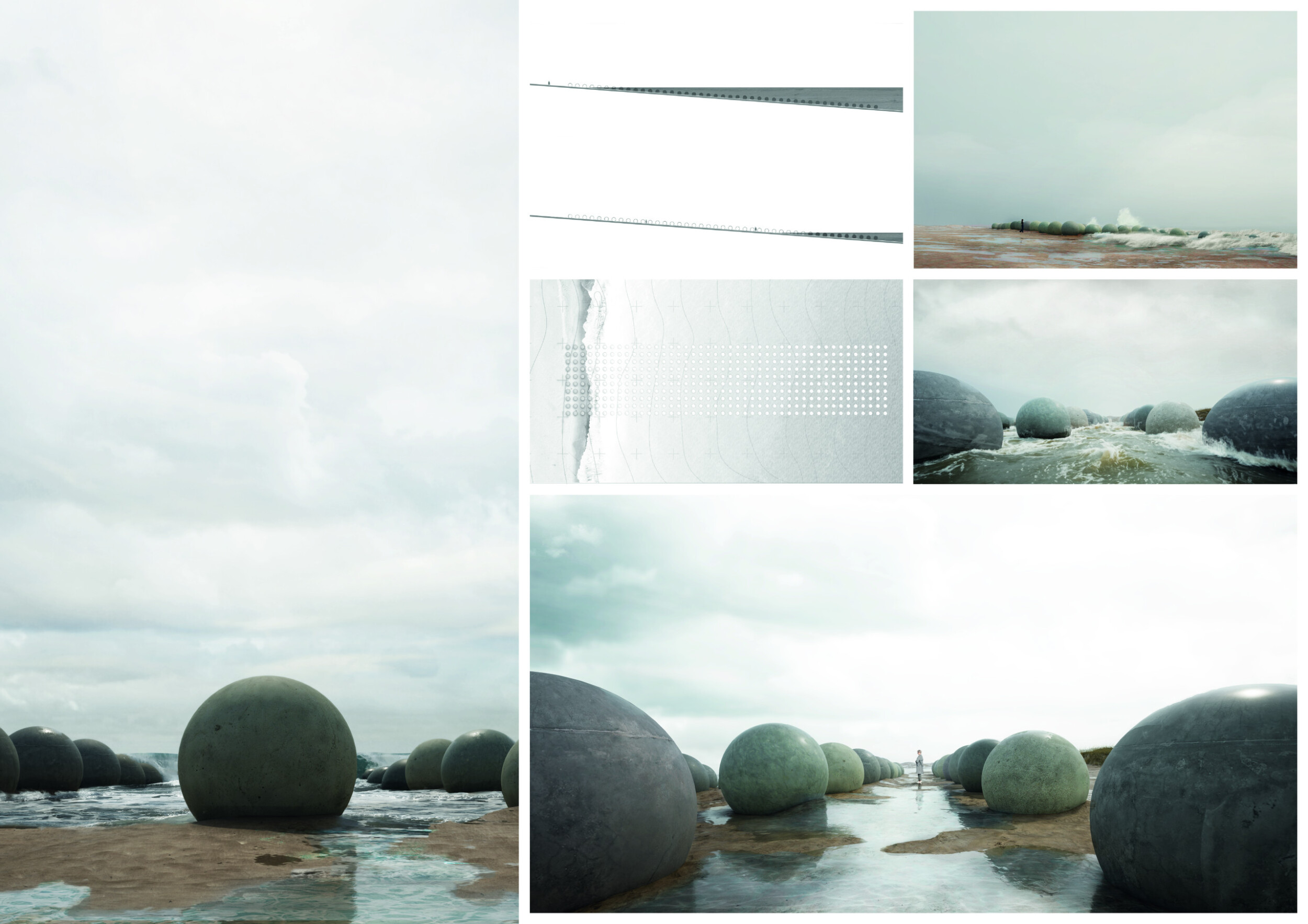 This monumental proposition establishes a strong grid of spherical elements in stone or concrete which extend from deep within the water to the sandy shore of a beachside site. It is impactful for its simple repetition and its temporal nature. The project and its accessibility changes with the ebb and flow of waves and the nature of the tides, oscillating between revealing itself and being swallowed by the sea water.