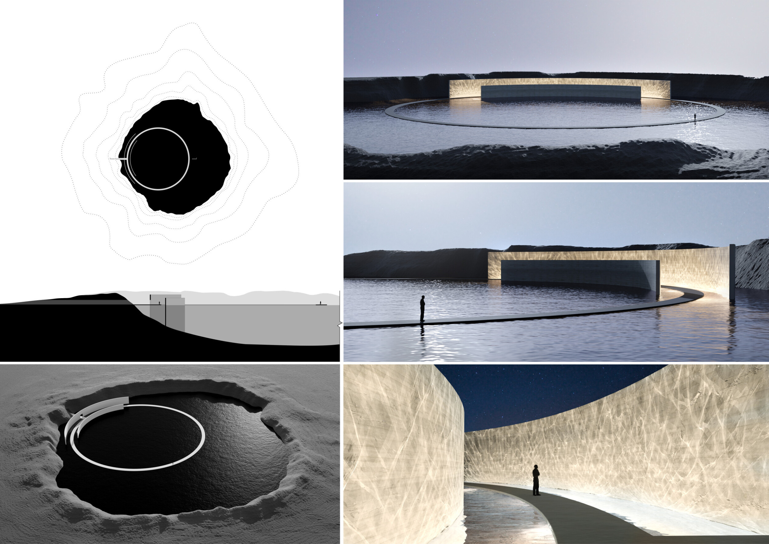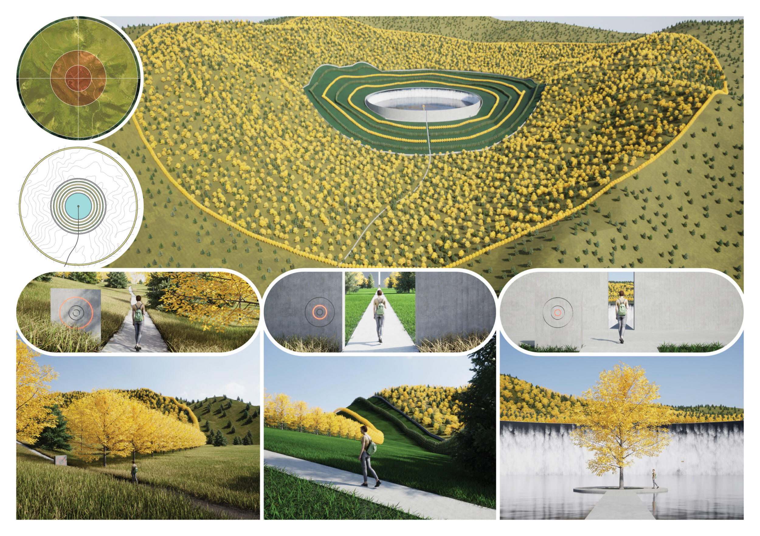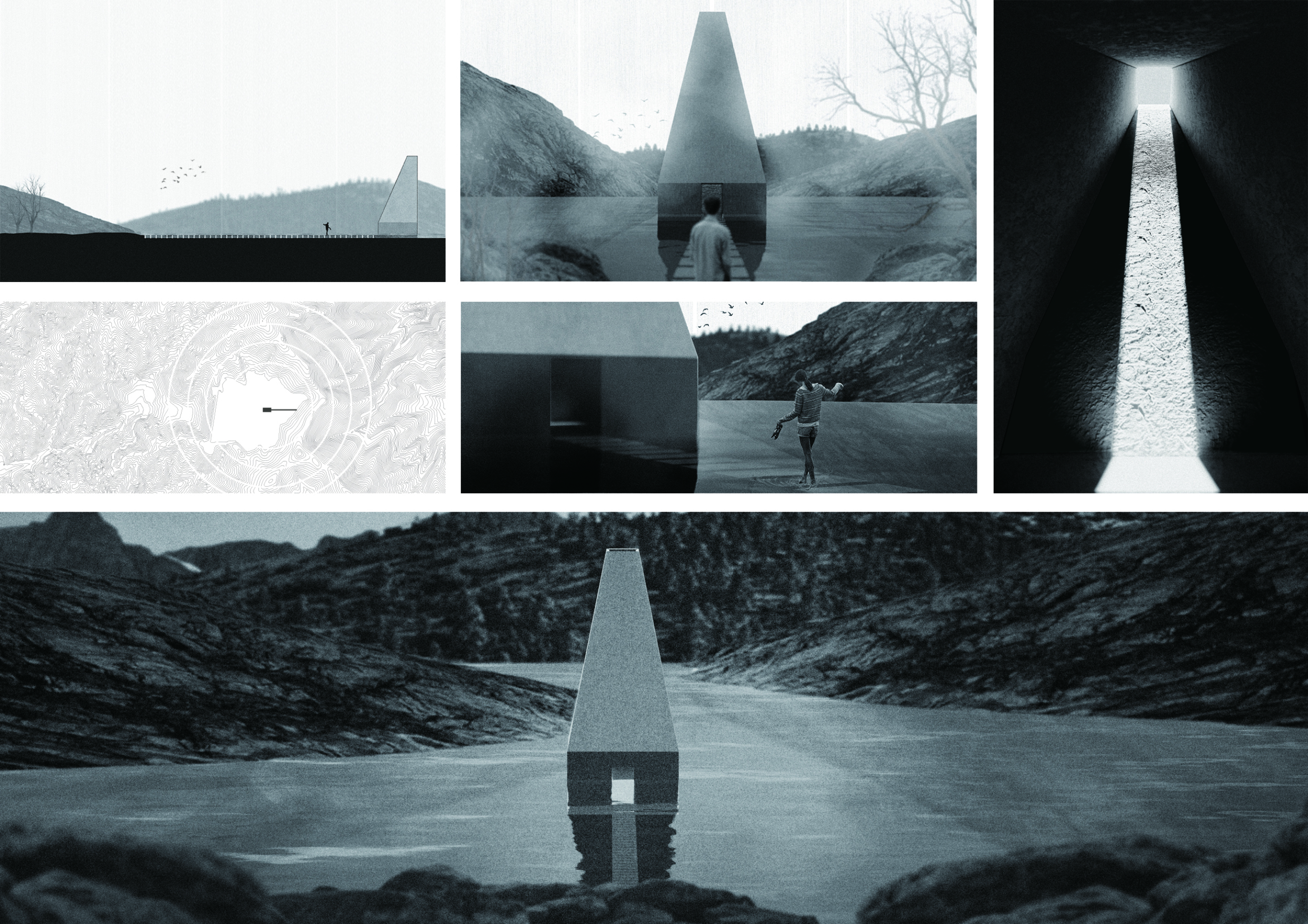 A majestic proposal that stands out through its siting and austerity. Through the interaction with landscape and water, the monolithic spheres play with contrasting effects of order and visibility, creating ever-changing spaces to experience the memorial.