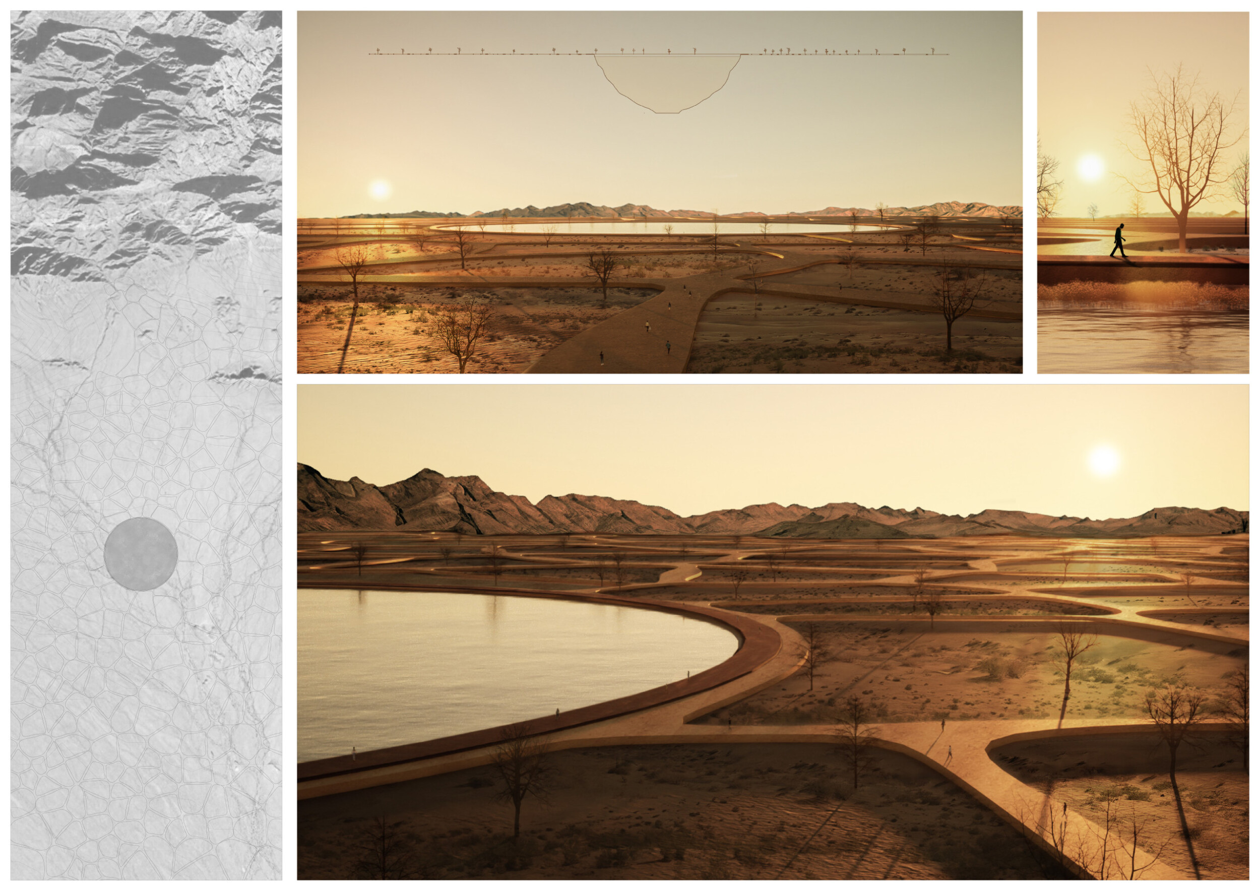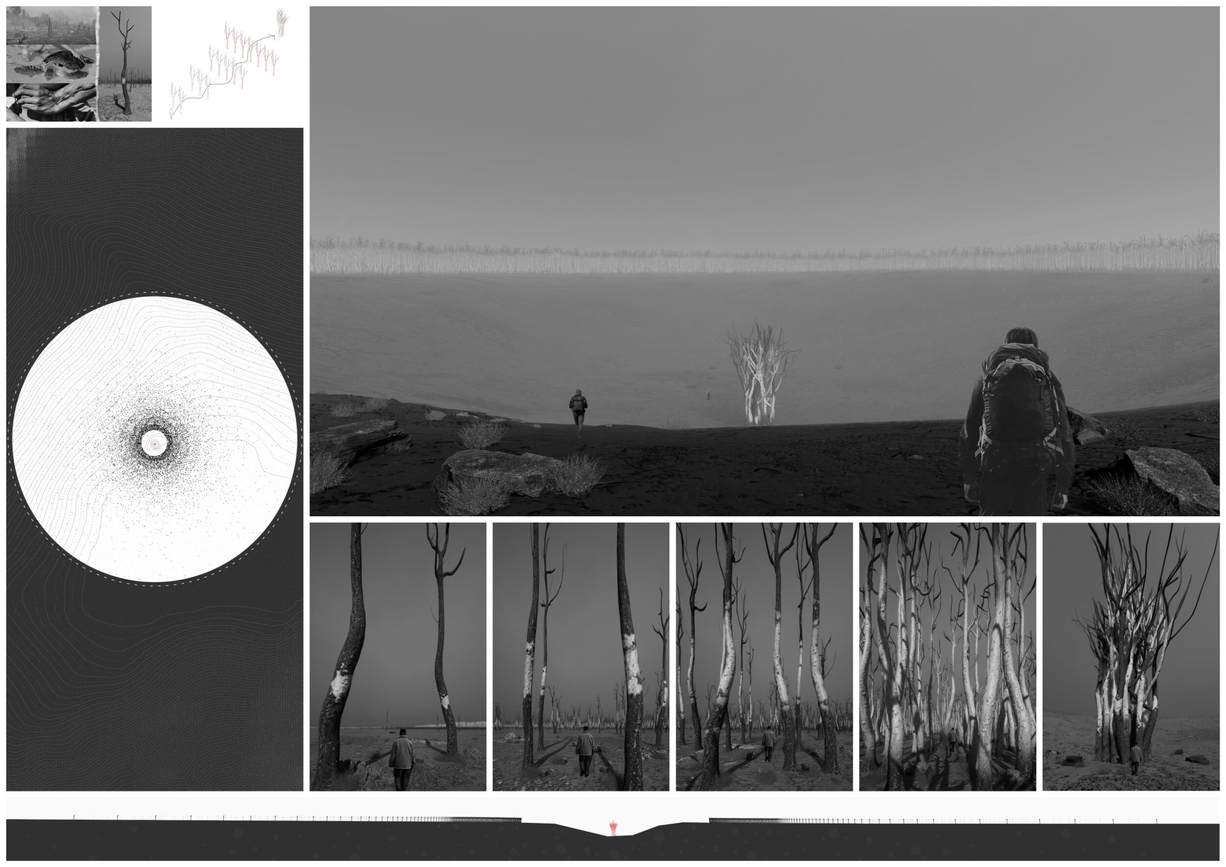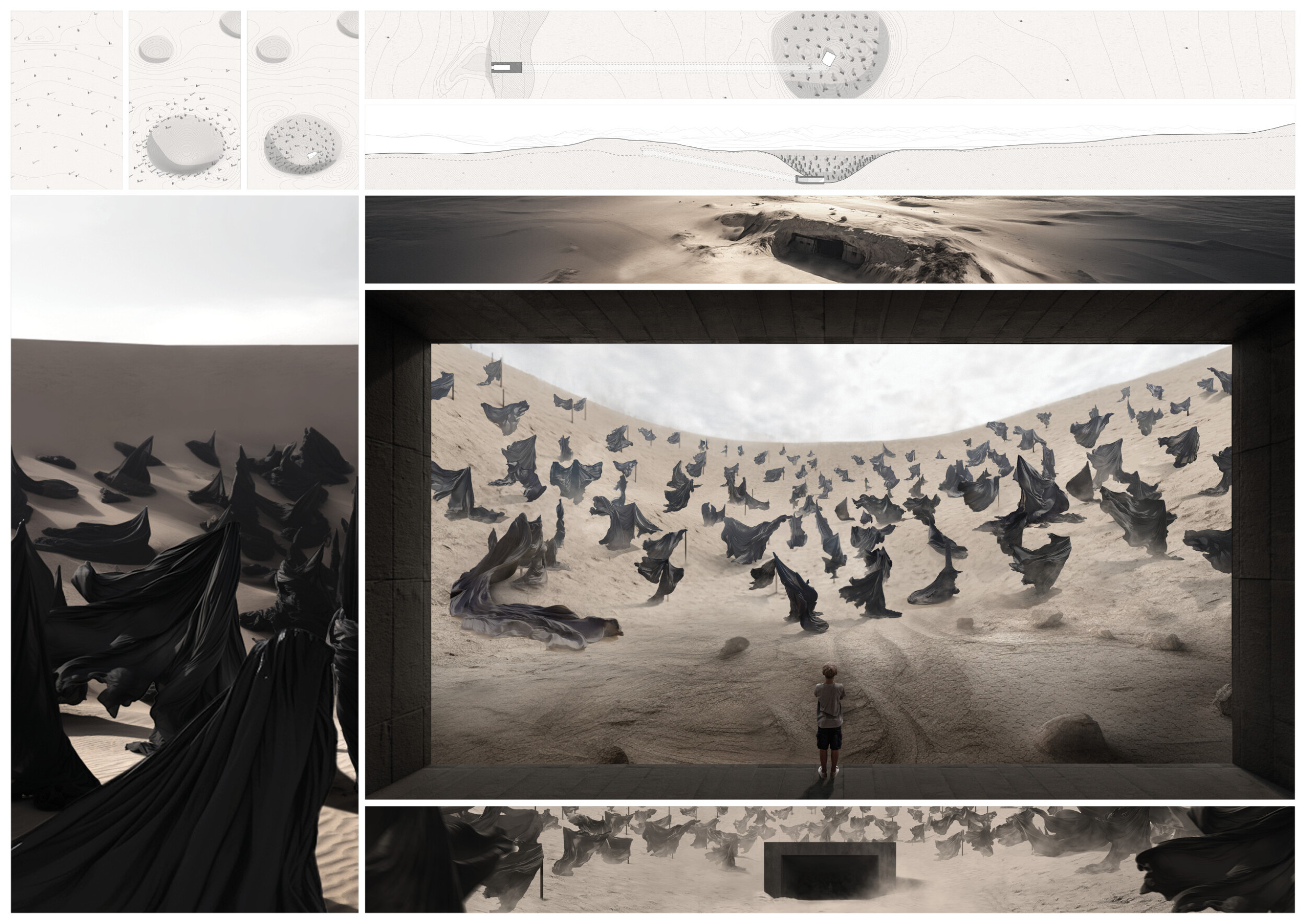 A majestic proposal that stands out through its siting and austerity. Through the interaction with landscape and water, the monolithic spheres play with contrasting effects of order and visibility, creating ever-changing spaces to experience the memorial.