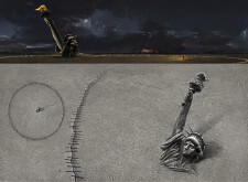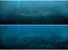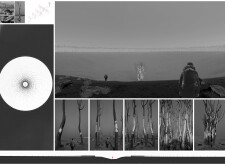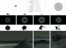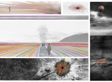 This marine proposal was the most popular entry among the jurors. It depicts a series of rods driven into the seafloor in the form of a circle to symbolize the scale of a nuclear blast, marking its perimeter and its center. The imagery clearly conveys the passage of time, describing a visitor who makes his way by boat across the memorial, effectively communicating its grand scale and the effort required to traverse it. Read more The rods appear to be symbols and physical markers of a nuclear blast, as well as a means for marine life growth to take hold and flourish over time.