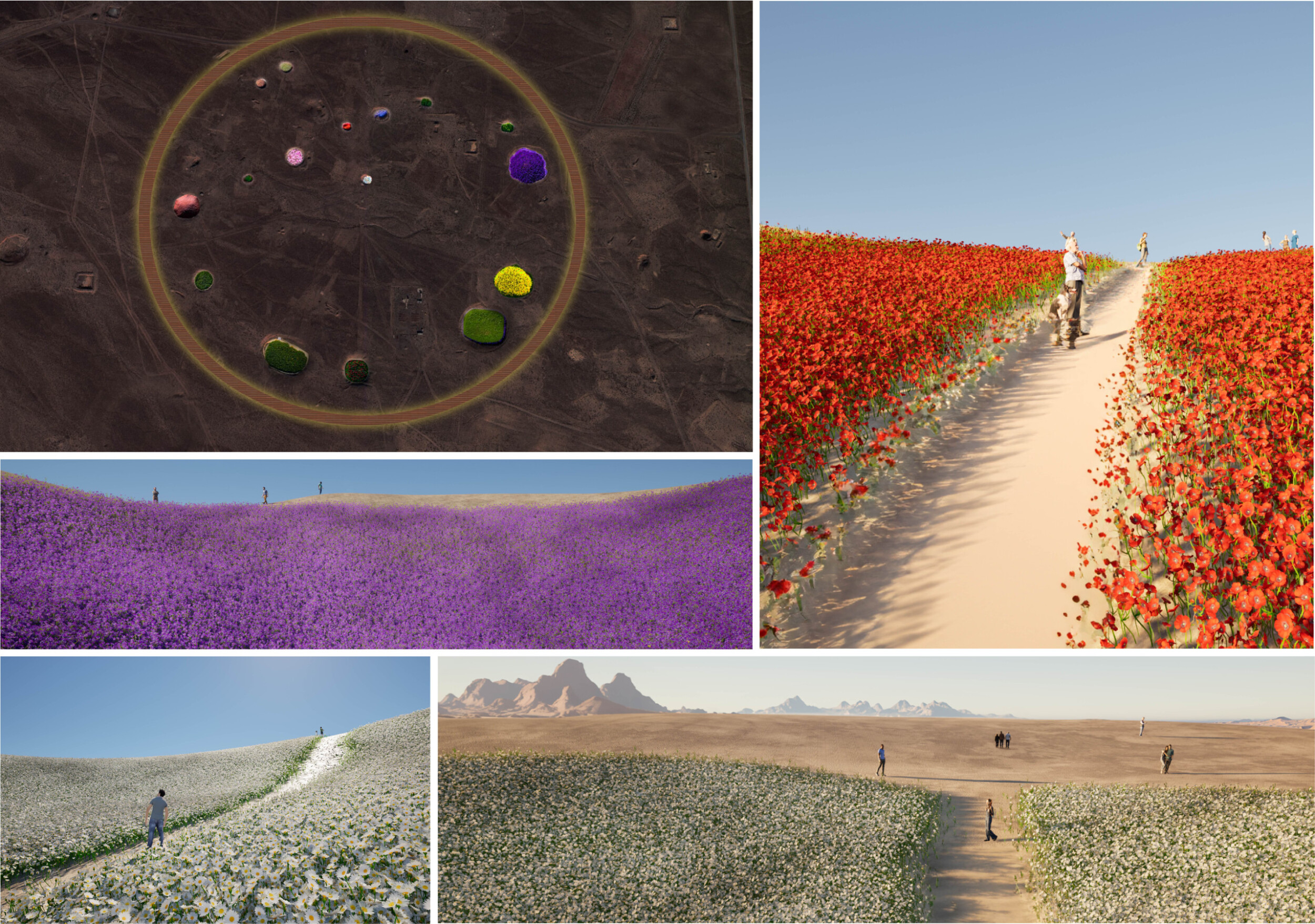 The memorial consists of a large ring which appears to be some form of wooden boardwalk surrounding a vast field that is spotted with flower beds. The project is minimal and colorful and conveys an opportunity for natural regrowth on a site of destruction. Visitors wander this pseudo-garden, alternating between points of life and color, and points of dryness and emptiness.