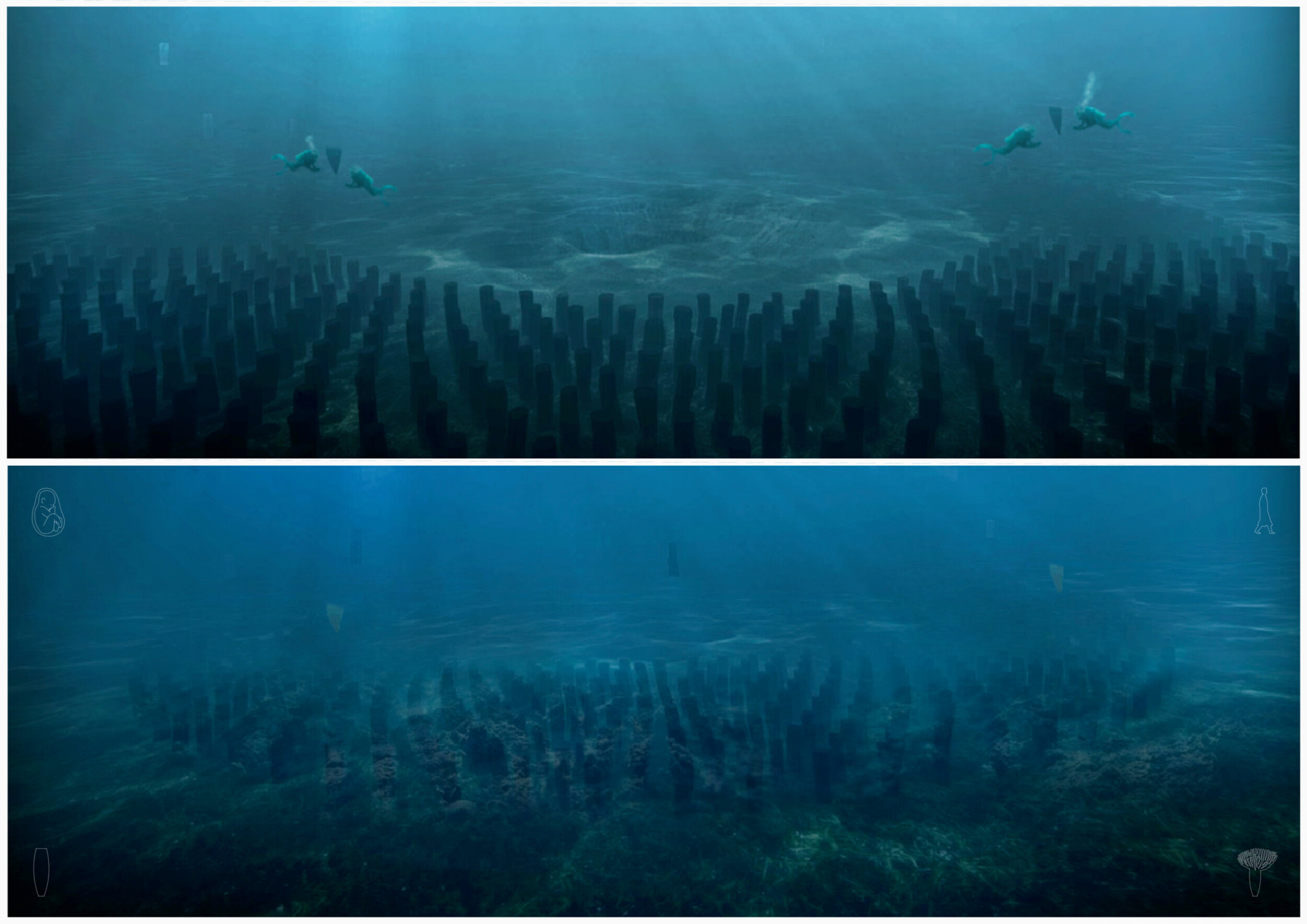 A promising concept, but there is an opportunity to enhance its potential. While the core idea is commendable, there is a suggestion to reconsider the realism of the marine life representation. Consider for instance exploring the integration of a reef-like infrastructure that aligns more closely with the aspirations of supporting sea life.