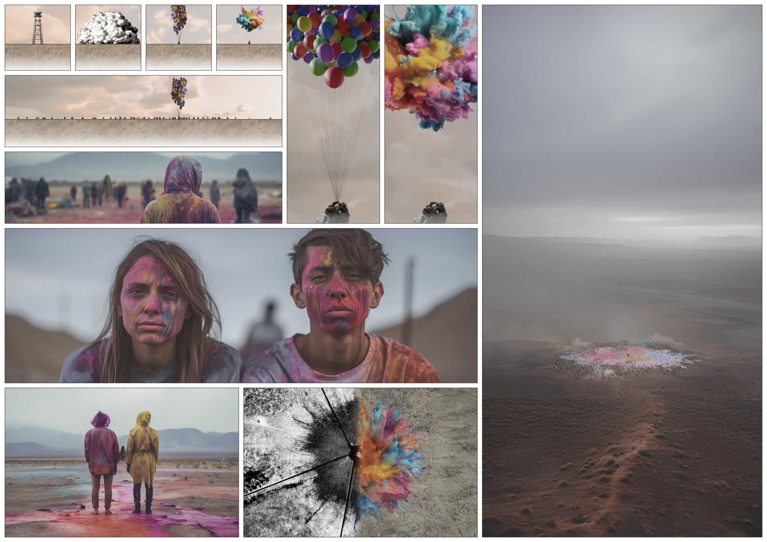 I appreciate the way this proposal handles its heavy subject matter with a light touch, reimagining the impact and explosive pattern of a nuclear bomb in a playful yet thought-provoking manner. Simultaneously, its inherent temporality disrupts the conventional mindset that monuments should perennially endure; instead, this monument can be created instantly at any corner of the world, thus influencing a broader audience.