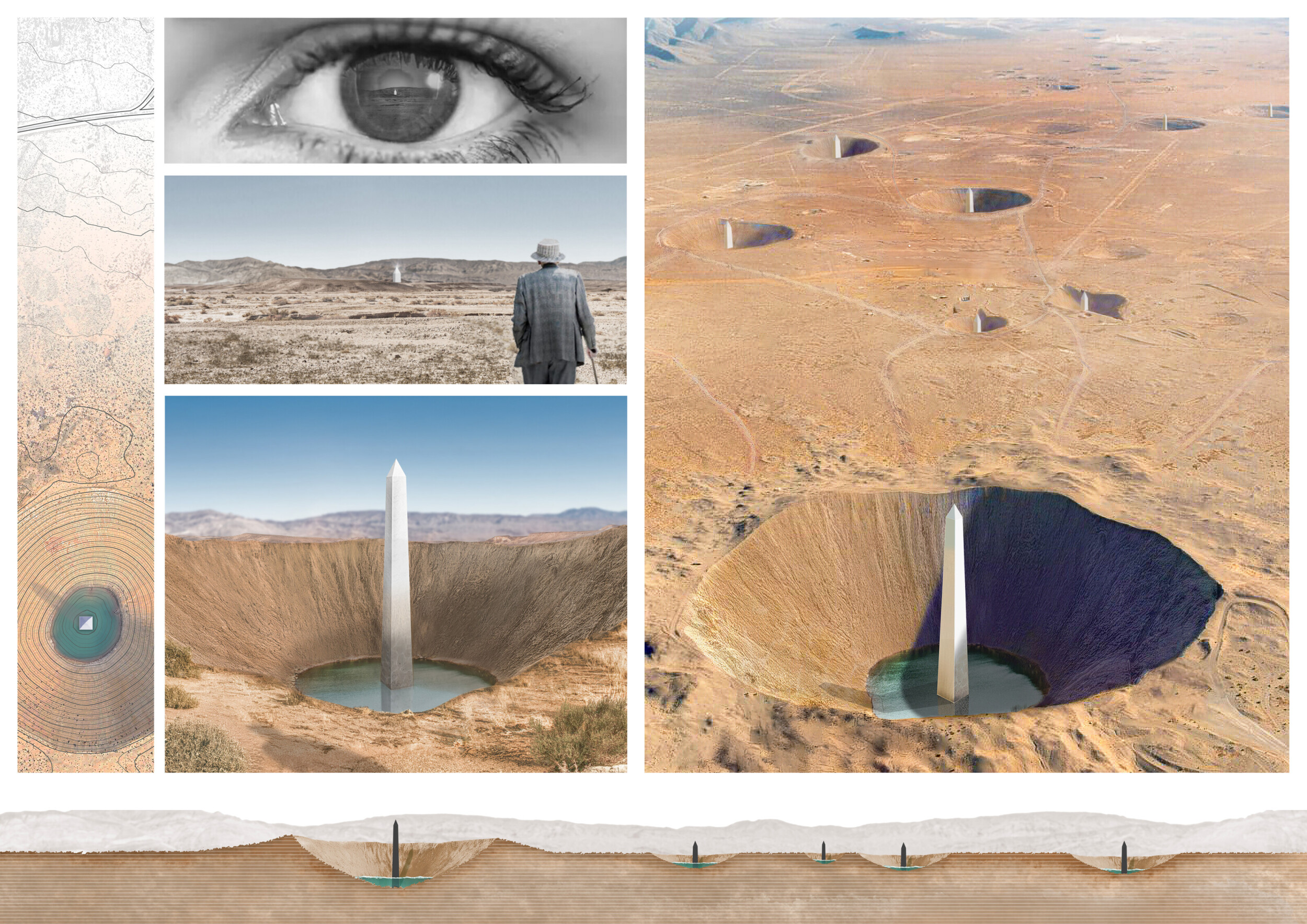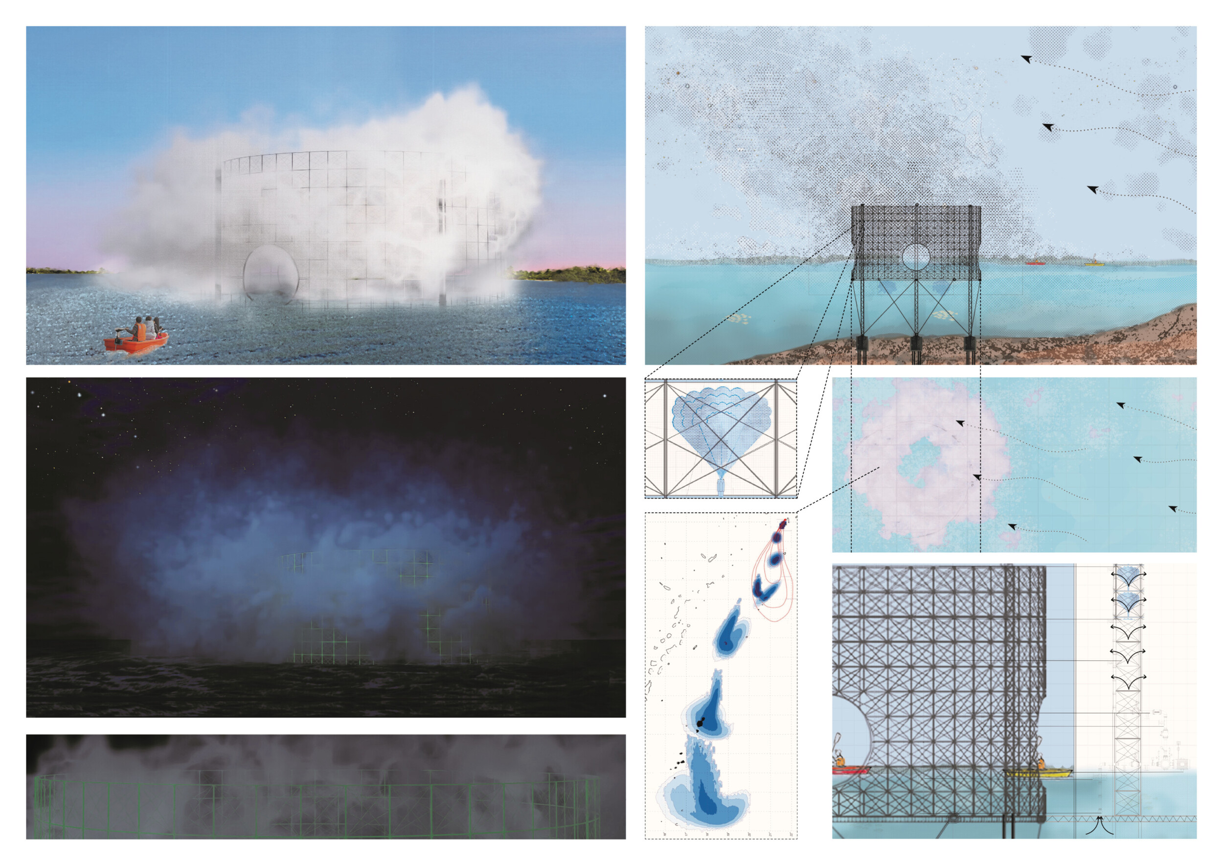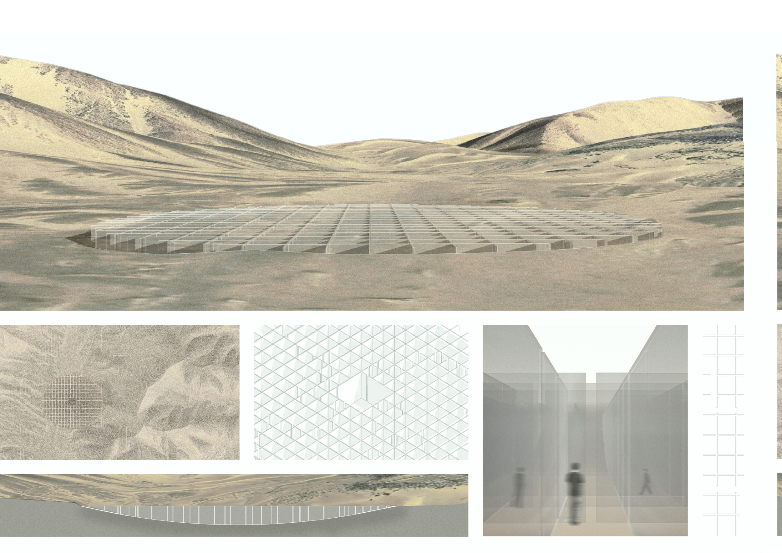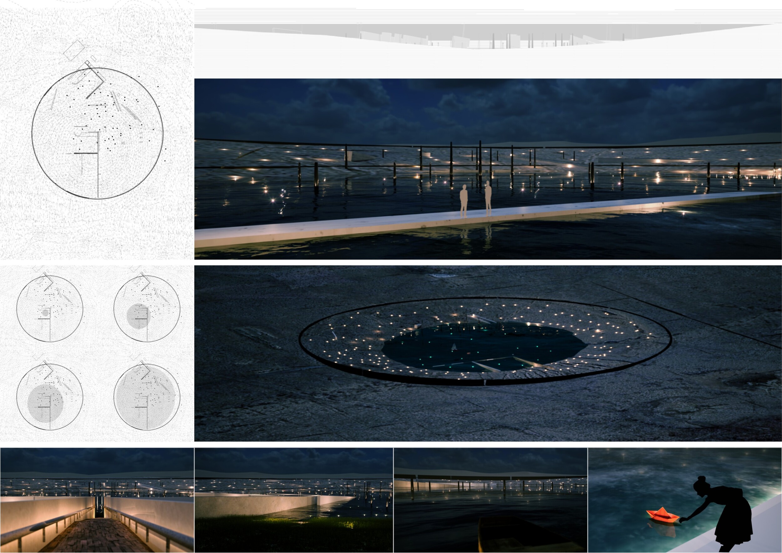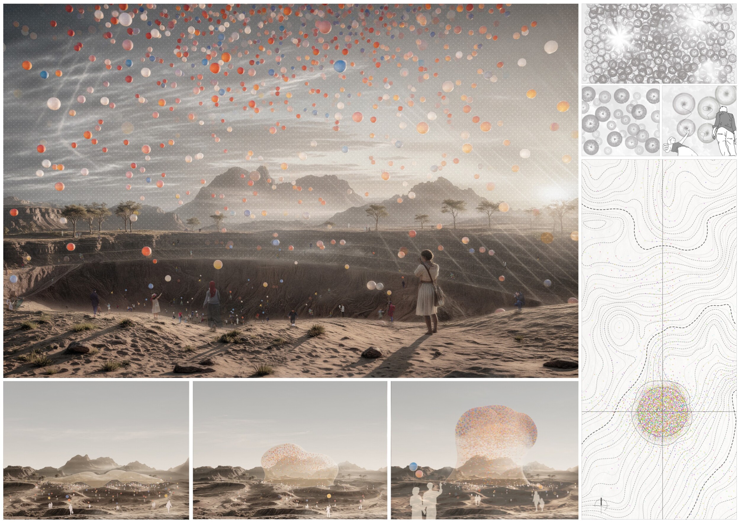 The project envisions a memorial for the last nuclear bomb through a landscape intervention that transforms destruction into renewal. A circular water installation generates mist, evoking the image of an explosion while simultaneously creating rainbows, symbolizing hope. The design’s ephemeral quality enhances its poetic impact, making it a striking presence on the horizon. The intervention integrates with the natural environment, fostering an evolving atmospheric experience.