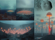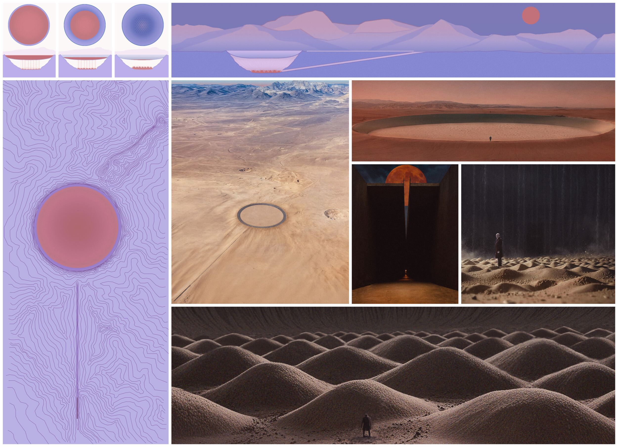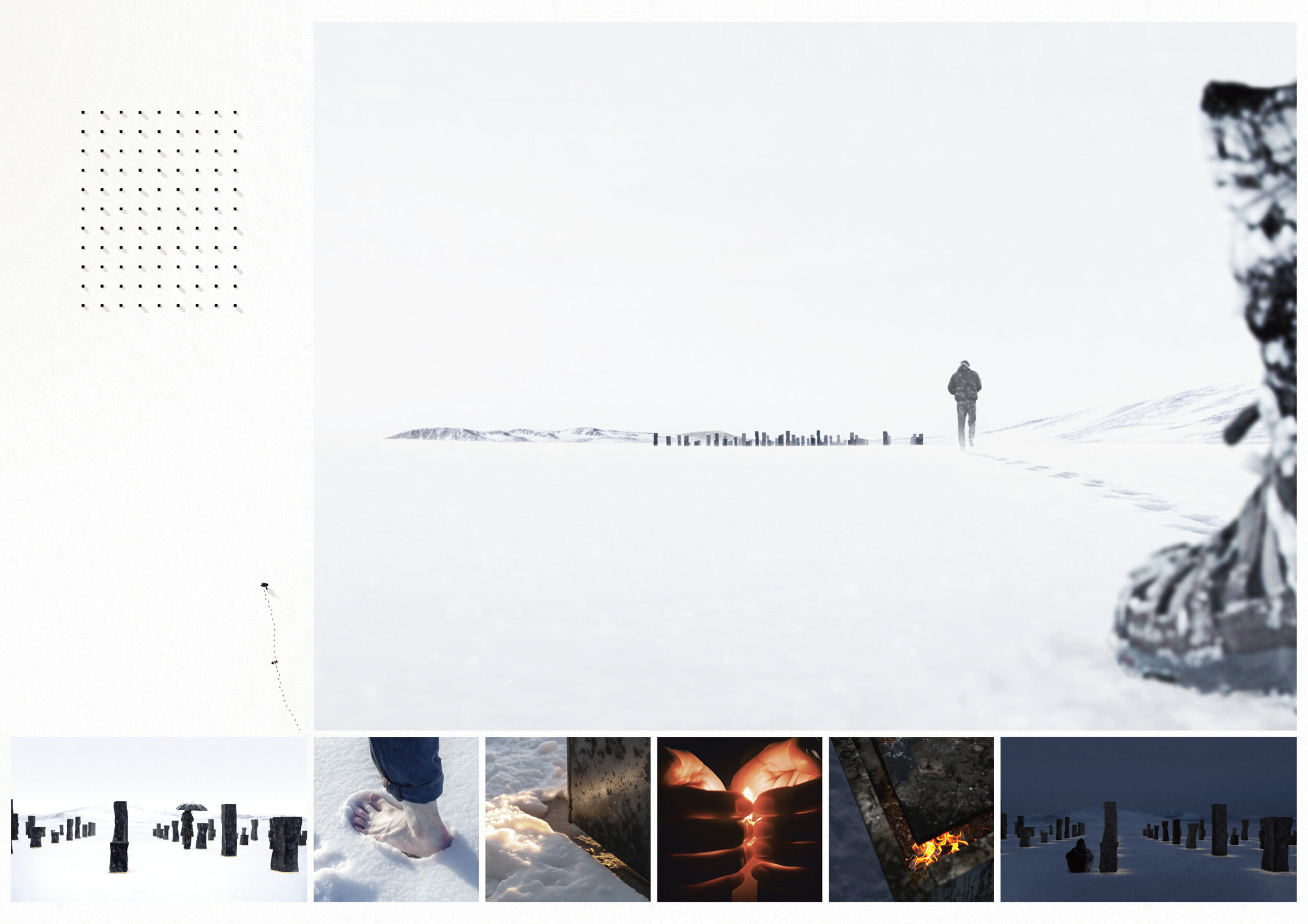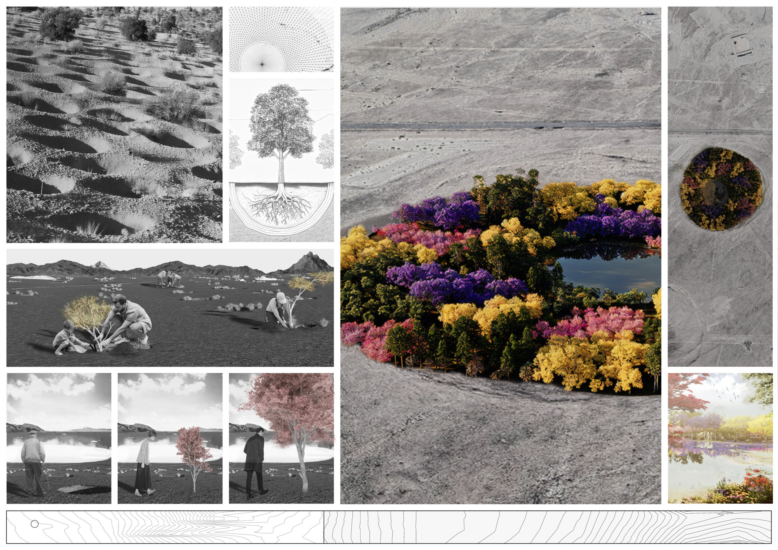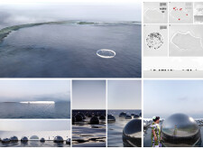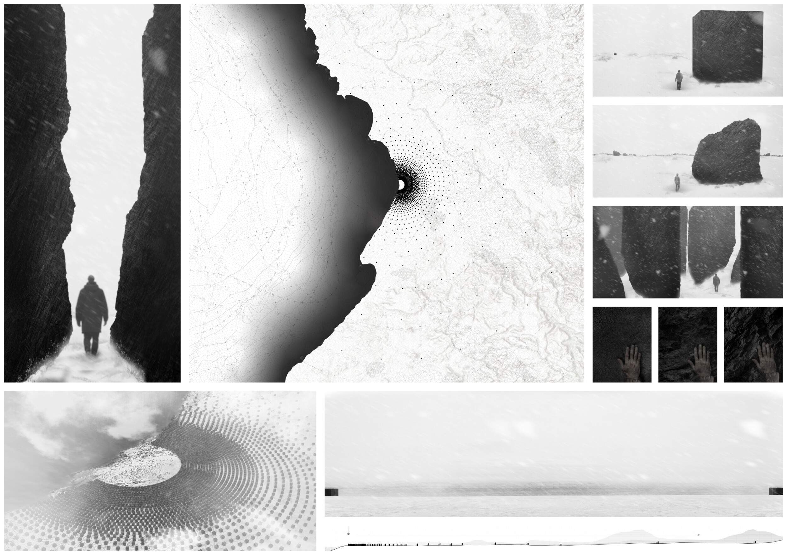 The project envisions a memorial for the last nuclear bomb through a landscape intervention that transforms destruction into renewal. A circular water installation generates mist, evoking the image of an explosion while simultaneously creating rainbows, symbolizing hope. The design’s ephemeral quality enhances its poetic impact, making it a striking presence on the horizon. The intervention integrates with the natural environment, fostering an evolving atmospheric experience.