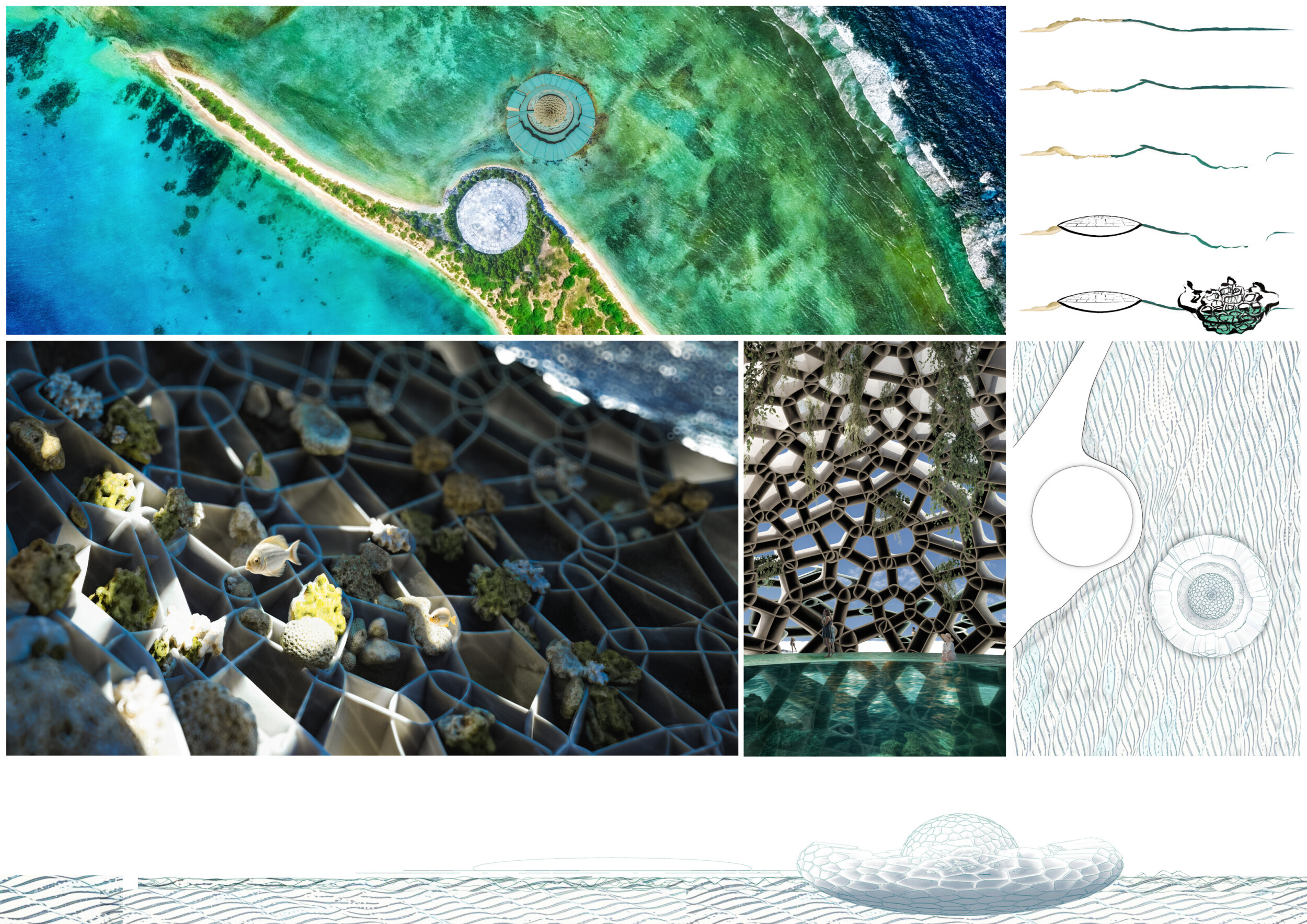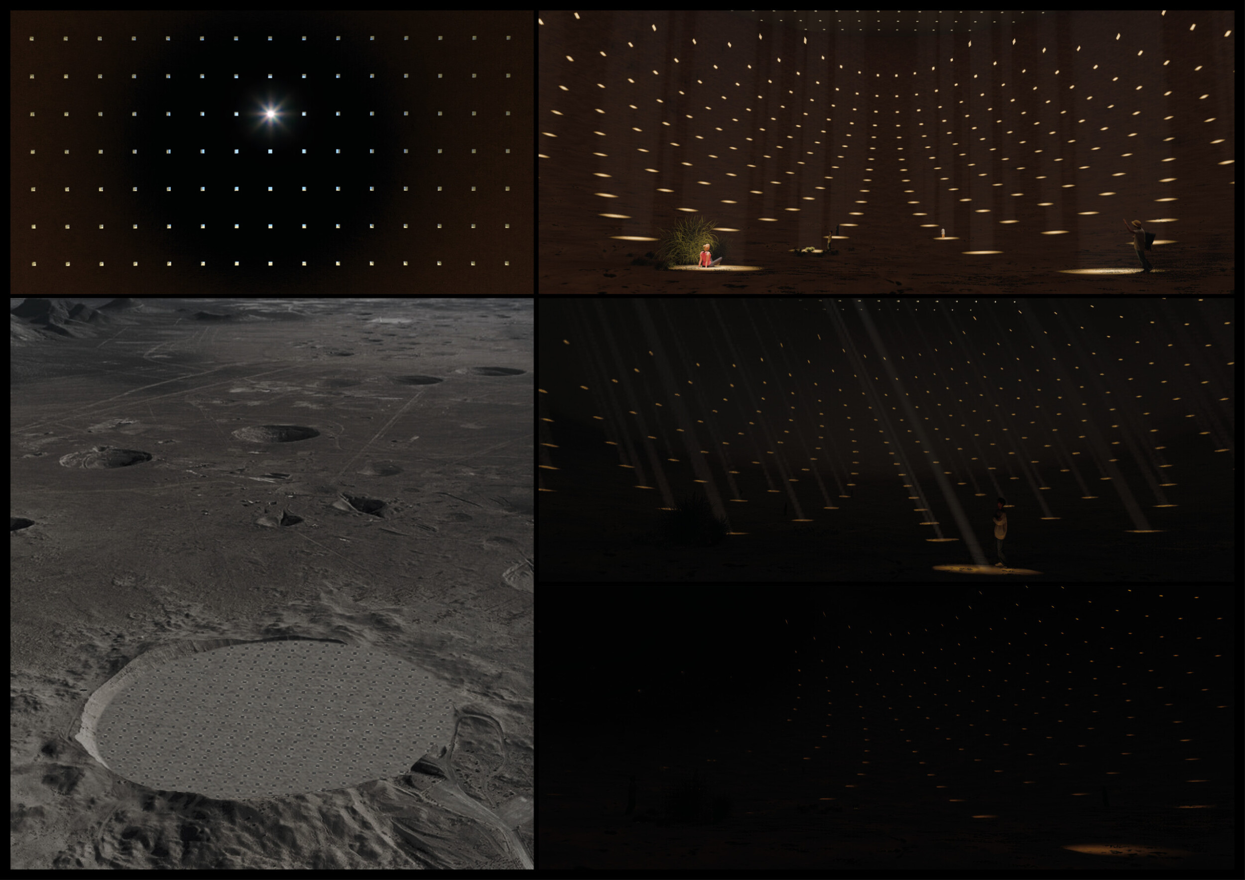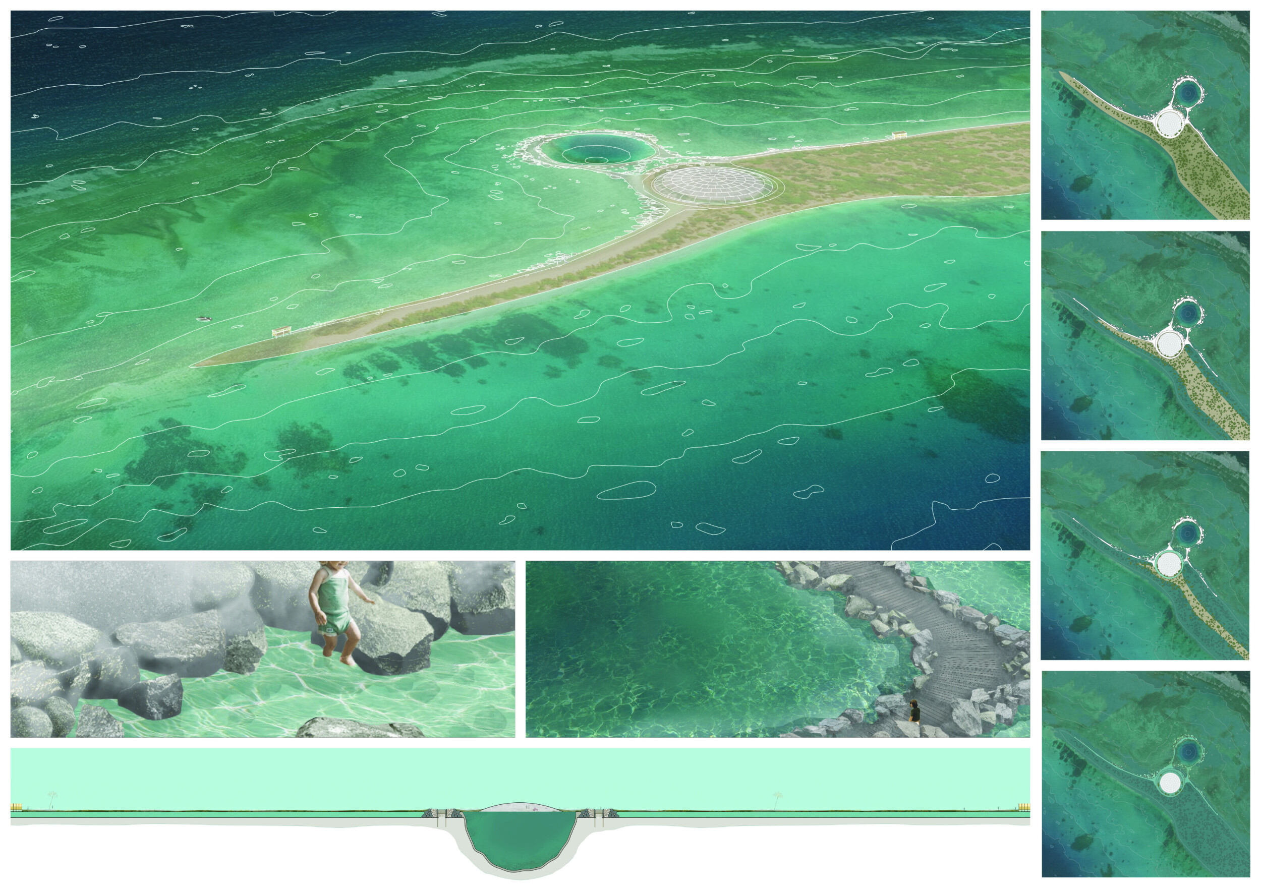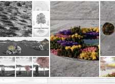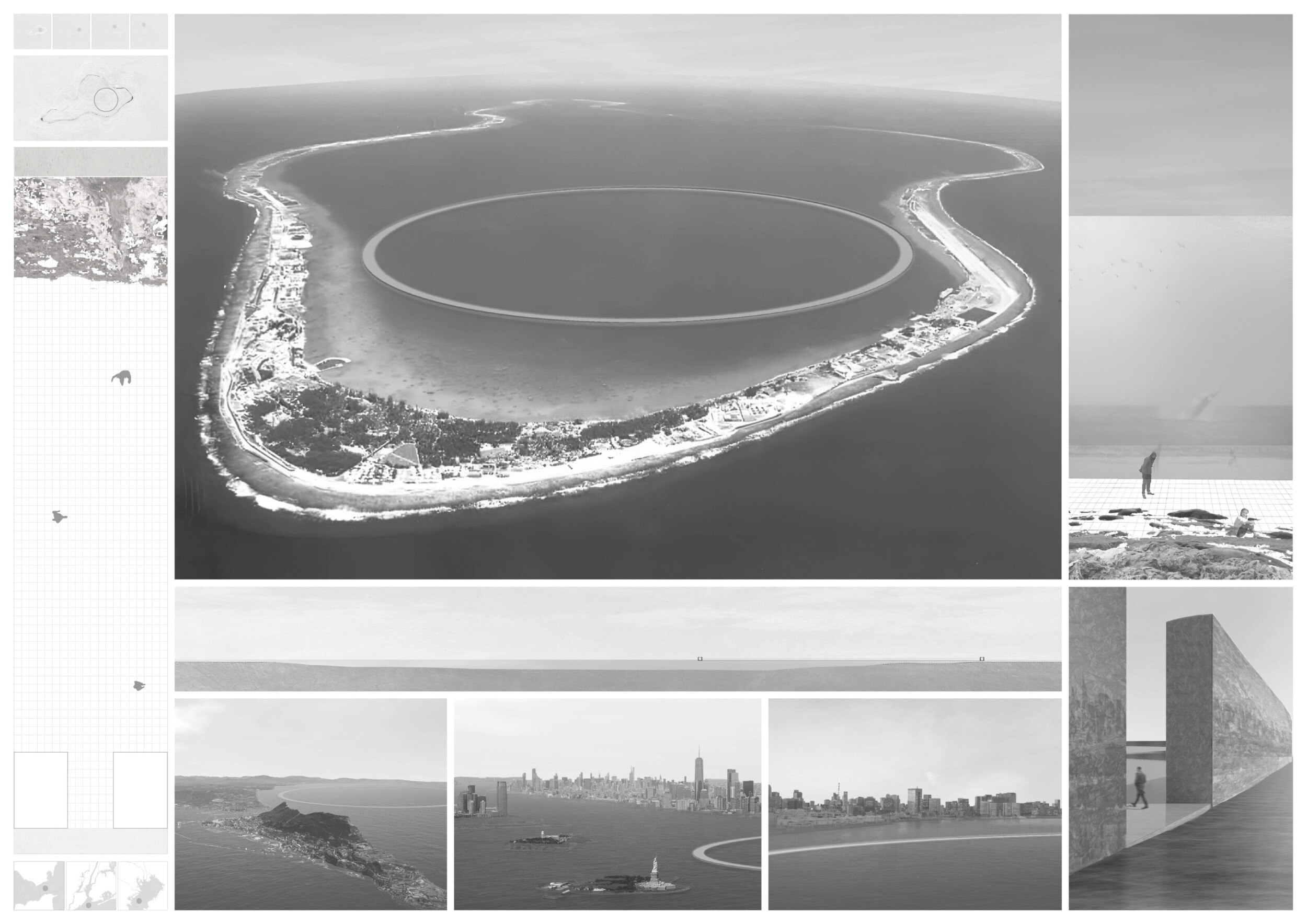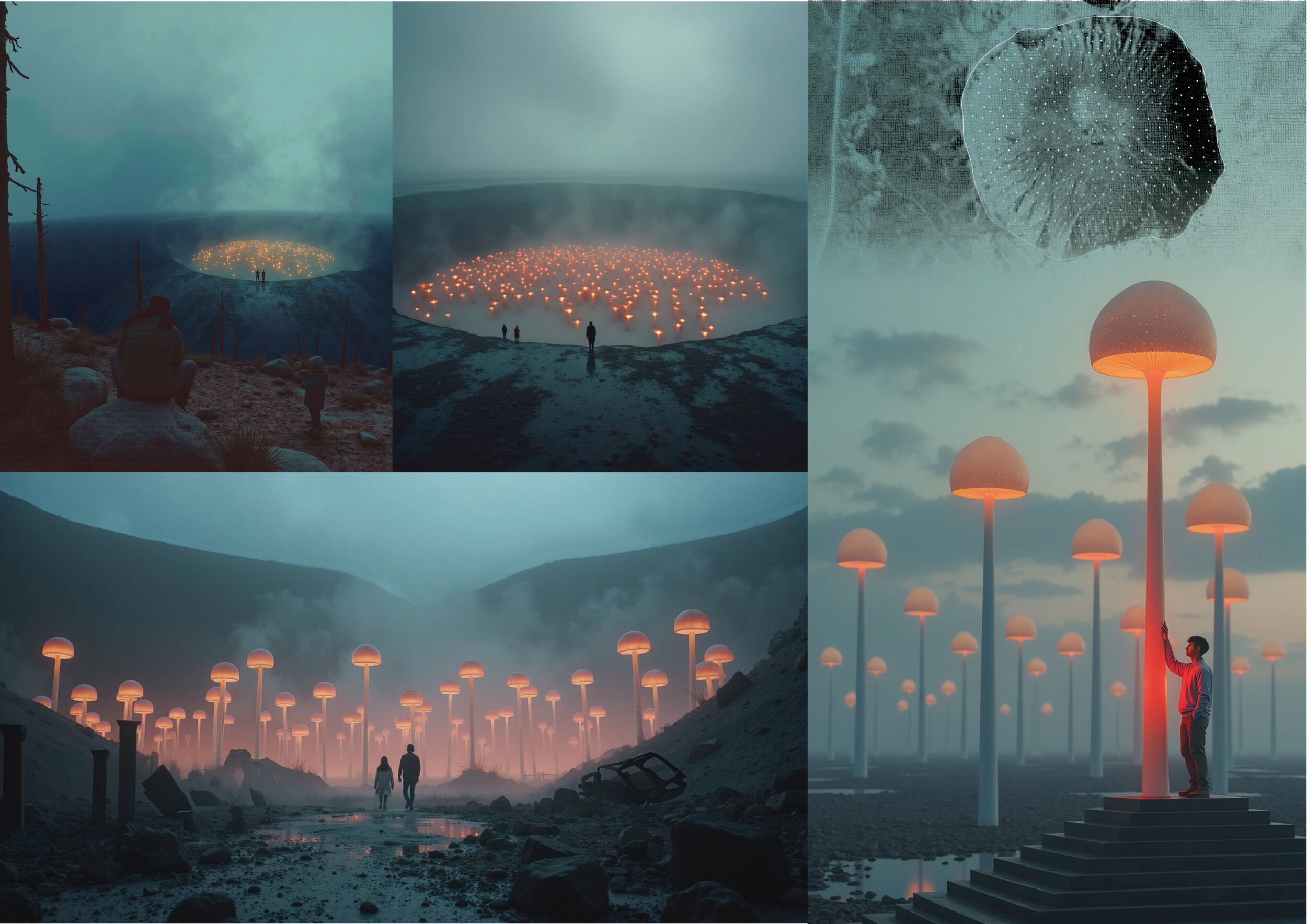 The project envisions a memorial for the last nuclear bomb through a landscape intervention that transforms destruction into renewal. A circular water installation generates mist, evoking the image of an explosion while simultaneously creating rainbows, symbolizing hope. The design’s ephemeral quality enhances its poetic impact, making it a striking presence on the horizon. The intervention integrates with the natural environment, fostering an evolving atmospheric experience.