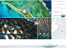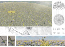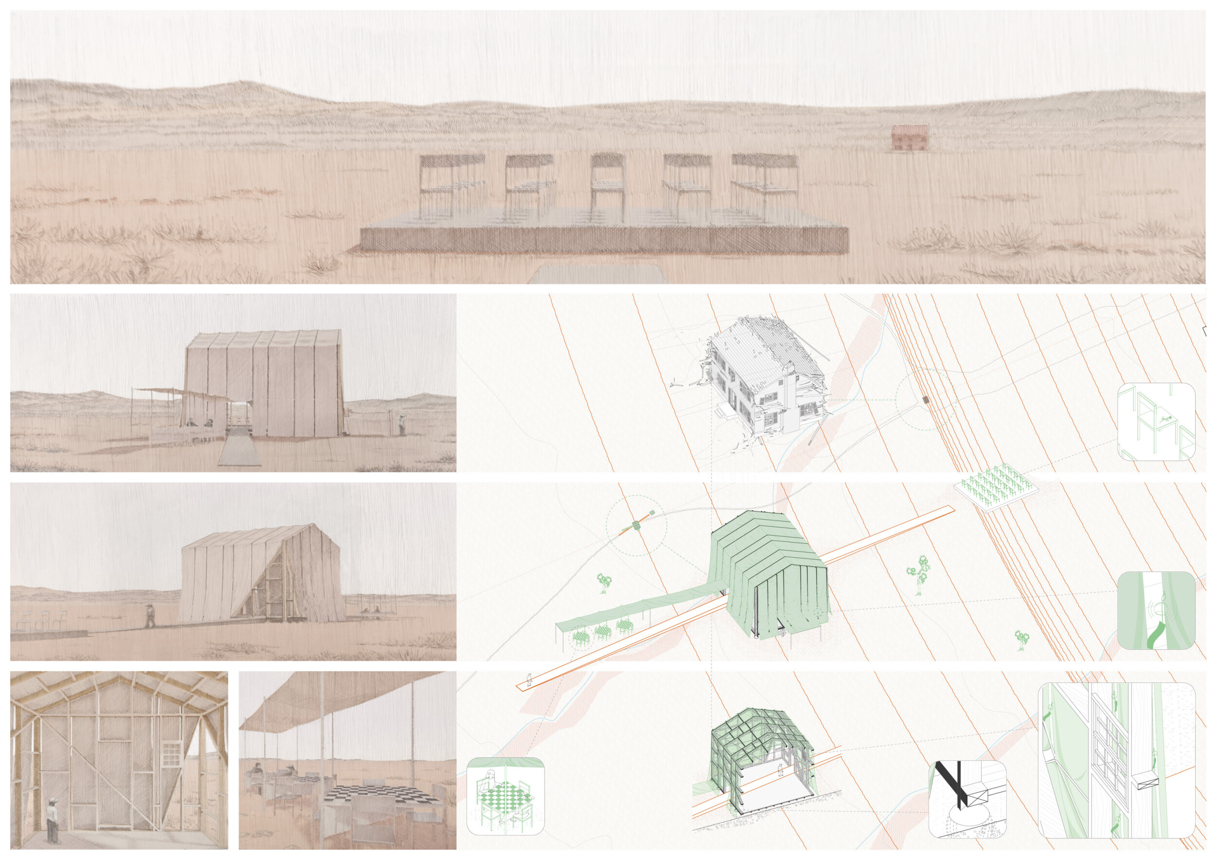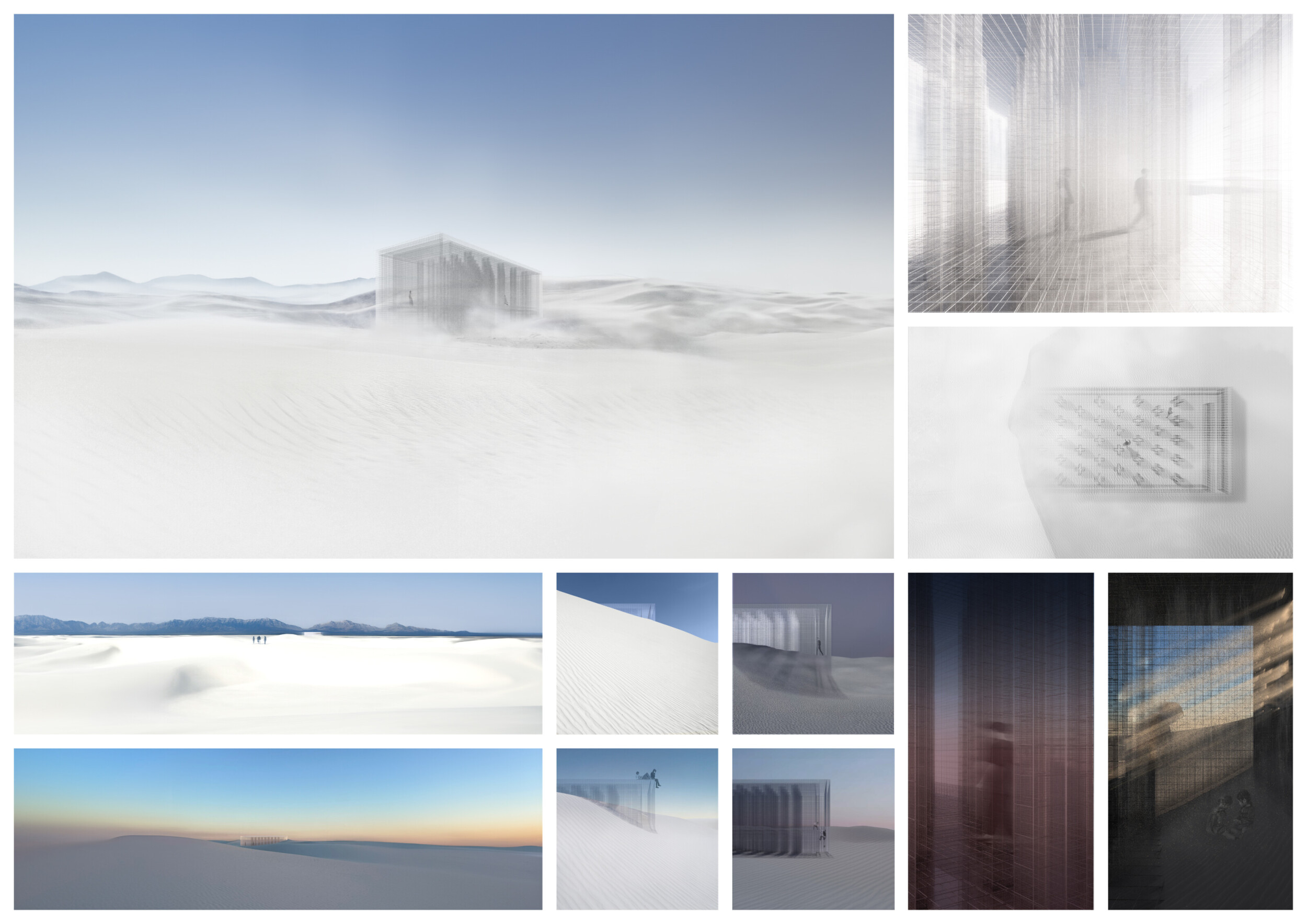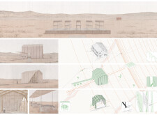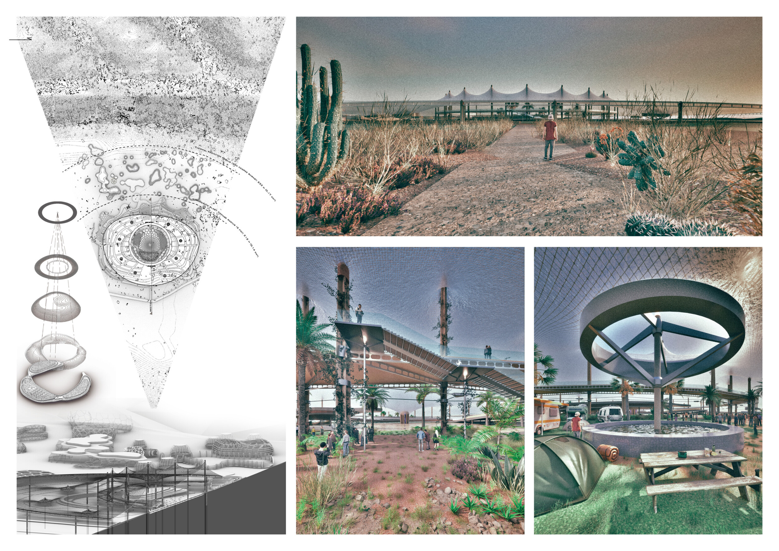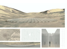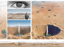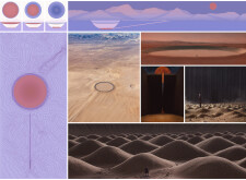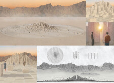 This presentation effectively conveys the project’s conceptual intent through a well-balanced mix of plan drawings, aerial perspectives, and atmospheric renderings. The human figure in blue provides a strong focal point, creating contrast against the muted sandy tones while reinforcing scale. The wireframe structures emerging from the landscape evoke themes of memory and absence, blending poetic storytelling with methodical precision. Read more The layout ensures clarity, guiding the viewer through different scales. While the color balance and technical clarity are strong, the presentation would benefit from a detail showing the materiality and constructability of the wire mesh. Even as a conceptual project, this addition would reinforce its architectural feasibility, making it feel like a serious, potentially realizable proposal.