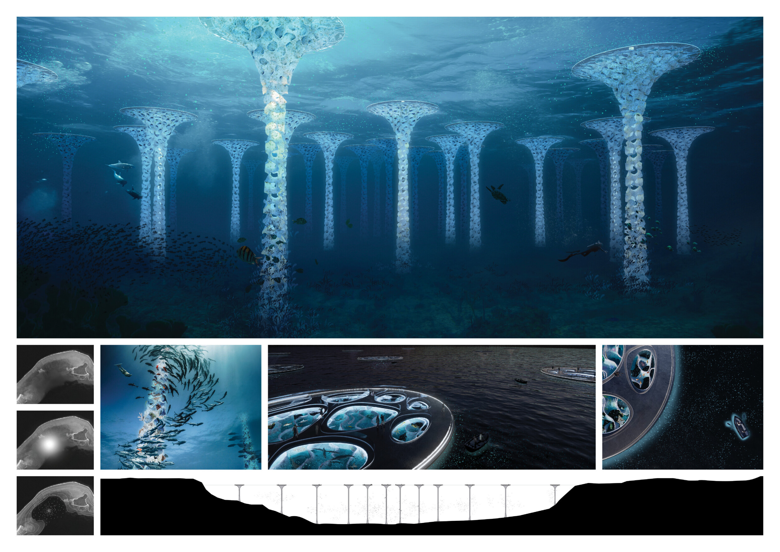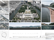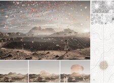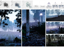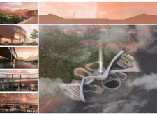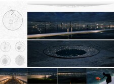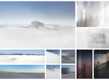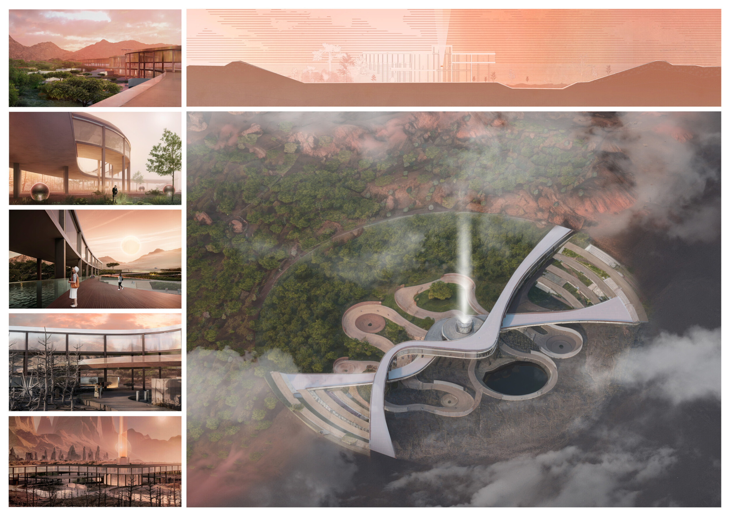 This presentation excels in communicating an ephemeral concept, a challenge for architectural and design projects. The use of mist and light to generate a rainbow creates a poetic and atmospheric response to the theme, reinforced by strong color balance and clear, well-composed visuals. The large-scale aerial perspectives effectively convey the project’s impact on the landscape, but the lack of closer human-scale views limits the viewer’s ability to understand its experiential qualities. Read more Additionally, while the diagrams and renderings are compelling, the presentation would benefit from a technical detail illustrating the mist-making mechanism, clarifying how this atmospheric effect is achieved.