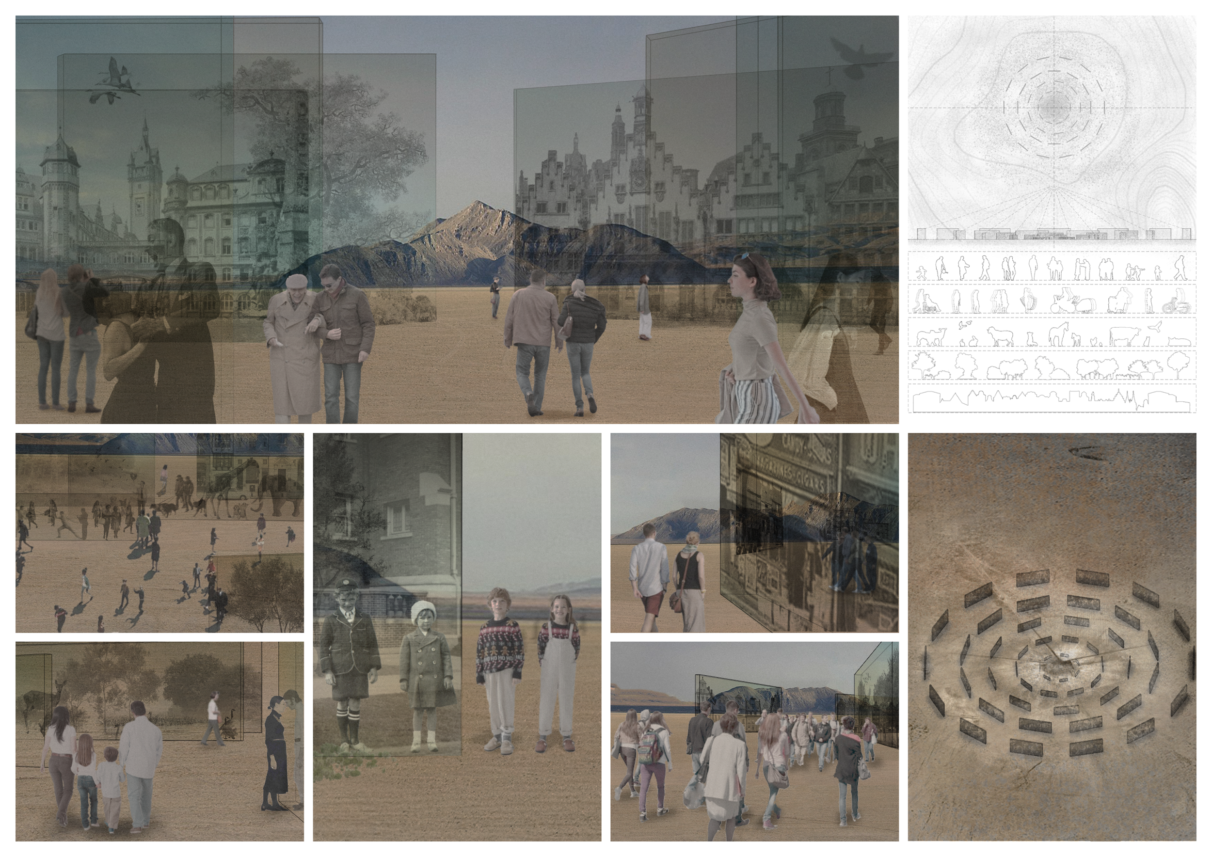 The project presents a memorial using sand and metal to depict a post-apocalyptic vision of what appears to be Rome reduced to an archaeological remnant. The design evokes the destruction and preservation paradox, allowing viewers to observe the site from above or navigate its fractured streets leading to a central void. A ghostly wireframe reconstruction of a vanished temple stands as the focal point, symbolizing loss and memory. Read more The restrained material palette reinforces themes of impermanence and time. While conceptually strong and visually compelling, its cost and environmental impact raise questions. The experience unfolds gradually, inviting contemplation.