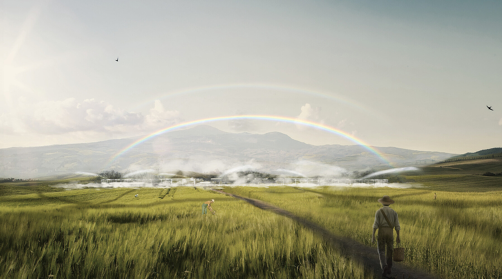 The 2nd Prize goes to Chen Yang, Ruijing Sun, and Chao Li (USA) for a poetic landscape intervention featuring a mist-generating circular water installation that symbolizes both the devastating force of an explosion and the hope embodied by a rainbow.