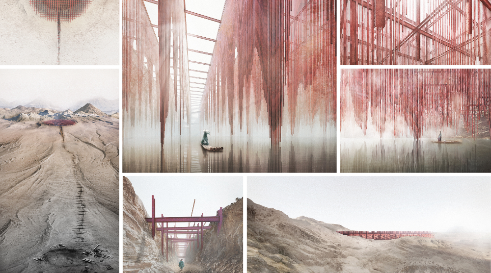 The First Prize was awarded to Hamzeh Ahmad Hasan Al-Thweib (Jordan) for a project that reinterprets the form of the mushroom cloud as a series of soft, luminous volumes hovering above the landscape, transforming a symbol of destruction into an atmospheric space of reflection and regrowth. The Second Prize went to Andreea-Mihaela Nicolae, Tabark H. Felaih, Mara Ioana Constantin, and Alexandra-Stefana Fartais for a sunken memorial that contrasts a field of mirrored surface markers with a subterranean chamber shaped by shafts of daylight. The Third Prize was awarded to Frederic Gapinski (New Zealand) for a mirrored disc and oculus intervention that leads visitors into a subterranean space centered on a solitary tree, symbolizing resilience and renewal.
