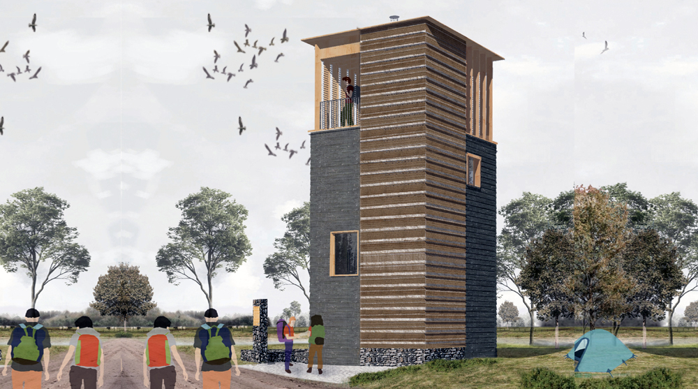 The winning project by Arthur Schoeler and Corentin Dalon from Belgium was entitled “LEARNING FROM ASCETISM - Against austerity: for a fundamentalist materialism”. Their simple tower structure incorporated natural elements in the wood, straw, earth and stone materials used for construction. Their environmentally-inspired design also earned them the BB Green Award.
