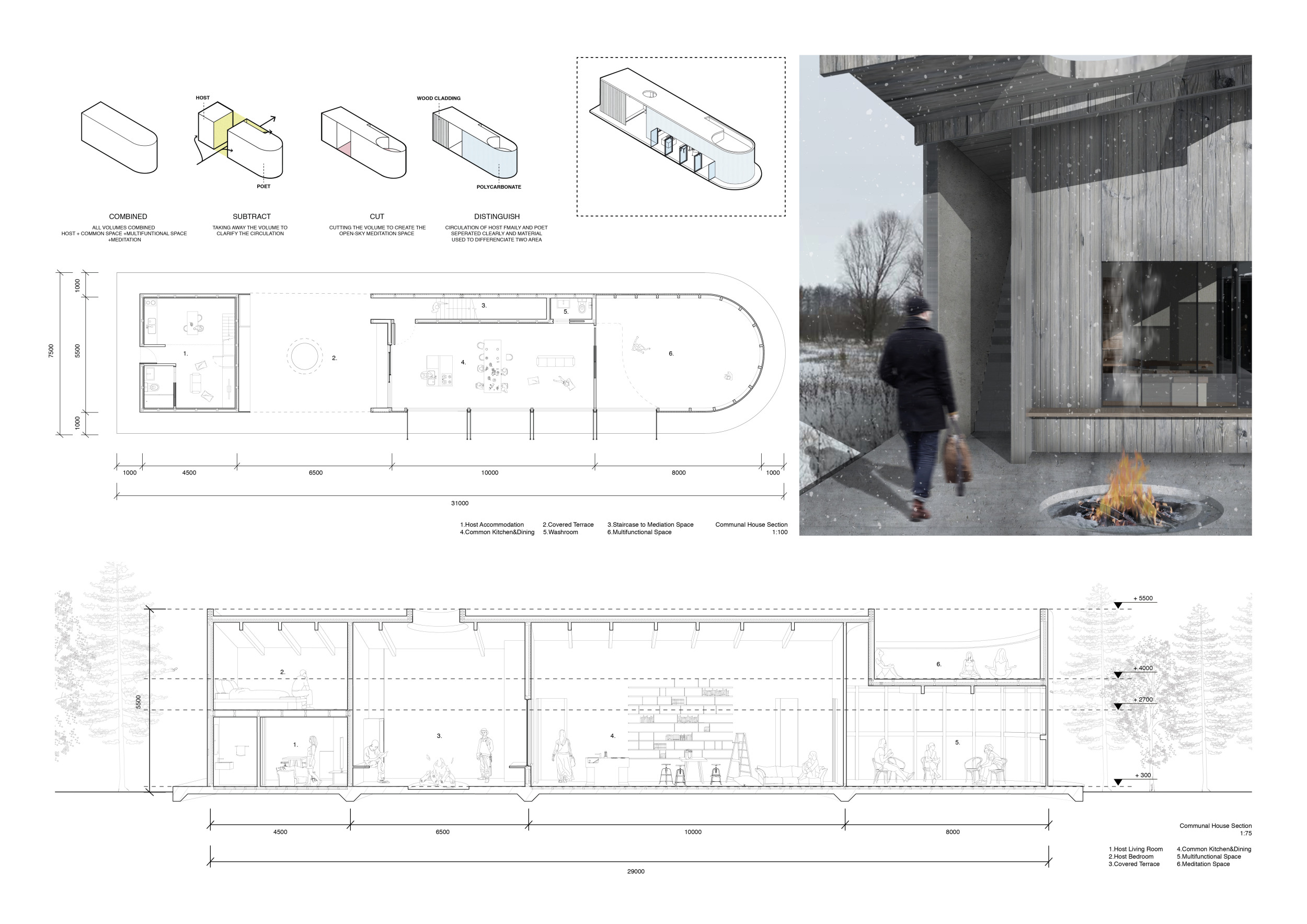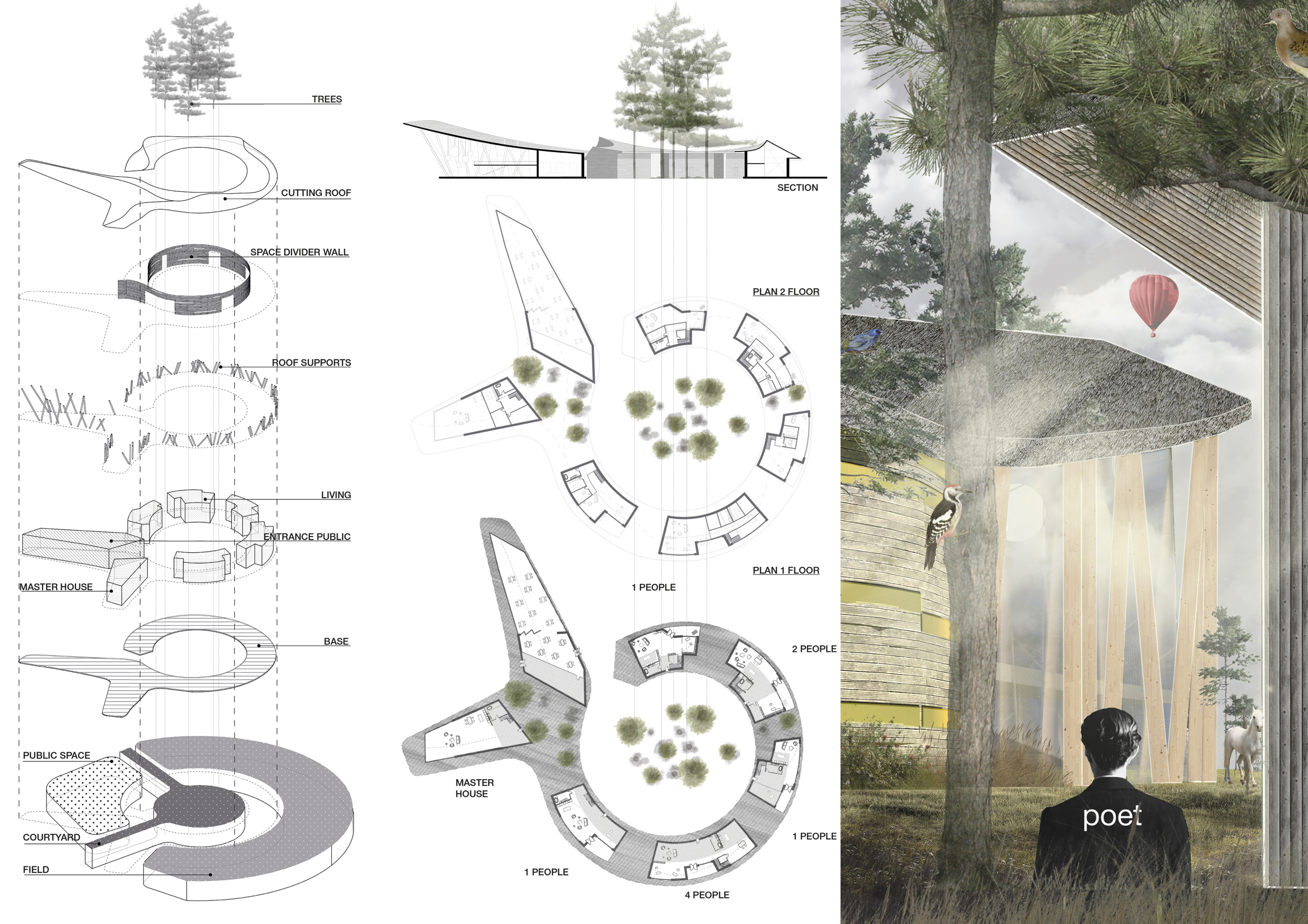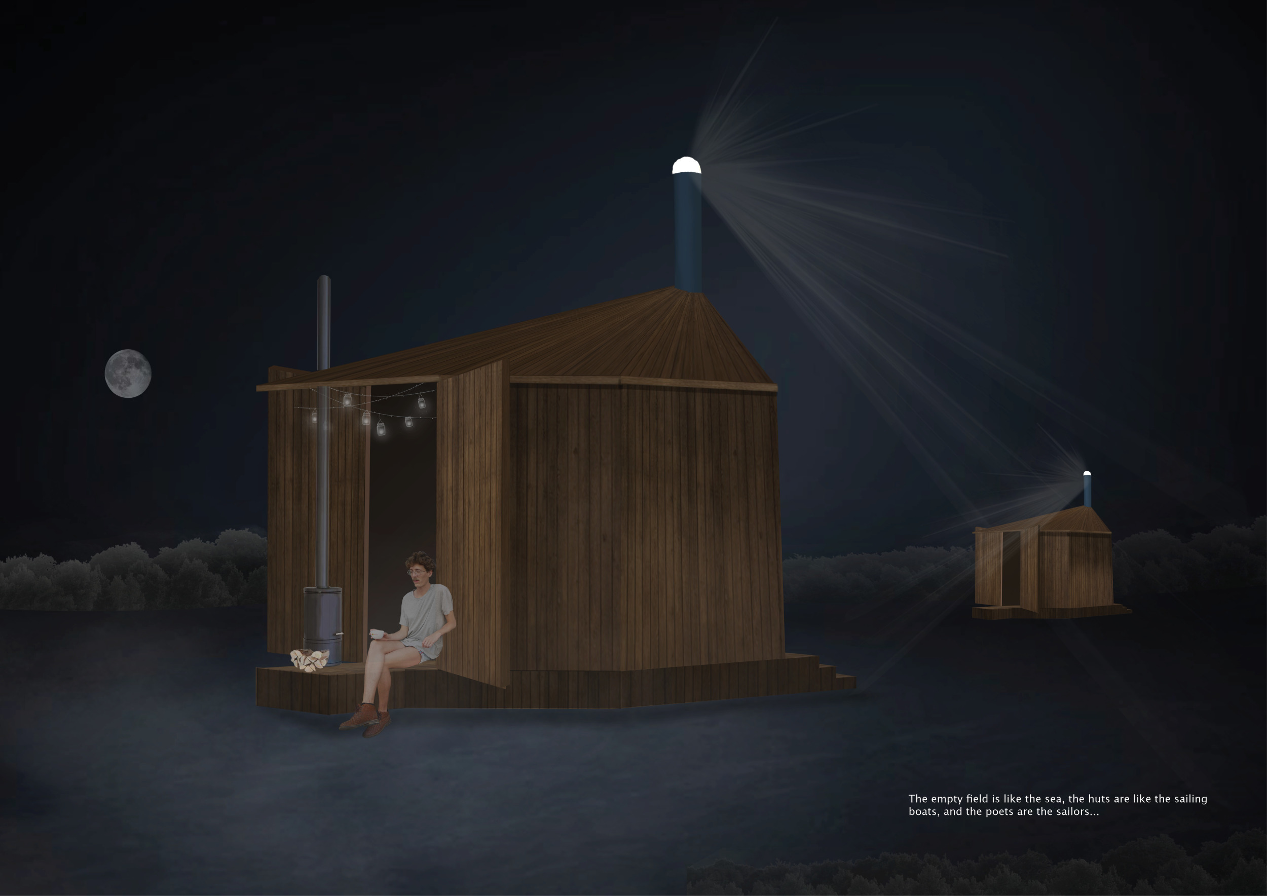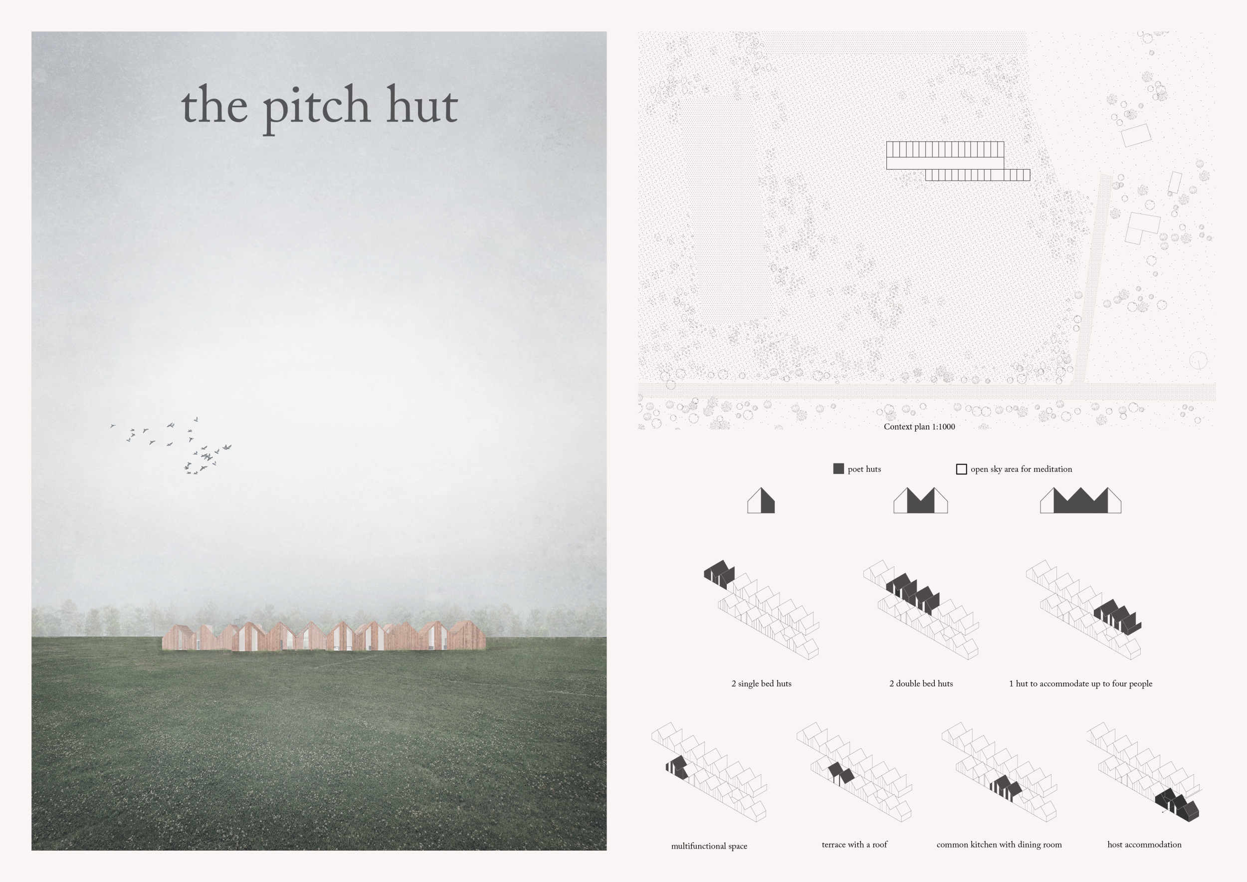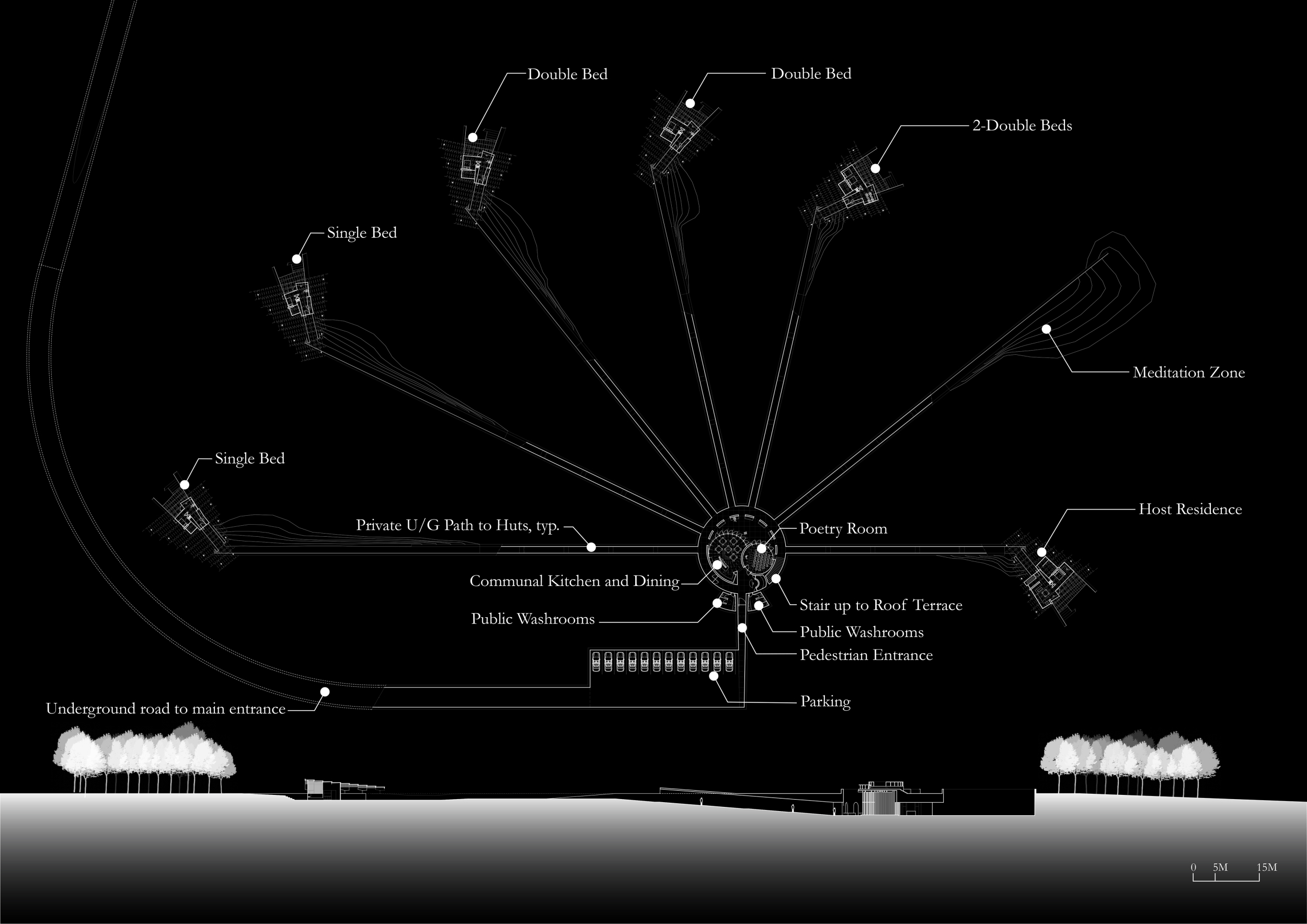 The competition sought designs for a small writers retreat where selected poets with free board can visit for short periods to produce their work. In addition to a set of five poet accommodations of various sizes, the designs were requested to include: plans for a multifunctional space able to accommodate small exhibitions, performances, readings and meditation sessions; a common kitchen and dining area; and host accommodations. ‘Huts’ were to house basic amenities including a bed, desk, kitchenette, washing station, and storage. Visitors are also expected to have access to outdoor meditative spaces and covered terraces.