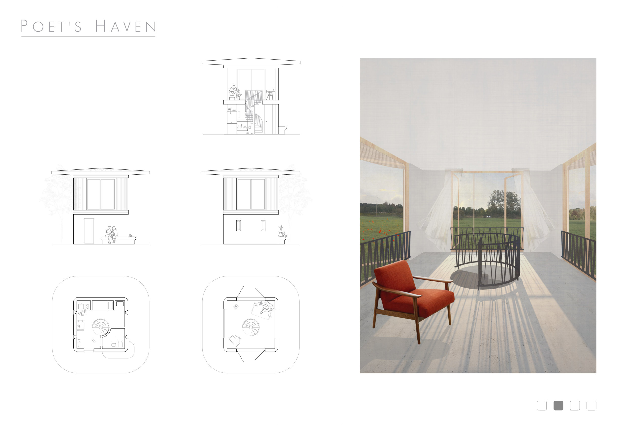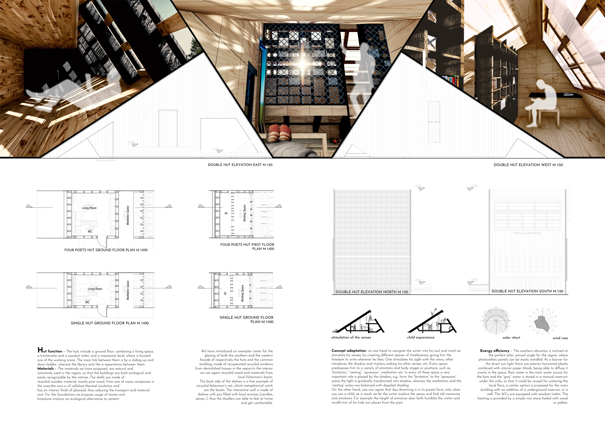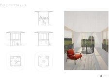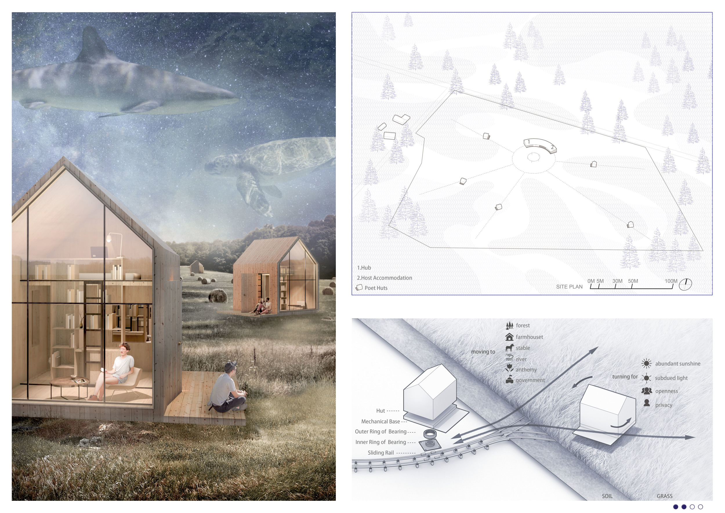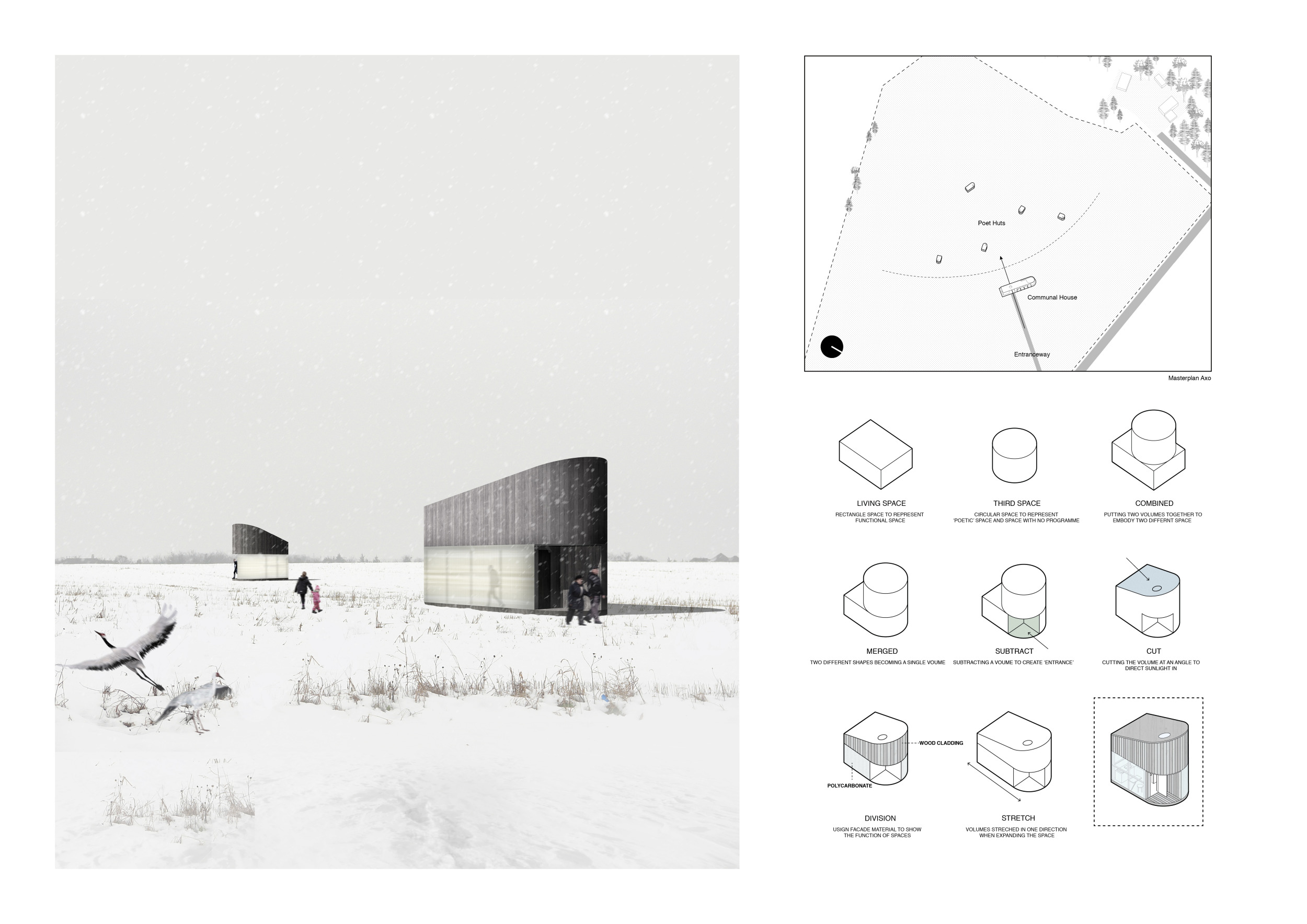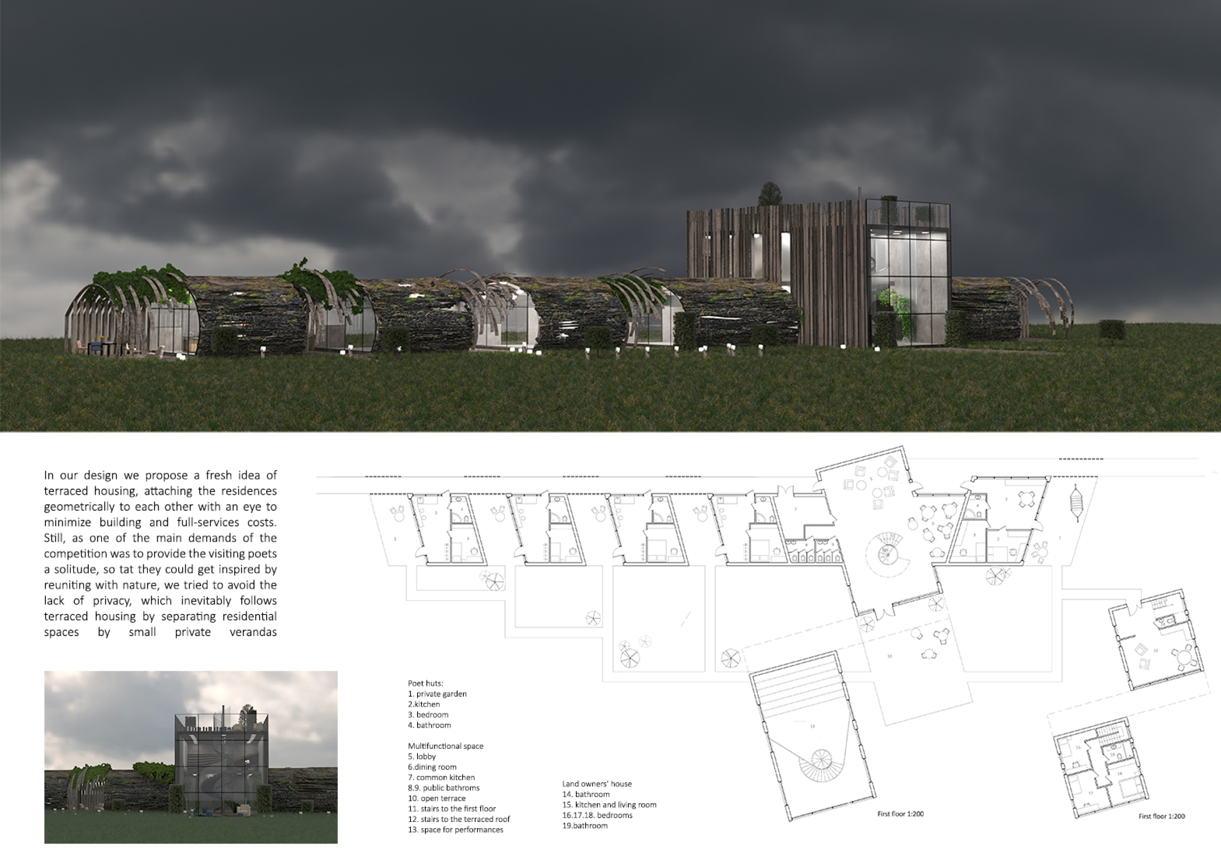The competition sought designs for a small writers retreat where selected poets with free board can visit for short periods to produce their work. In addition to a set of five poet accommodations of various sizes, the designs were requested to include: plans for a multifunctional space able to accommodate small exhibitions, performances, readings and meditation sessions; a common kitchen and dining area; and host accommodations. ‘Huts’ were to house basic amenities including a bed, desk, kitchenette, washing station, and storage. Visitors are also expected to have access to outdoor meditative spaces and covered terraces.