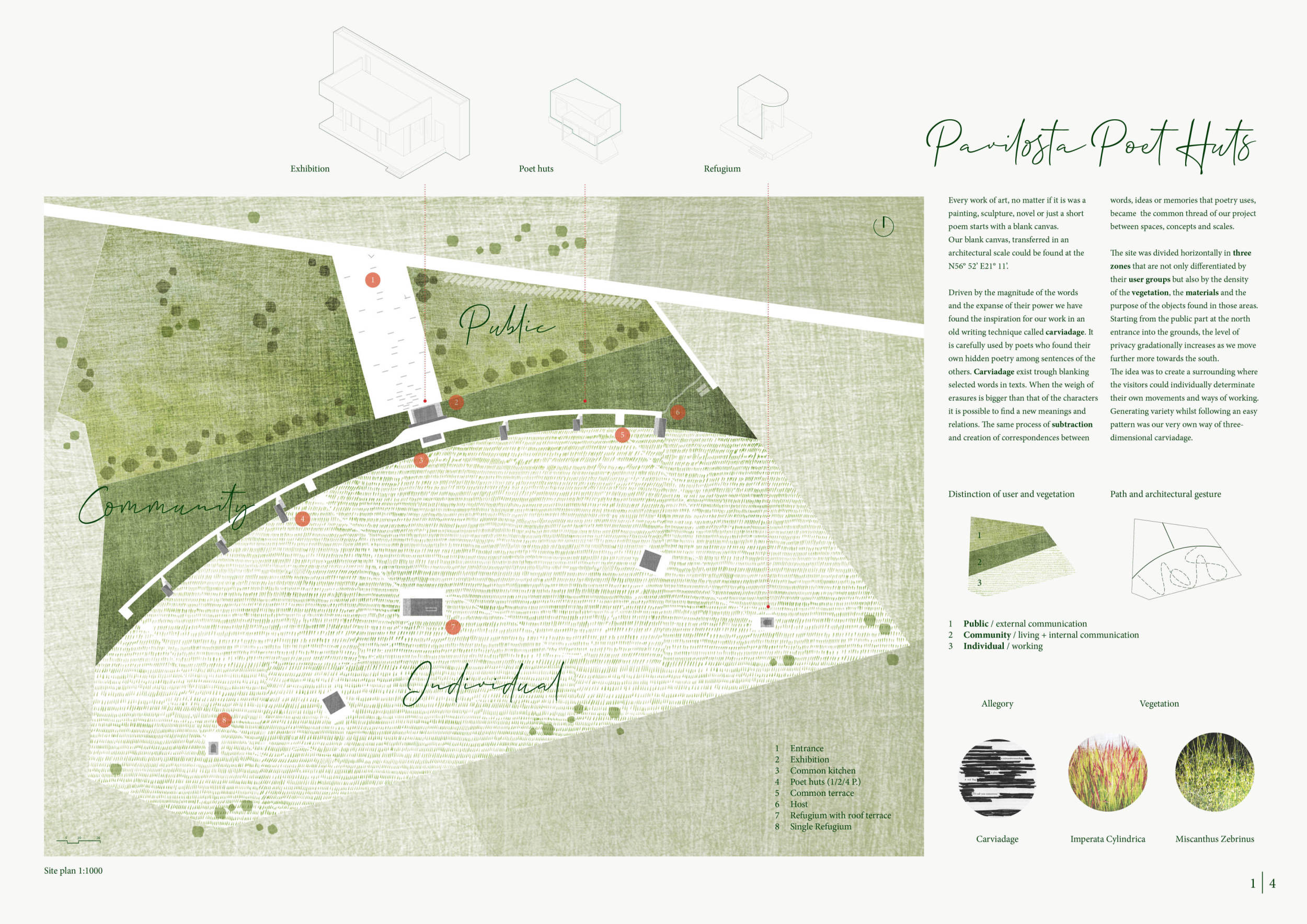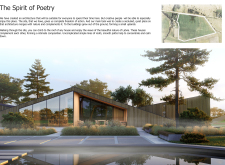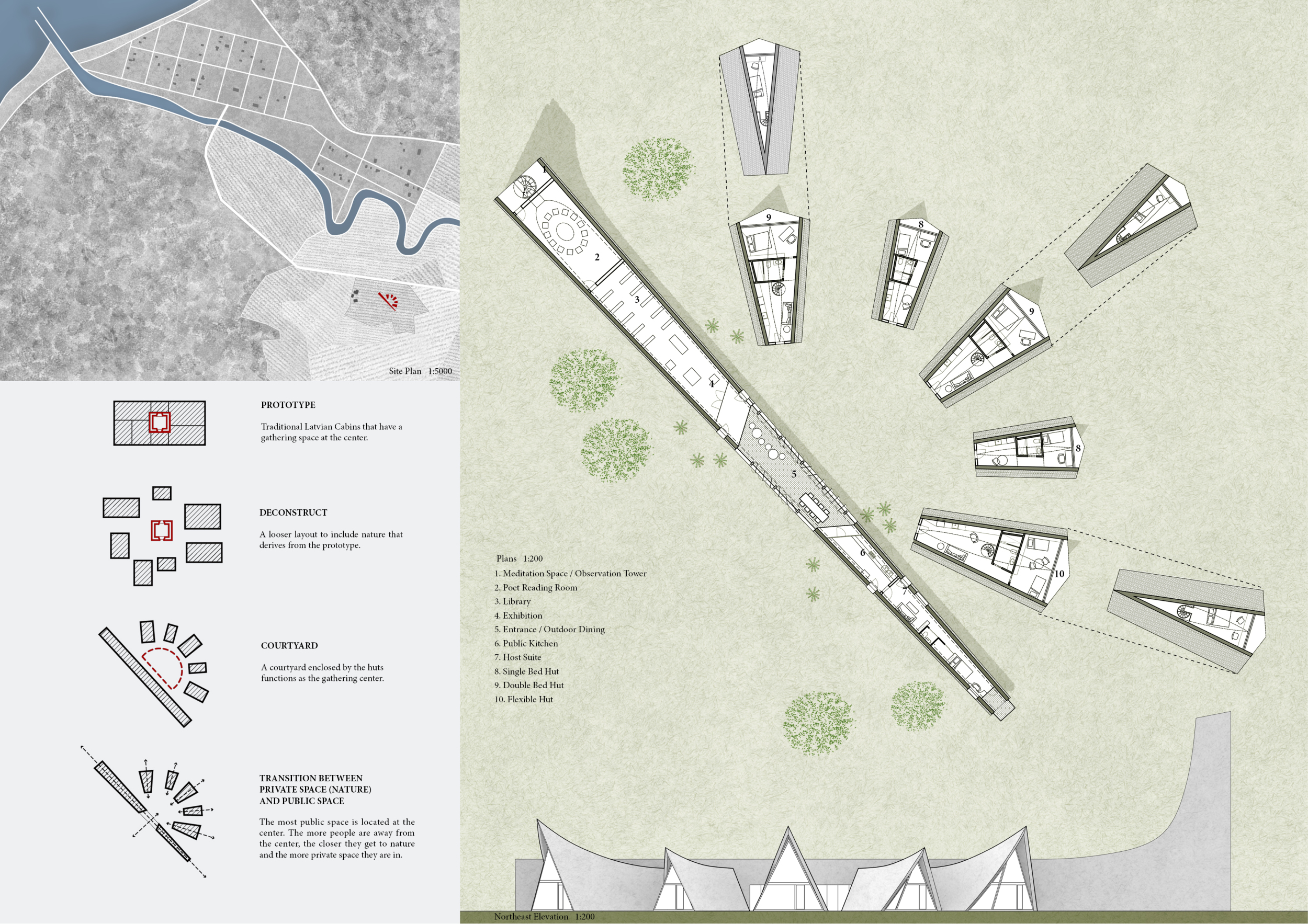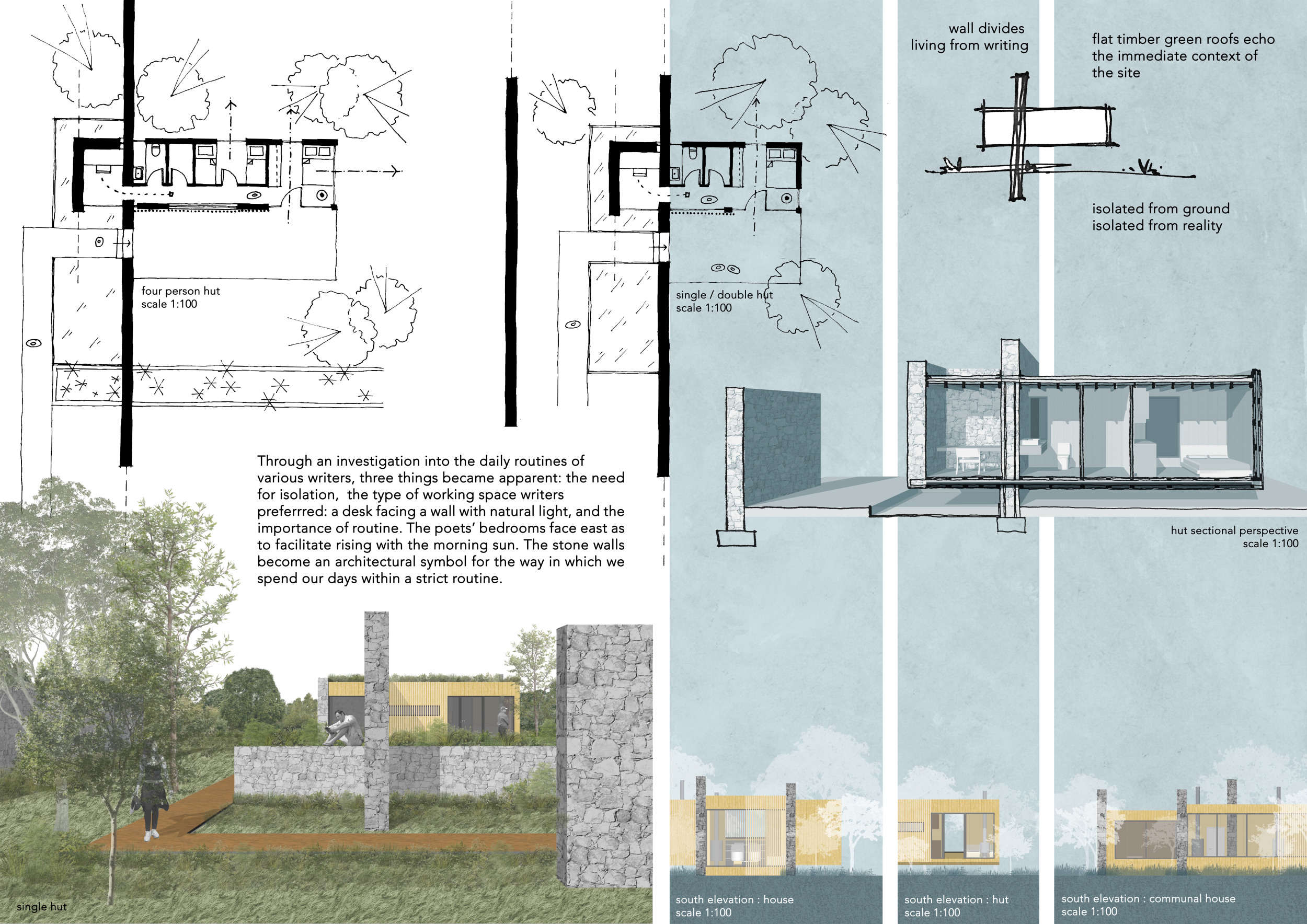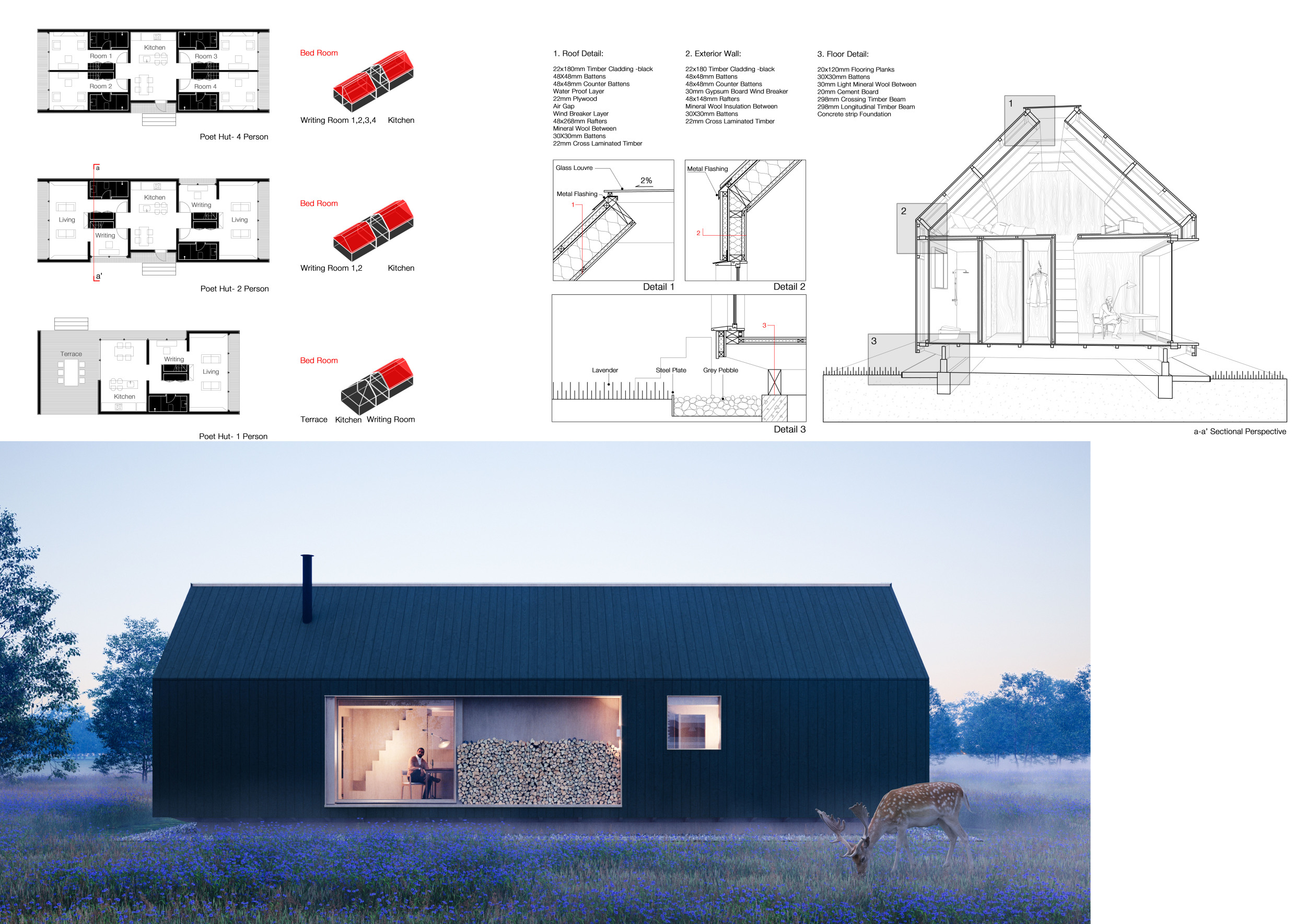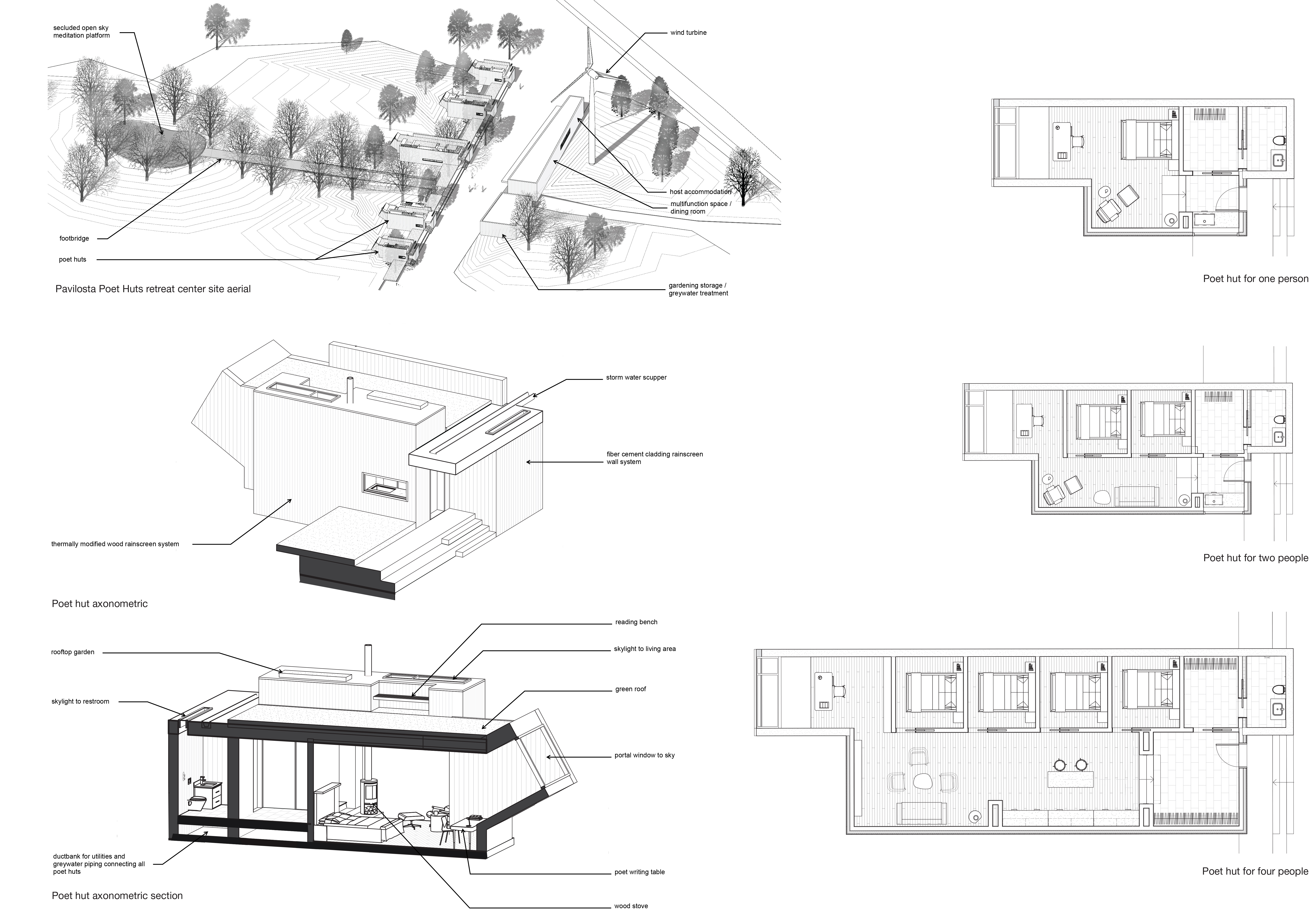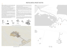 The competition sought designs for a small writers retreat where selected poets with free board can visit for short periods to produce their work. In addition to a set of five poet accommodations of various sizes, the designs were requested to include: plans for a multifunctional space able to accommodate small exhibitions, performances, readings and meditation sessions; a common kitchen and dining area; and host accommodations. ‘Huts’ were to house basic amenities including a bed, desk, kitchenette, washing station, and storage. Visitors are also expected to have access to outdoor meditative spaces and covered terraces.