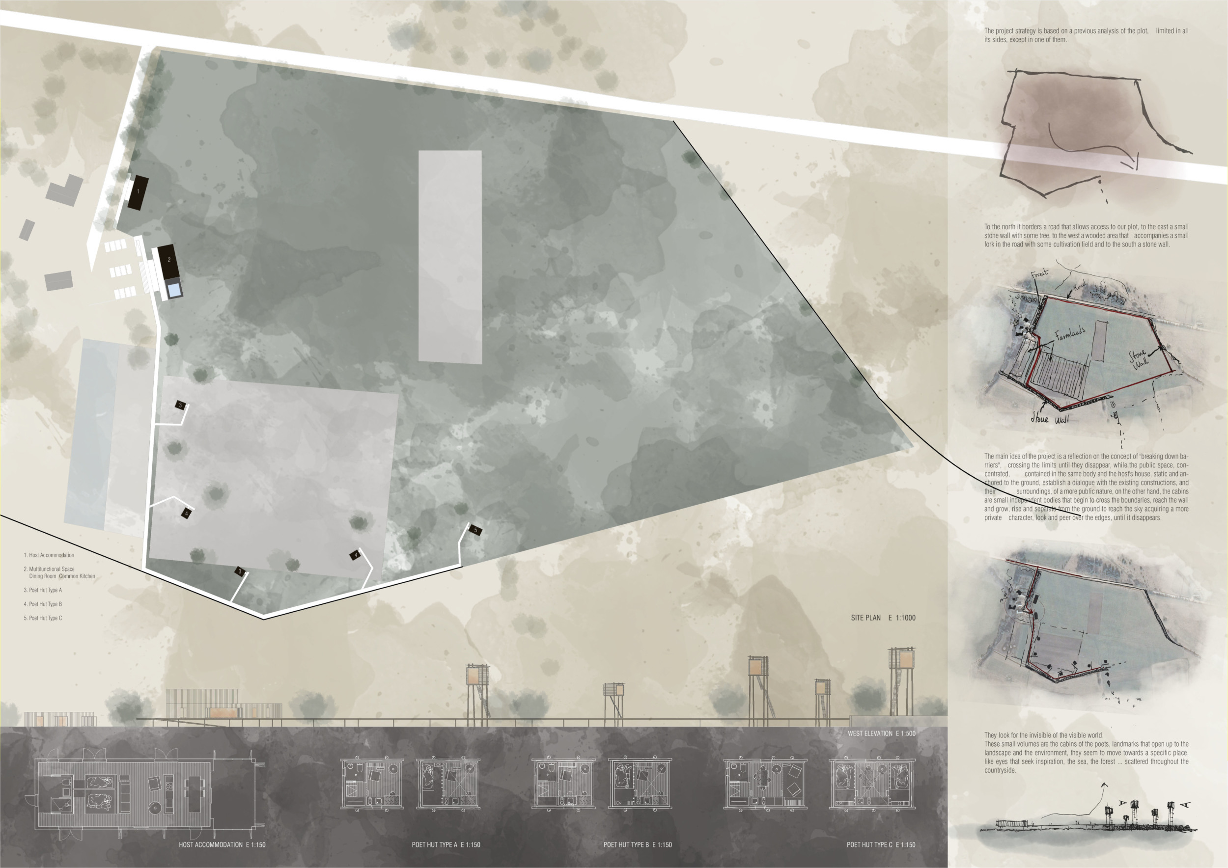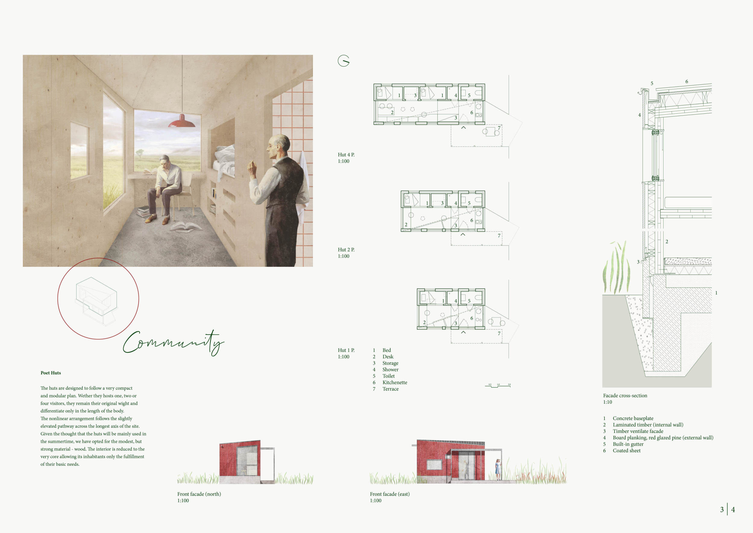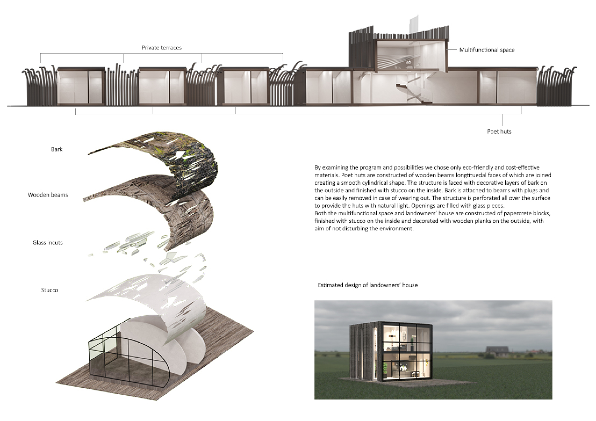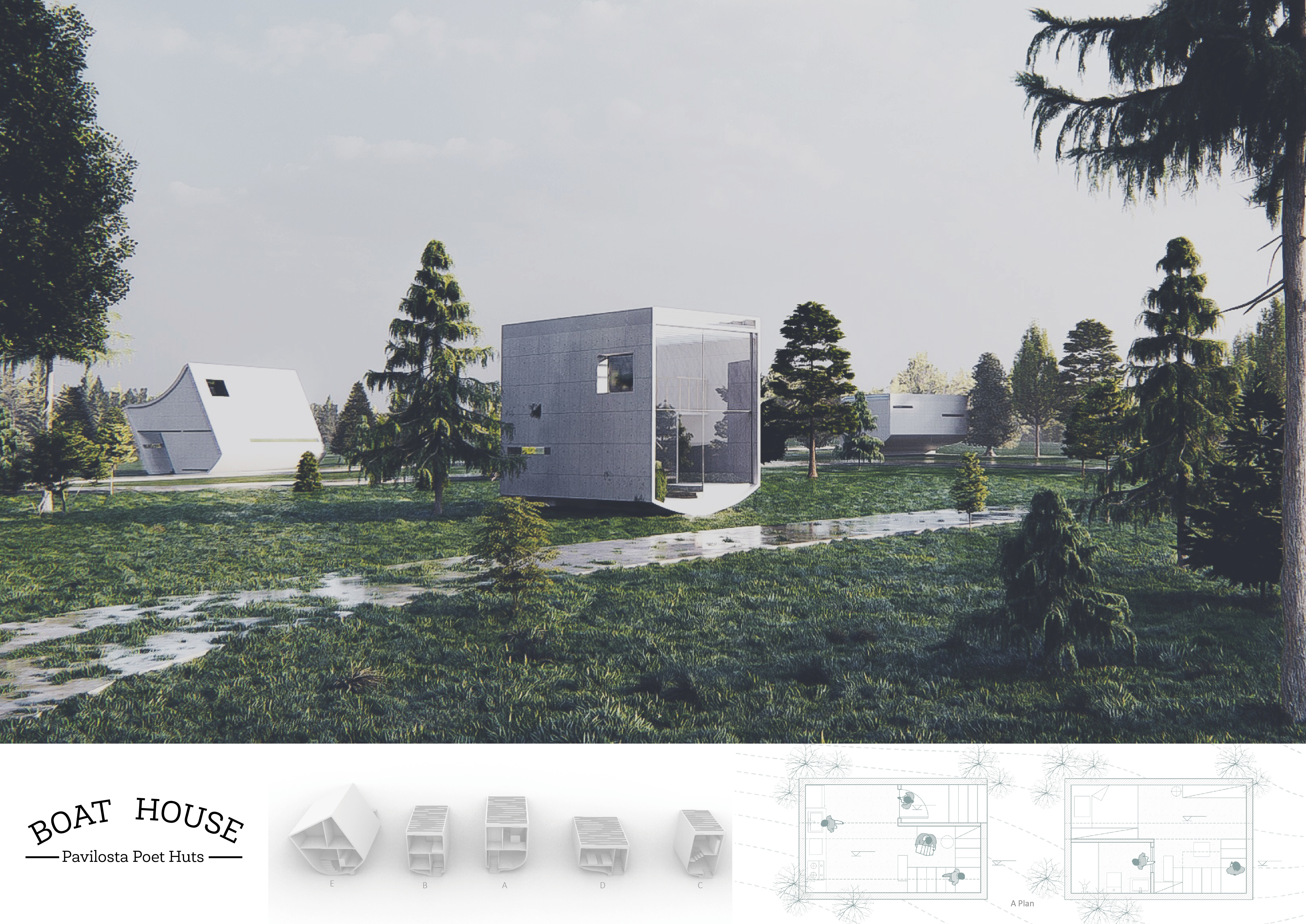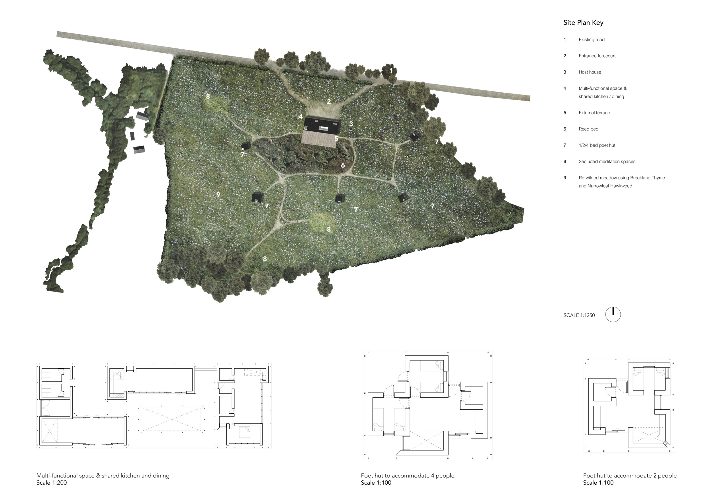 The competition sought designs for a small writers retreat where selected poets with free board can visit for short periods to produce their work. In addition to a set of five poet accommodations of various sizes, the designs were requested to include: plans for a multifunctional space able to accommodate small exhibitions, performances, readings and meditation sessions; a common kitchen and dining area; and host accommodations. ‘Huts’ were to house basic amenities including a bed, desk, kitchenette, washing station, and storage. Visitors are also expected to have access to outdoor meditative spaces and covered terraces.