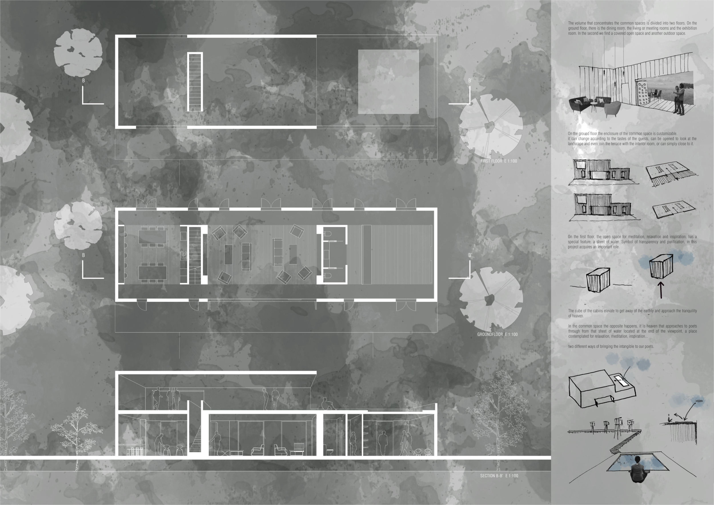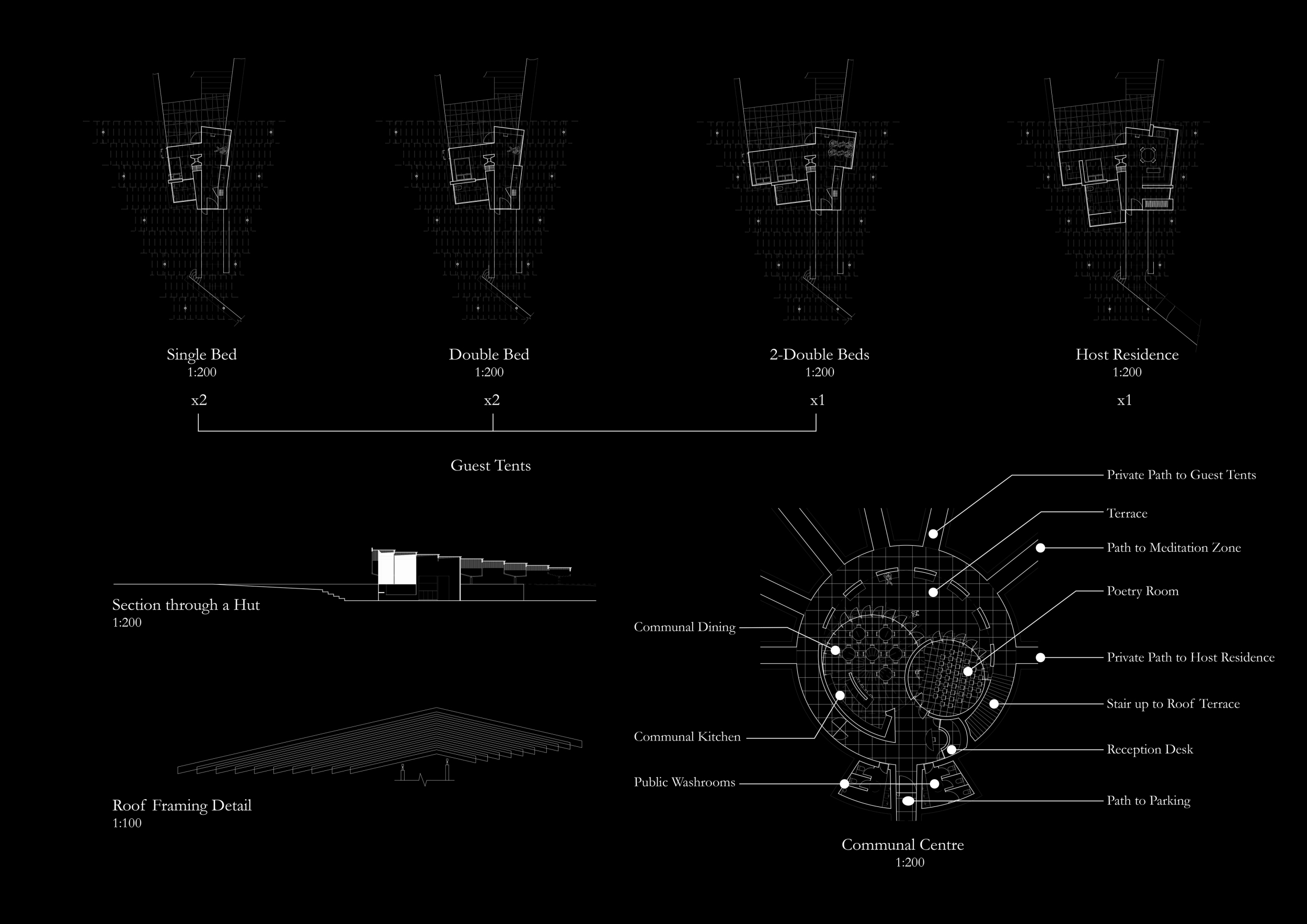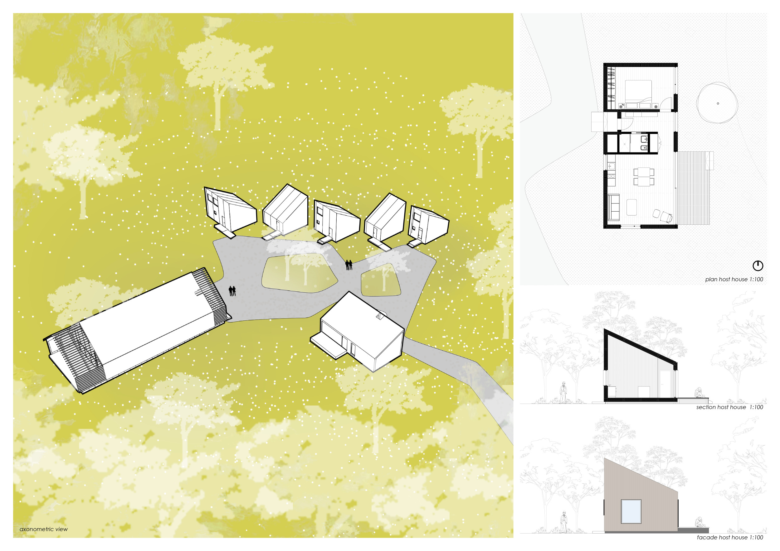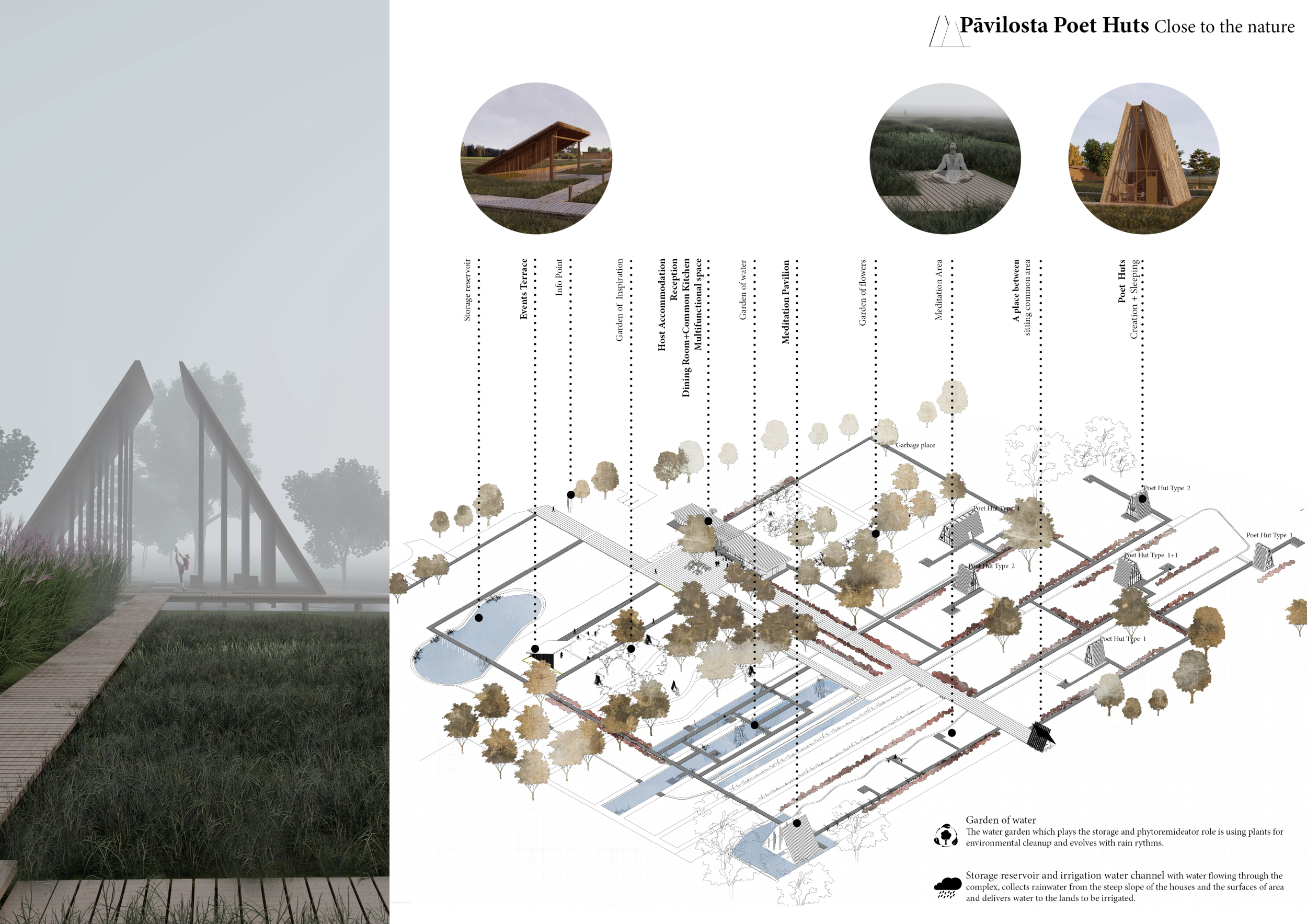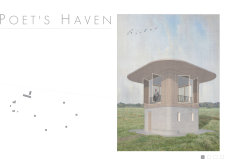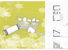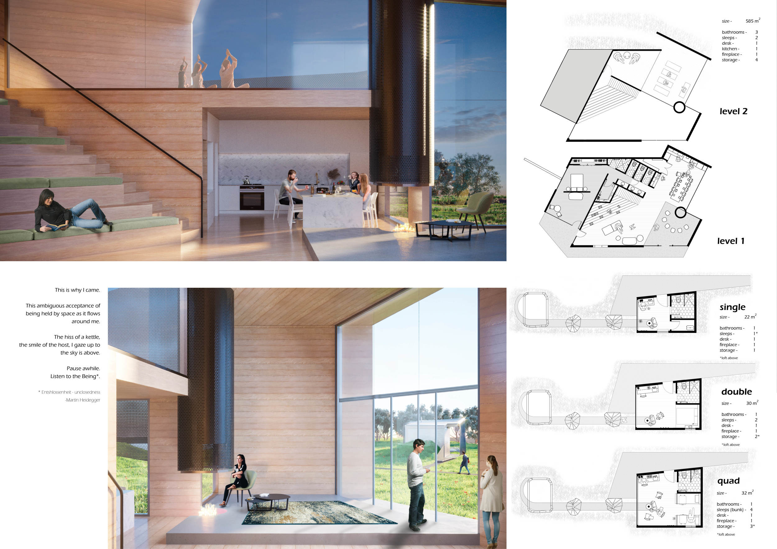 The competition sought designs for a small writers retreat where selected poets with free board can visit for short periods to produce their work. In addition to a set of five poet accommodations of various sizes, the designs were requested to include: plans for a multifunctional space able to accommodate small exhibitions, performances, readings and meditation sessions; a common kitchen and dining area; and host accommodations. ‘Huts’ were to house basic amenities including a bed, desk, kitchenette, washing station, and storage. Visitors are also expected to have access to outdoor meditative spaces and covered terraces.
