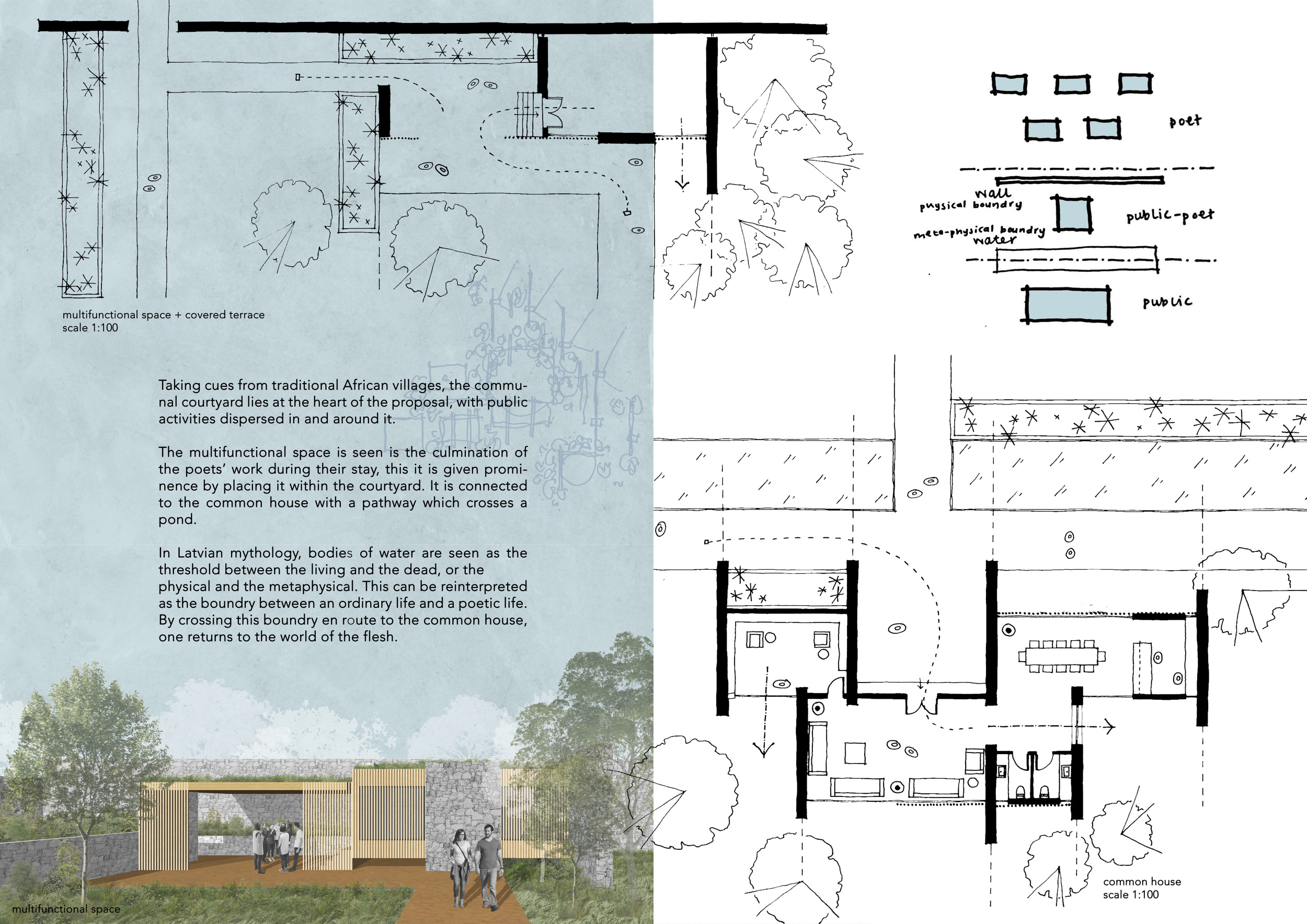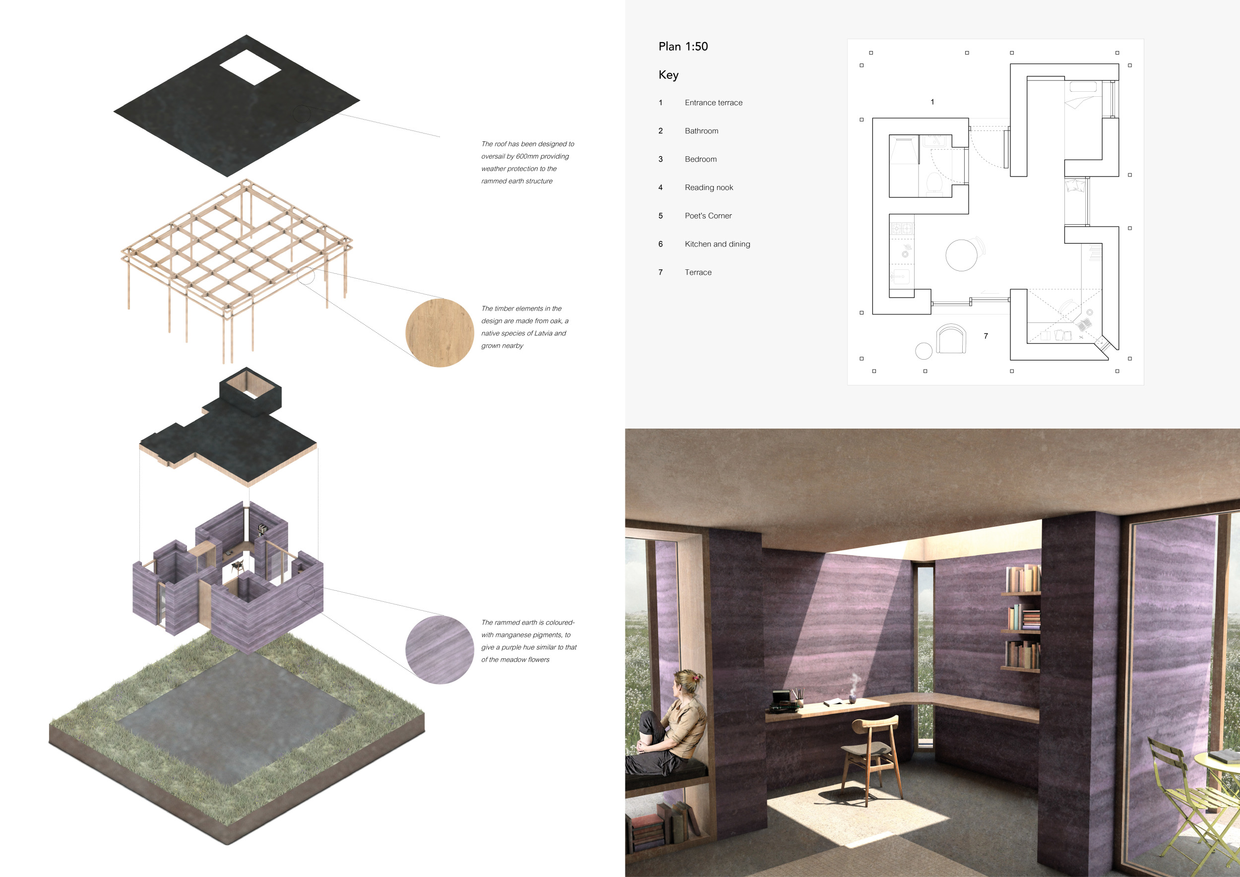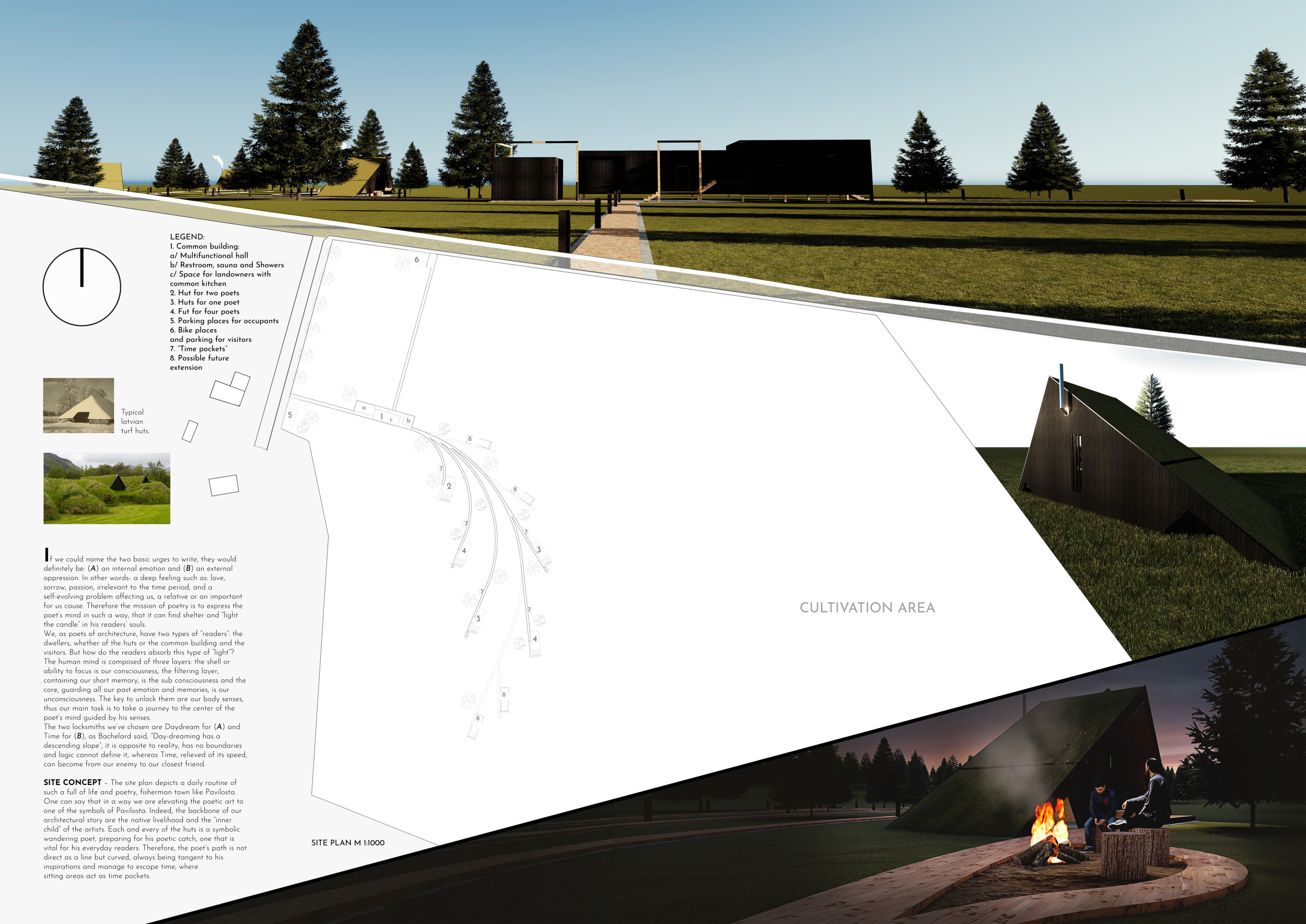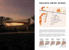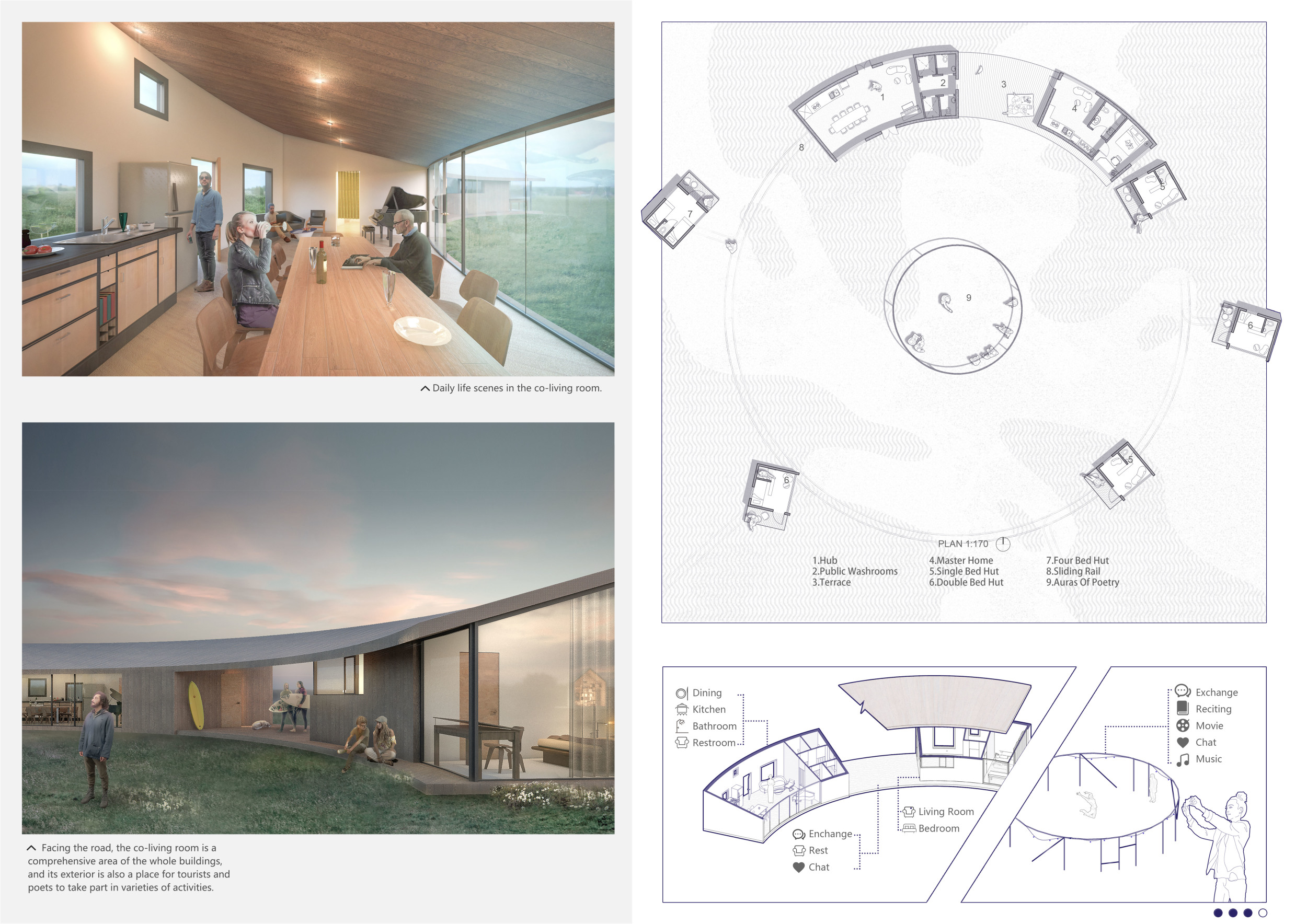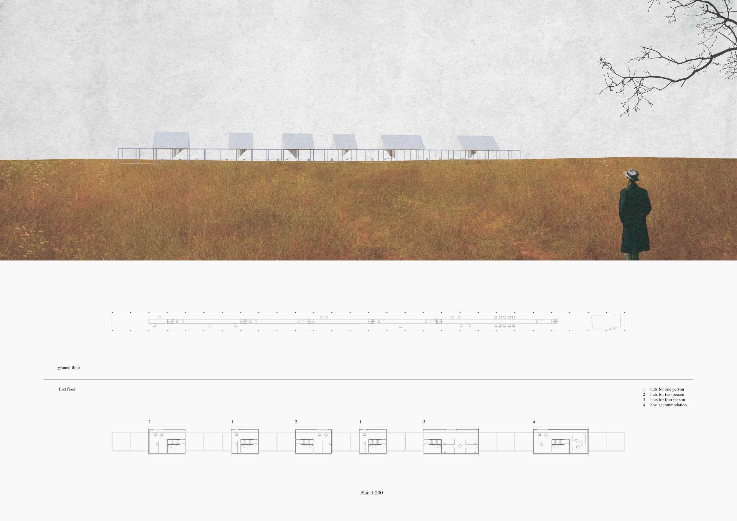The competition sought designs for a small writers retreat where selected poets with free board can visit for short periods to produce their work. In addition to a set of five poet accommodations of various sizes, the designs were requested to include: plans for a multifunctional space able to accommodate small exhibitions, performances, readings and meditation sessions; a common kitchen and dining area; and host accommodations. ‘Huts’ were to house basic amenities including a bed, desk, kitchenette, washing station, and storage. Visitors are also expected to have access to outdoor meditative spaces and covered terraces.
