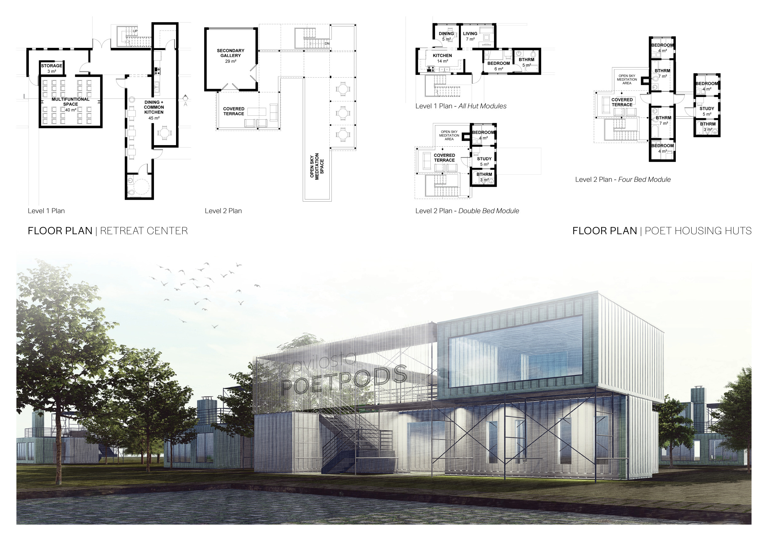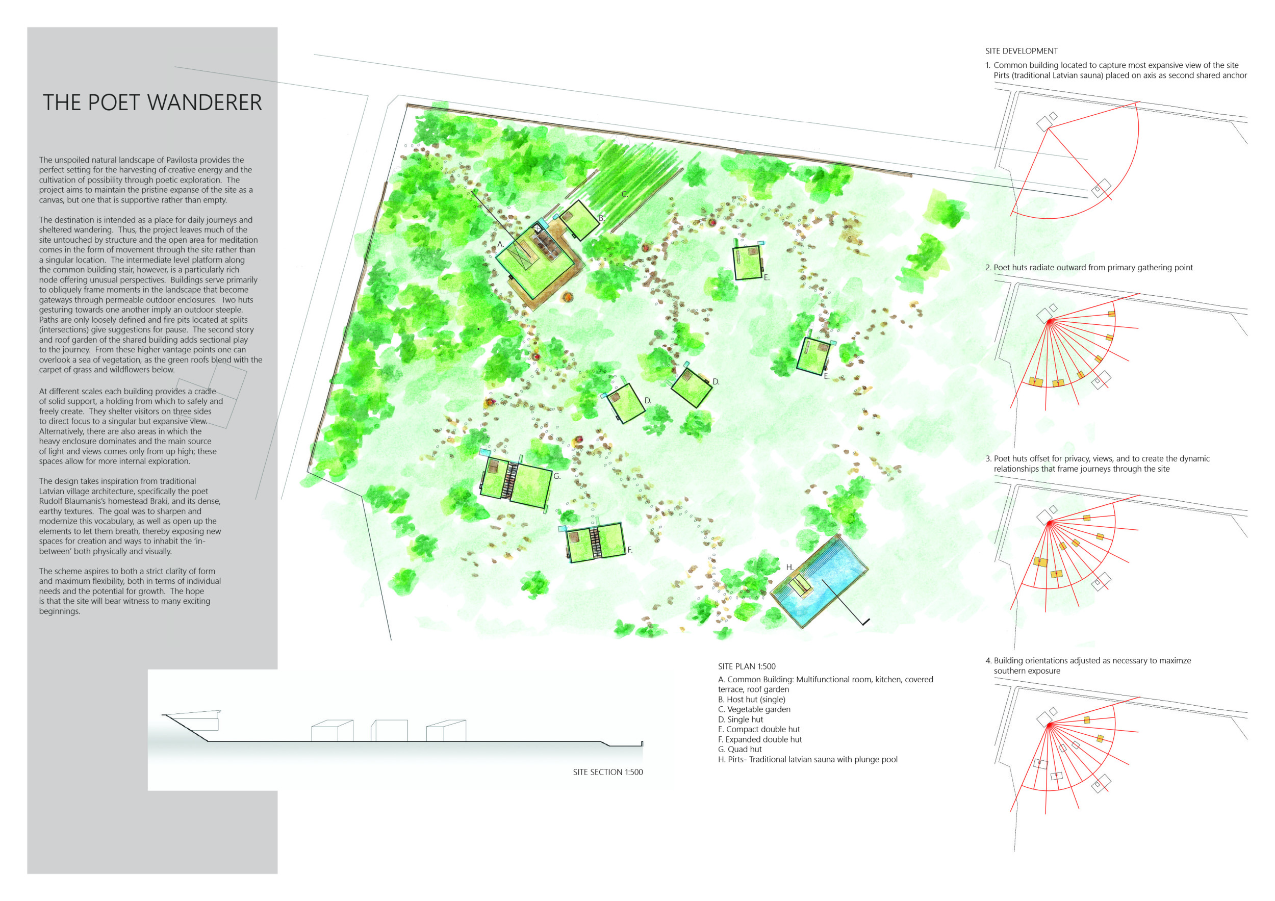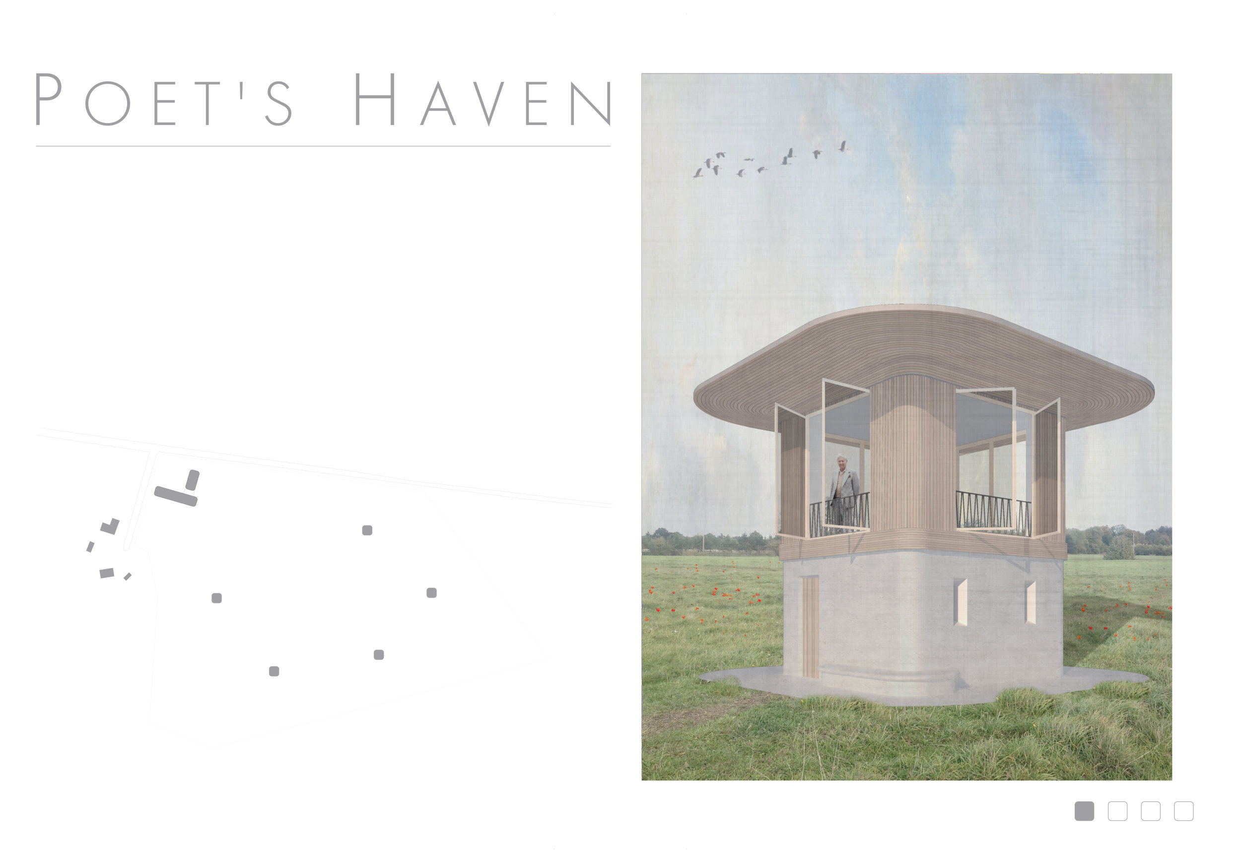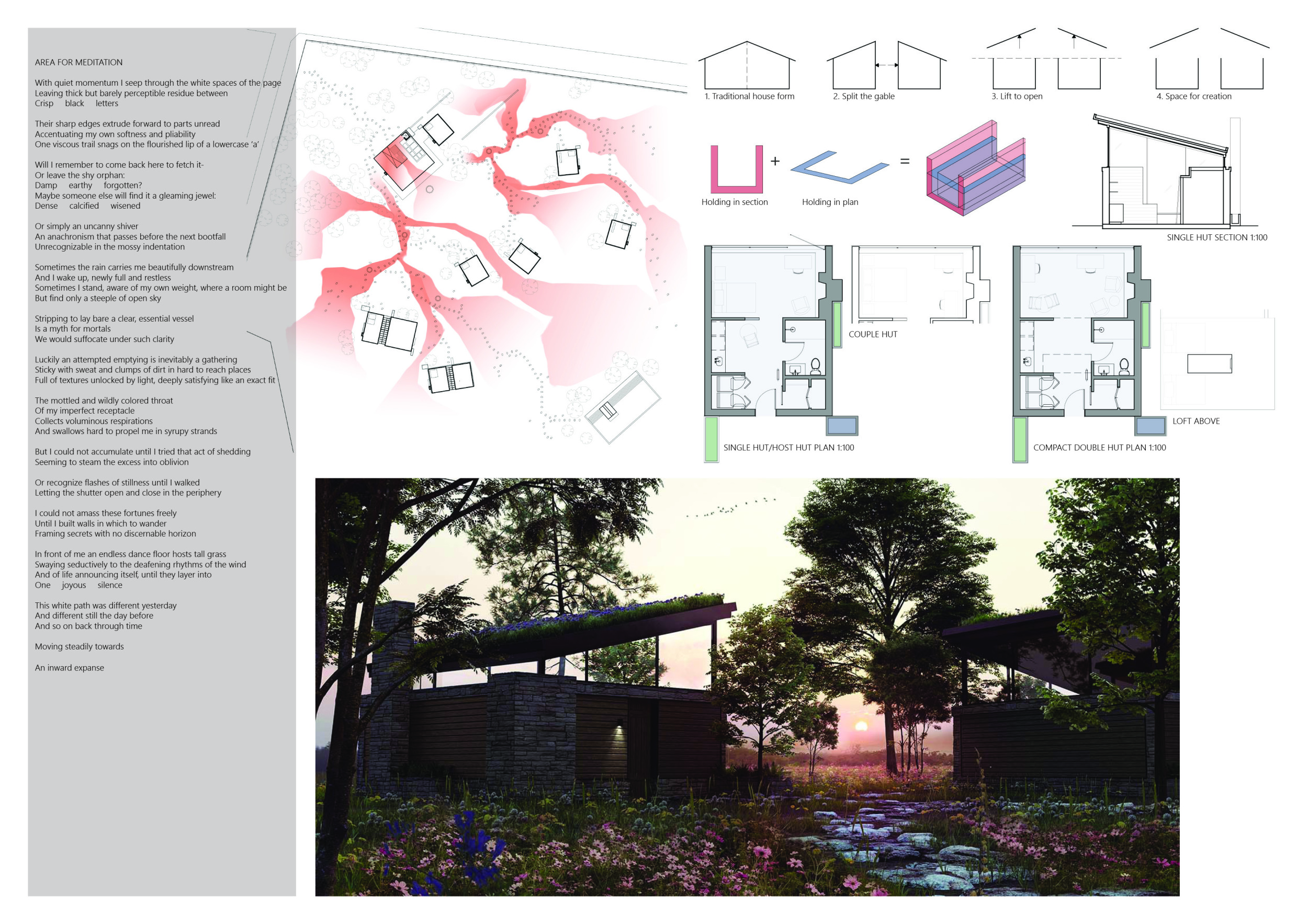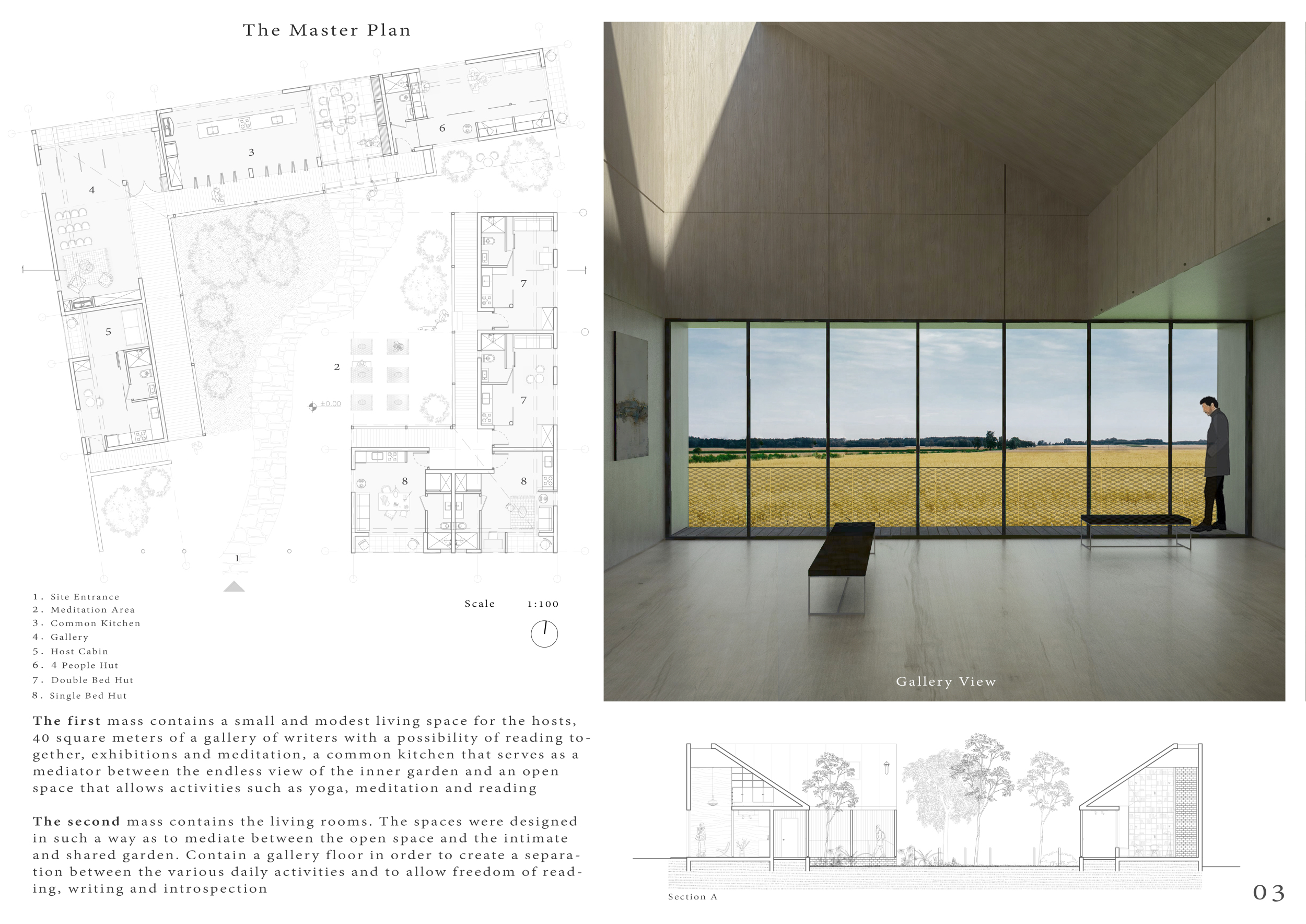 The competition sought designs for a small writers retreat where selected poets with free board can visit for short periods to produce their work. In addition to a set of five poet accommodations of various sizes, the designs were requested to include: plans for a multifunctional space able to accommodate small exhibitions, performances, readings and meditation sessions; a common kitchen and dining area; and host accommodations. ‘Huts’ were to house basic amenities including a bed, desk, kitchenette, washing station, and storage. Visitors are also expected to have access to outdoor meditative spaces and covered terraces.