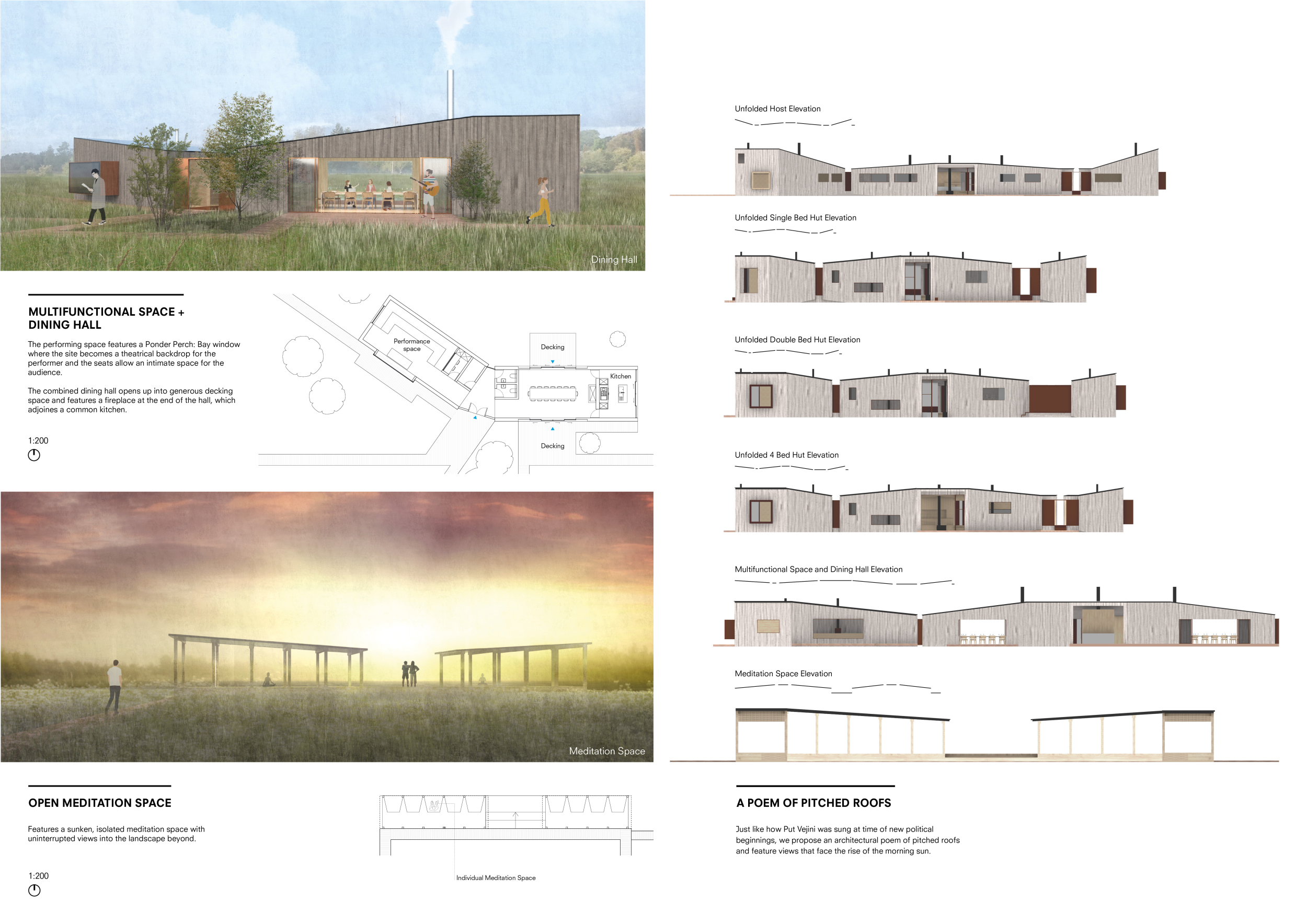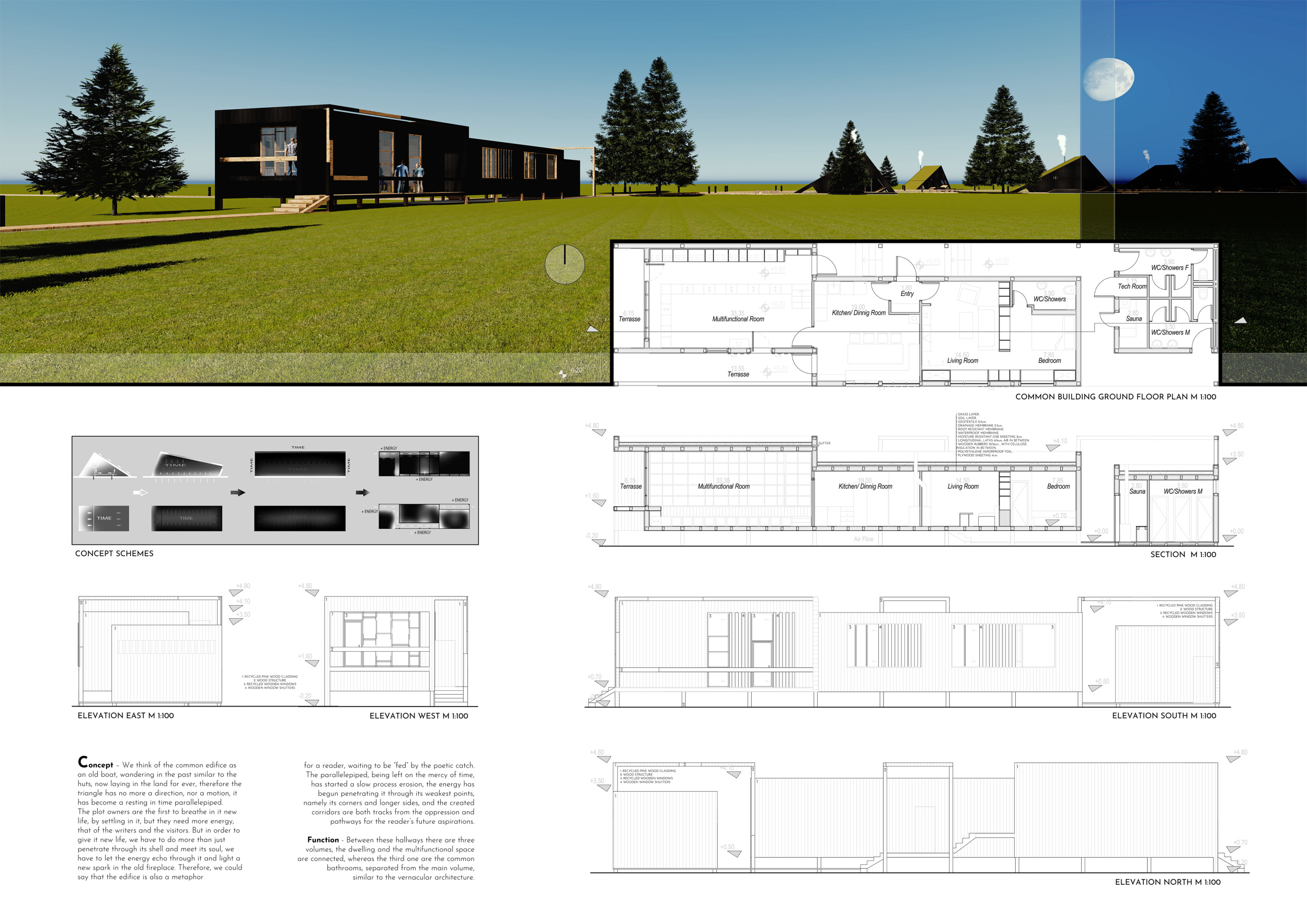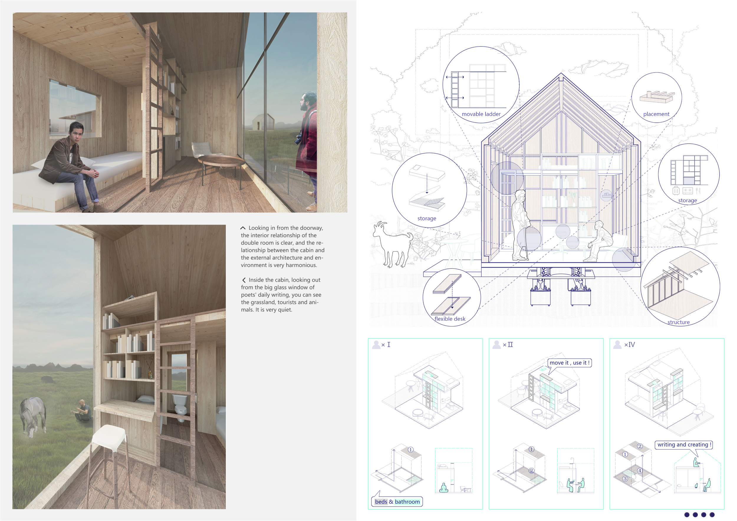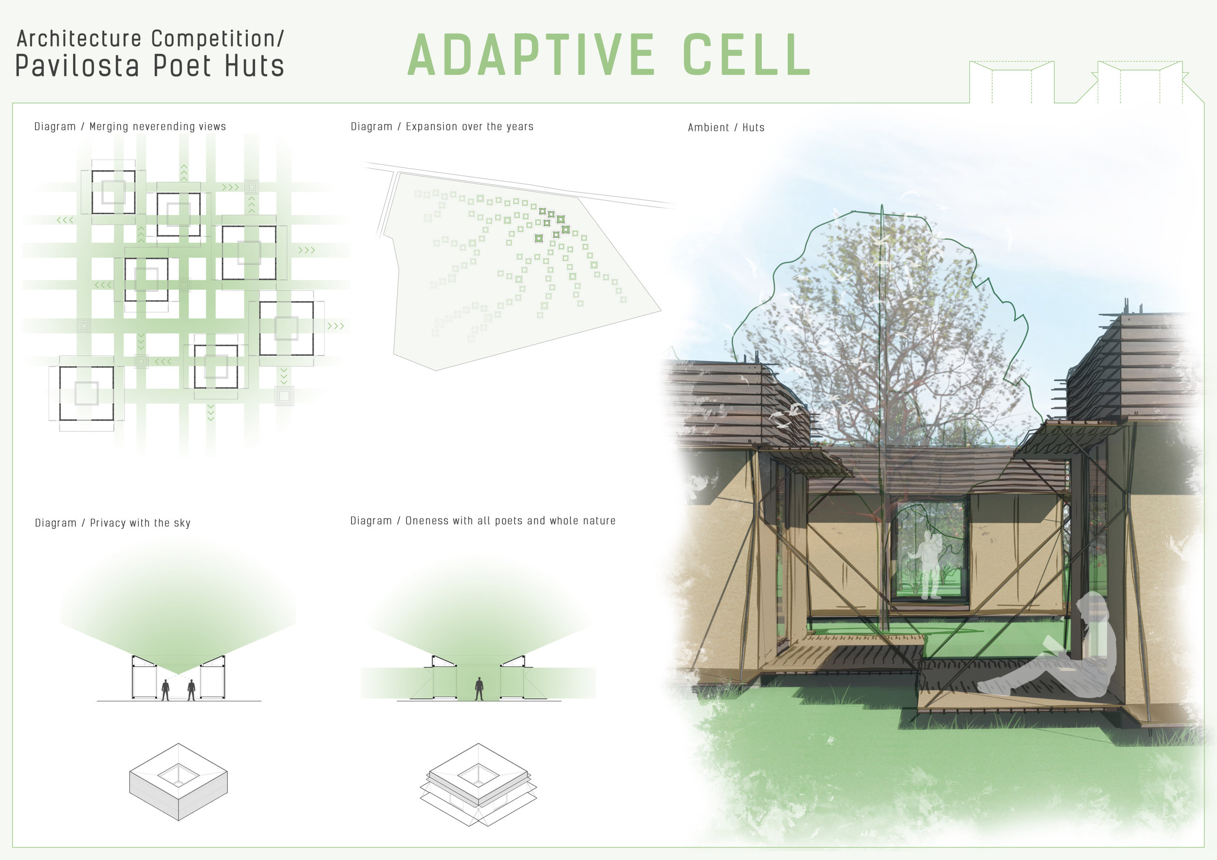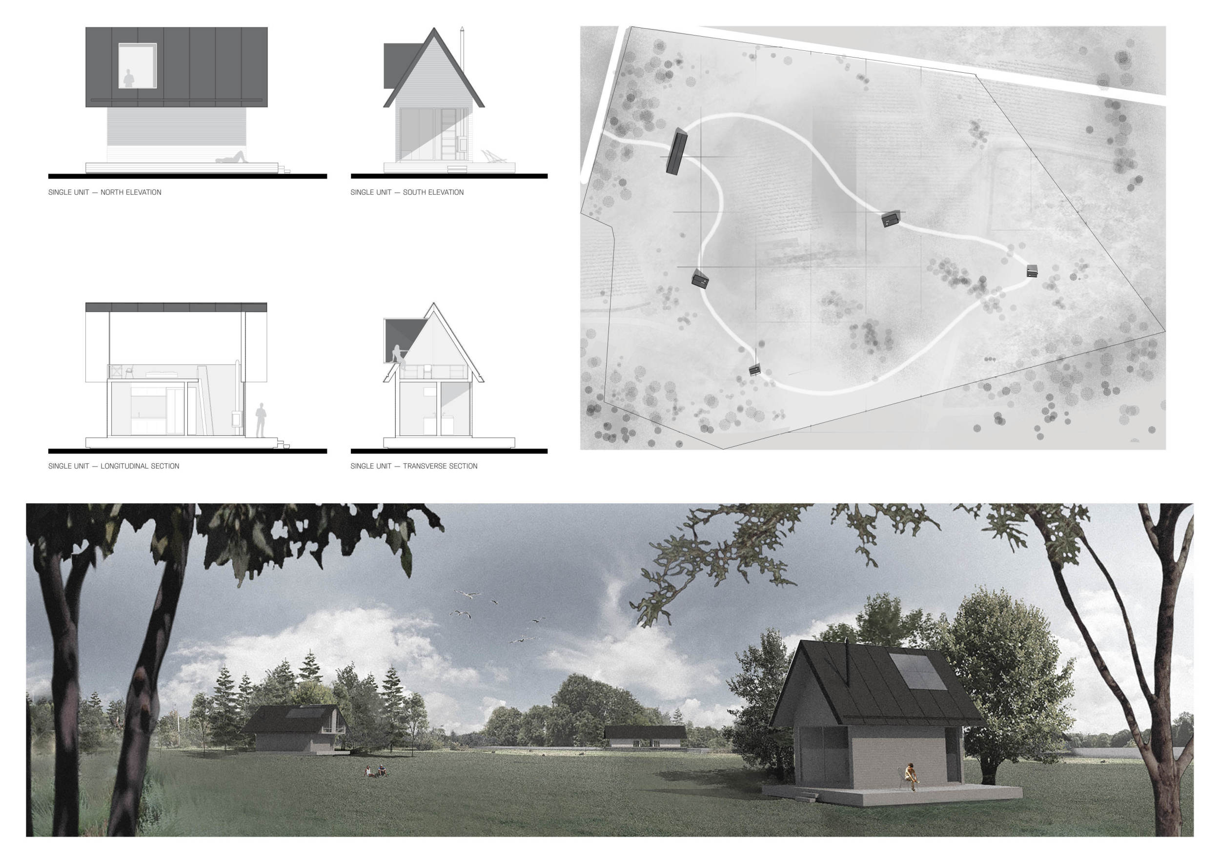 The competition sought designs for a small writers retreat where selected poets with free board can visit for short periods to produce their work. In addition to a set of five poet accommodations of various sizes, the designs were requested to include: plans for a multifunctional space able to accommodate small exhibitions, performances, readings and meditation sessions; a common kitchen and dining area; and host accommodations. ‘Huts’ were to house basic amenities including a bed, desk, kitchenette, washing station, and storage. Visitors are also expected to have access to outdoor meditative spaces and covered terraces.