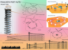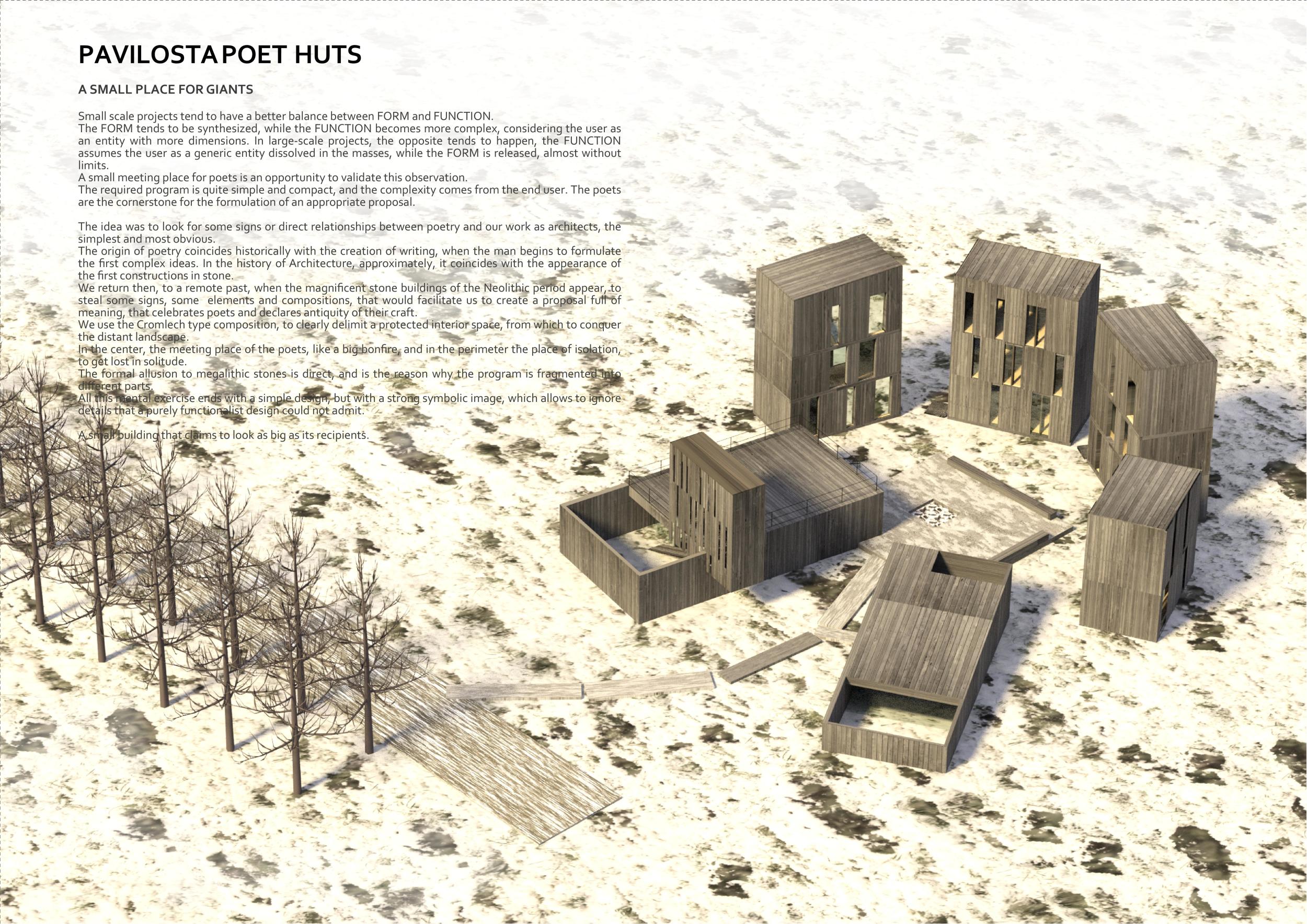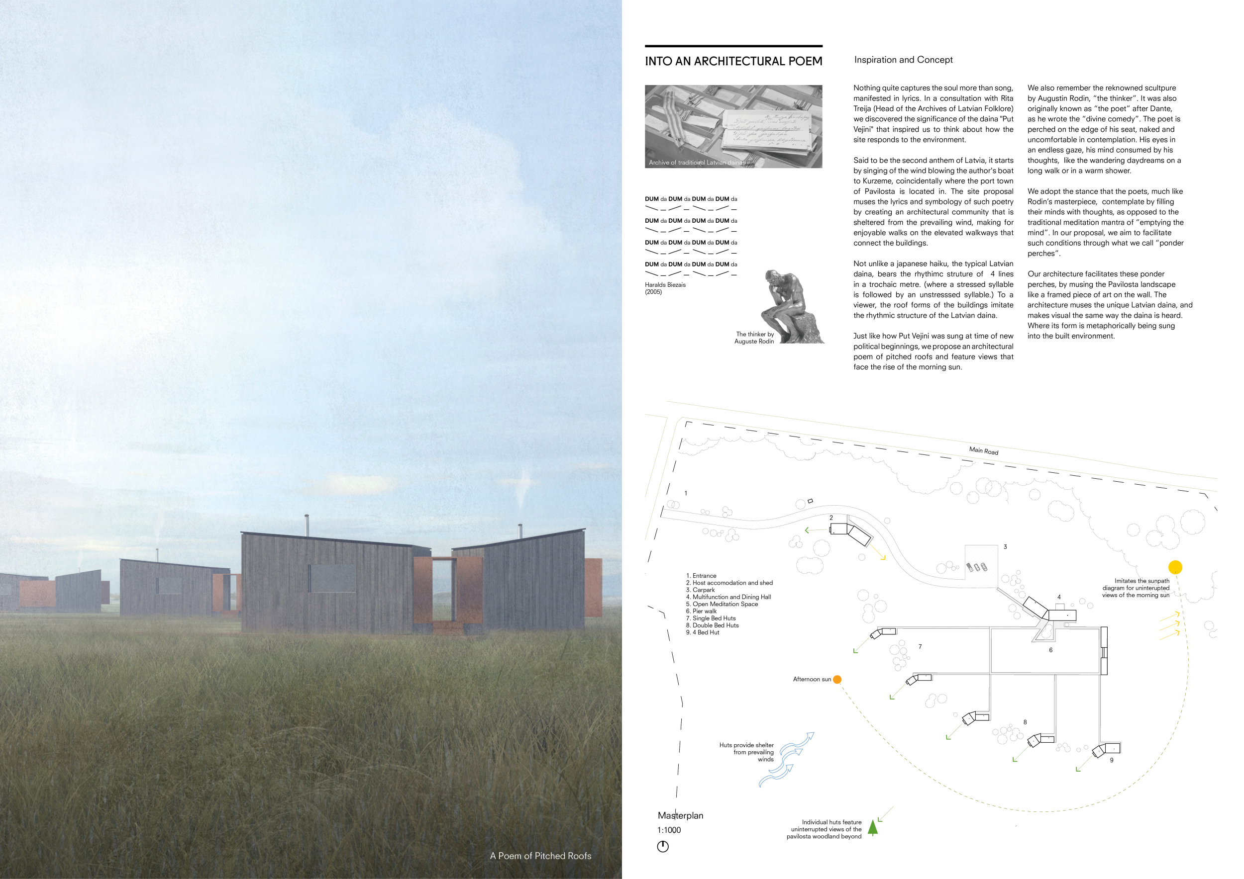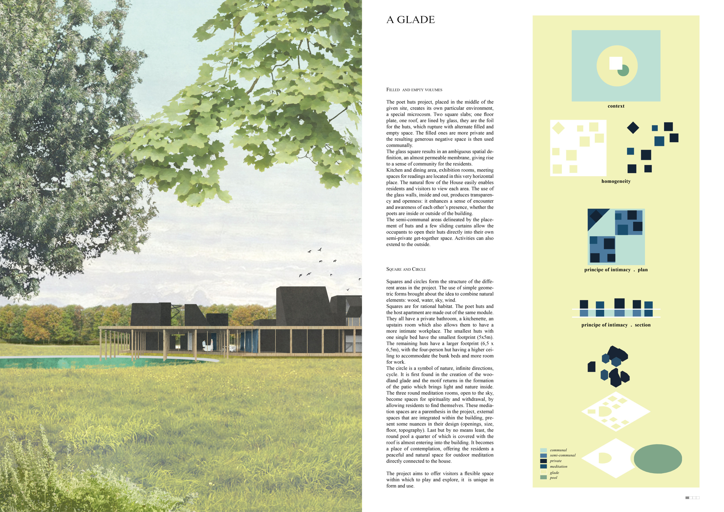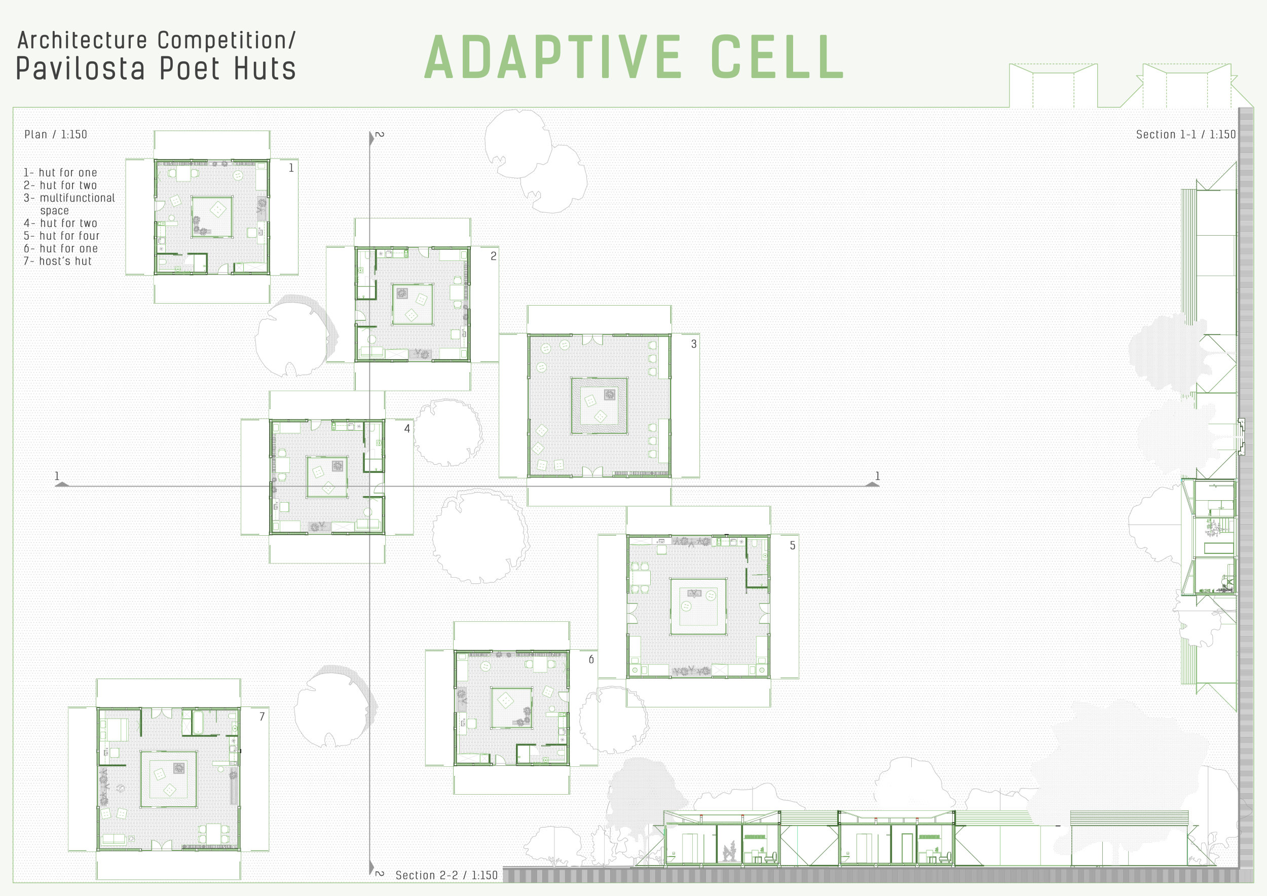 The competition sought designs for a small writers retreat where selected poets with free board can visit for short periods to produce their work. In addition to a set of five poet accommodations of various sizes, the designs were requested to include: plans for a multifunctional space able to accommodate small exhibitions, performances, readings and meditation sessions; a common kitchen and dining area; and host accommodations. ‘Huts’ were to house basic amenities including a bed, desk, kitchenette, washing station, and storage. Visitors are also expected to have access to outdoor meditative spaces and covered terraces.