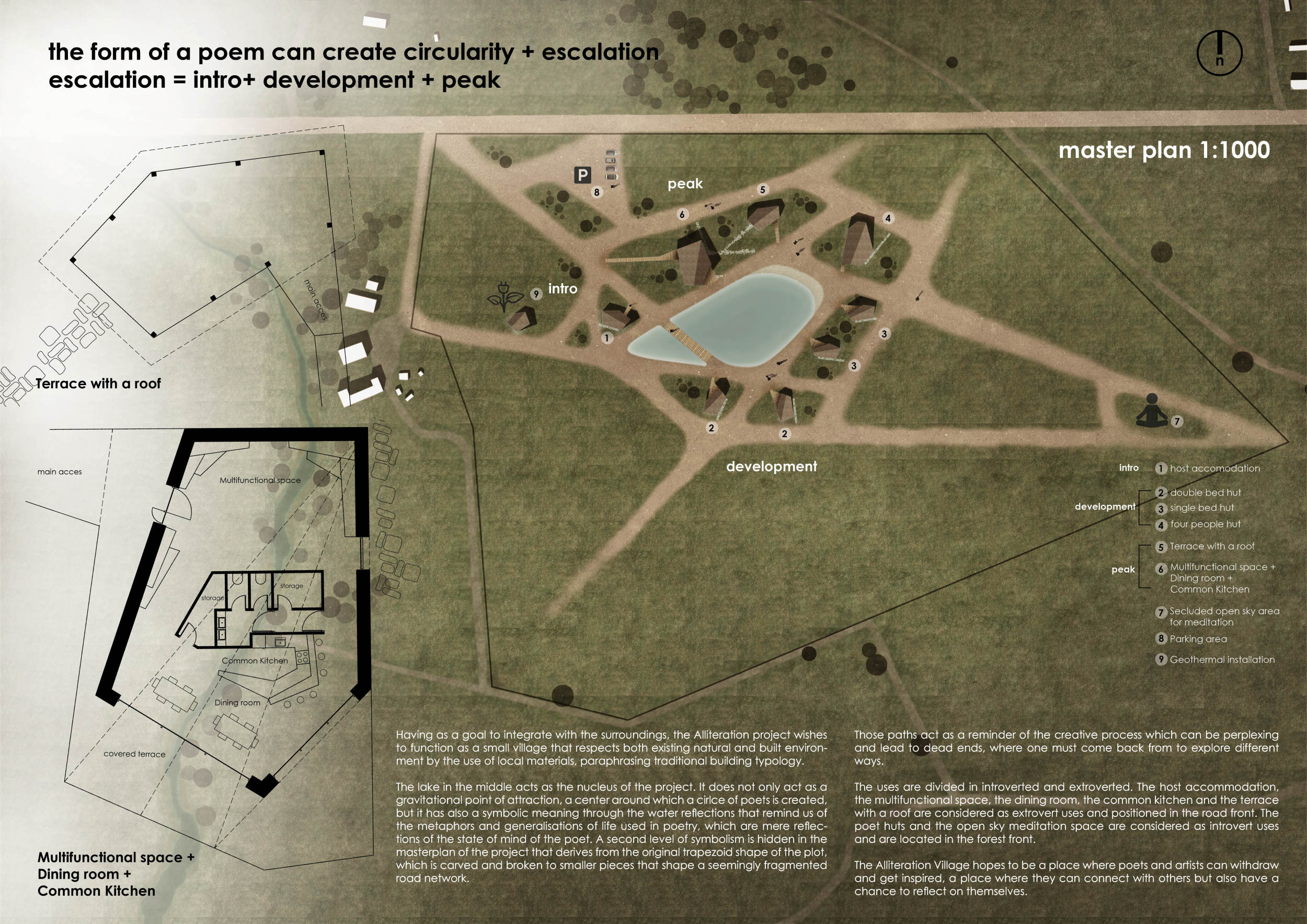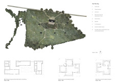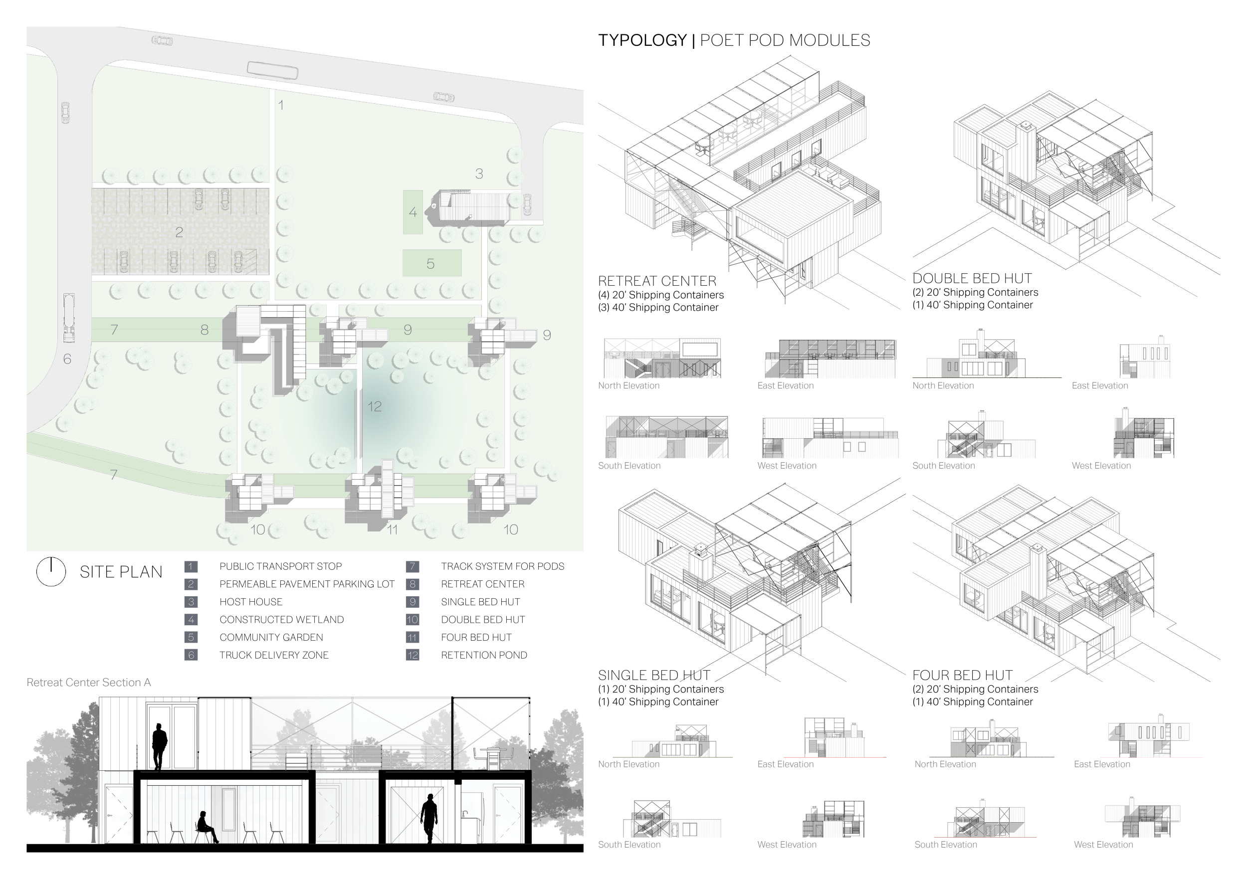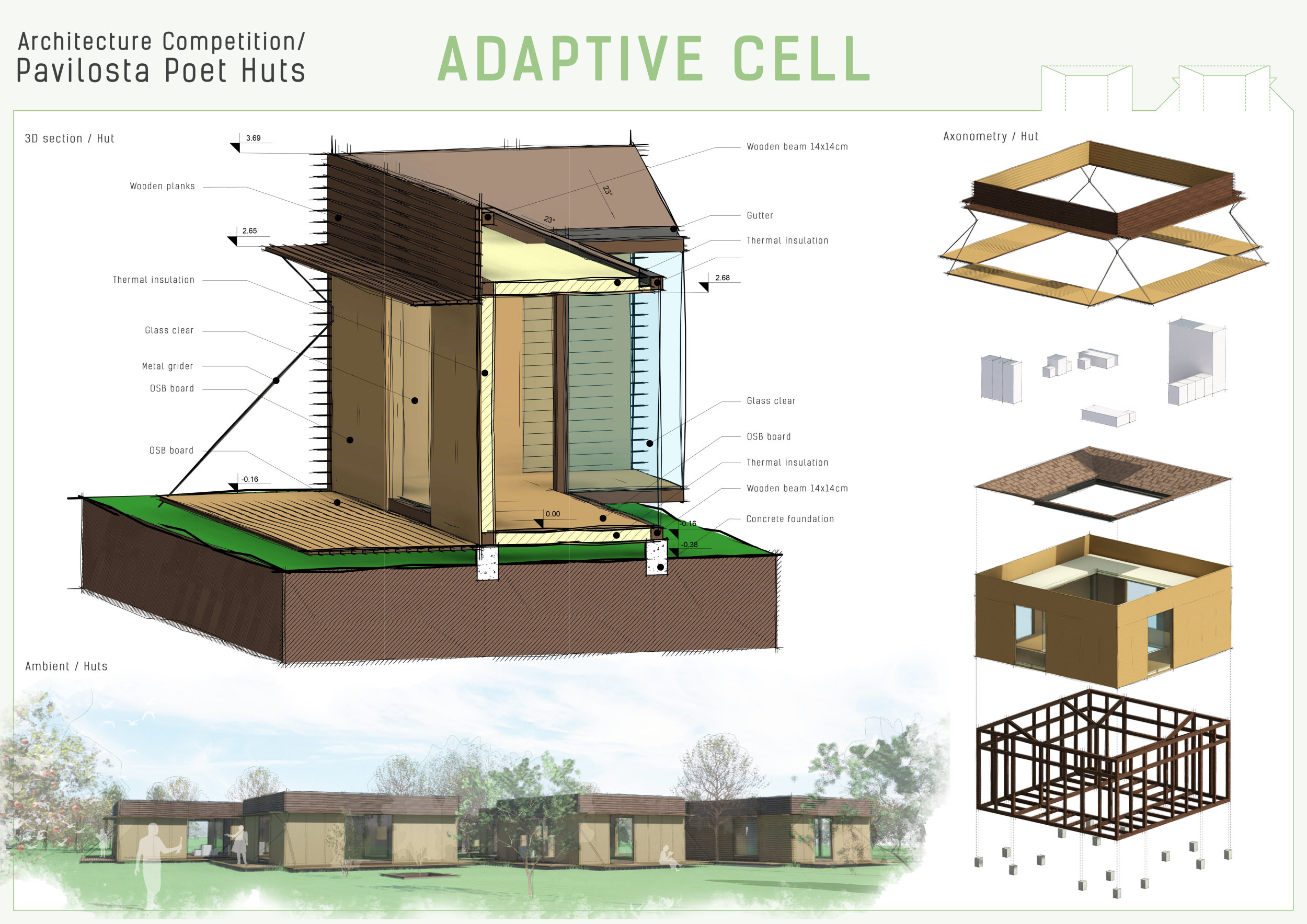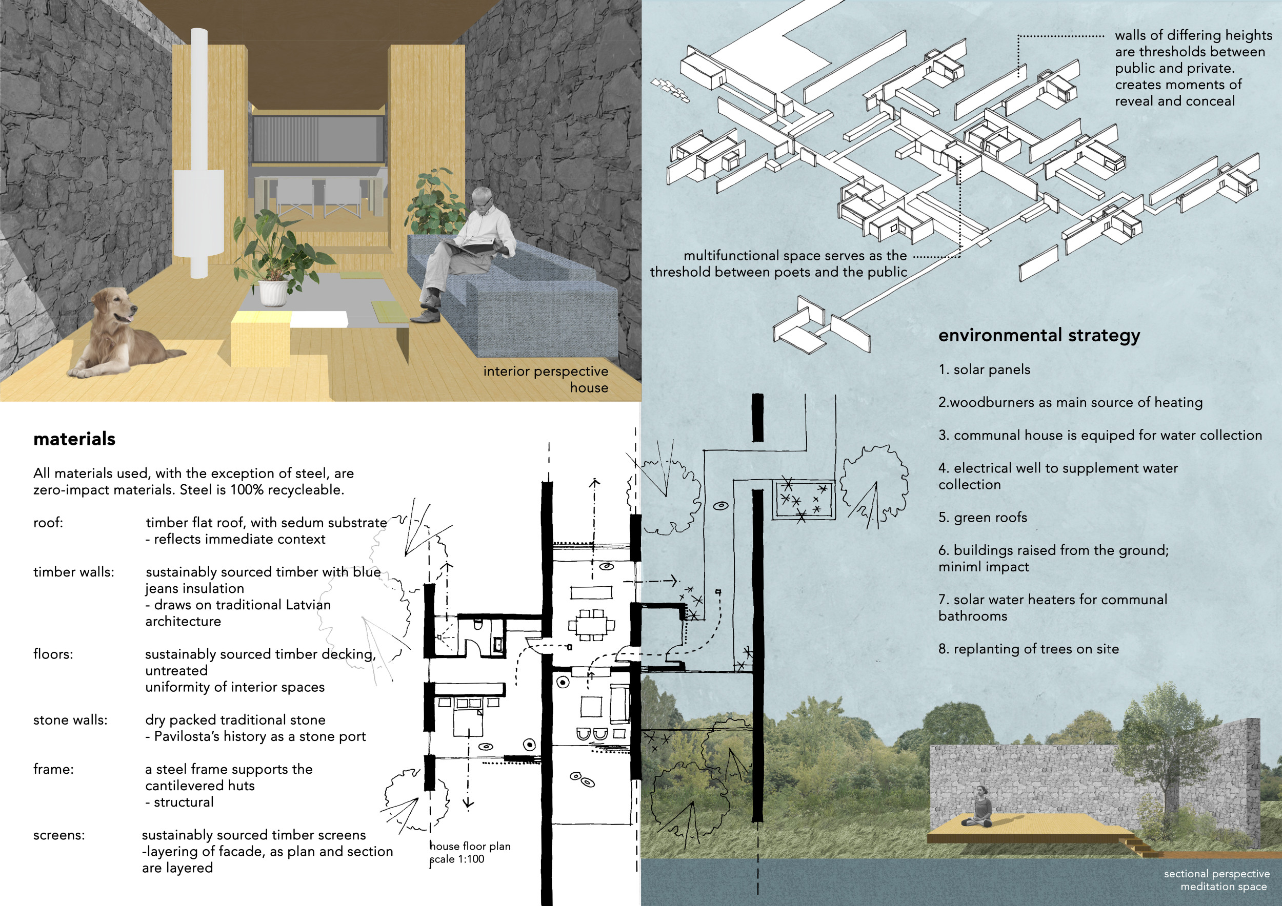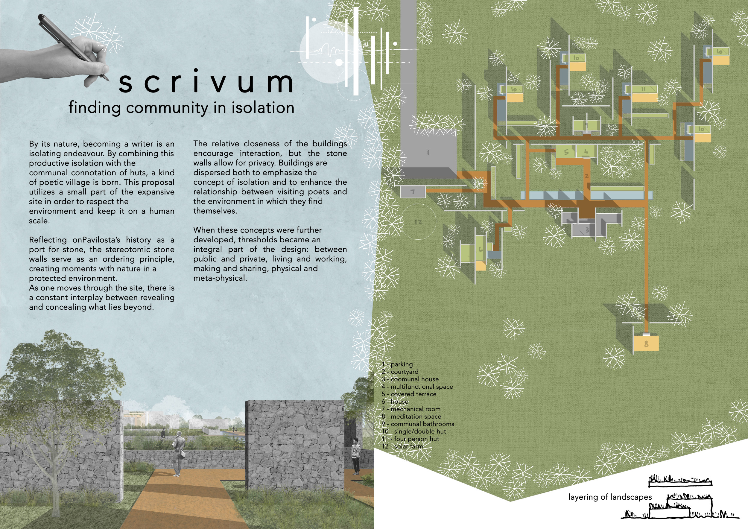 The competition sought designs for a small writers retreat where selected poets with free board can visit for short periods to produce their work. In addition to a set of five poet accommodations of various sizes, the designs were requested to include: plans for a multifunctional space able to accommodate small exhibitions, performances, readings and meditation sessions; a common kitchen and dining area; and host accommodations. ‘Huts’ were to house basic amenities including a bed, desk, kitchenette, washing station, and storage. Visitors are also expected to have access to outdoor meditative spaces and covered terraces.
