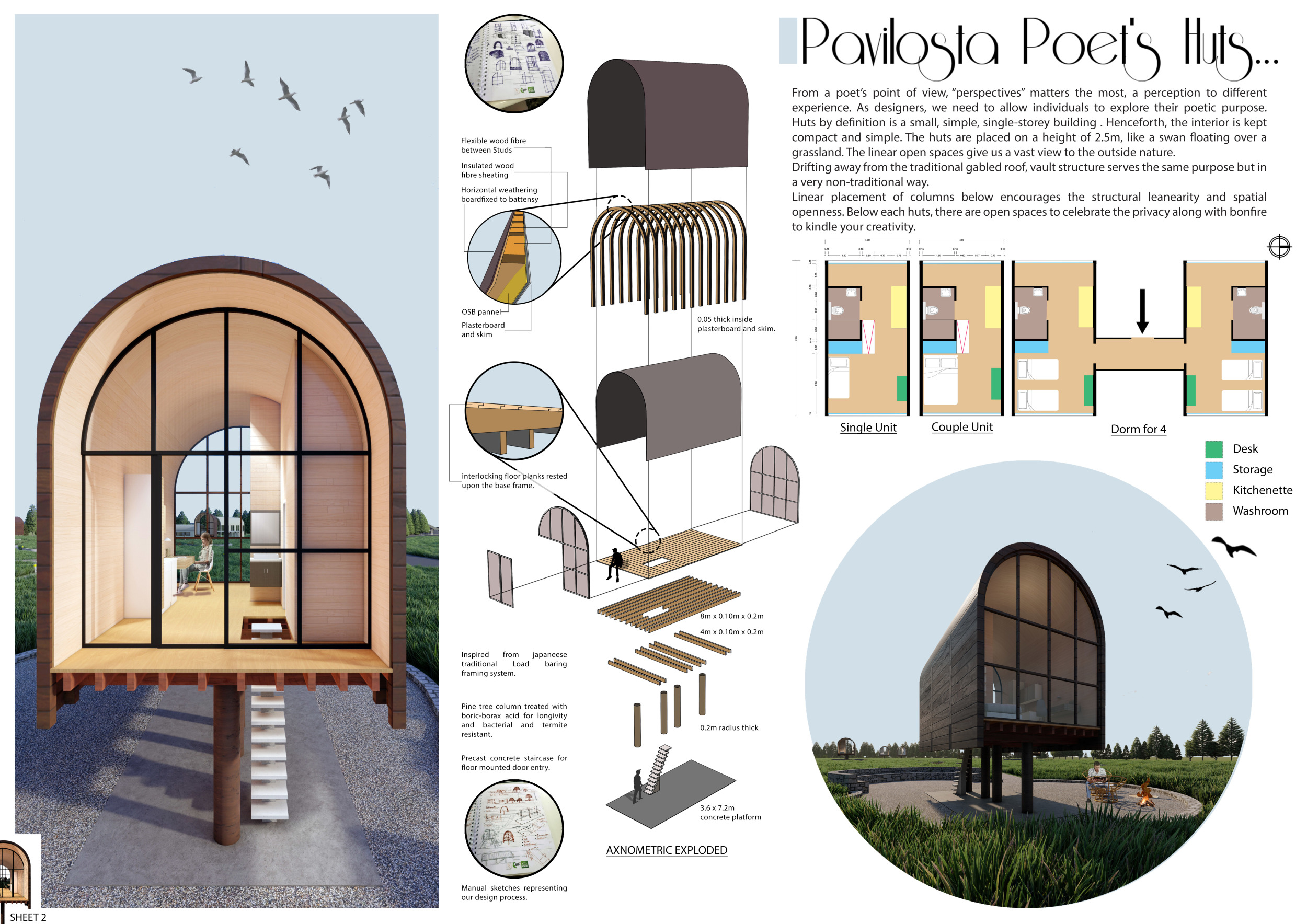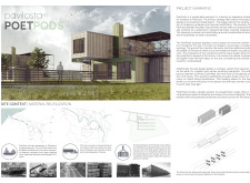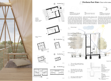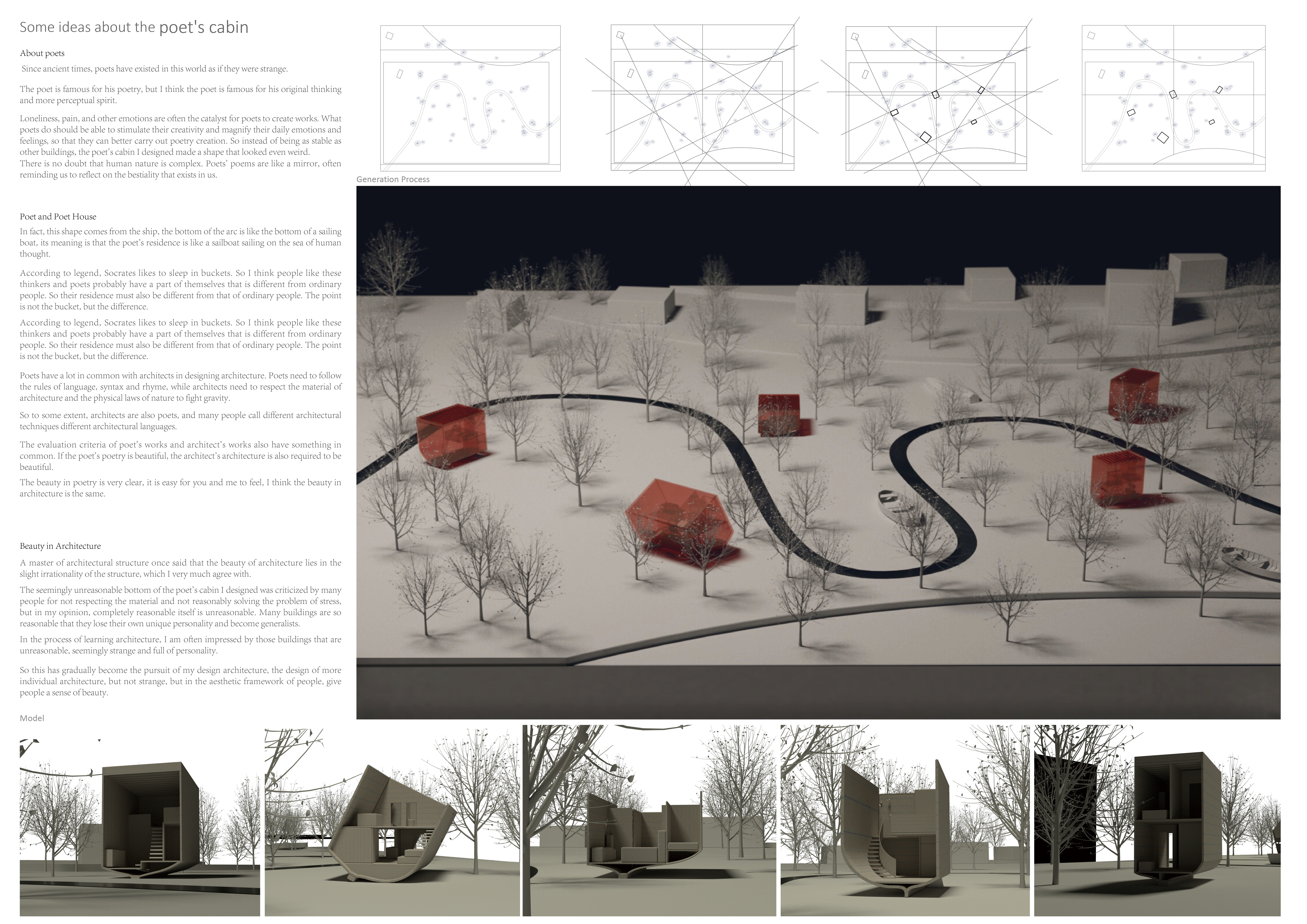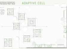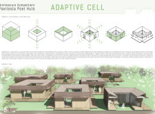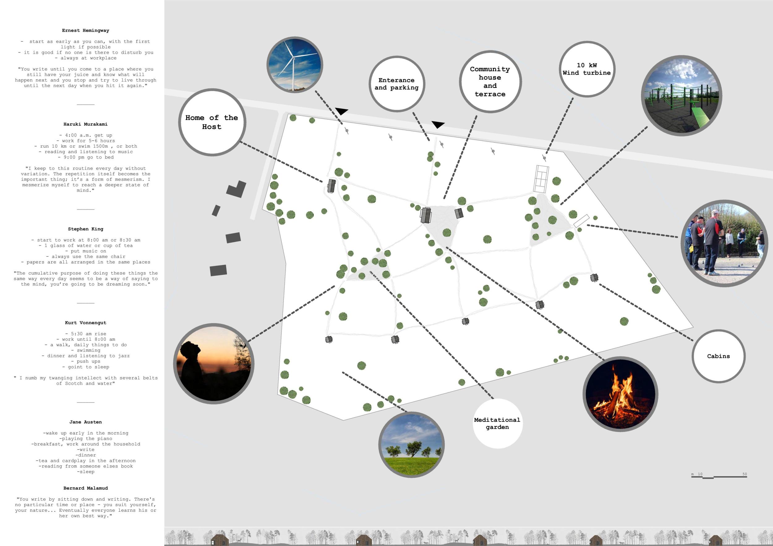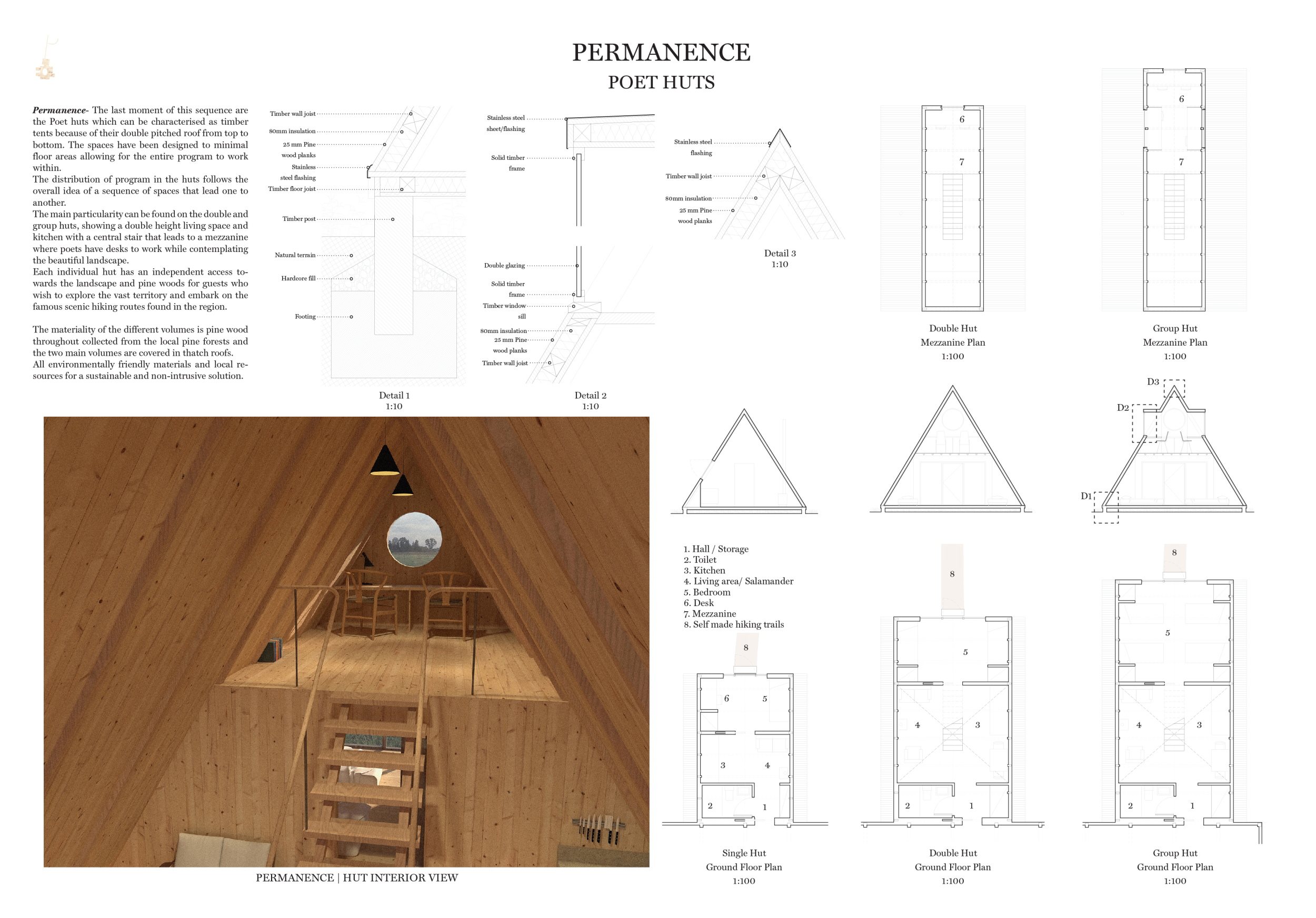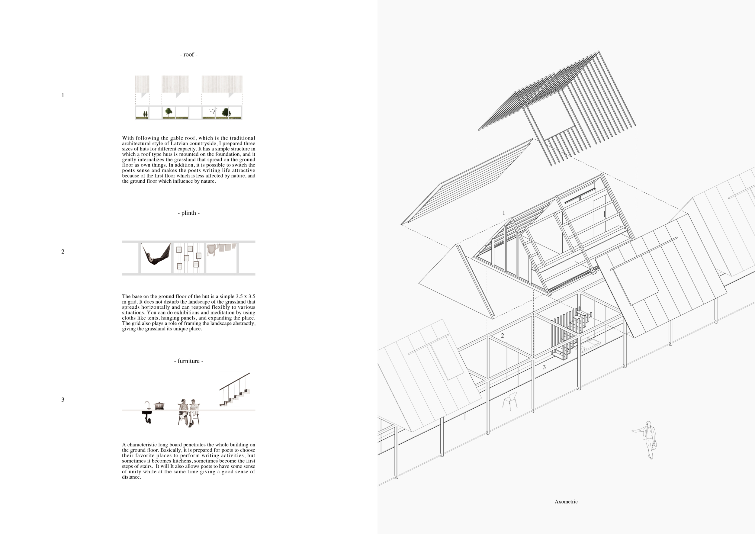 The competition sought designs for a small writers retreat where selected poets with free board can visit for short periods to produce their work. In addition to a set of five poet accommodations of various sizes, the designs were requested to include: plans for a multifunctional space able to accommodate small exhibitions, performances, readings and meditation sessions; a common kitchen and dining area; and host accommodations. ‘Huts’ were to house basic amenities including a bed, desk, kitchenette, washing station, and storage. Visitors are also expected to have access to outdoor meditative spaces and covered terraces.