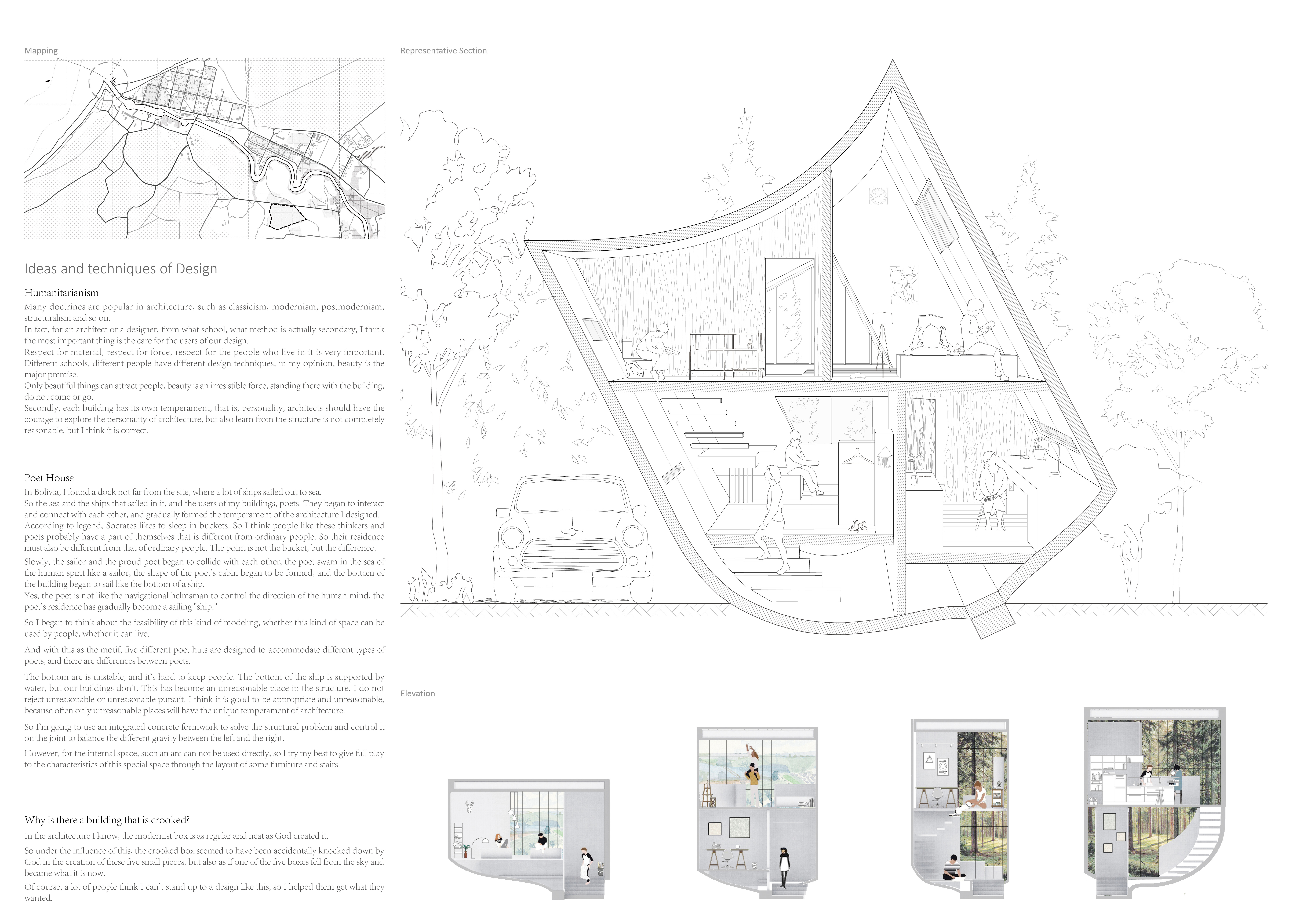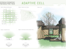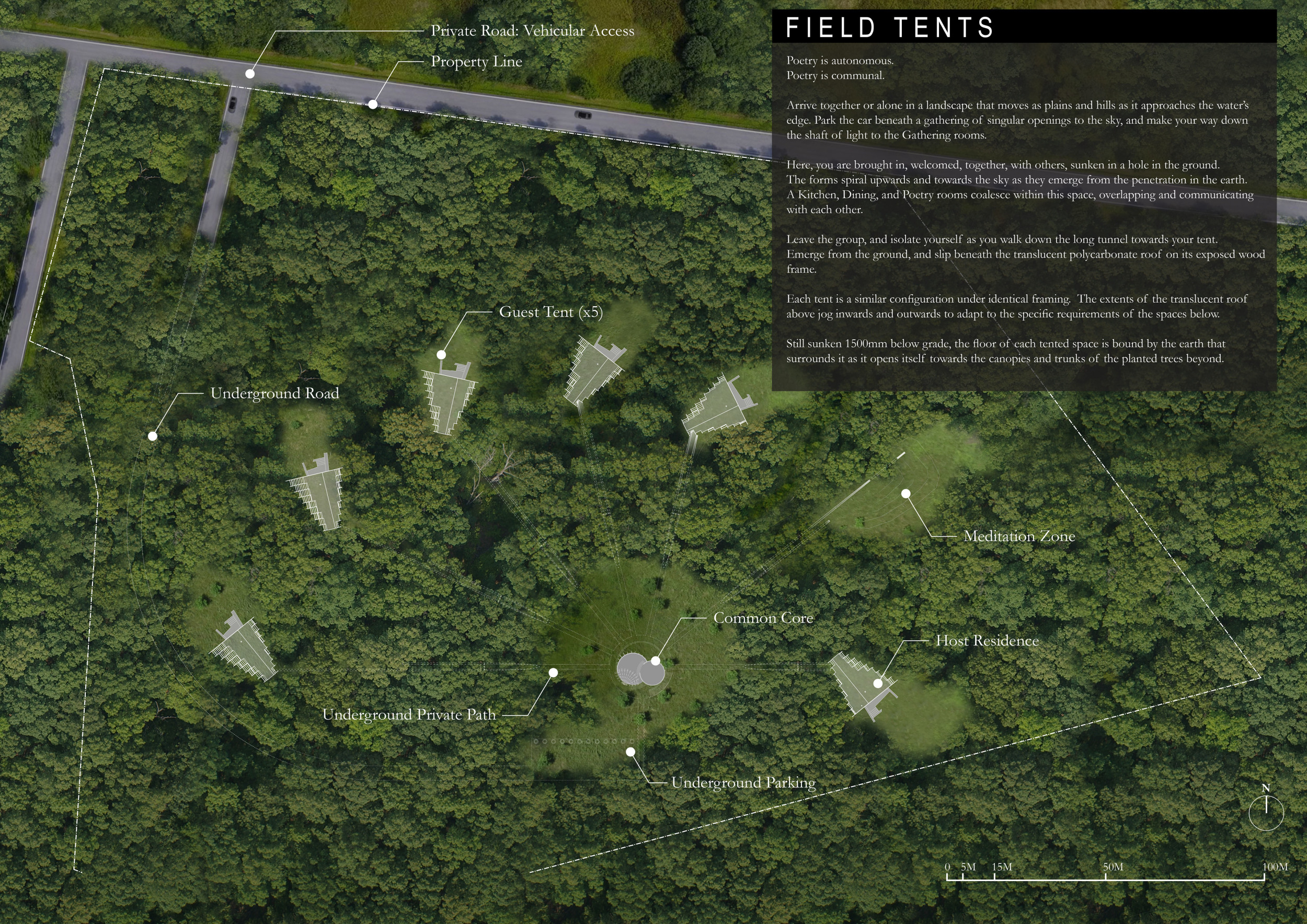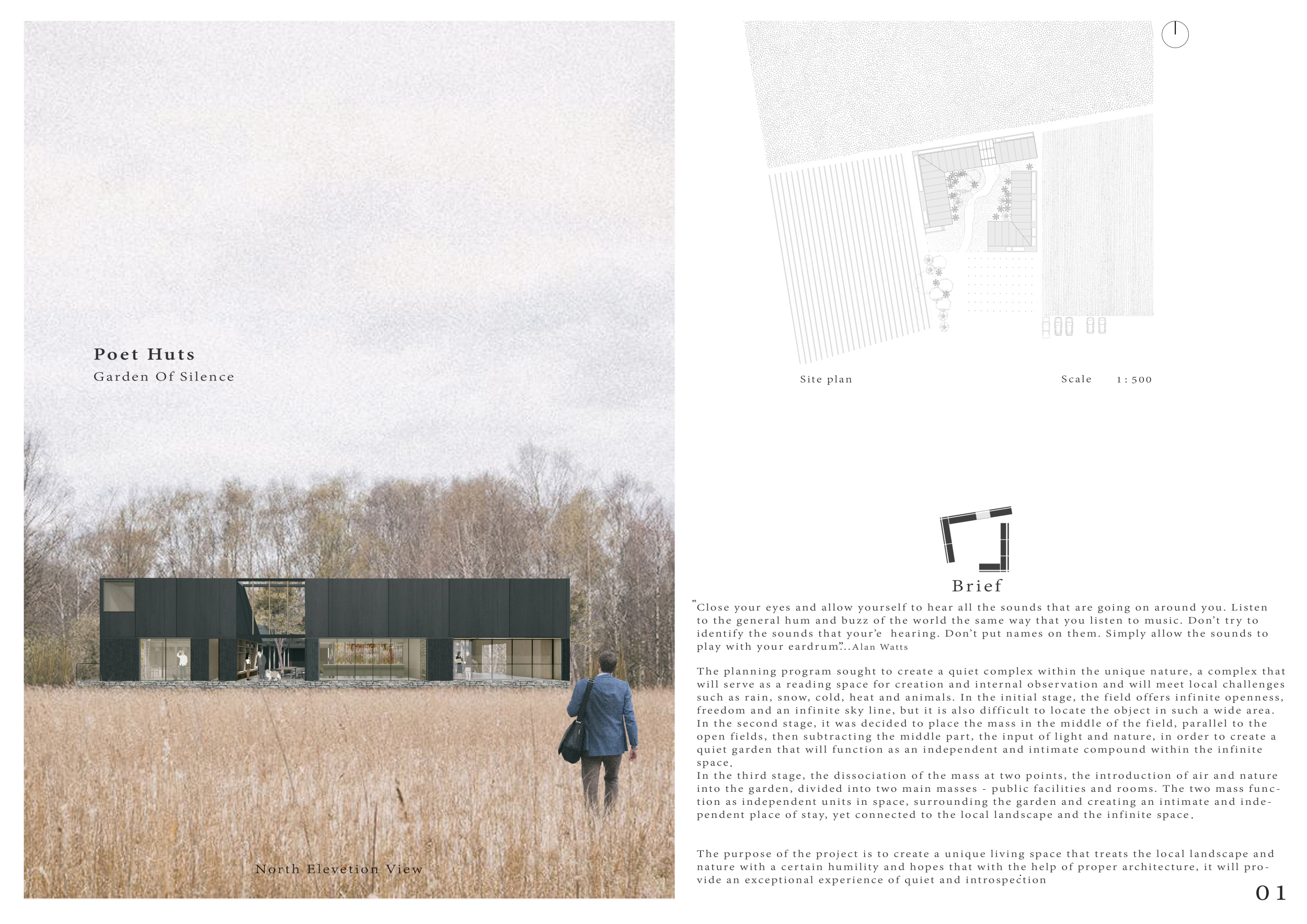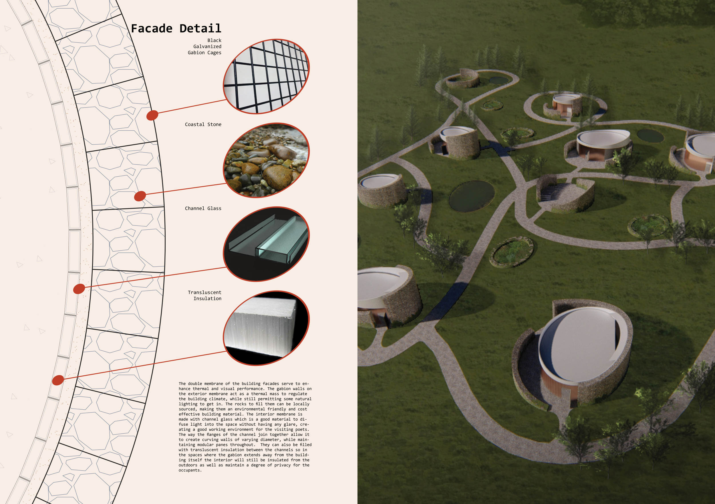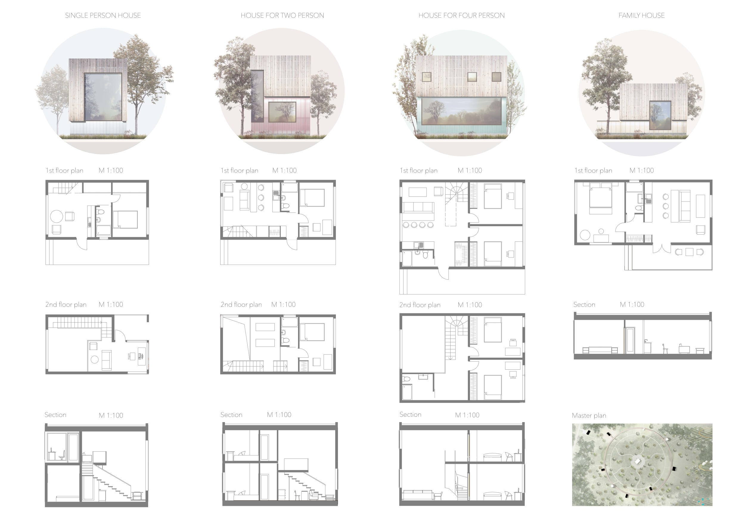 The competition sought designs for a small writers retreat where selected poets with free board can visit for short periods to produce their work. In addition to a set of five poet accommodations of various sizes, the designs were requested to include: plans for a multifunctional space able to accommodate small exhibitions, performances, readings and meditation sessions; a common kitchen and dining area; and host accommodations. ‘Huts’ were to house basic amenities including a bed, desk, kitchenette, washing station, and storage. Visitors are also expected to have access to outdoor meditative spaces and covered terraces.