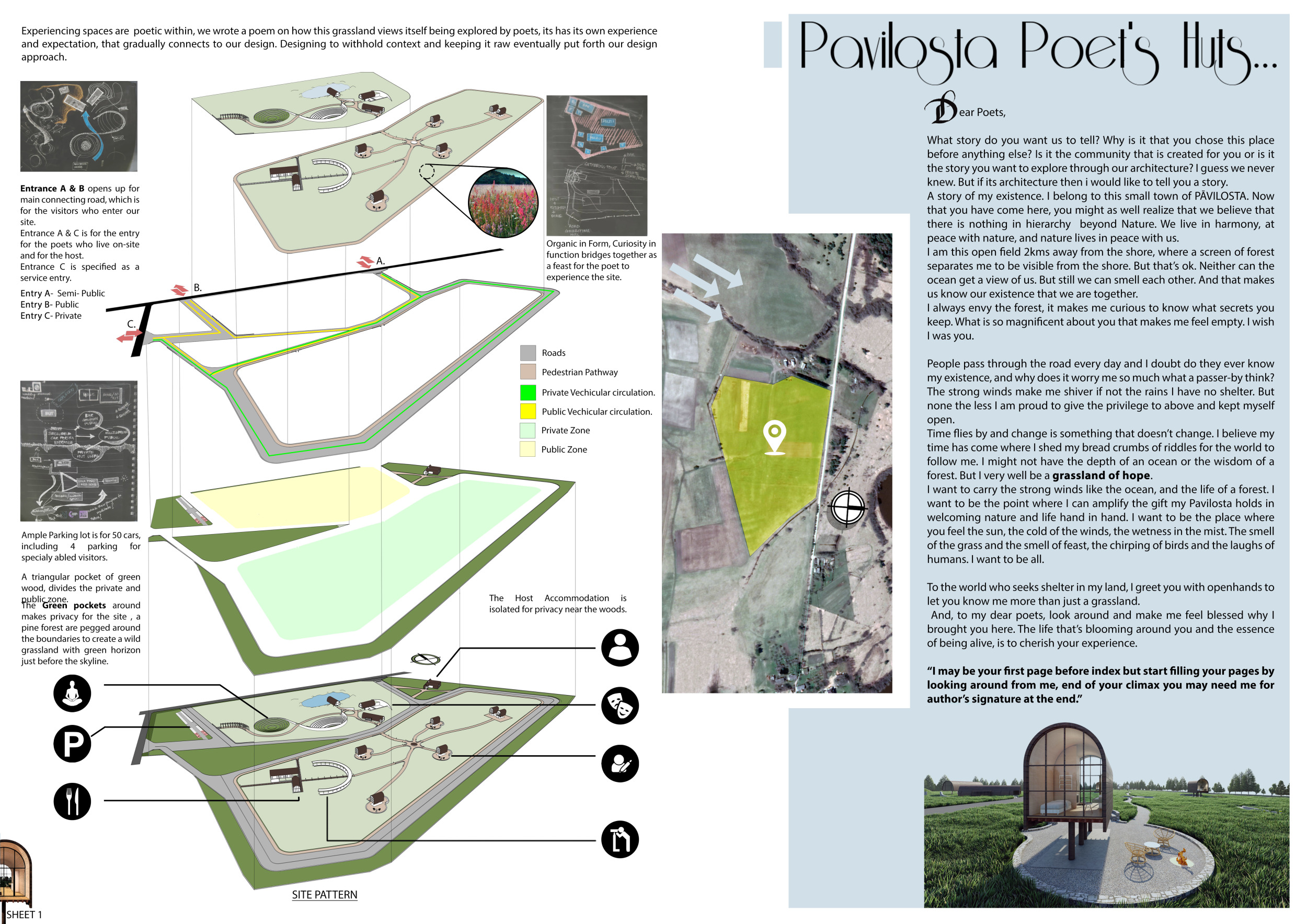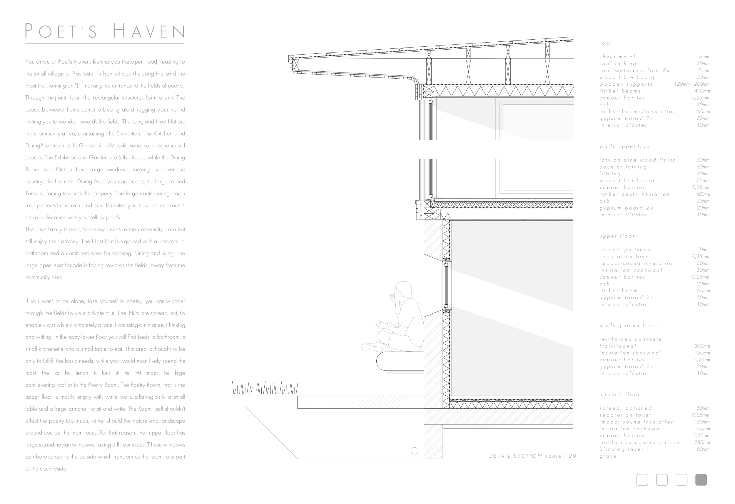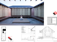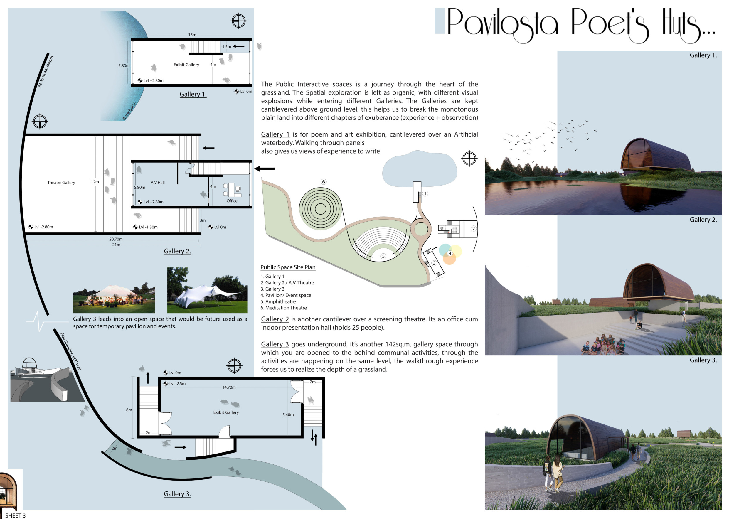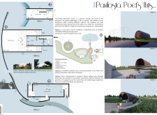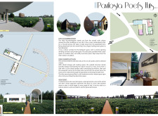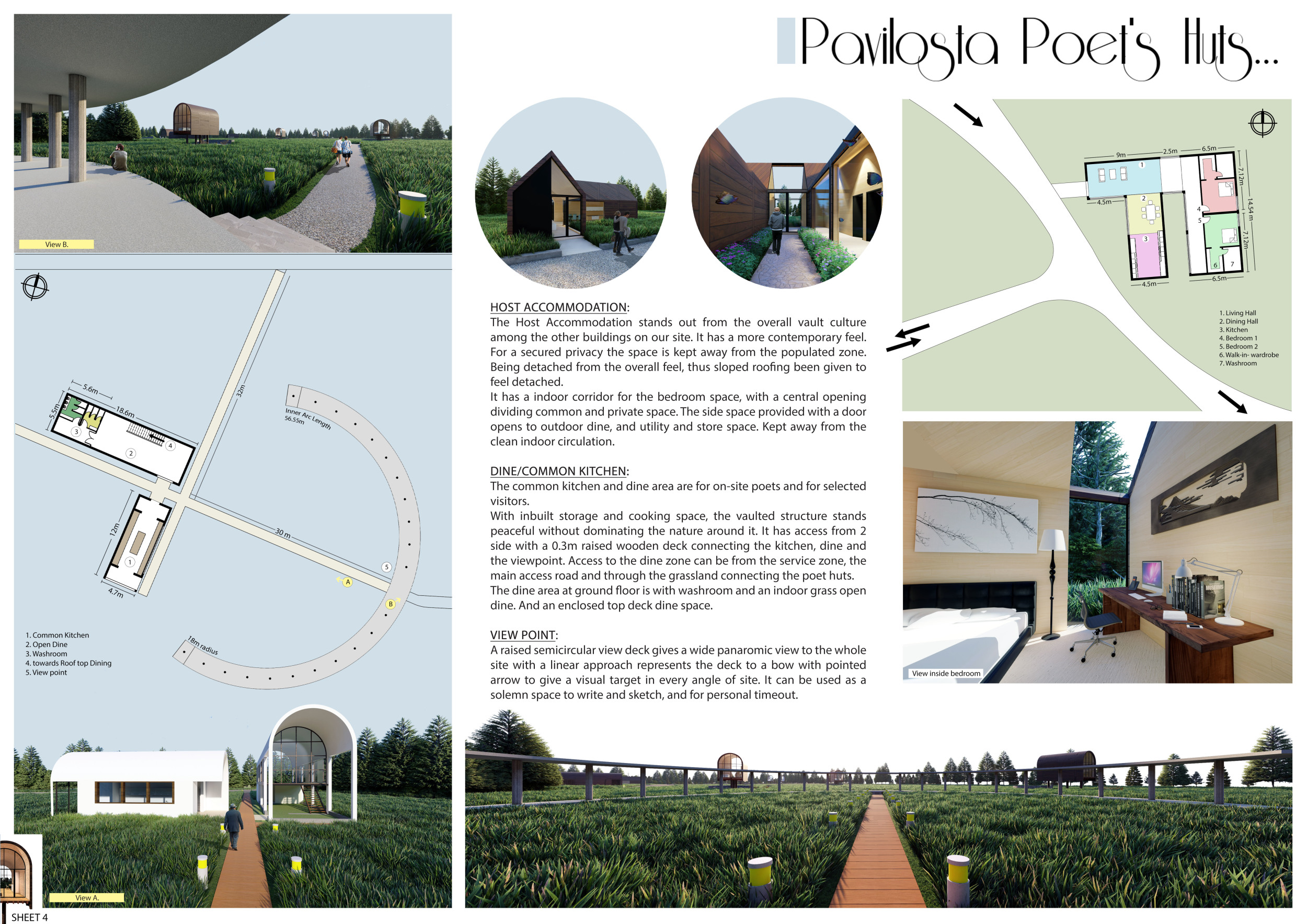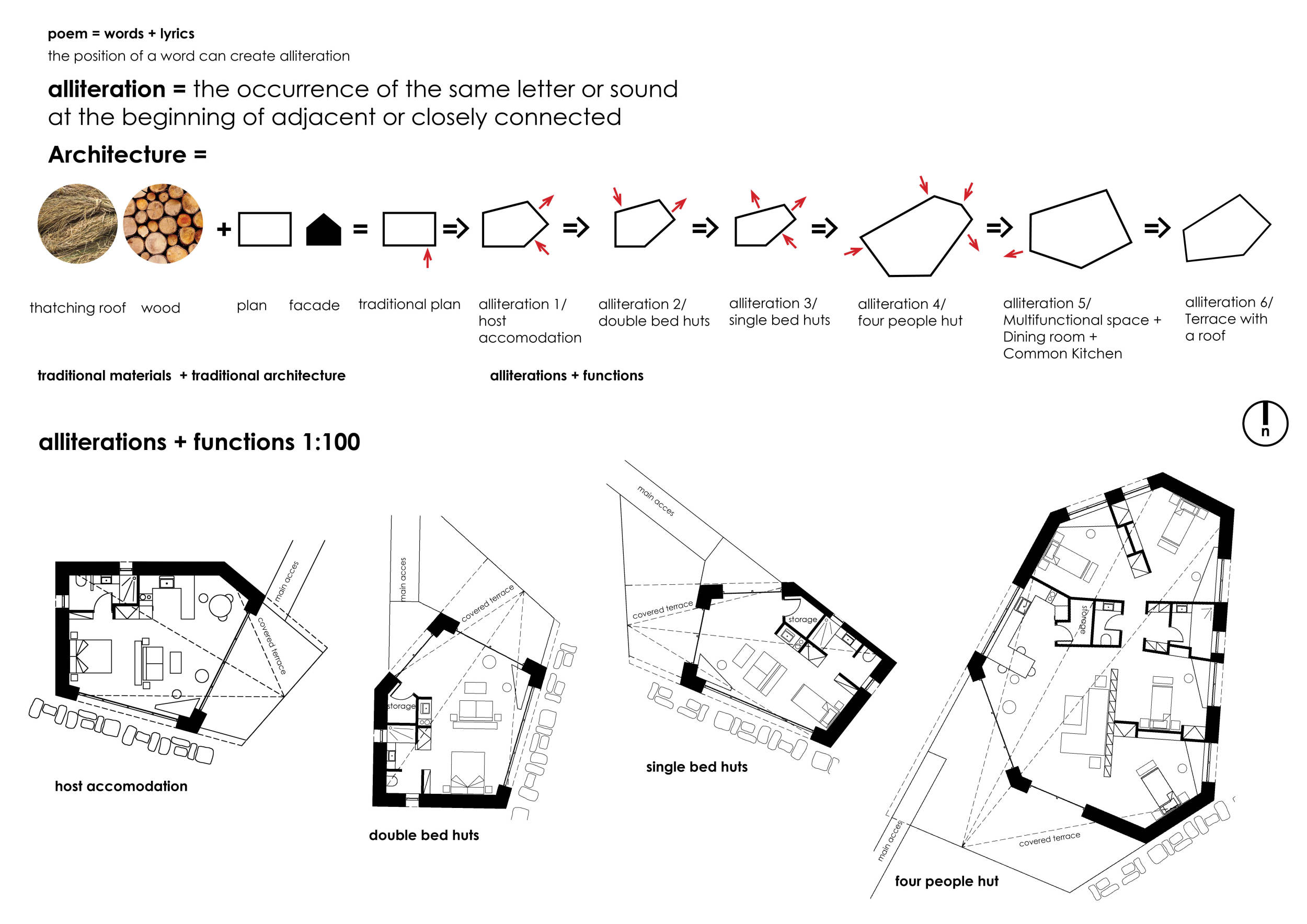 The competition sought designs for a small writers retreat where selected poets with free board can visit for short periods to produce their work. In addition to a set of five poet accommodations of various sizes, the designs were requested to include: plans for a multifunctional space able to accommodate small exhibitions, performances, readings and meditation sessions; a common kitchen and dining area; and host accommodations. ‘Huts’ were to house basic amenities including a bed, desk, kitchenette, washing station, and storage. Visitors are also expected to have access to outdoor meditative spaces and covered terraces.