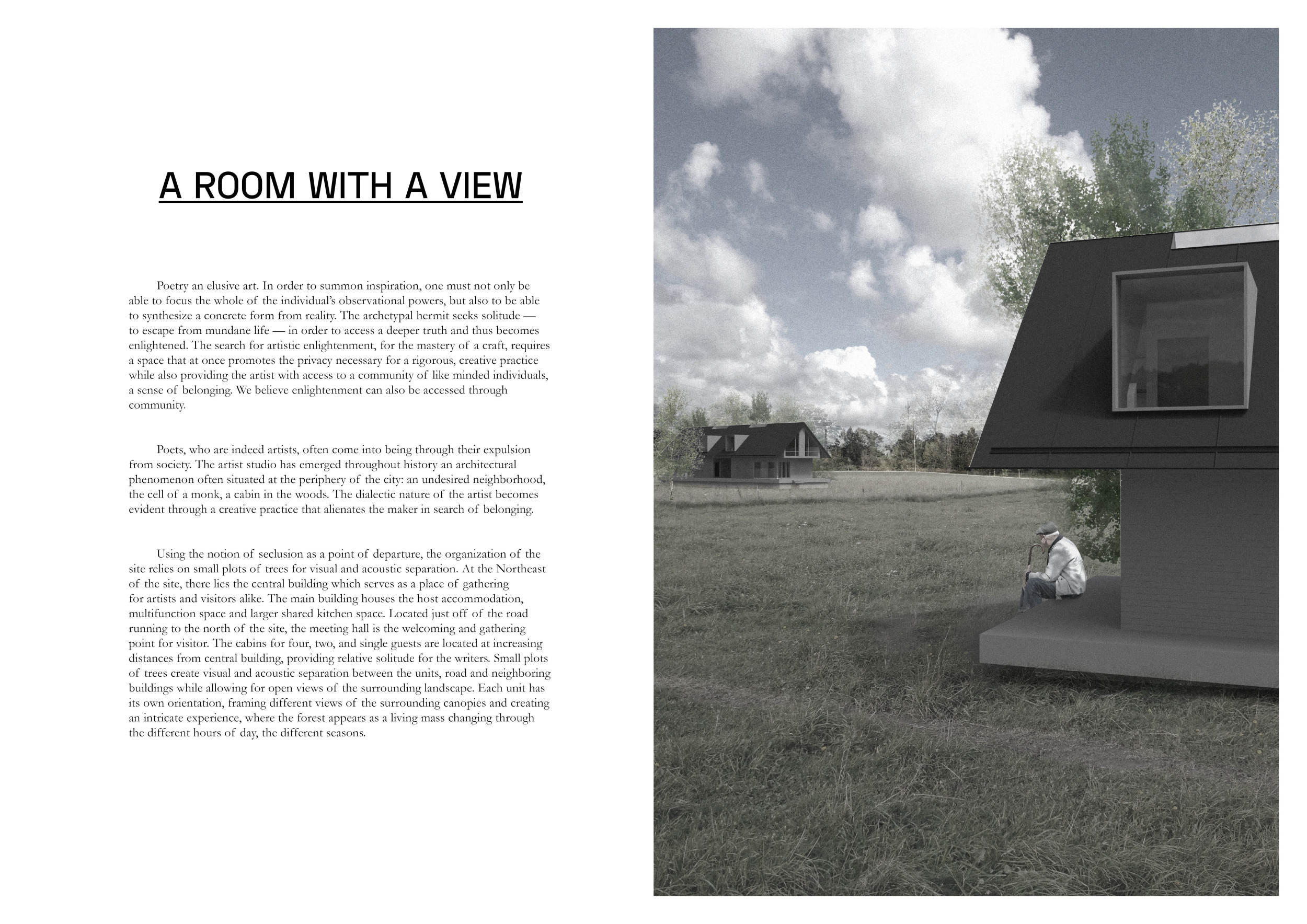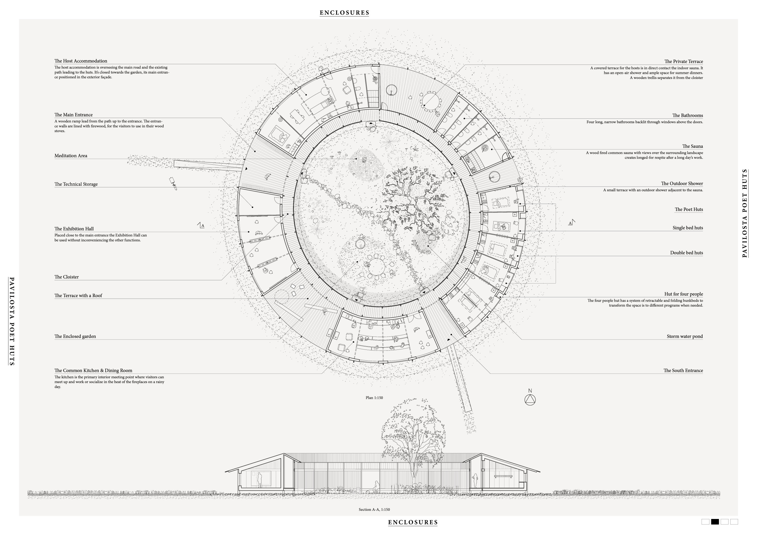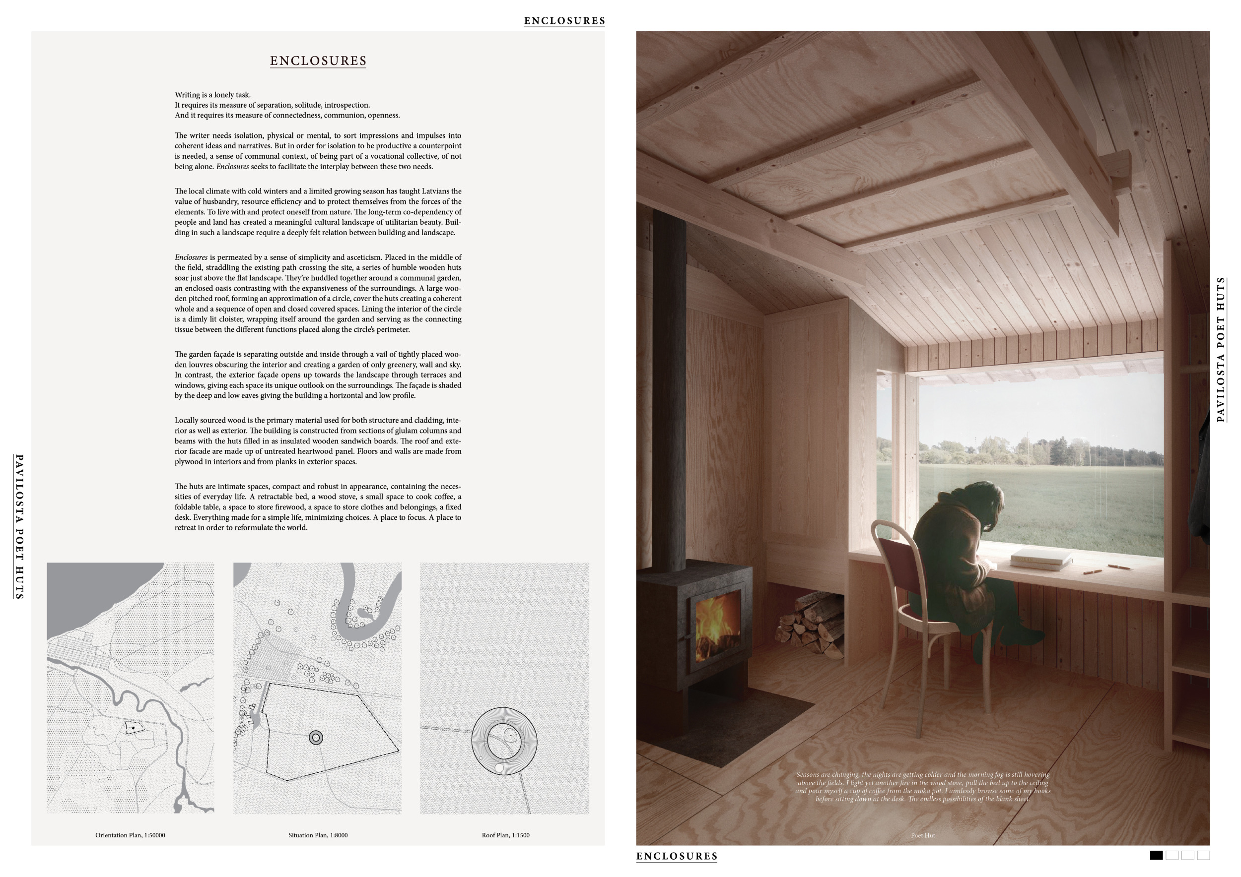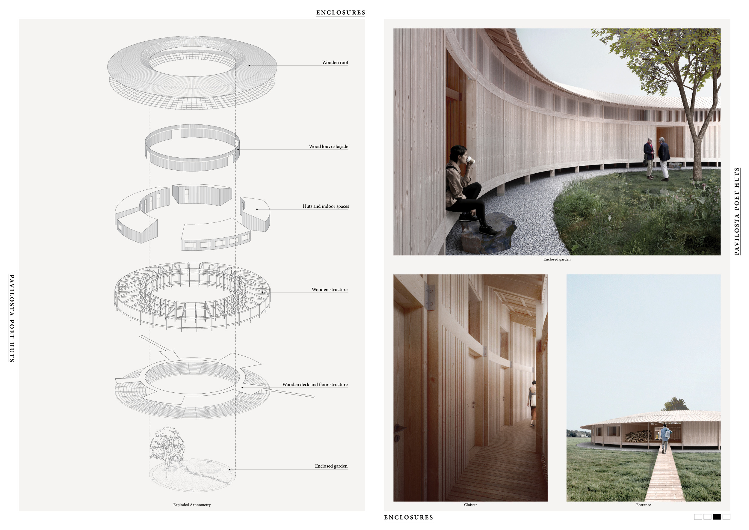 ‘Enclosures’ also considers the writer as a worker that requires both isolation and community. The proposal places a single building in the center of the site, enclosing a garden with a large tree and meditation zone. The approximately circular form features a low profile with a pitched roof that covers a corridor on the interior side of the ring. The design uses a glulam primary structure clad with heartwood and plywood. Read more In plan, enclosed spaces are interspersed with exterior covered terraces that offer permeability. The jury was impressed by the high quality of renderings and level of detail in the drawings. One can easily imagine a productive and quiet visit to this project. The jury questions whether alternative timber products might be considered that hold up longer to inclement winters and humid summers.
