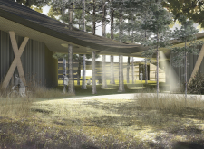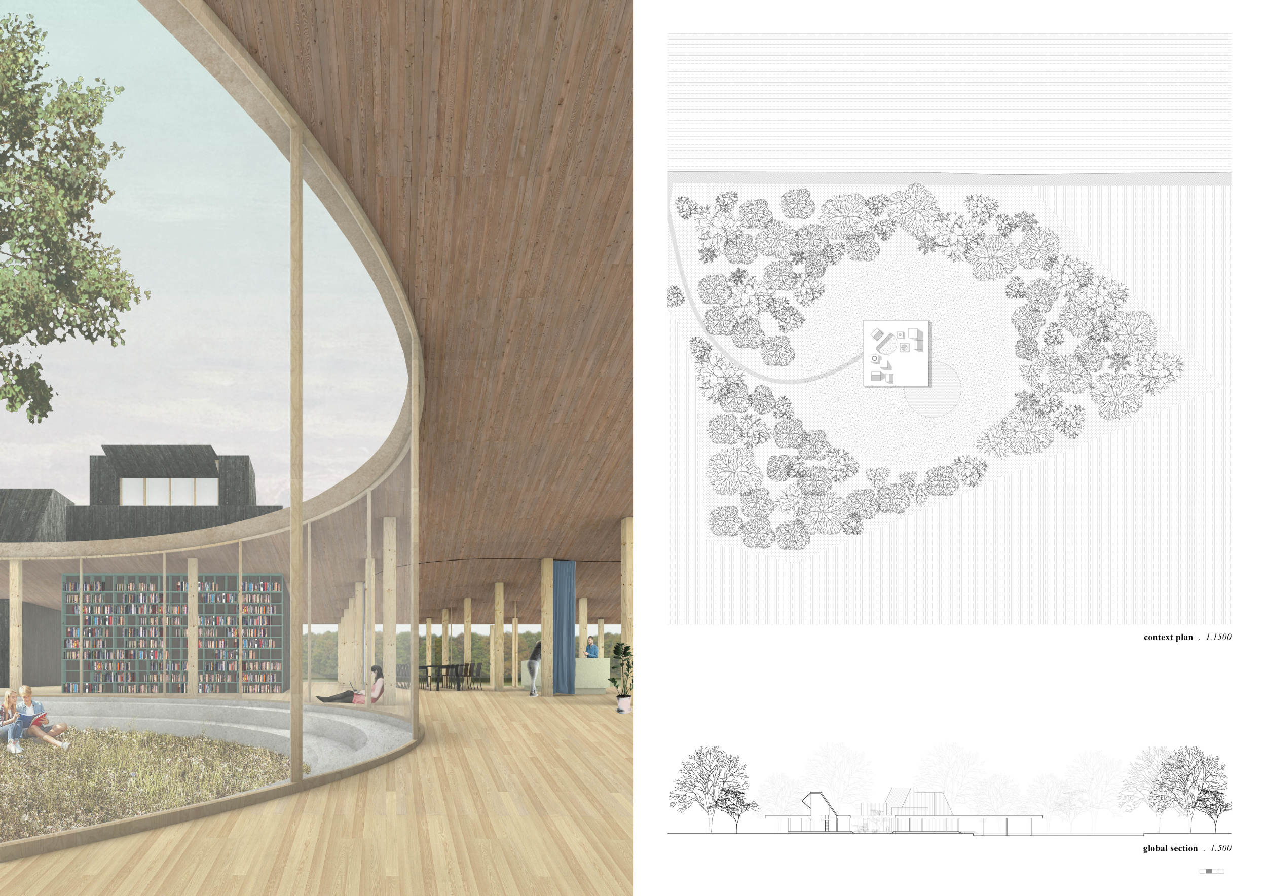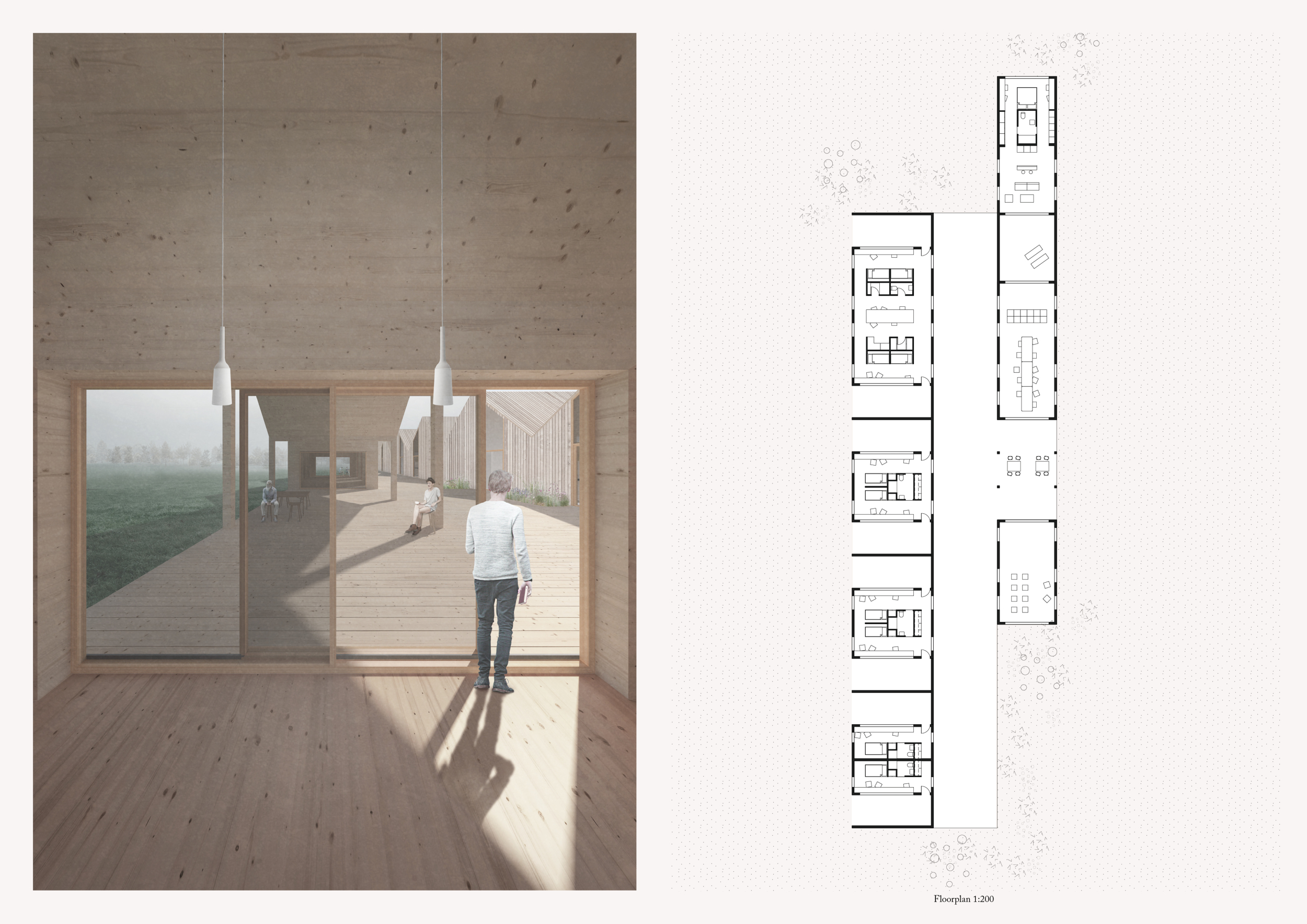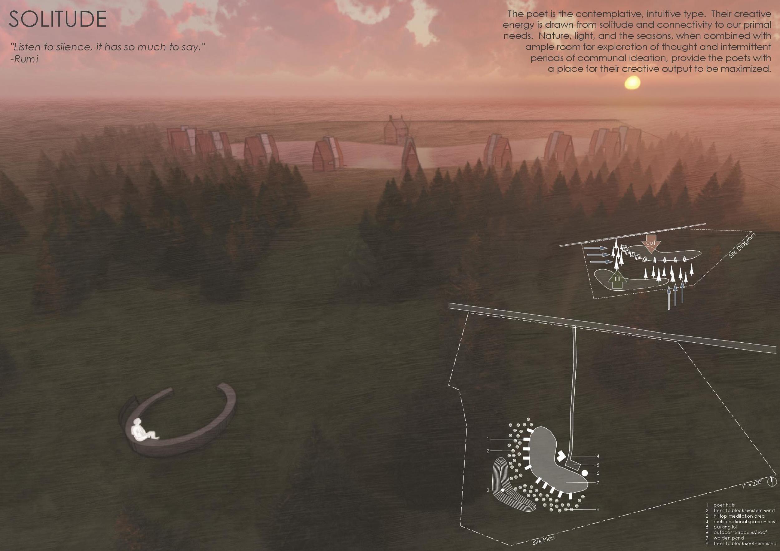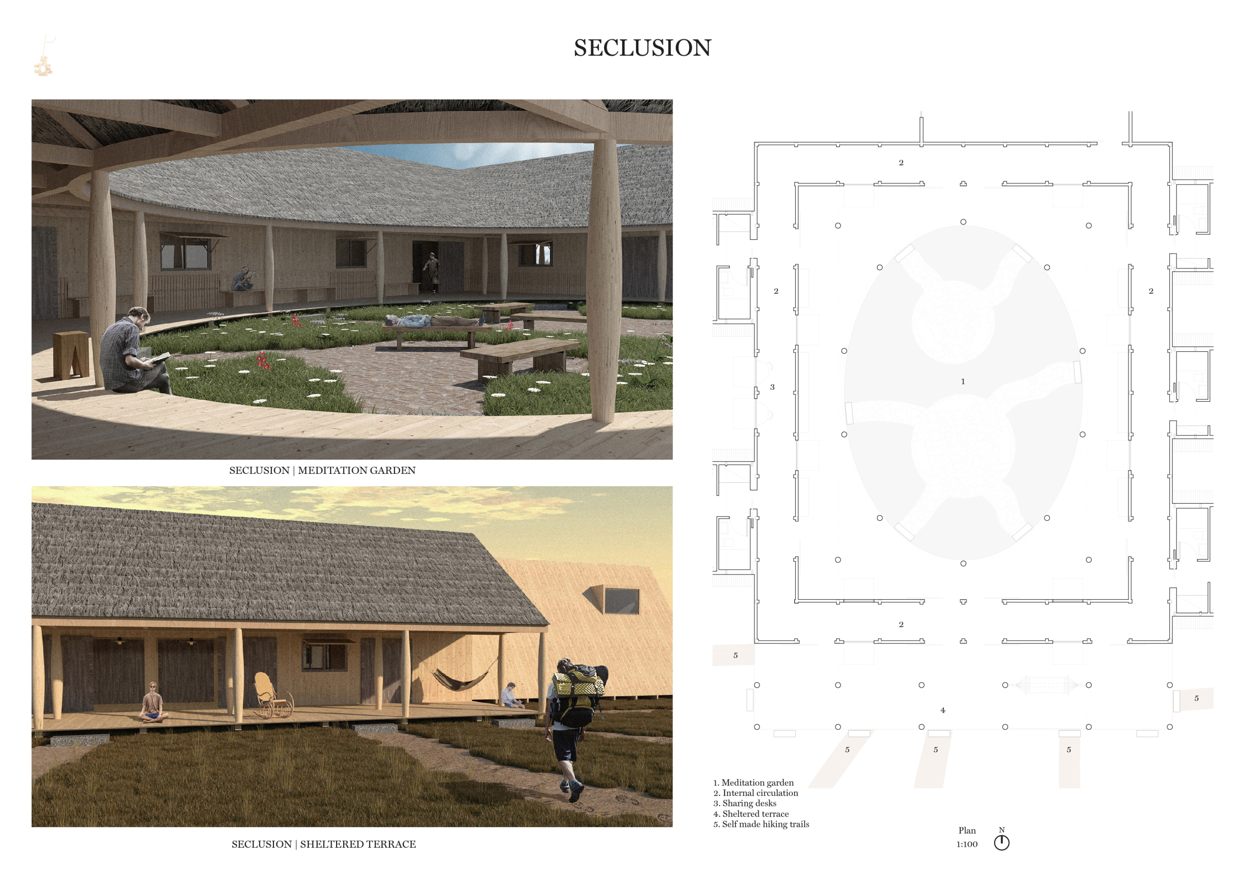 ‘Enclosures’ also considers the writer as a worker that requires both isolation and community. The proposal places a single building in the center of the site, enclosing a garden with a large tree and meditation zone. The approximately circular form features a low profile with a pitched roof that covers a corridor on the interior side of the ring. The design uses a glulam primary structure clad with heartwood and plywood. Read more In plan, enclosed spaces are interspersed with exterior covered terraces that offer permeability. The jury was impressed by the high quality of renderings and level of detail in the drawings. One can easily imagine a productive and quiet visit to this project. The jury questions whether alternative timber products might be considered that hold up longer to inclement winters and humid summers.