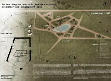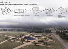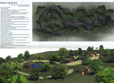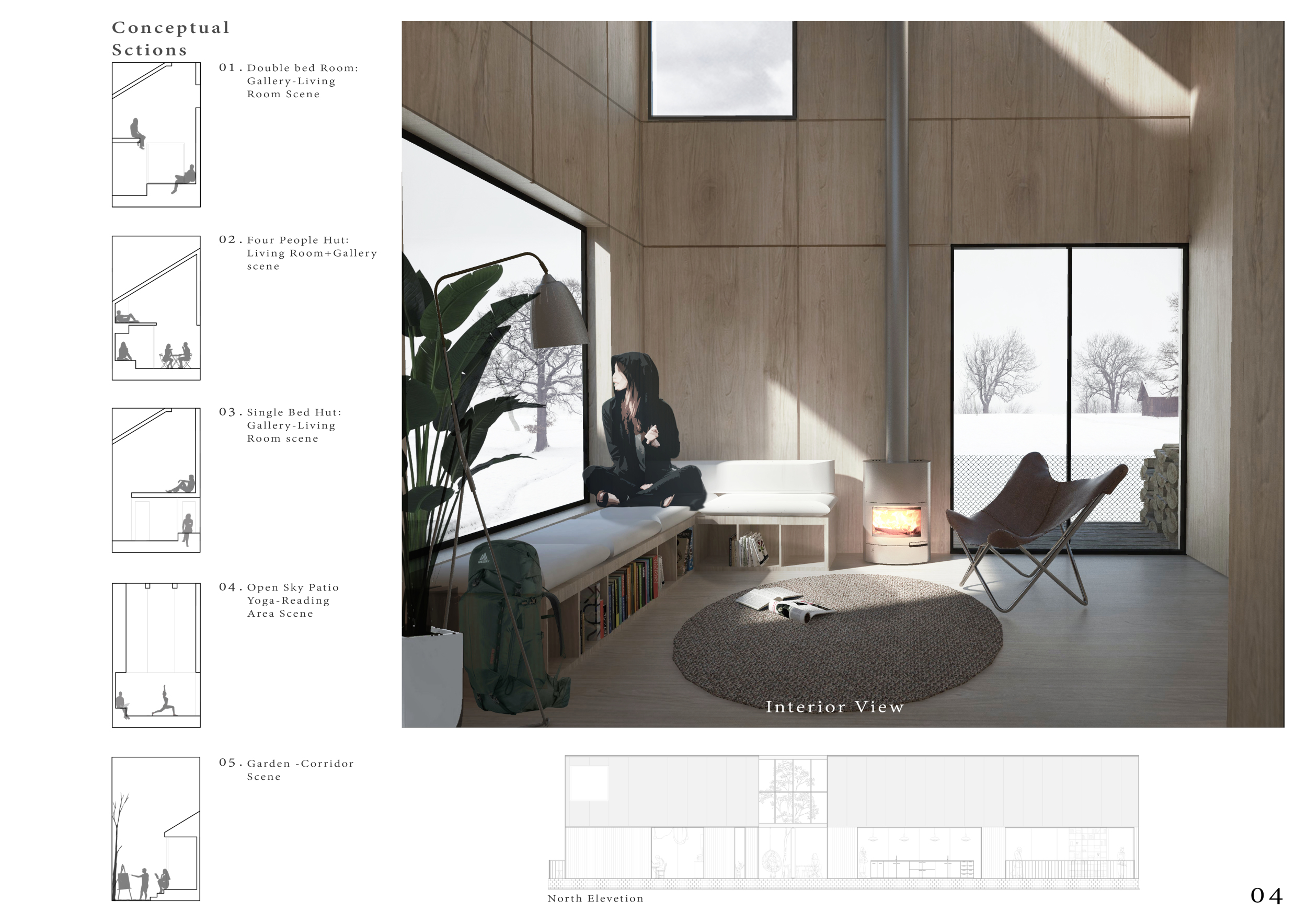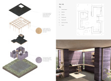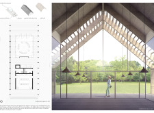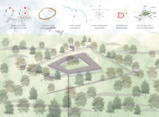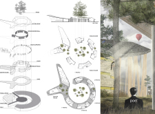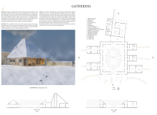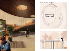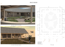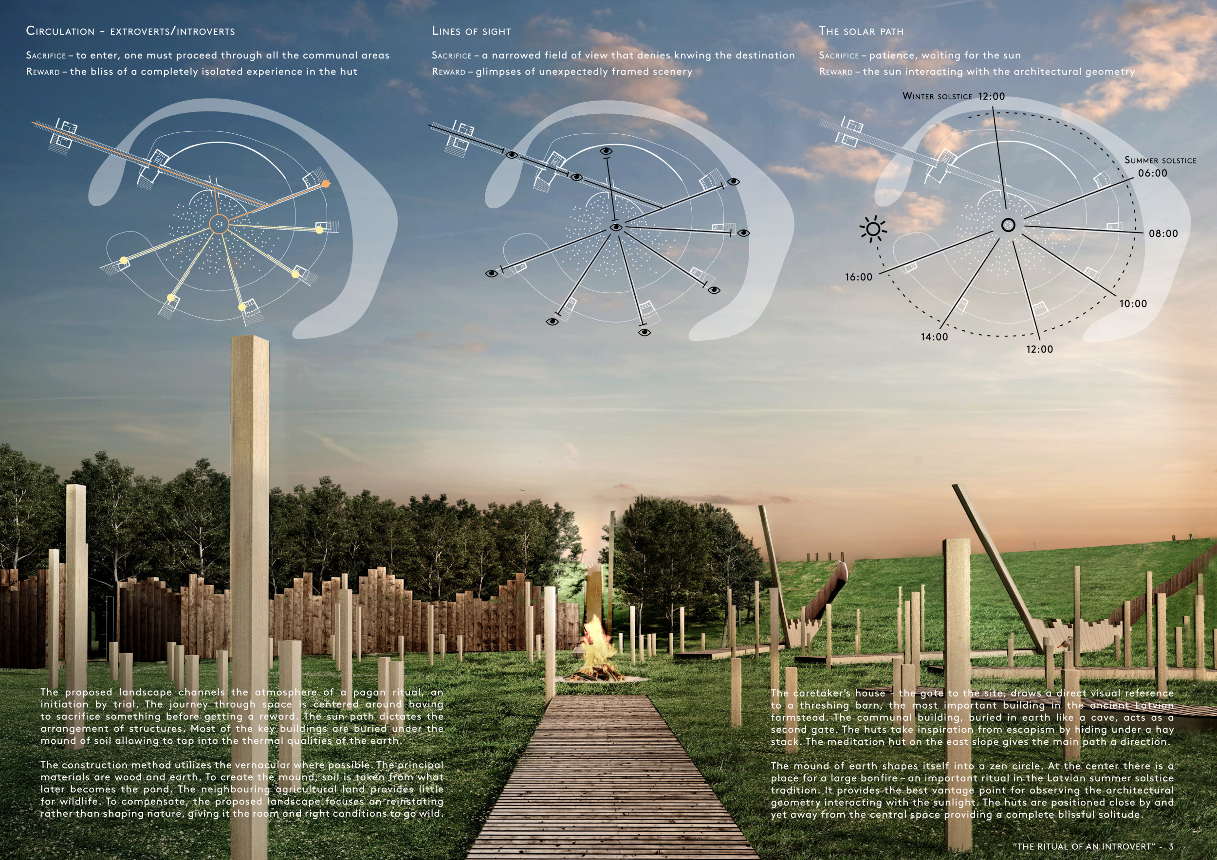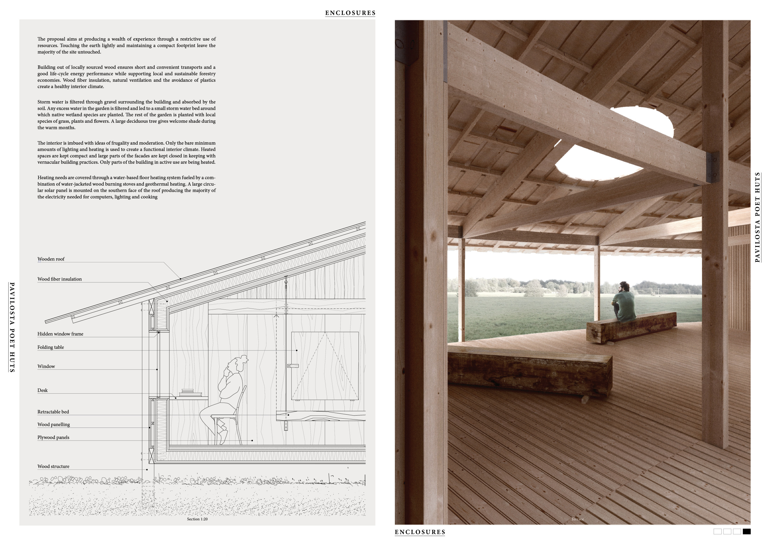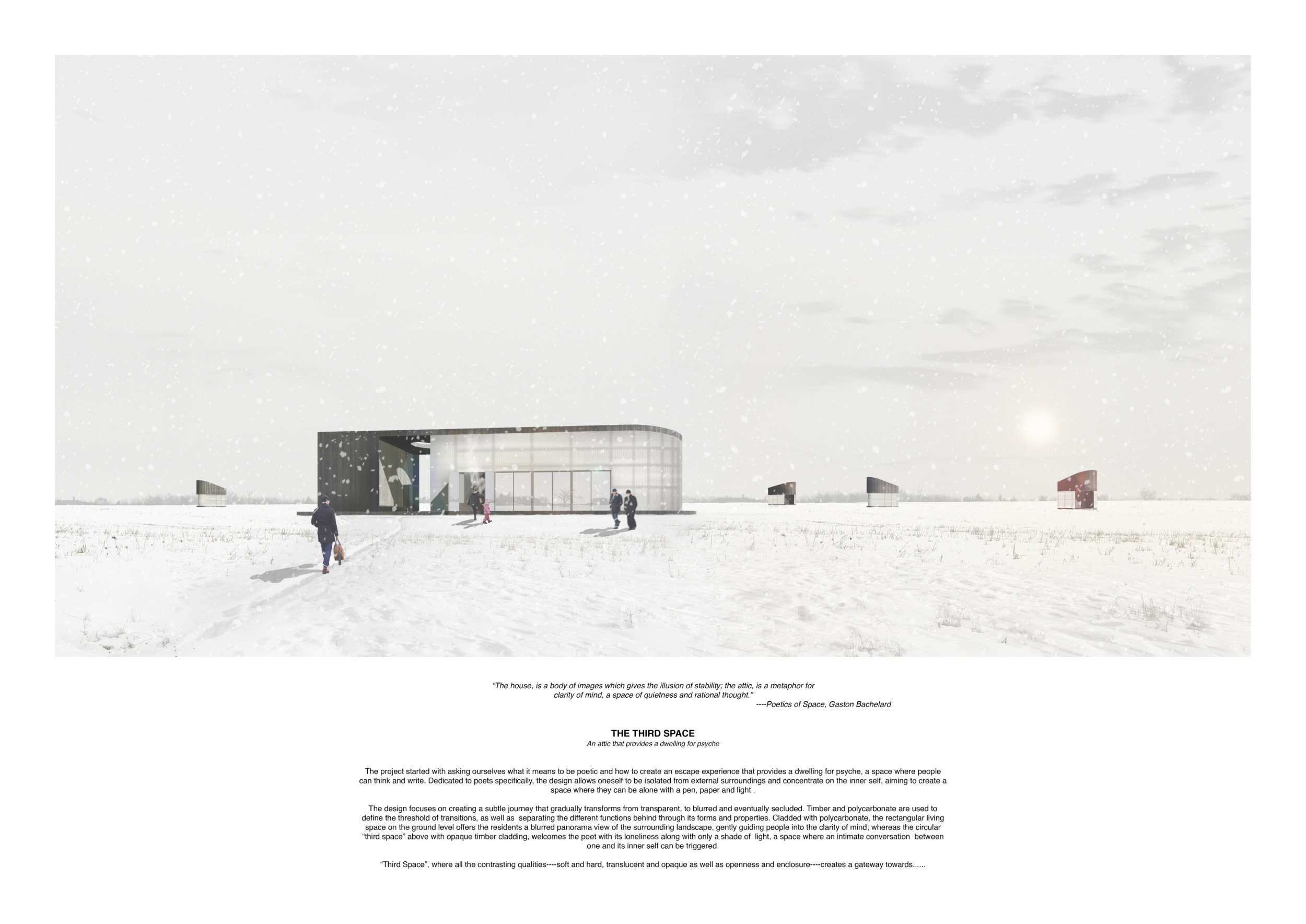 ‘Enclosures’ also considers the writer as a worker that requires both isolation and community. The proposal places a single building in the center of the site, enclosing a garden with a large tree and meditation zone. The approximately circular form features a low profile with a pitched roof that covers a corridor on the interior side of the ring. The design uses a glulam primary structure clad with heartwood and plywood. Read more In plan, enclosed spaces are interspersed with exterior covered terraces that offer permeability. The jury was impressed by the high quality of renderings and level of detail in the drawings. One can easily imagine a productive and quiet visit to this project. The jury questions whether alternative timber products might be considered that hold up longer to inclement winters and humid summers.