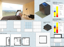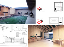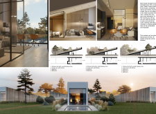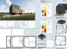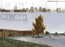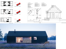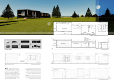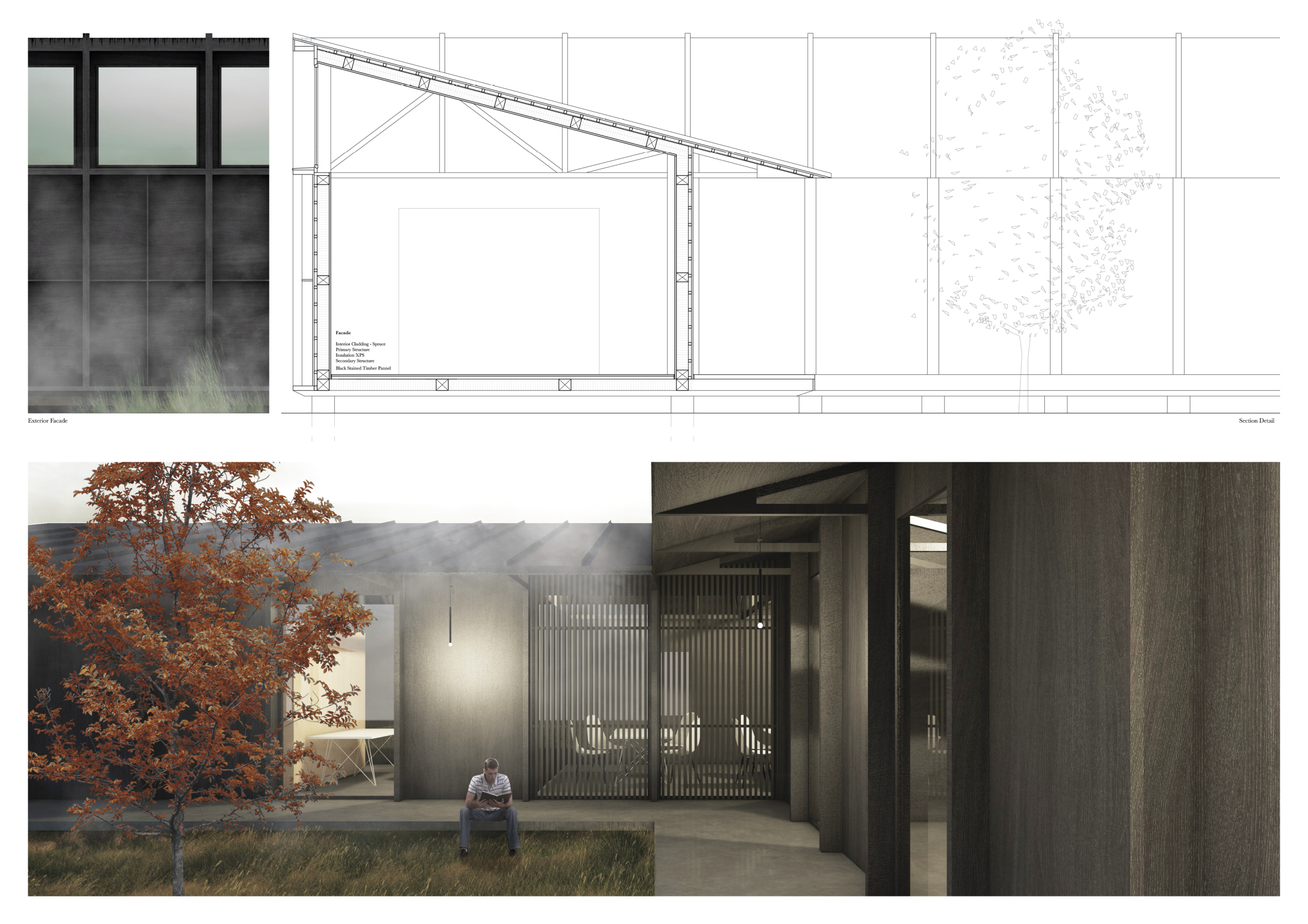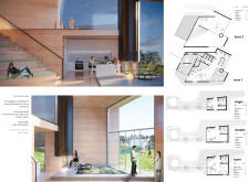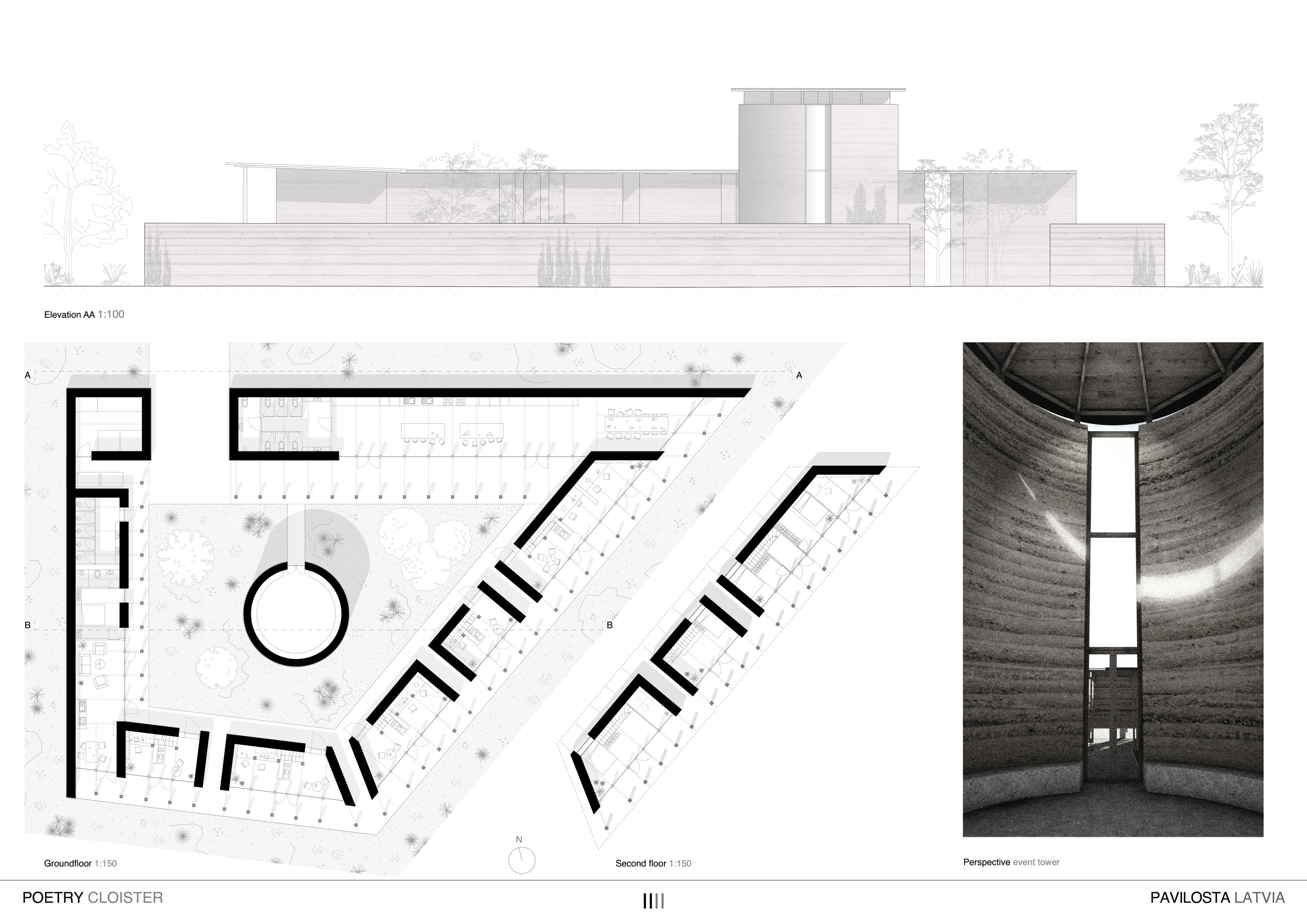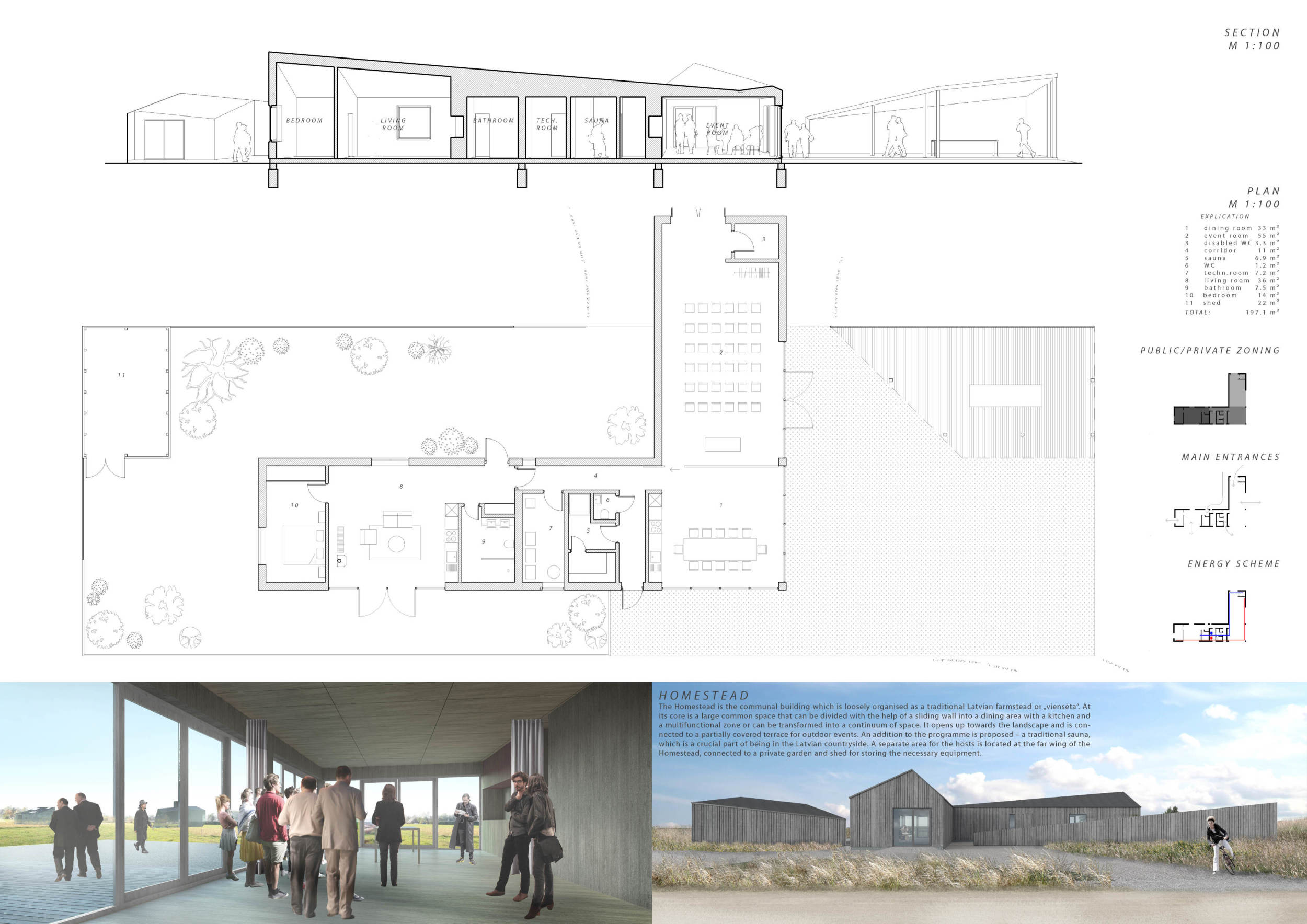 ‘A garden within a garden’ references traditional Baltic architecture using local materials such as timber, and resourceful building methods. The design collects all of the program within a single structure. It offers a distinctly modern rectangular block form, articulated by a grid of vertical and horizontal lines of alternating thicknesses giving hierarchy to the form. The facade is defined by a square clerestory window set on horizontally-oriented rectangular facade panels. Read more The project’s take on a courtyard-building typology lends to its intent on creating a sense of community for users. It intelligently mixes interior and exterior spaces under a common roof, and provides views to both the interior shared space of the courtyard and the exterior site. The structure uses repeated assemblies for ease of construction. The dark exterior cladding is black-stained timber, while the interiors are light and simple to provide clean spaces for work and living. The project conveys its ideas clearly using simple drawings and thoughtful renderings. The jury believes the project could be strengthened with an image depicting the relationship between the interior courtyard and the exterior site.