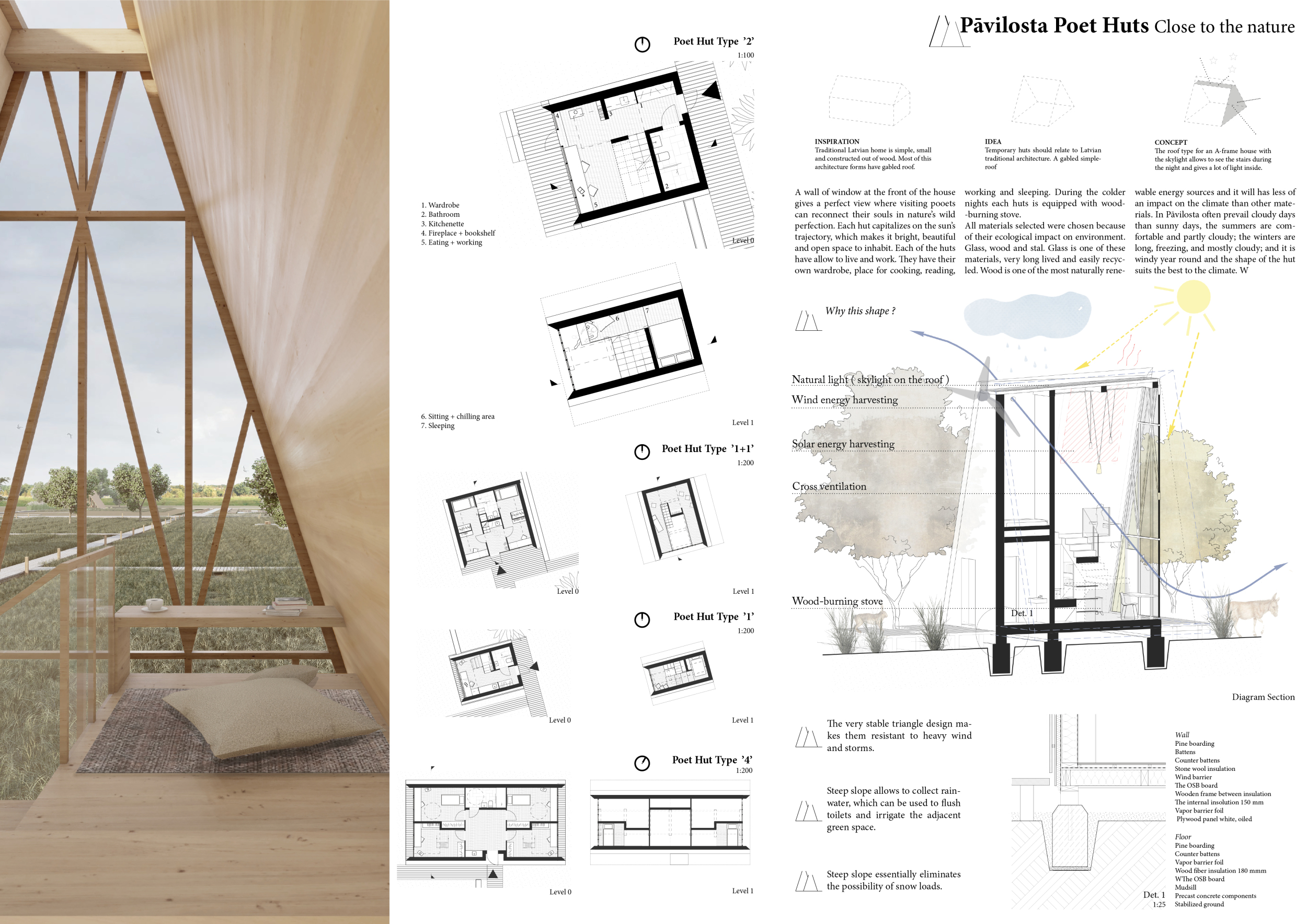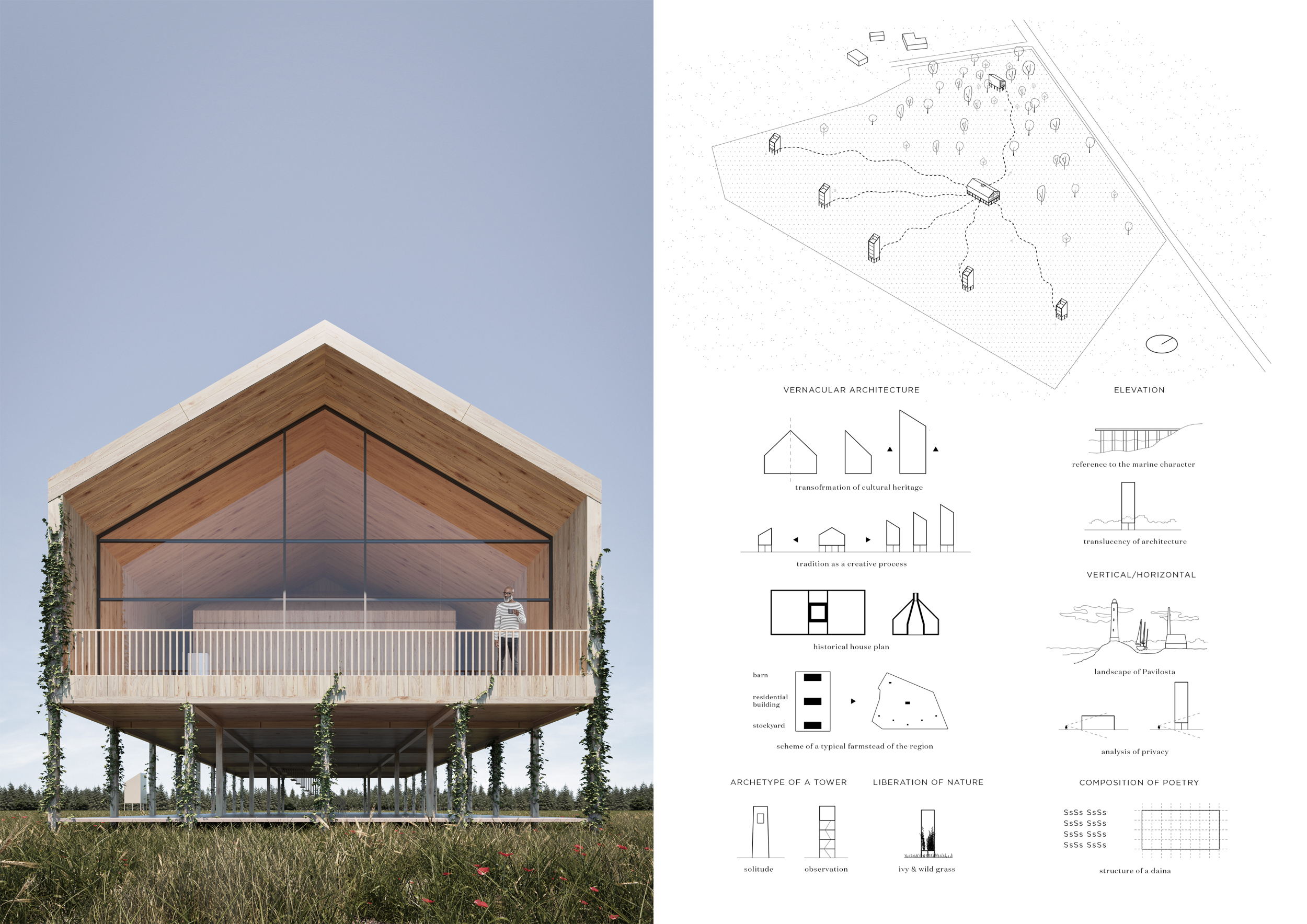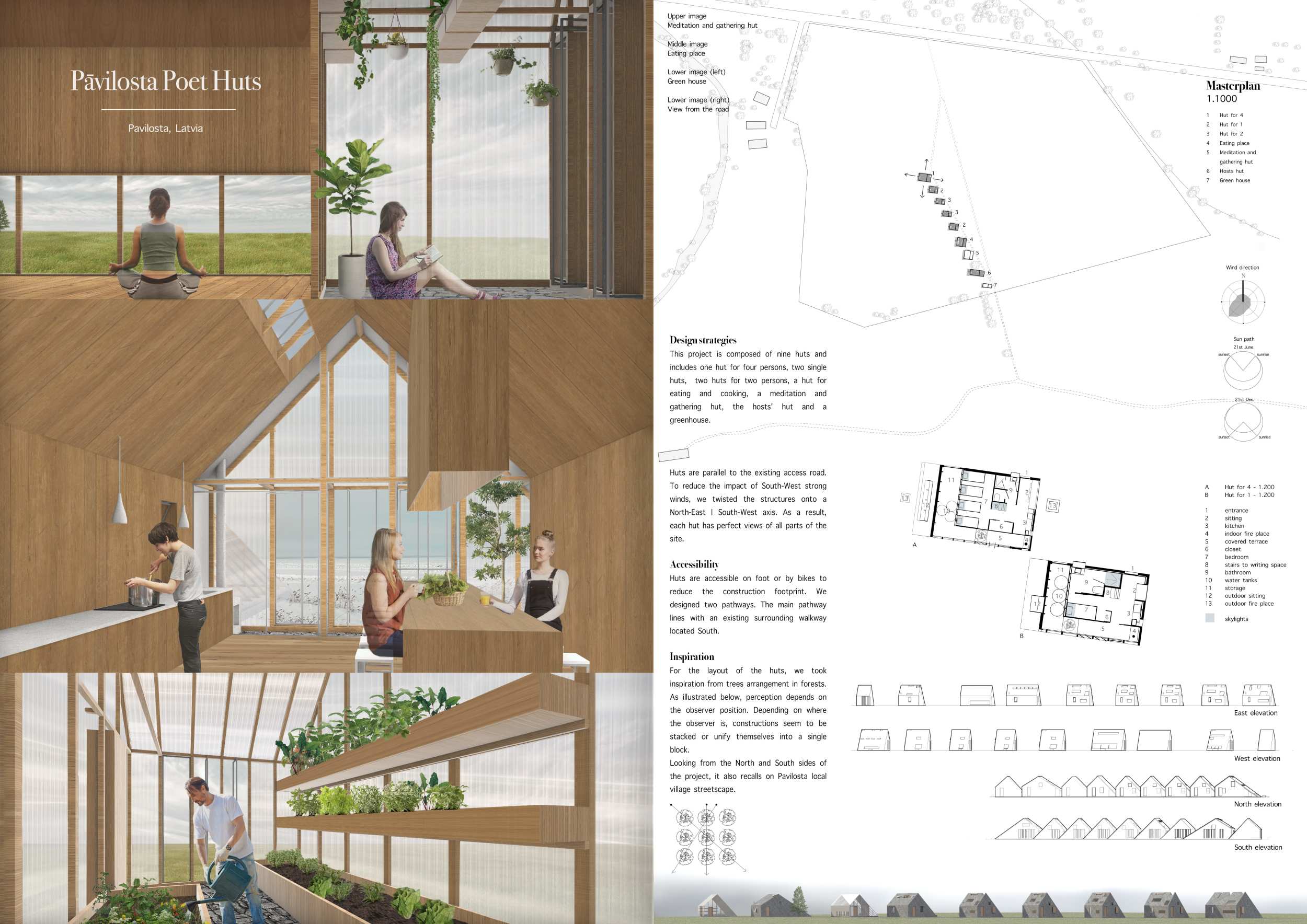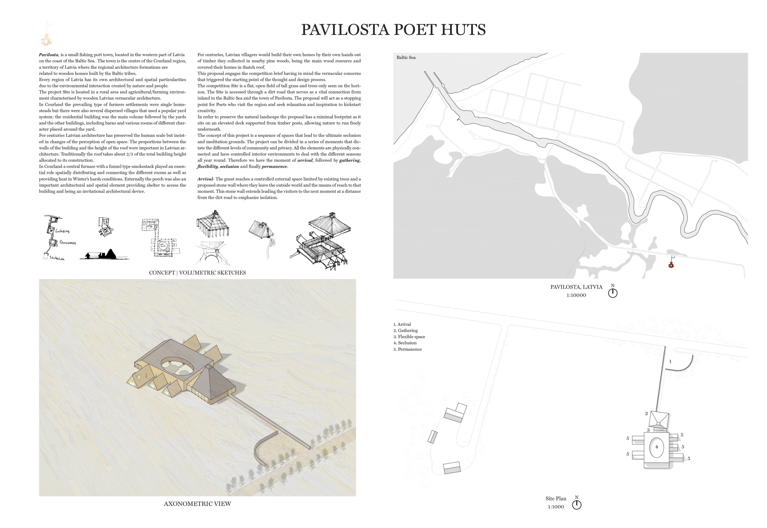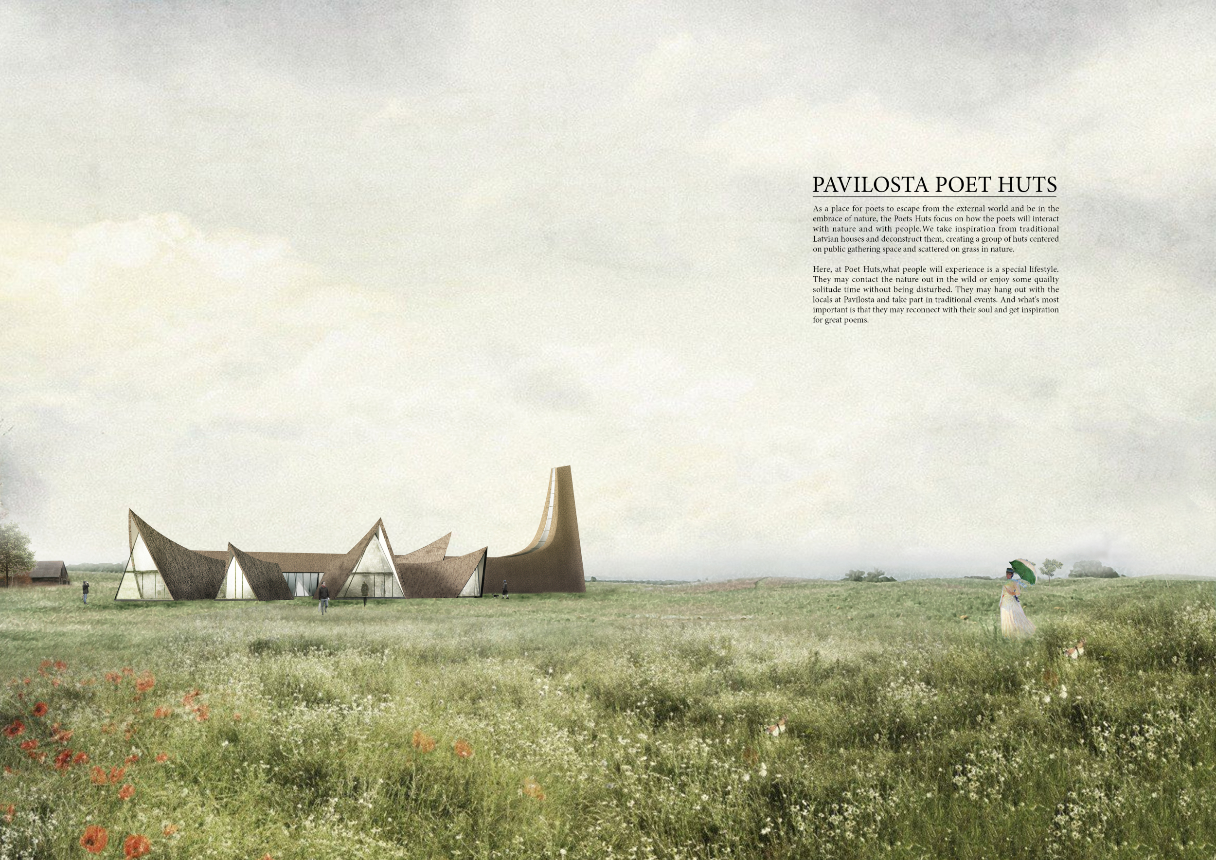The Pavilosta Poet Huts competition called on designers to submit proposals for a writers community in the small coastal fishing village of Pāvilosta, Latvia, historically a port serving the nearby city of Liepāja. Pāvilosta is defined by its beaches and local fishing industry - visitors often make this a destination to spend time in nature and fresh air.