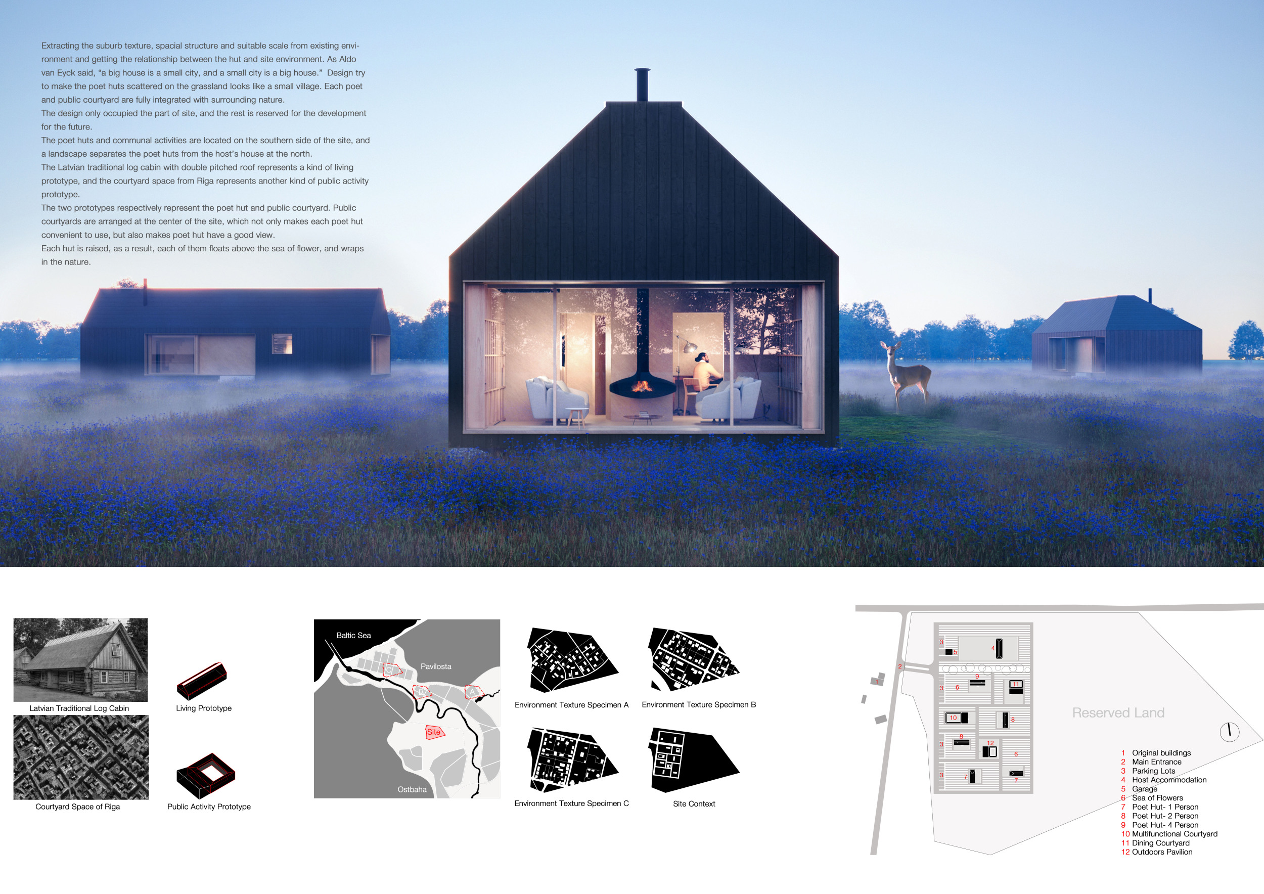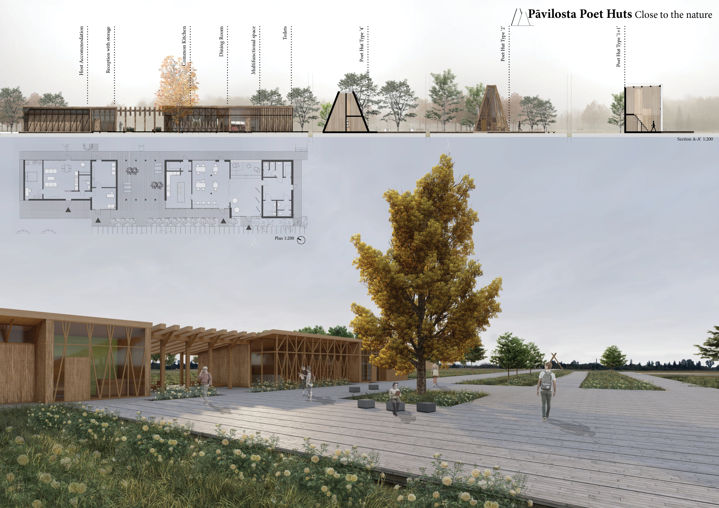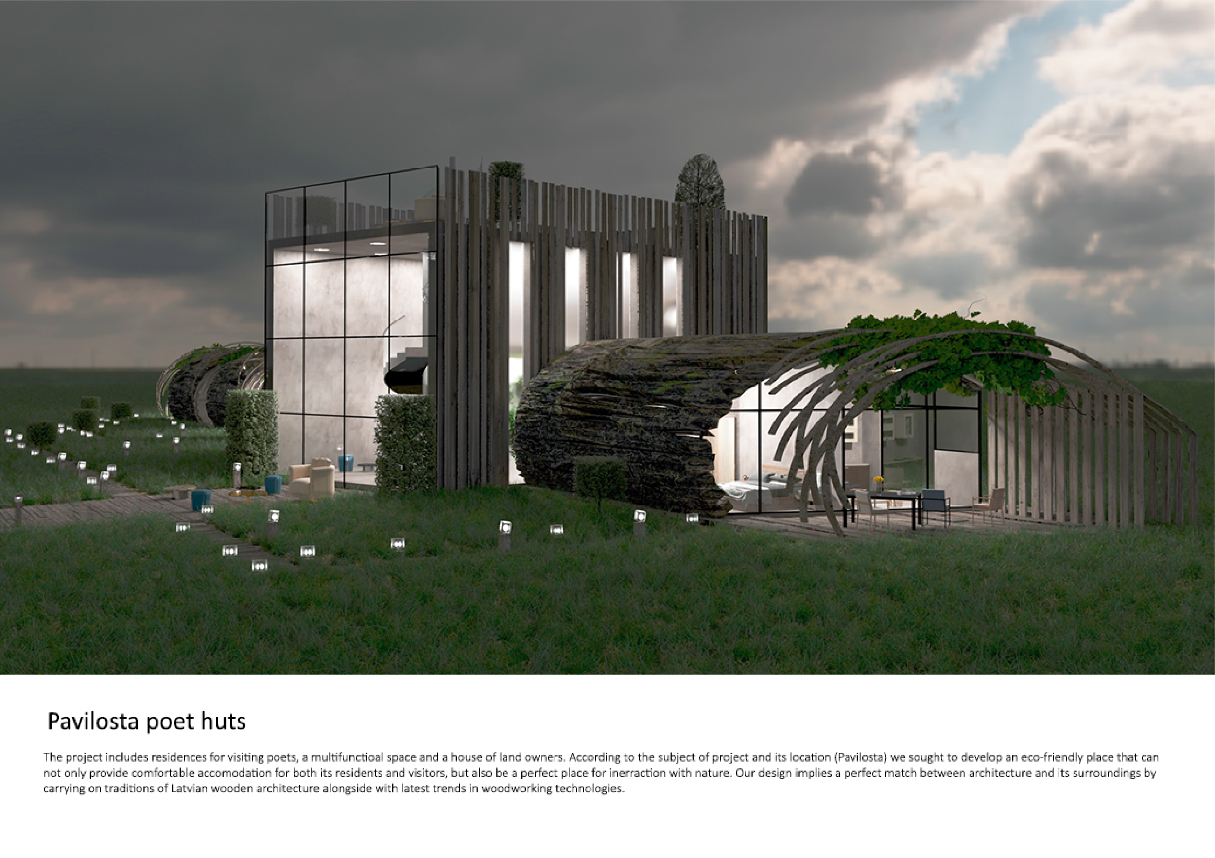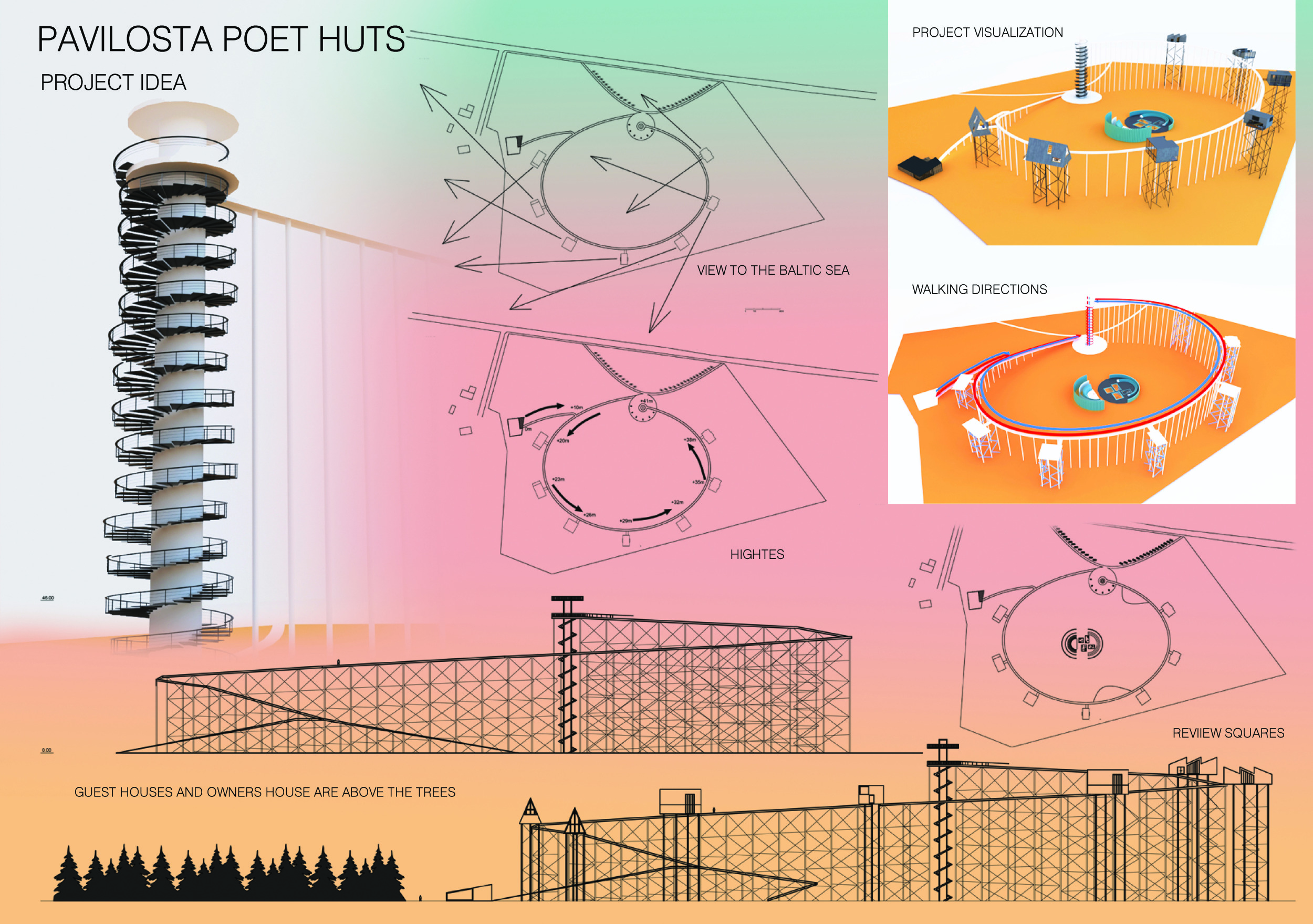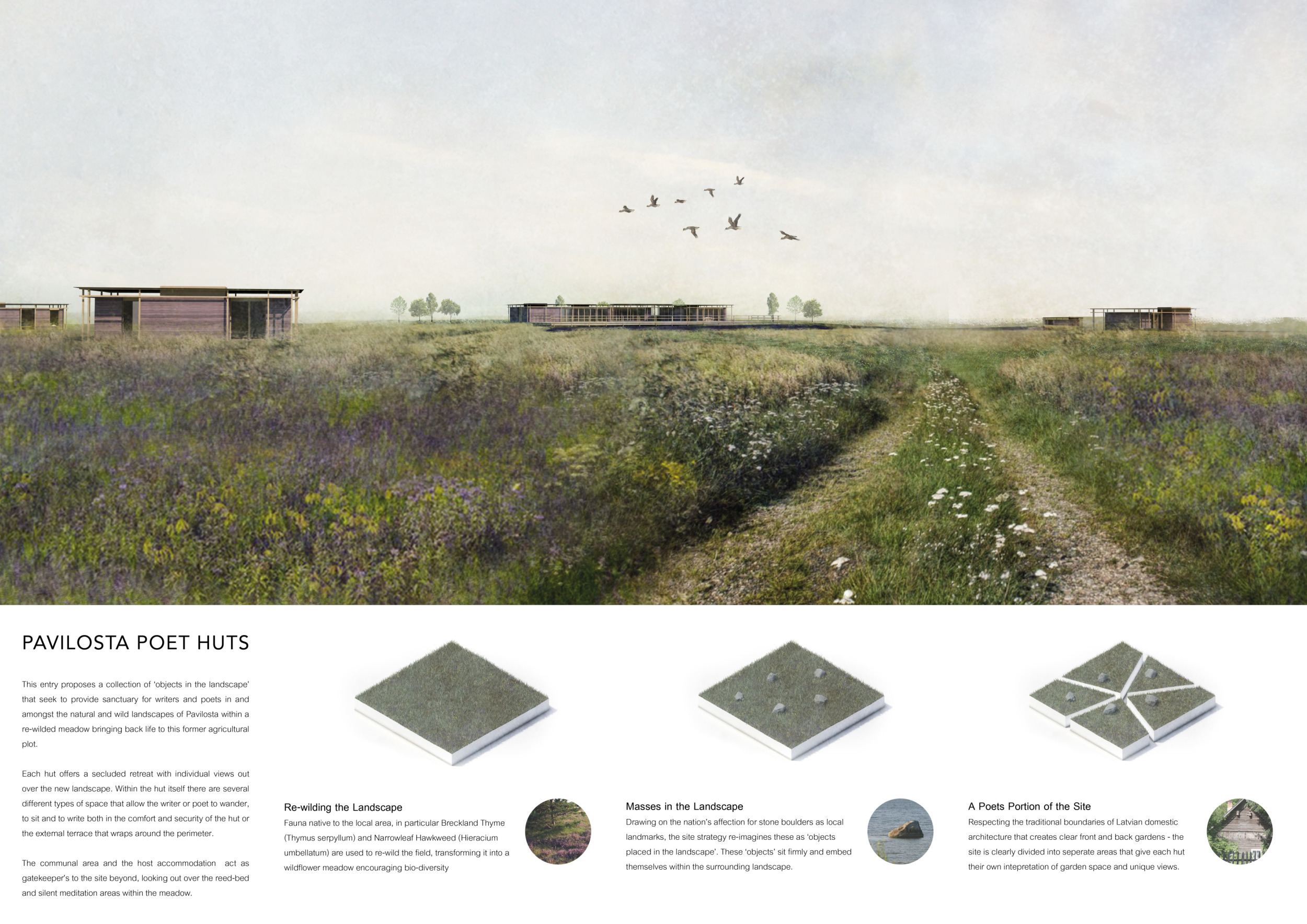 The Pavilosta Poet Huts competition called on designers to submit proposals for a writers community in the small coastal fishing village of Pāvilosta, Latvia, historically a port serving the nearby city of Liepāja. Pāvilosta is defined by its beaches and local fishing industry - visitors often make this a destination to spend time in nature and fresh air.