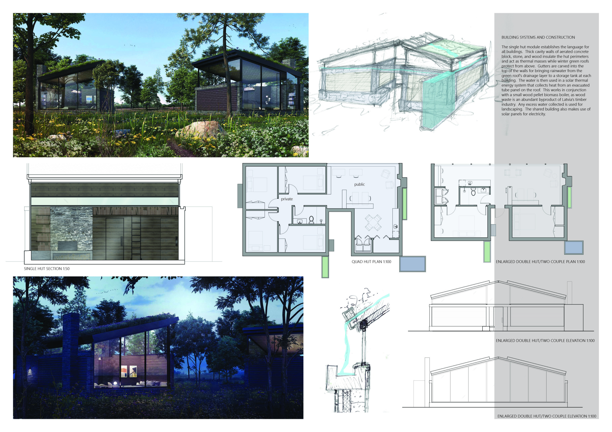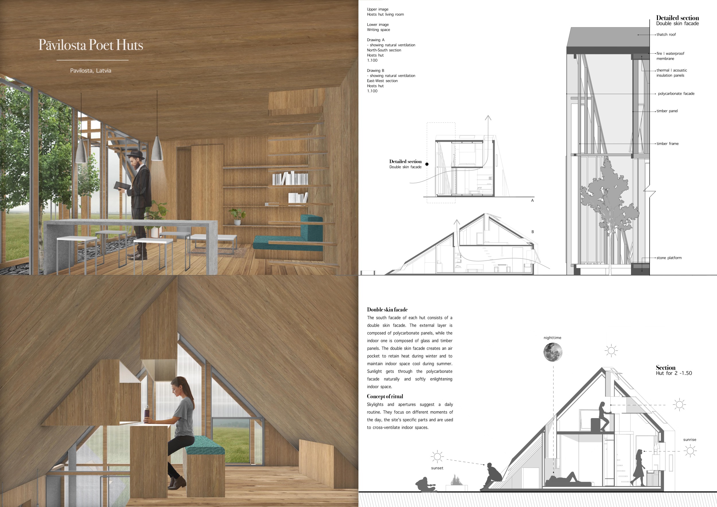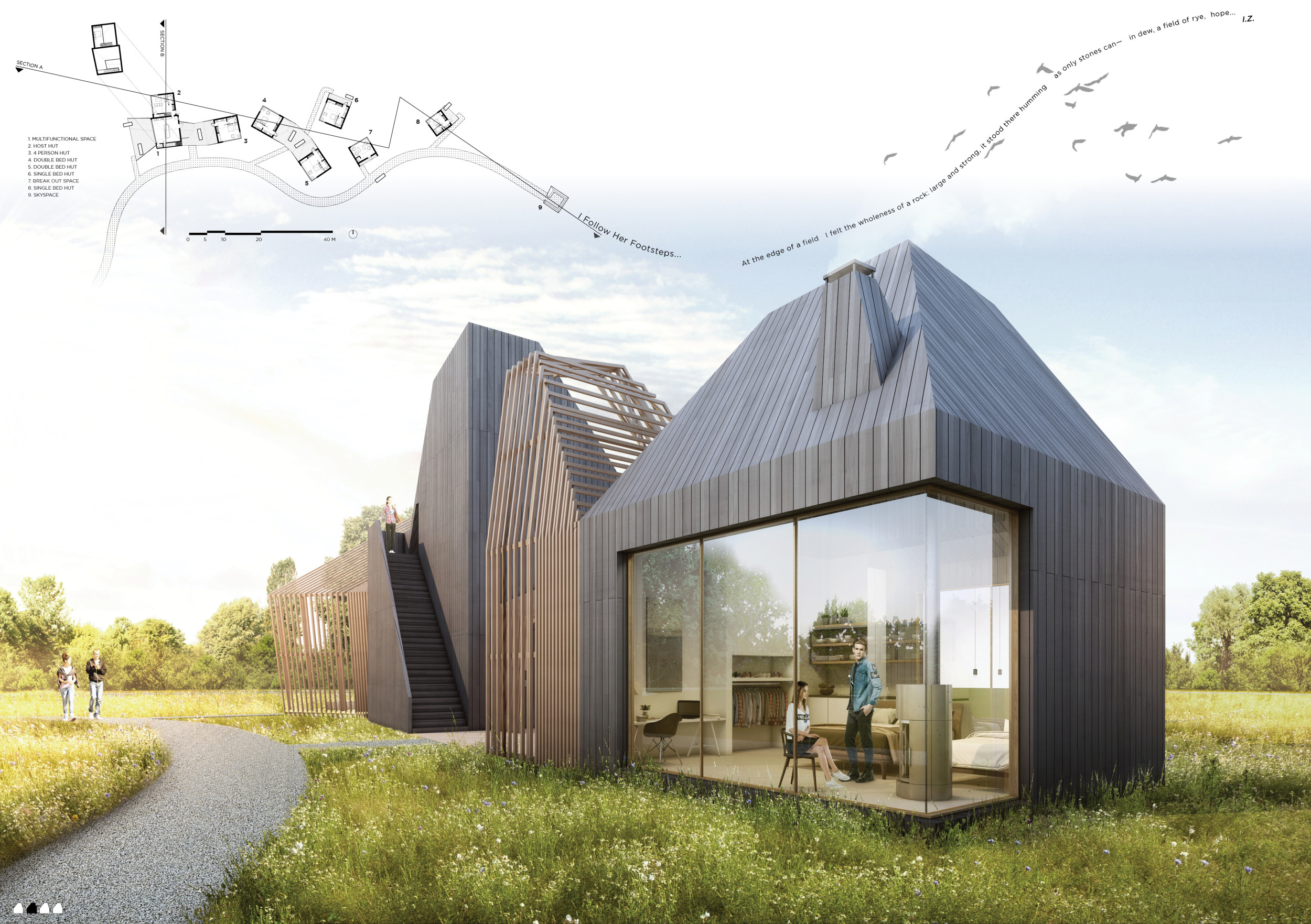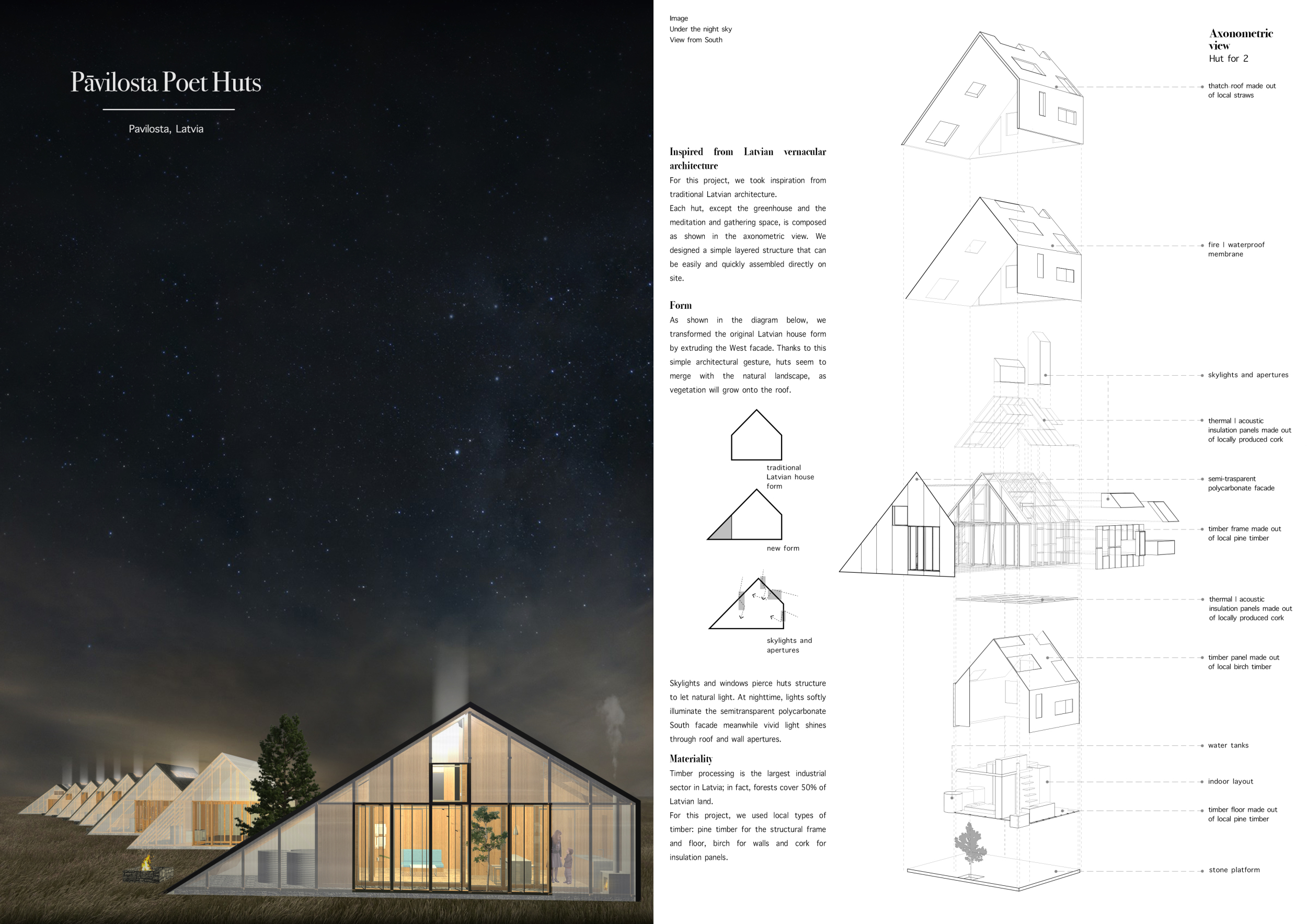 The Pavilosta Poet Huts competition called on designers to submit proposals for a writers community in the small coastal fishing village of Pāvilosta, Latvia, historically a port serving the nearby city of Liepāja. Pāvilosta is defined by its beaches and local fishing industry - visitors often make this a destination to spend time in nature and fresh air.