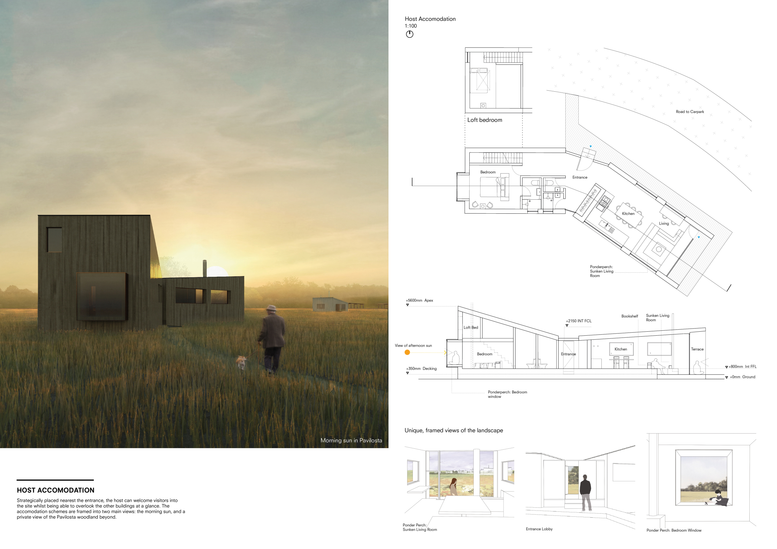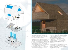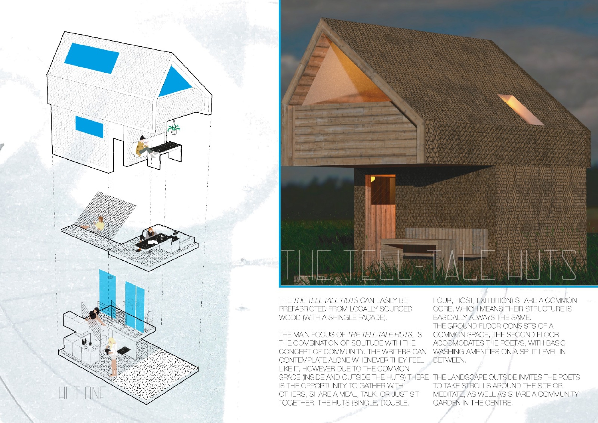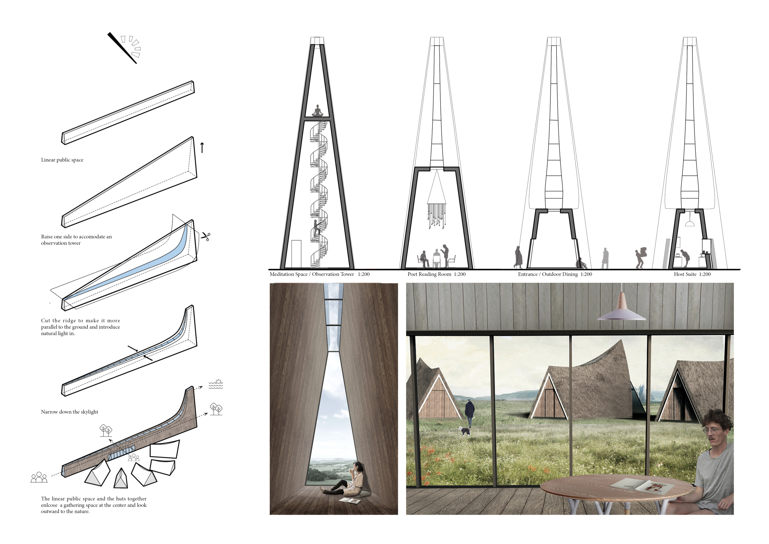 This proposal offers a unique formal organization defined by two bars of program connected by a linear circulation space, like two bands of buildings facing an internal street. The first houses writers’ accommodations; the second is filled with shared program as well as host accommodations. As with the other winning proposals, ‘The Pitch Hut’ mixes internal spaces with external decks. Read more Each writer’s hut contains a large vertical window offering exterior views, and a horizontal window paired with a desk for views to a private terrace. The accommodations provide ample working space that runs nearly the length of the structure. The jury believes the submission would be further strengthened with interior images of the communal spaces.