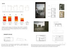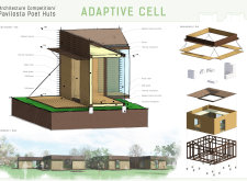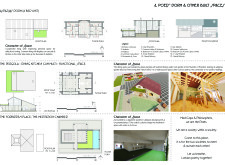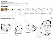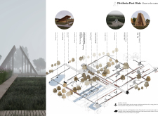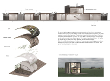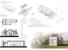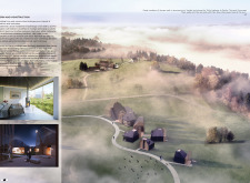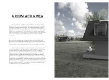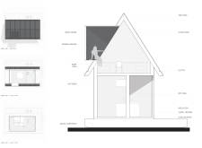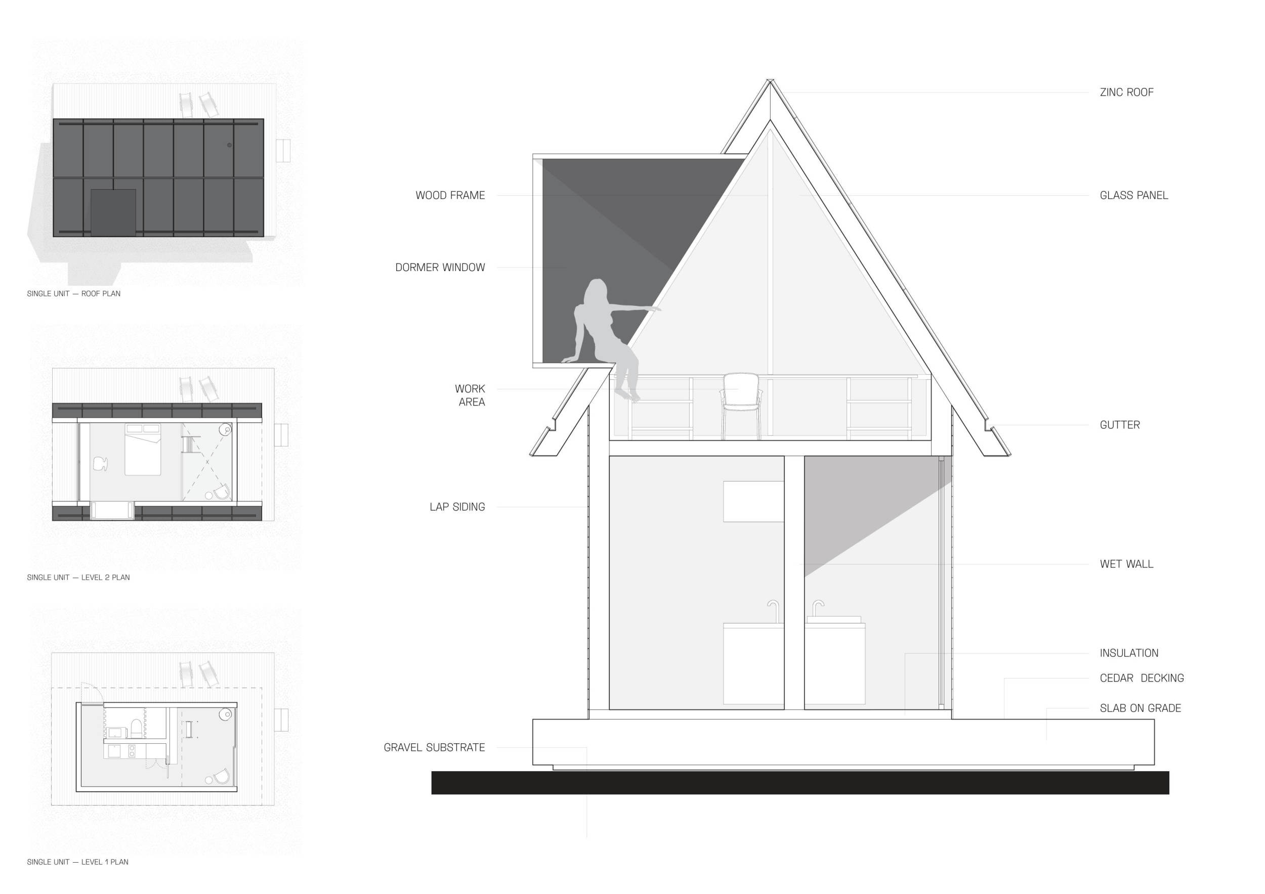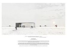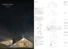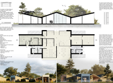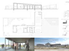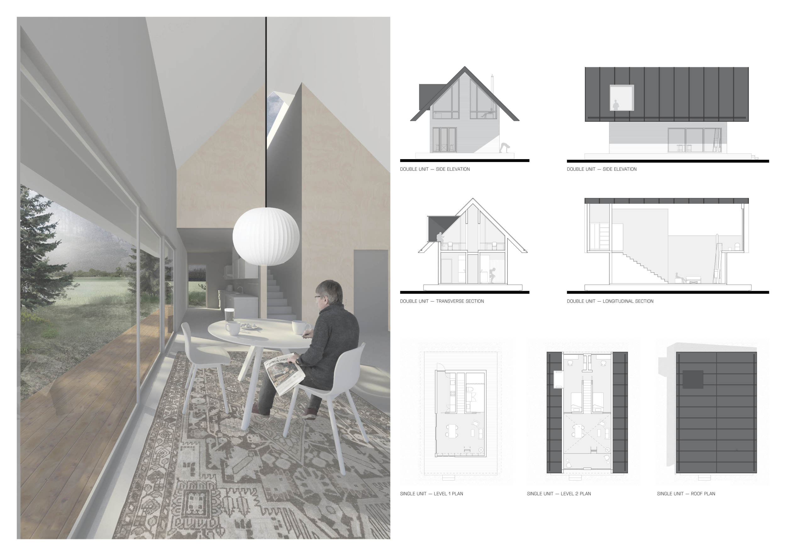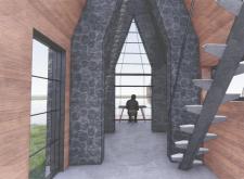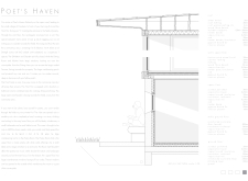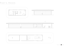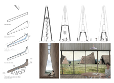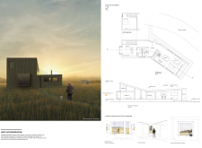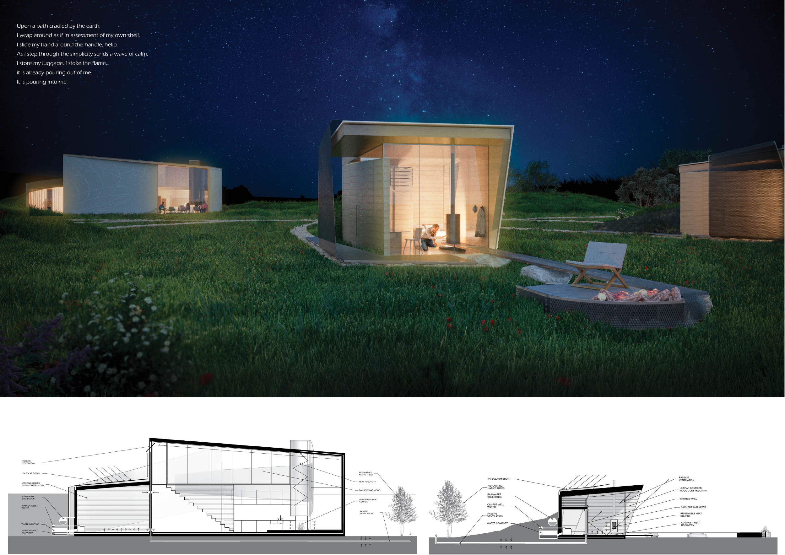 This proposal offers a unique formal organization defined by two bars of program connected by a linear circulation space, like two bands of buildings facing an internal street. The first houses writers’ accommodations; the second is filled with shared program as well as host accommodations. As with the other winning proposals, ‘The Pitch Hut’ mixes internal spaces with external decks. Read more Each writer’s hut contains a large vertical window offering exterior views, and a horizontal window paired with a desk for views to a private terrace. The accommodations provide ample working space that runs nearly the length of the structure. The jury believes the submission would be further strengthened with interior images of the communal spaces.