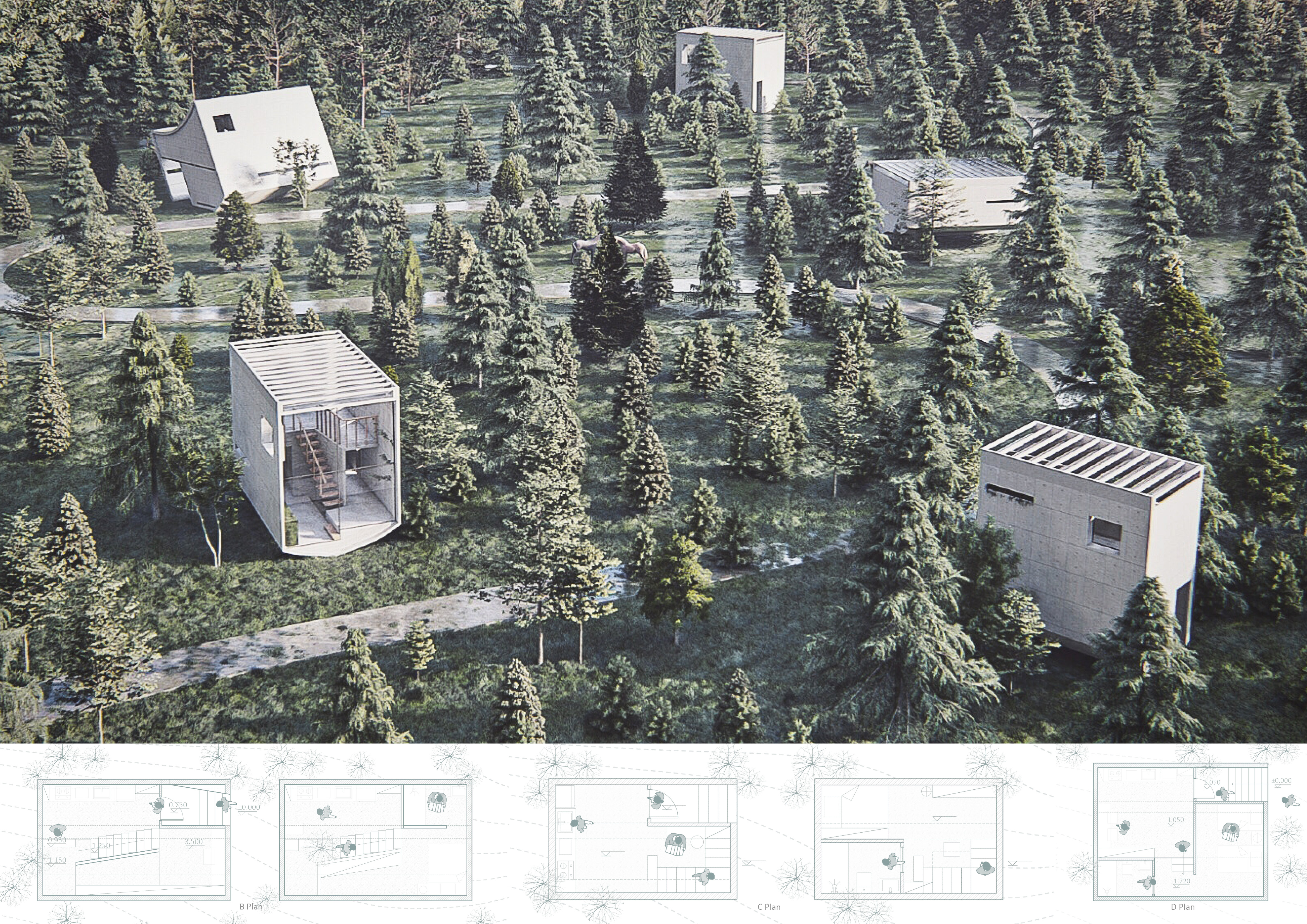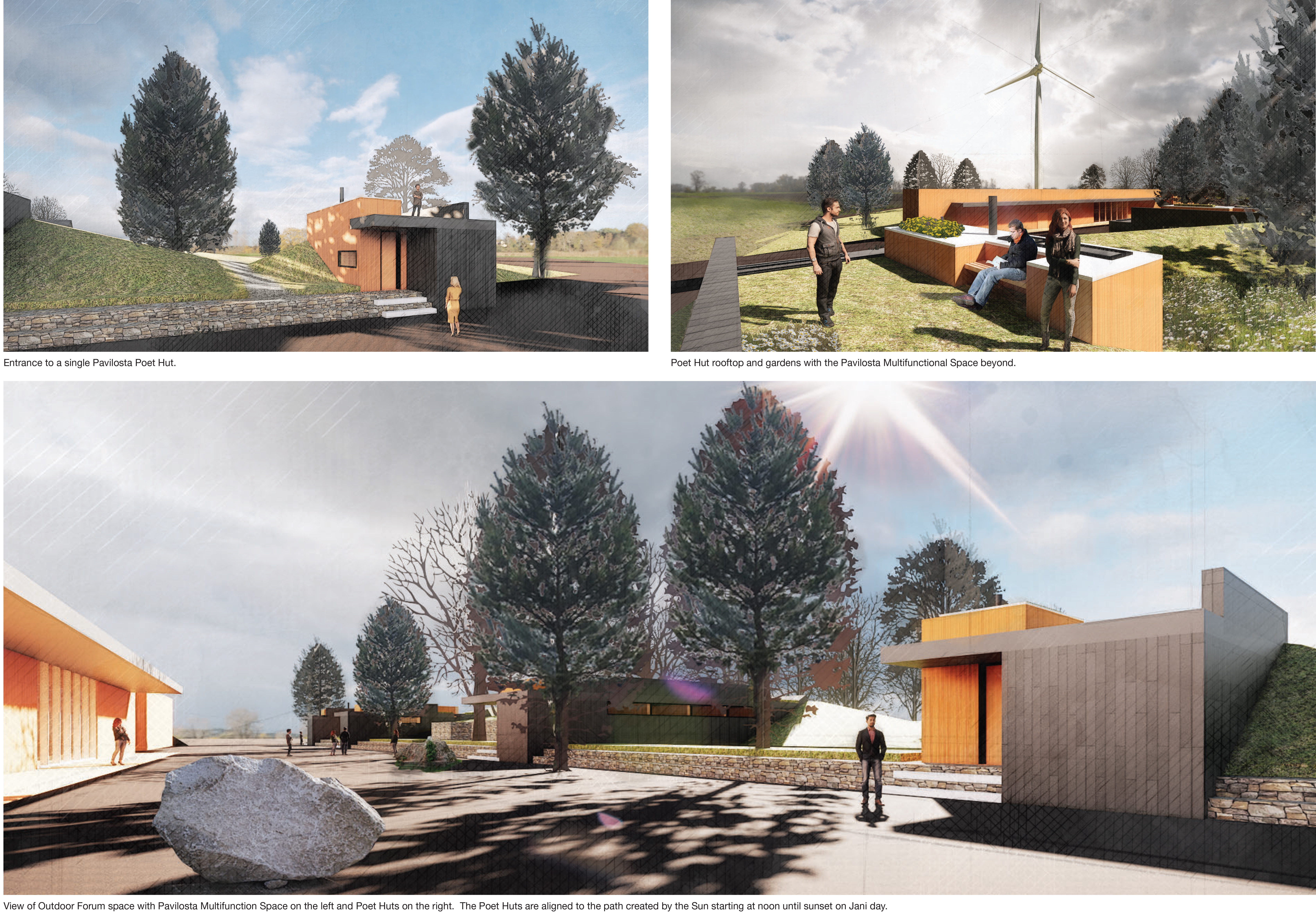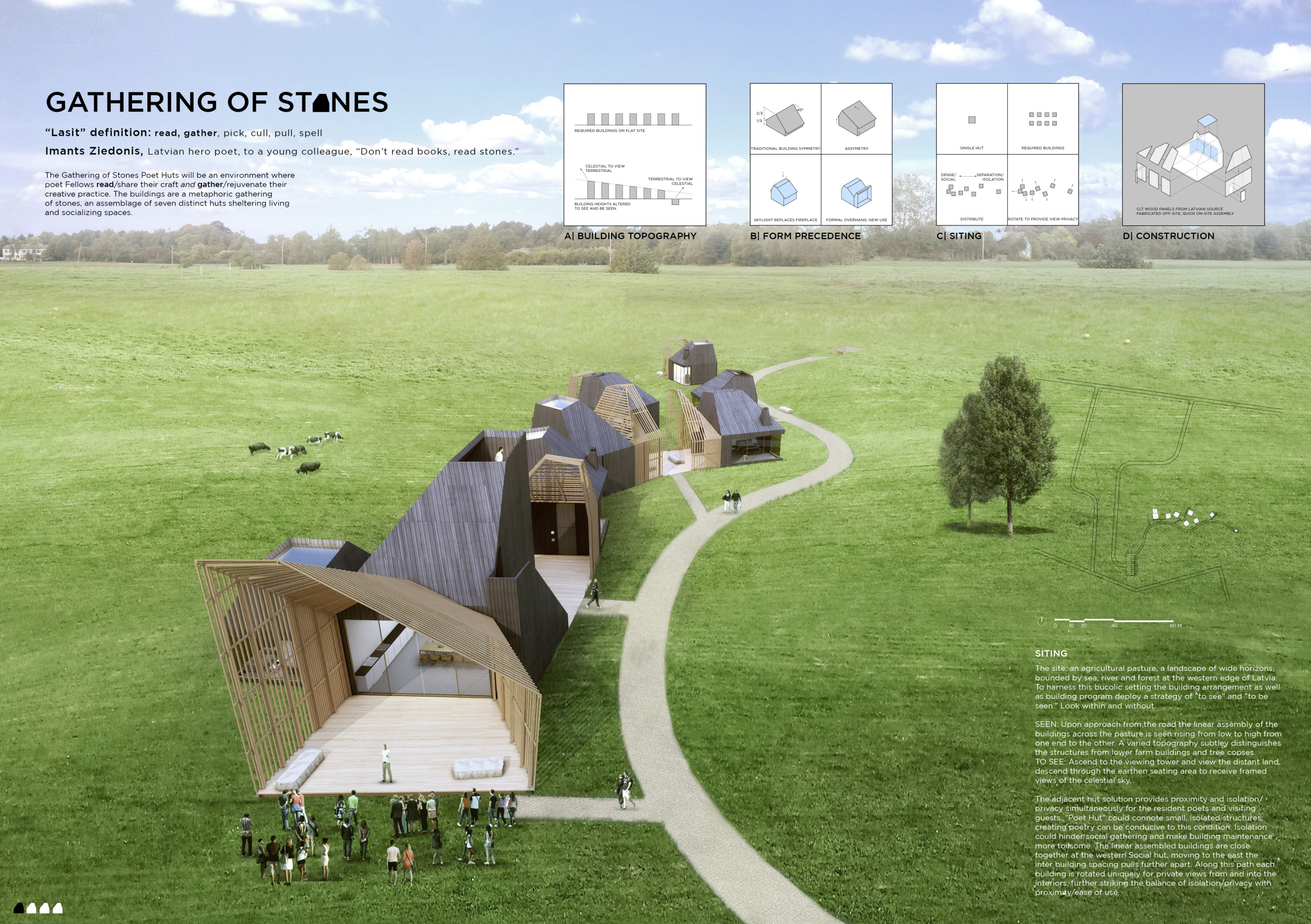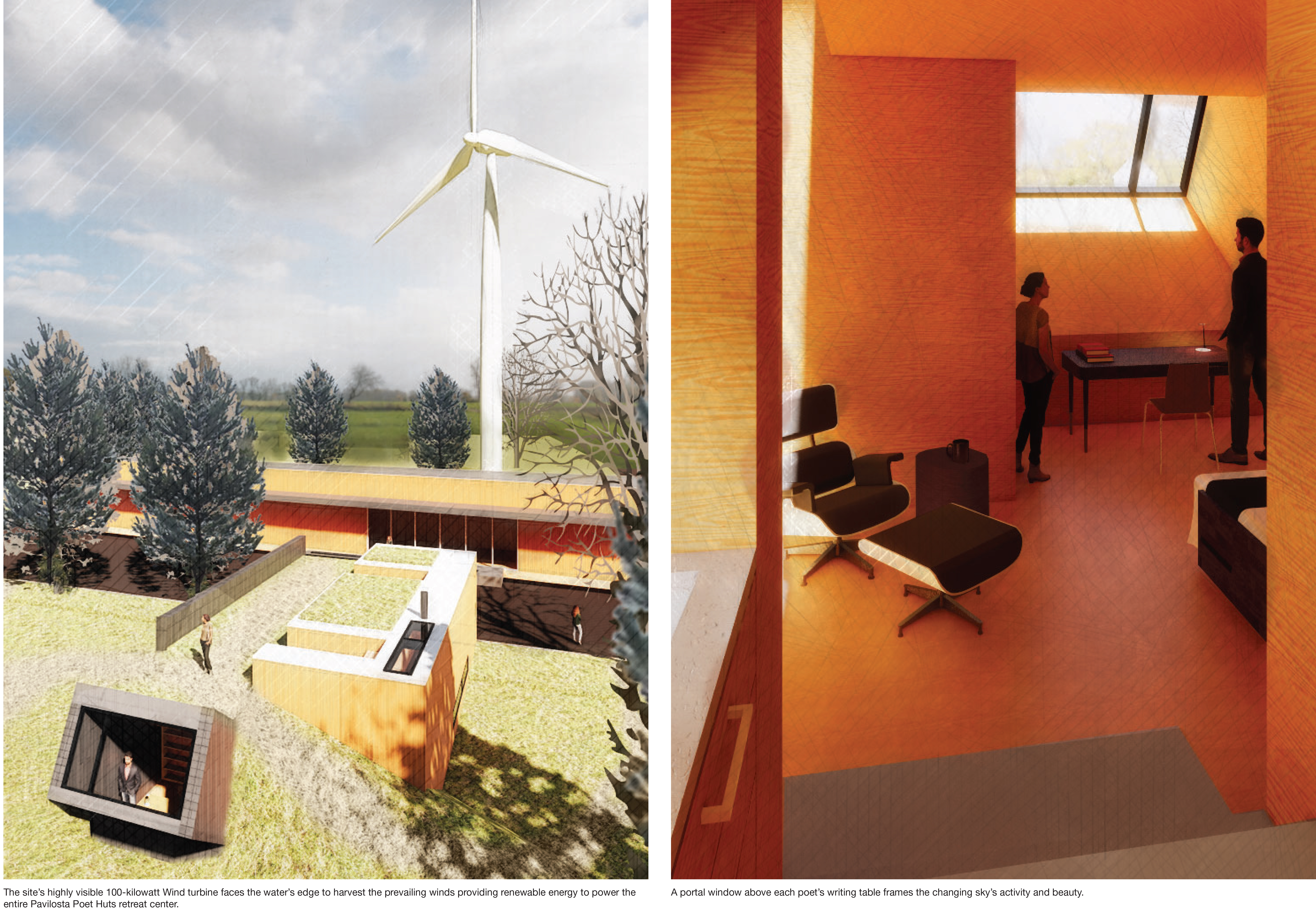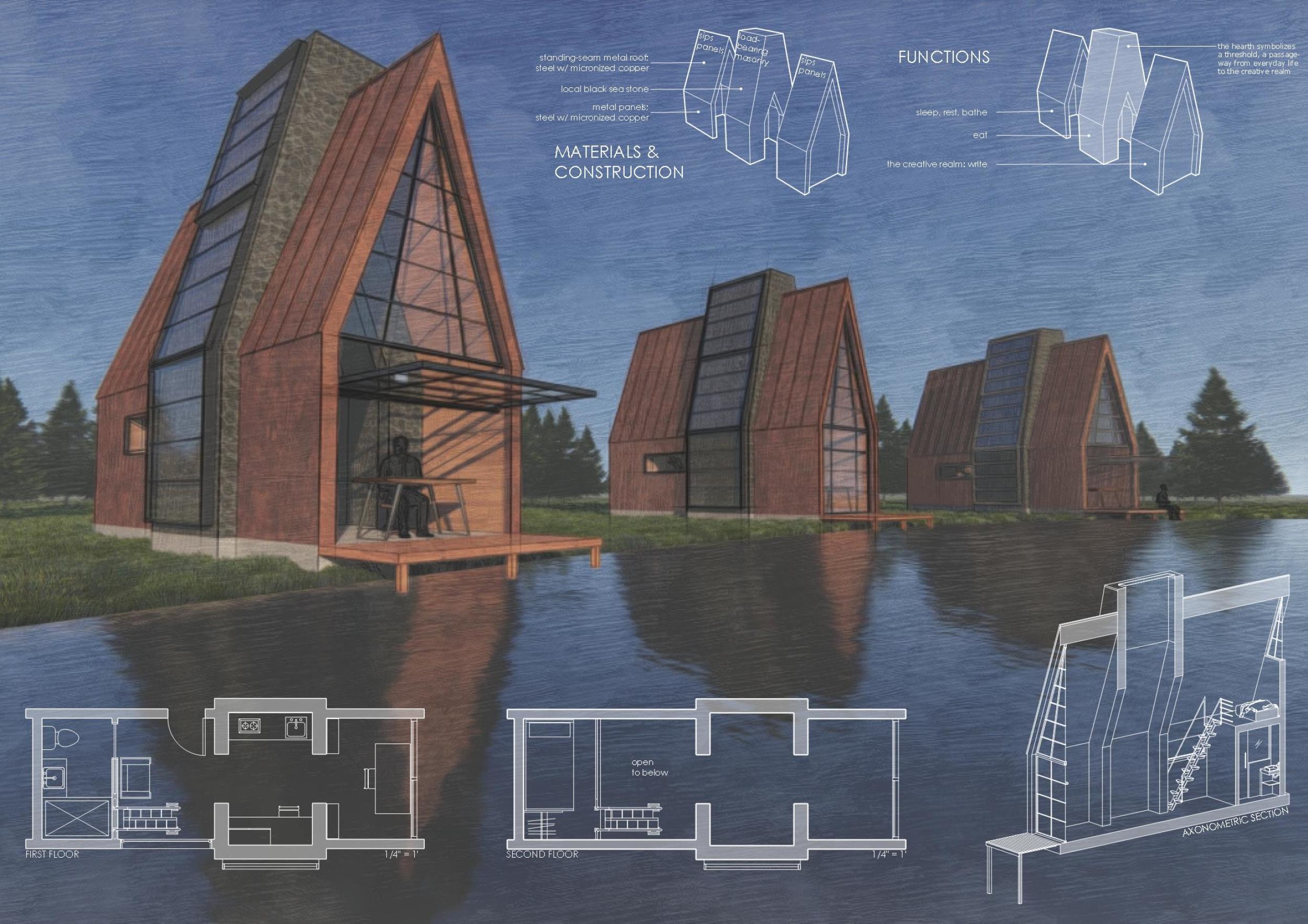 The jury was impressed by the well-rounded response to this call for proposals. The submissions included a range of building typologies, such as isolated cabins scattered across the site, single buildings focused on the community experience, and even towers offering views to the surrounding region. Upon review of the materials, the jury members selected a set of winners that offered strong proposals for communal complexes that captured both the ability for writers to work in isolation, as well as interact with fellow visitors.