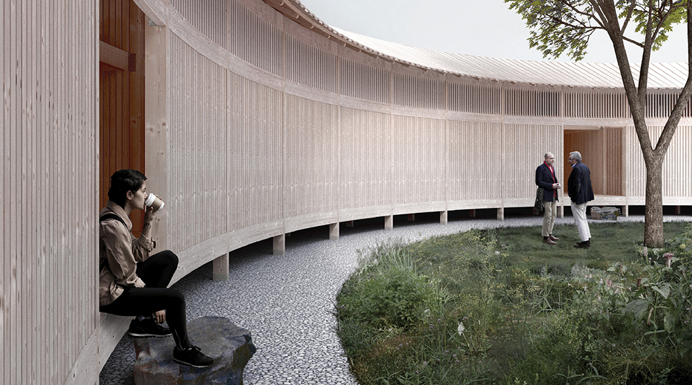 Second prize went to Linnéa Holmberg, Maria Torrent, and Karl Zetterholm from BLANK ARKITEKTER AB in Sweden. Their ‘Enclosures’ project unifies the ideals of solitude and community, placing a single building in the center of the site enclosing a garden with a large tree and meditation zone.