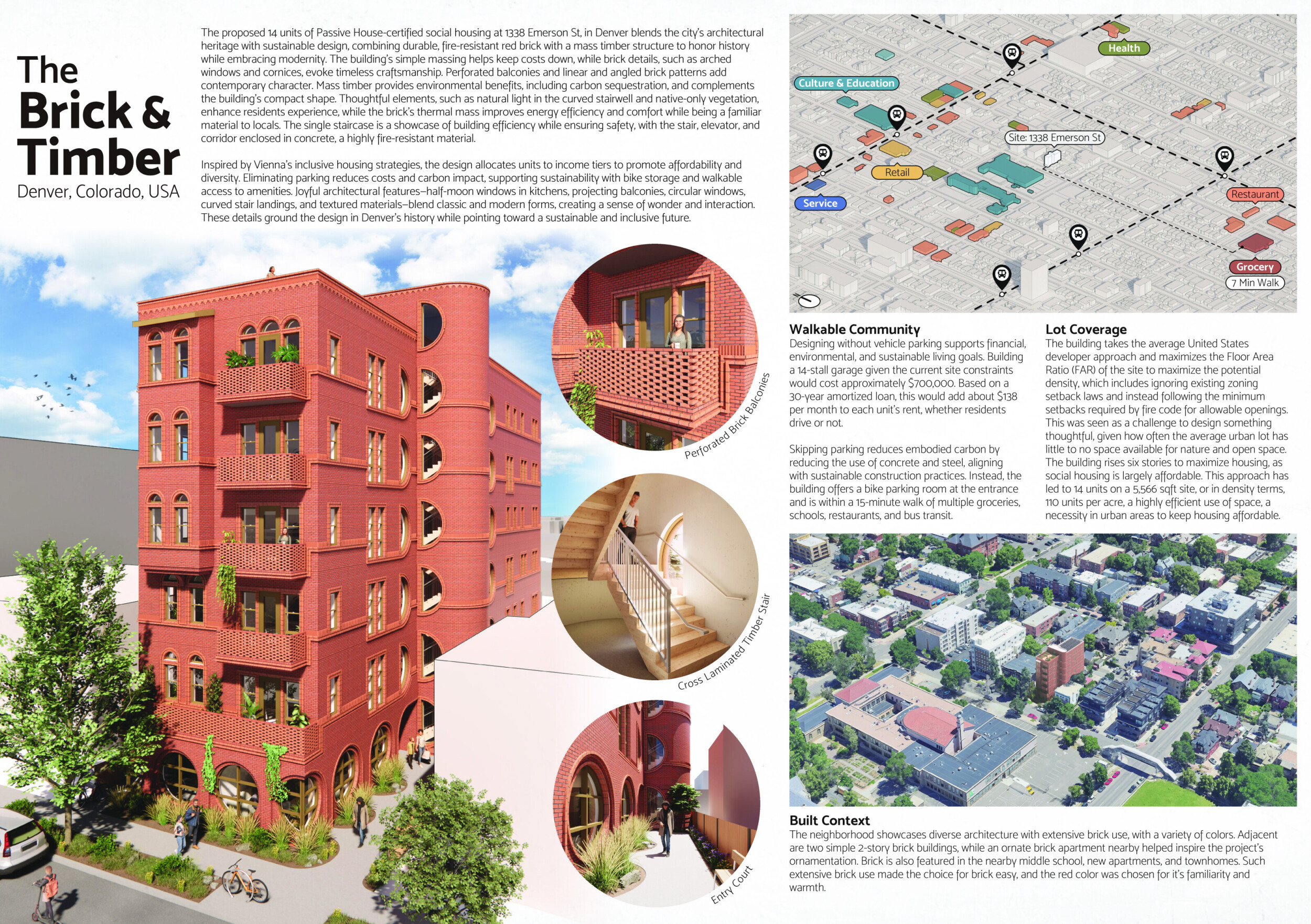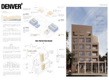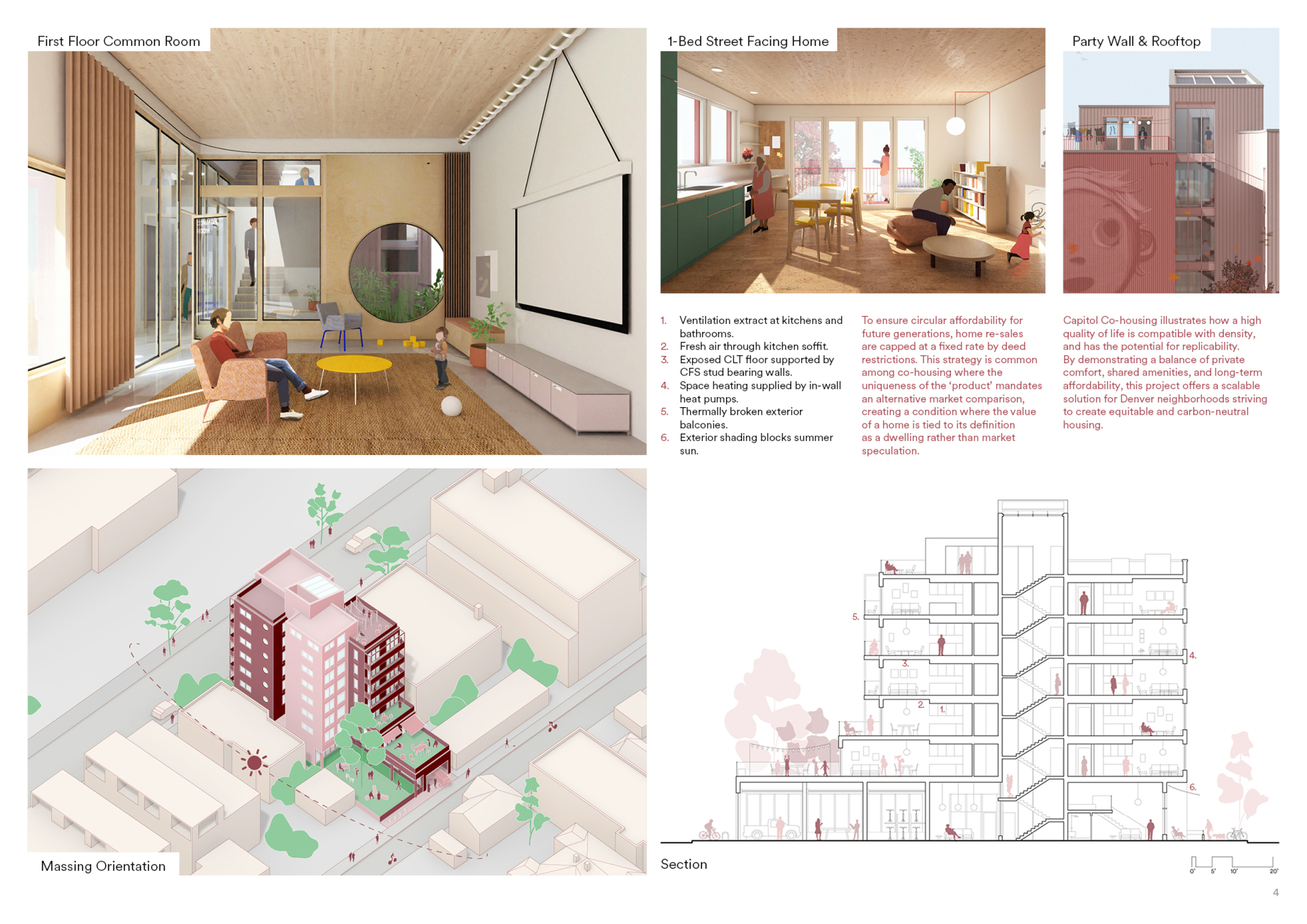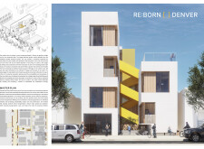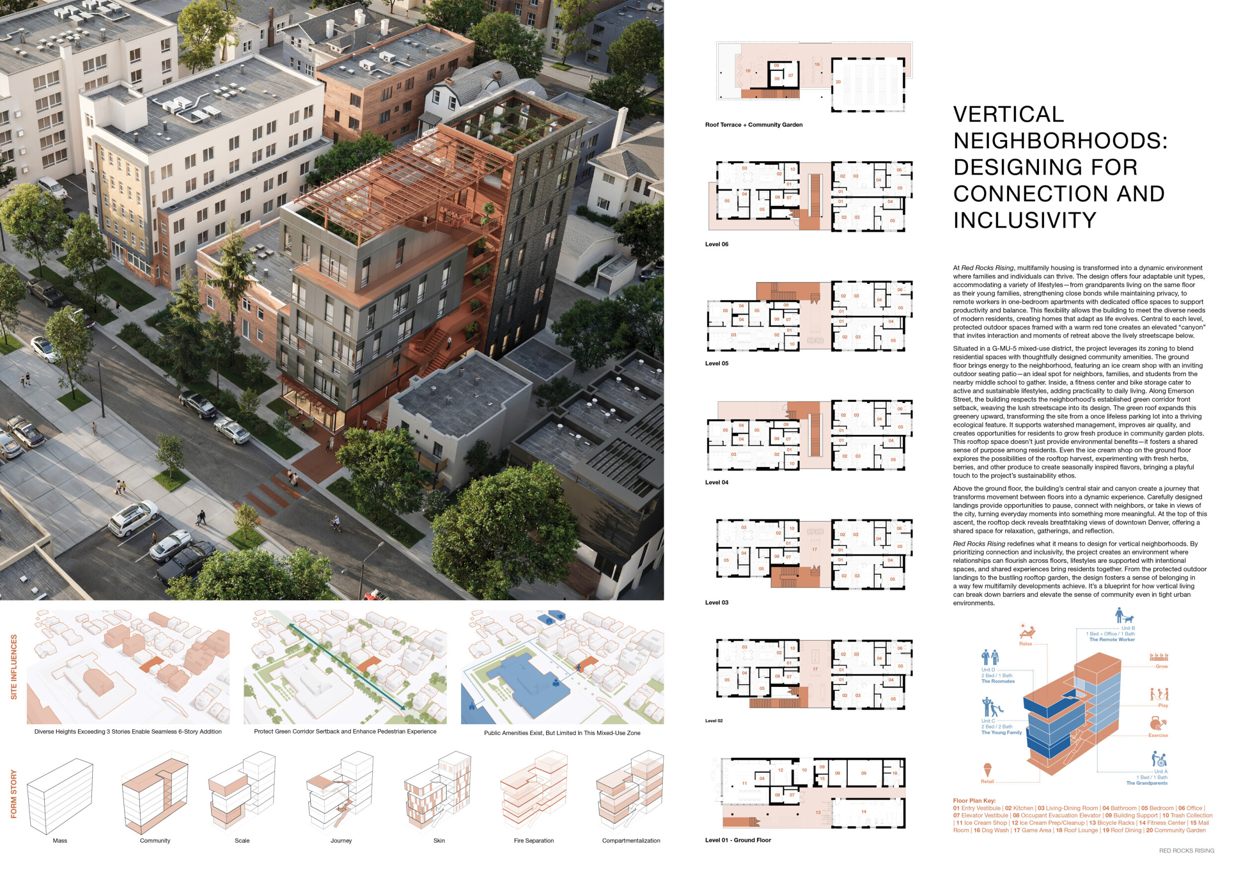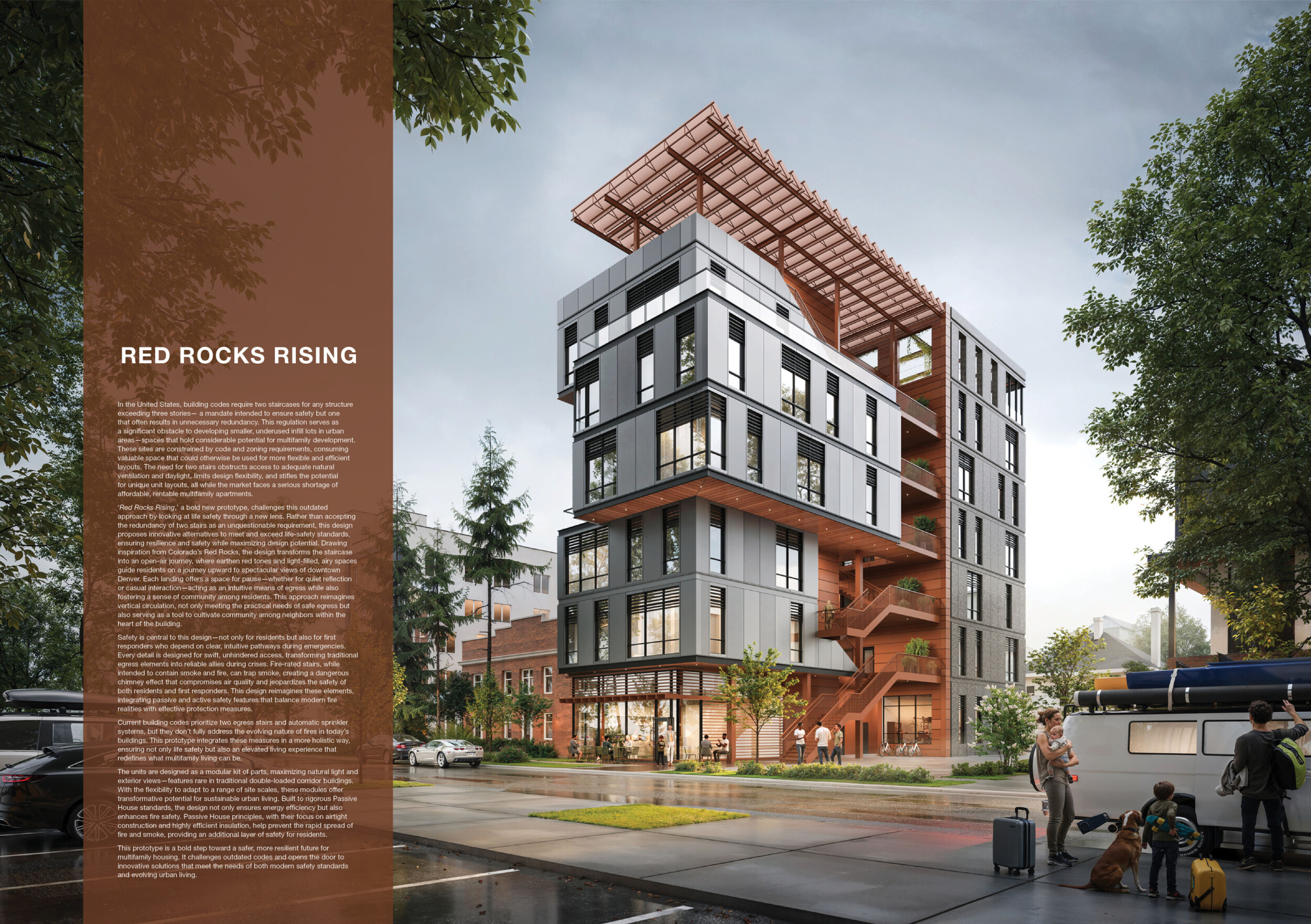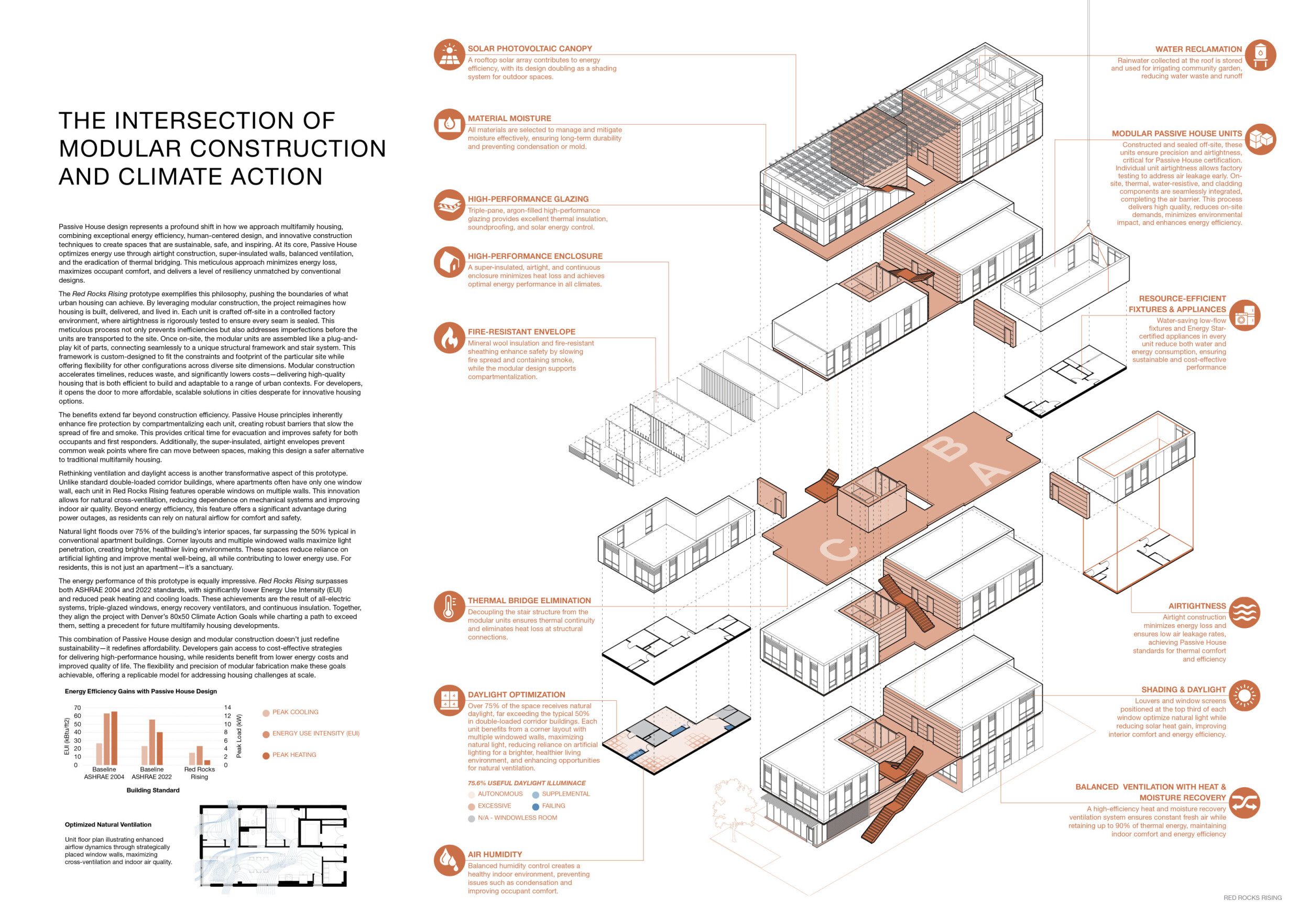 Red Rocks Rising is a modular, multifamily housing project integrating Passive House principles for energy efficiency and occupant comfort. The design utilizes prefabricated units to minimize waste and optimize construction time. A central atrium and external stairways enhance natural ventilation and daylight access, reducing reliance on mechanical systems. High-performance glazing, thermal bridge elimination, and airtight enclosures improve insulation and indoor climate control.